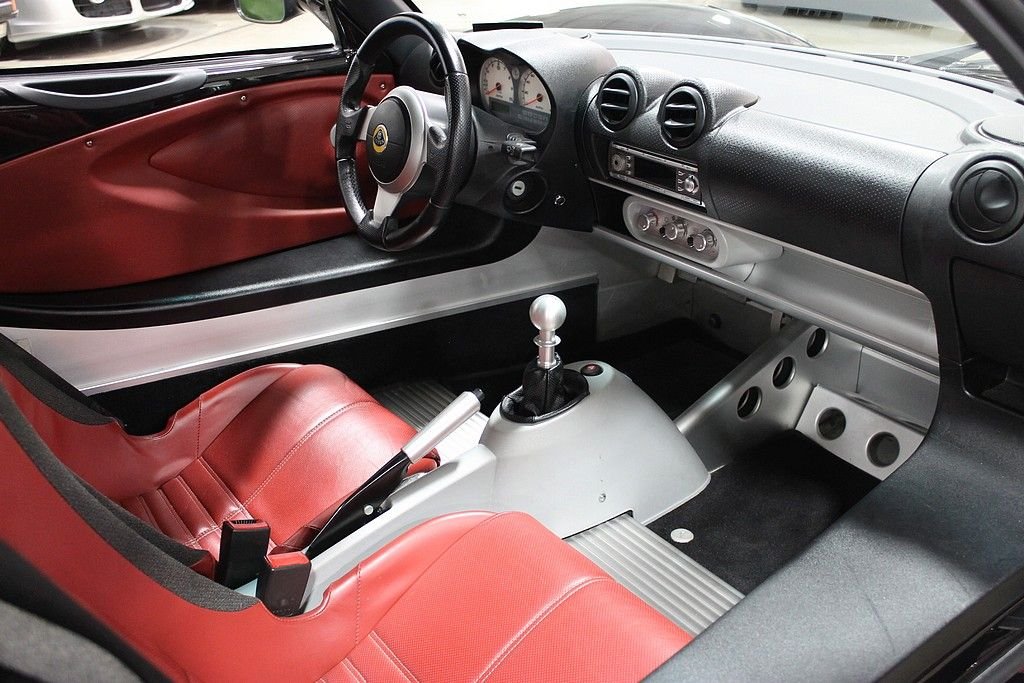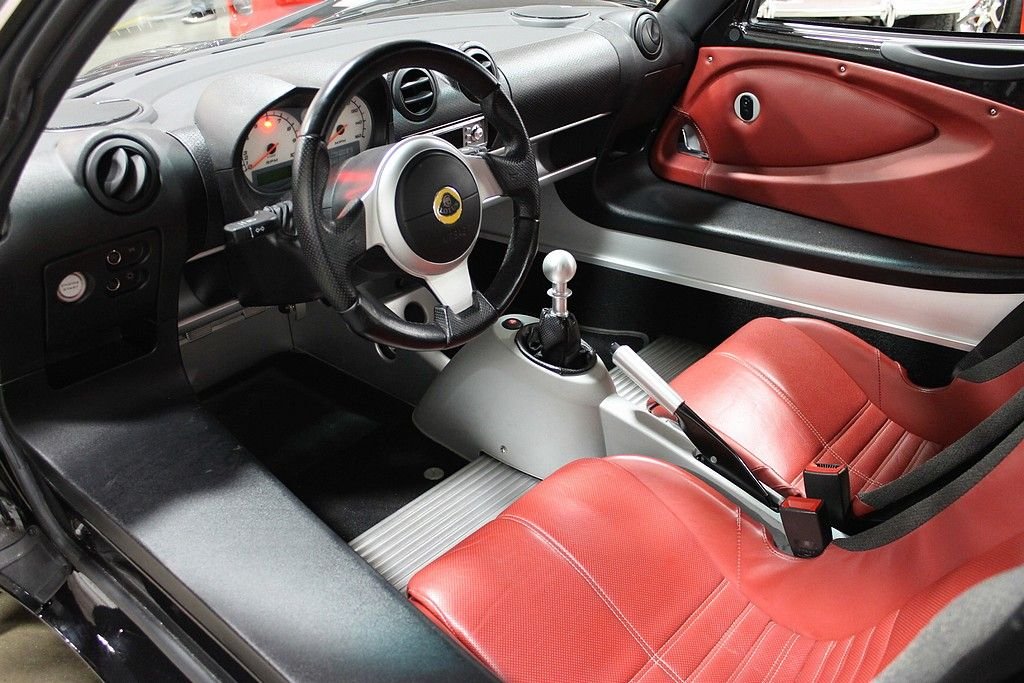 Lotus does it better than just about any other auto manufacture with the introduction of the Lotus Elise into the US market. This two seater is like nothing else on the market and with the performance that comes out of this car it will continue to amaze the driver. The 190HP 1.8L blazes up to 60mph in 5 seconds and with the low ride height and outstanding handling characteristics this affordable sports car is like nothing else that you will ever experience. Finished in Starlight Black paint and complimented well with the red leather. Options include; metallic paint, removable hardtop, and the Touring package which gave you more insulation, power windows, leather seats, Blaupunkt stereo with MP3, and better carpet kit. This car comes with books, keys, 3M paint protection and very low miles. The car hustles through the gears and runs flawlessly. Tires have about 50% tread life left and are mounted to the factory wheels that have been black powder coated and add some style to this great vehicle.