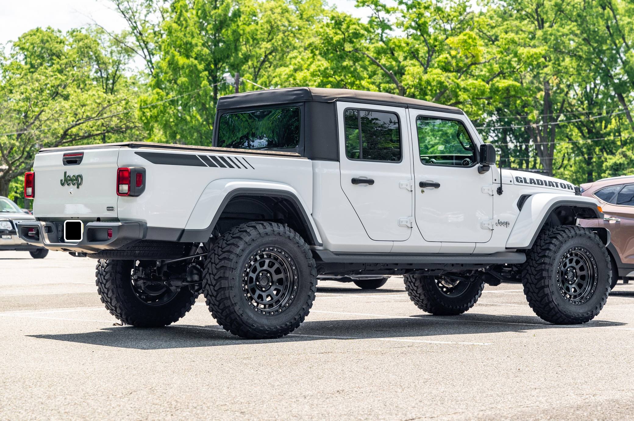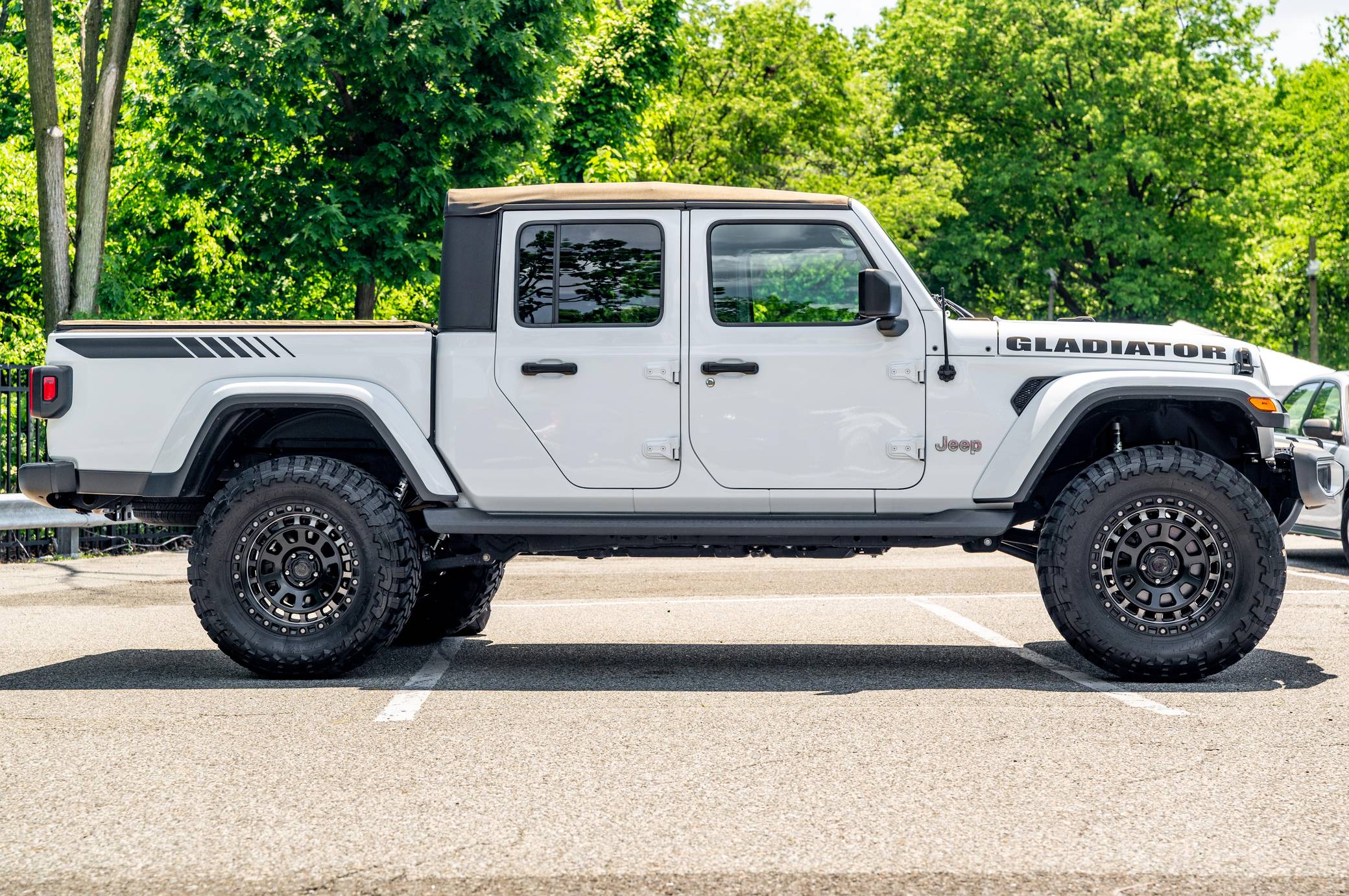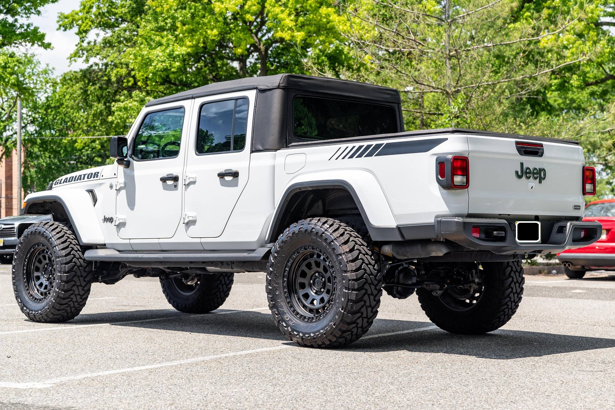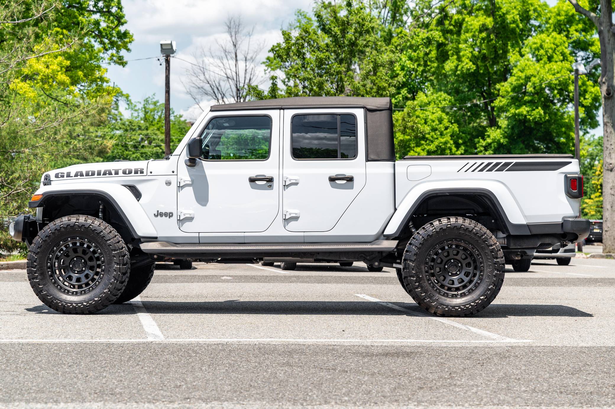 2020 Jeep Gladiator Overland 4x4, finished in Bright White clearcoat with a black soft top and a black interior. This Gladiator features the desirable 6-speed manual transmission. 73 axle ratio, fuel tank and transfer case skid plates, front fog lights, body-colored fender flares, side steps, a black Sunrider soft top, cloth upholstery, lockable rear-seat storage, a Uconnect 4 infotainment system with a 7-inch touchscreen display and Apple CarPlay and Android Auto compatibility, and an 8-speaker sound system. Modifications reported by the seller include 20-inch American Outlaw wheels with Toyo Open Country M/T tires (size 37x13. 50 R20 LT), a 4-inch lift, and Fox shocks. Jeep returned to the pickup segment after a long hiatus when it released the Gladiator for 2020. Offered only with four doors, it’s closely related to the fourth-generation Wrangler so it offers heritage-laced styling, body-on-frame construction, and excellent off-road capacity. It’s still sold new in 2022. Power comes from a 3. 6-liter V6, rated at 285 horsepower and 260 lb-ft of torque. Output is sent to all four wheels via a 6-speed manual transmission and Command-Trac part-time 4-wheel-drive system with a 2-speed transfer case.