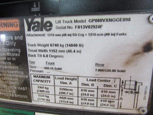 Take a look and see this nice 2010 Yale GP080VX, with V6 gas engine, automatic 2-speed, 8,000 LBS capacity, triple stage mast, 200" lift height, pneumatic tires with approximately 80% tread remaining, cab, side shift, excellent condition, current service, ready to work right now! Yale Veracitor GP-VX Series.