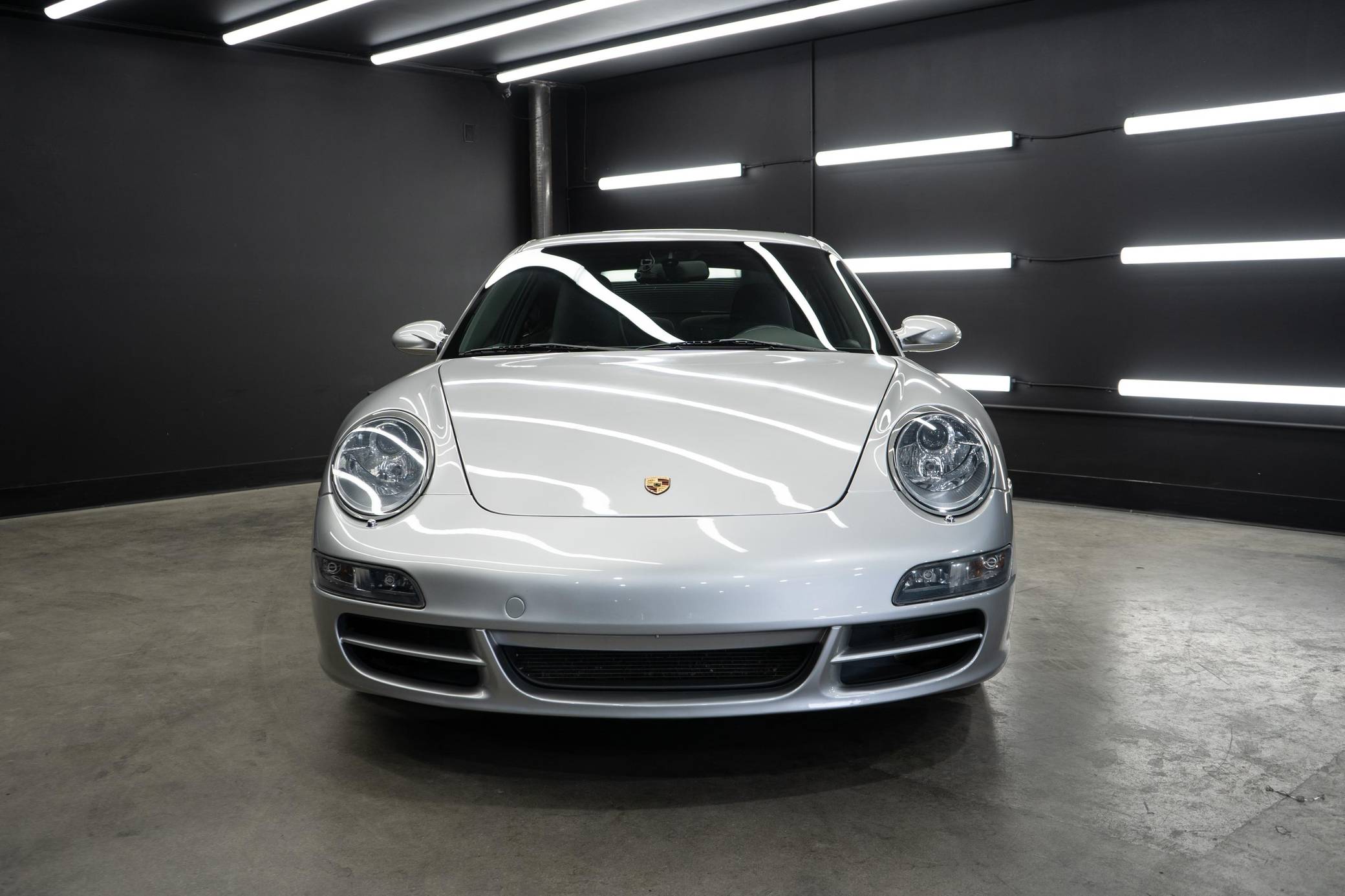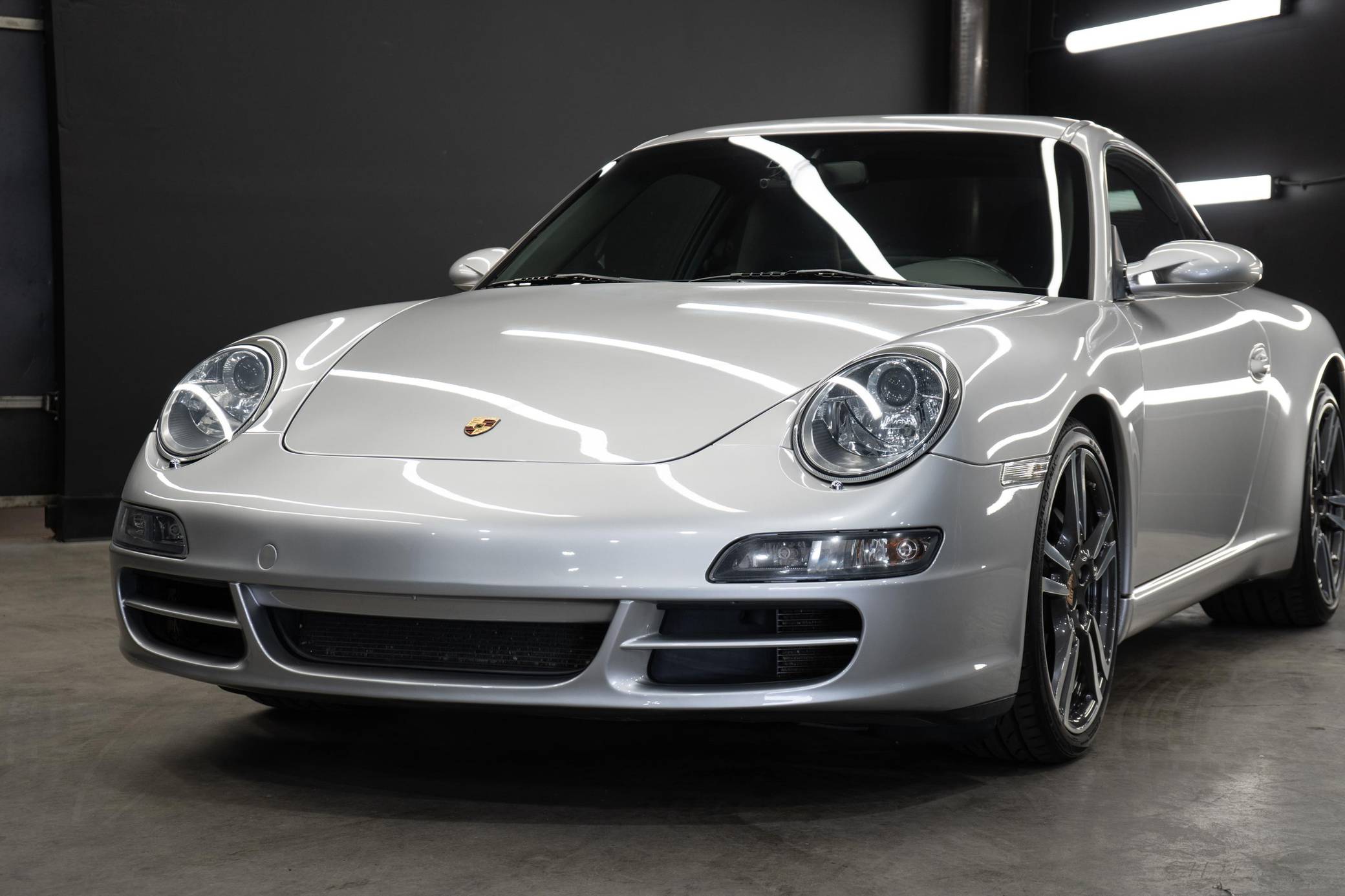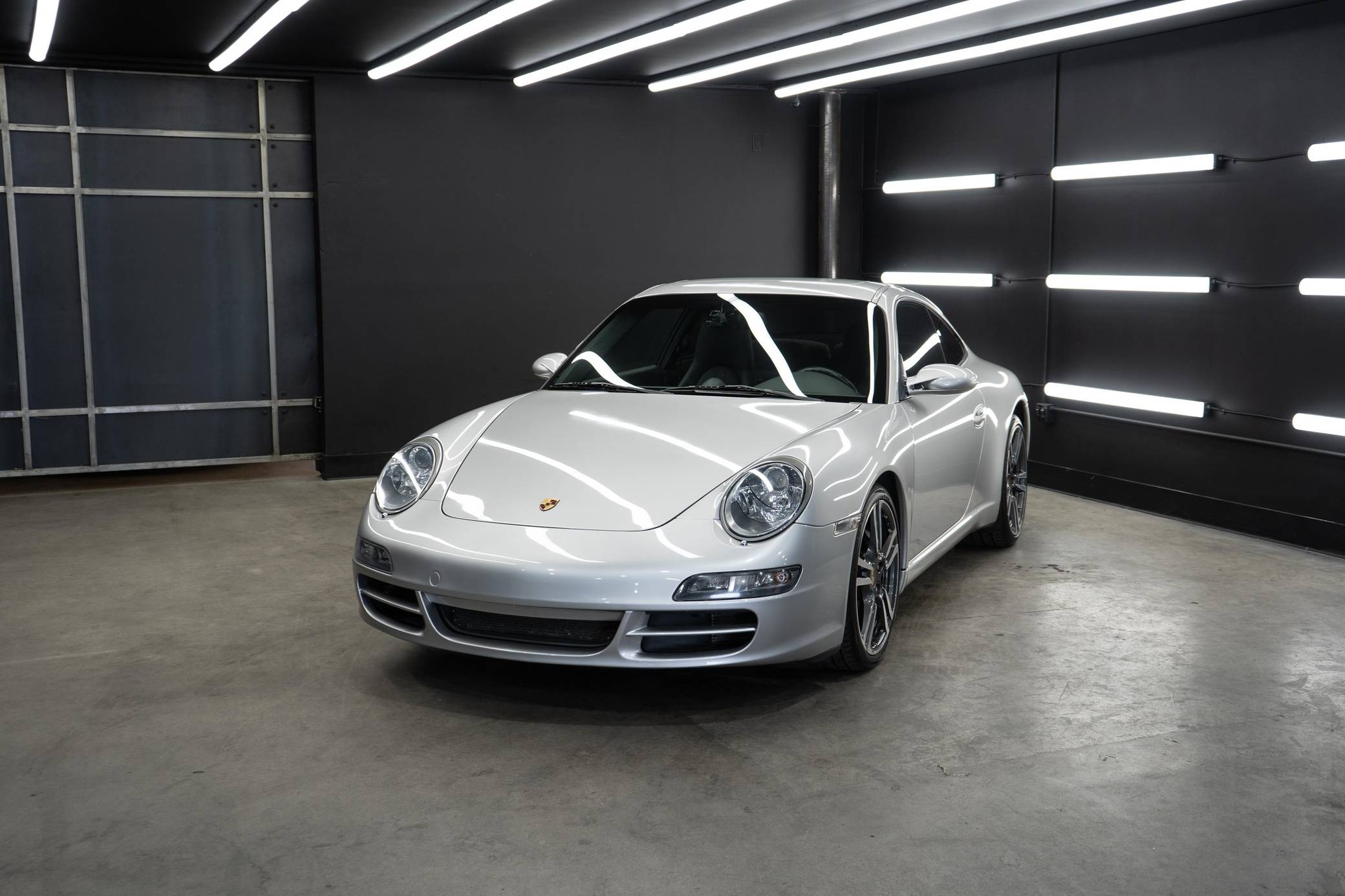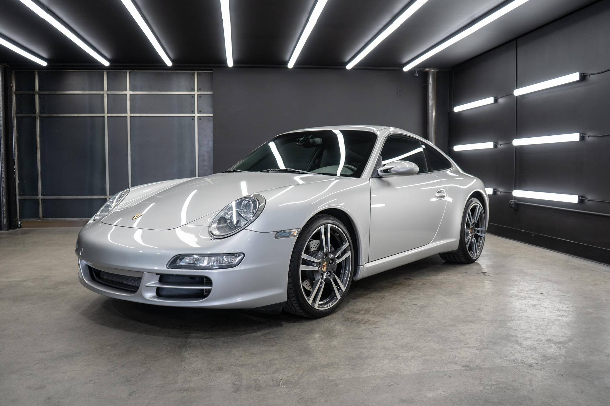 THIS… is a 2006 Porsche 911 Carrera Coupe, finished in Arctic Silver Metallic with a Stone Grey interior. Factory equipment includes the Sport Chrono Package Plus, a retractable rear spoiler, bi-xenon headlights, a power sunroof, leather upholstery, heated front seats, automatic climate control, and more as detailed below. Modifications include a set of 19-inch 997 Turbo II wheels, tinted windows, clear side marker lights, and a Kenwood head unit. The 997-generation 911 launched for 2005 with a more powerful flat-6 than the outgoing model, oval headlights, and an upgraded interior. By combining retro and modern design cues in a water-cooled 911, it was instantly beloved among enthusiasts — and it presents a compelling package for those looking for a smaller and lighter 911 from the modern era. Power comes from a 3. 6-liter flat-6, rated at 325 horsepower and 273 lb-ft of torque. The engine spins the rear wheels via a 5-speed automatic transmission.