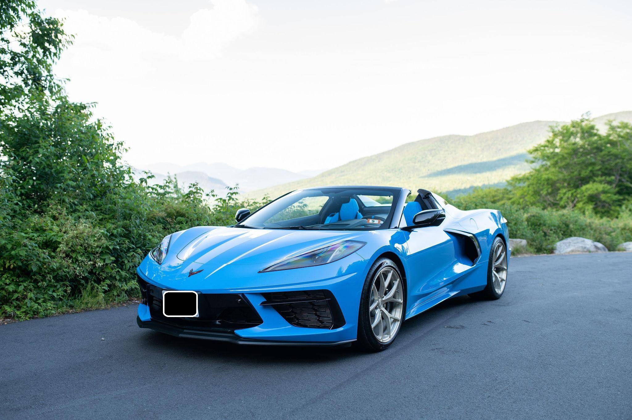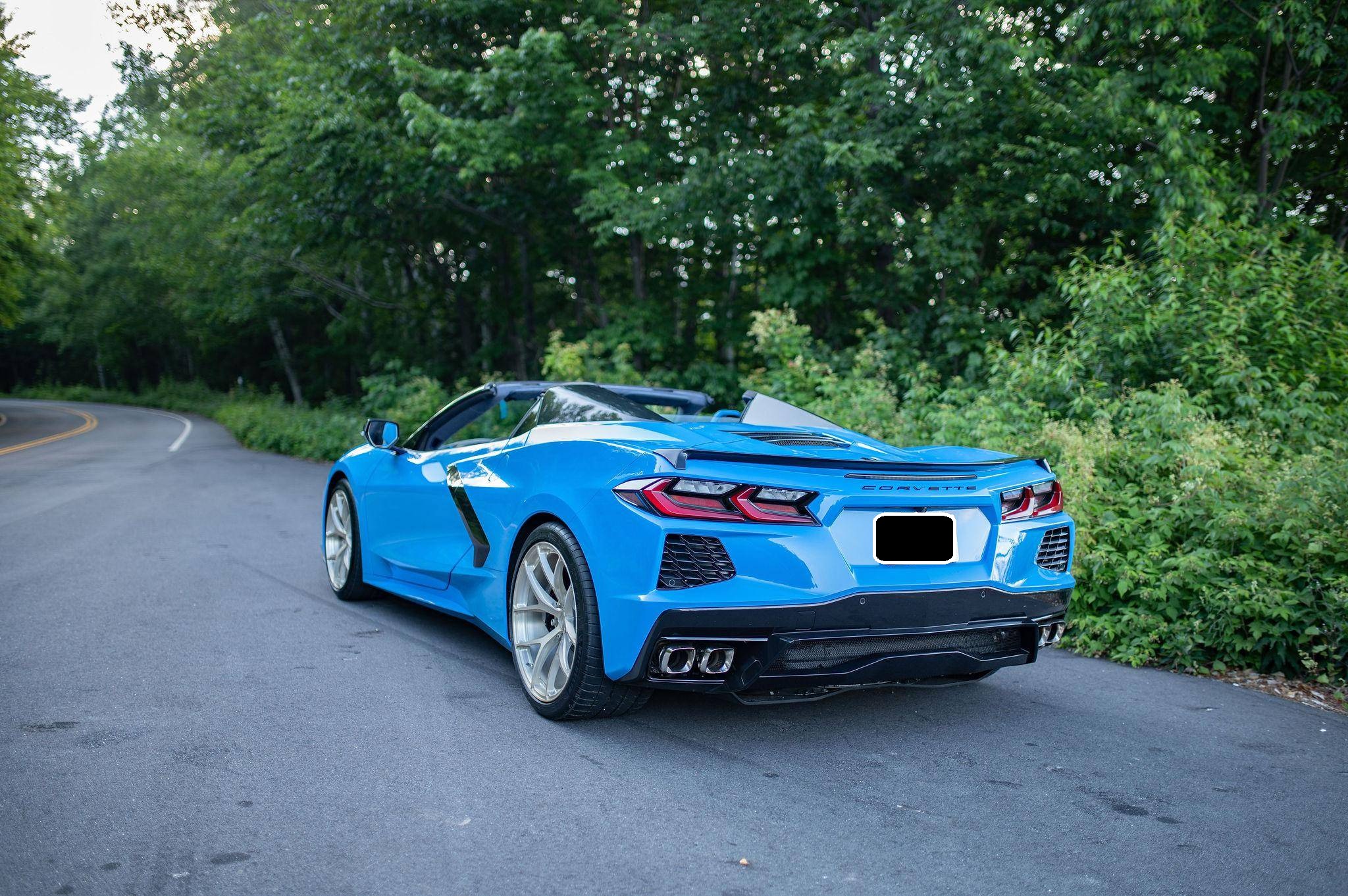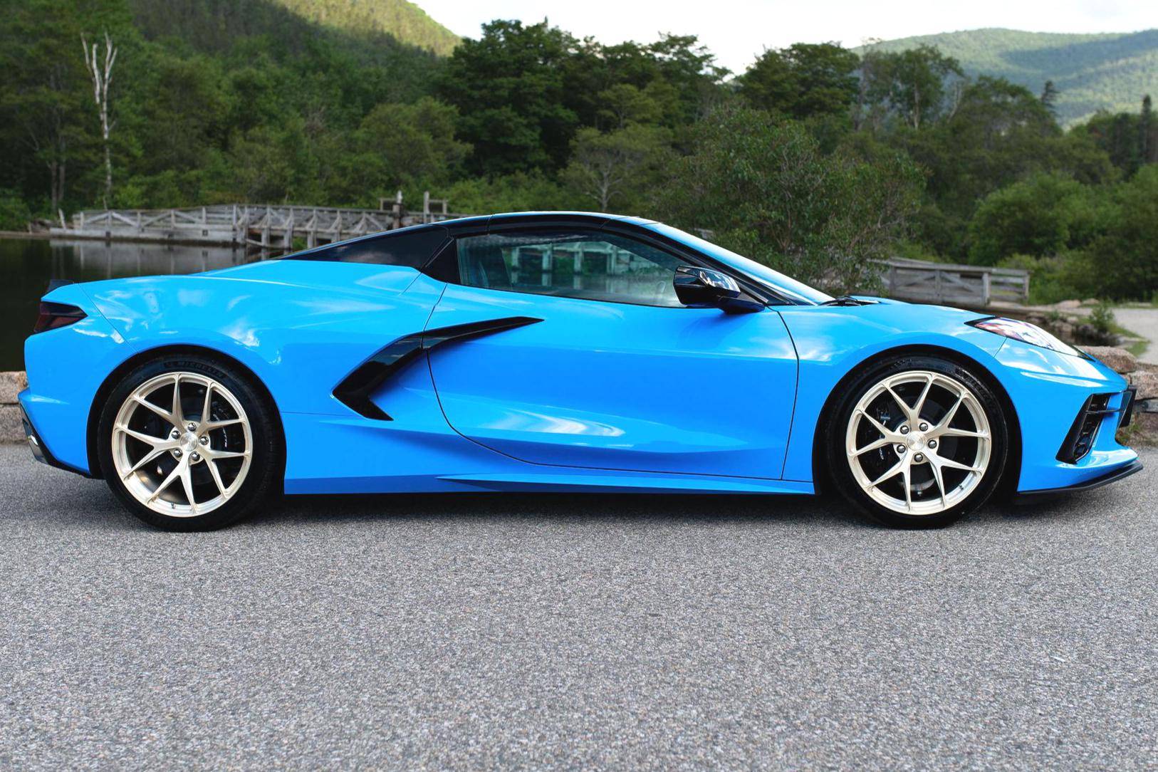 THIS… is a 2022 Chevrolet Corvette Stingray Convertible, finished in Rapid Blue with a Tension and Twilight Blue interior. The odometer on this Corvette currently displays 499 miles. Modifications reported by the seller are limited to BC Forged RZ21 gold-finished aluminum wheels (19-inch in front, 20-inch in rear) and the stock coilover suspension adjusted to a lower ride height. Released for 2020, the eighth-generation Corvette switched to a mid-mounted engine, a configuration that represented the most drastic change in the nameplate's decades-long history. Placing the V8 behind the passenger compartment allowed designers to completely reinvent the Corvette's proportions, while engineers took advantage of the rear-biased weight distribution to dial in sharper handling. The "C8" remains in production as of 2022. Power comes from a 6. 2-liter "LT2" V8, rated at 495 horsepower and 470 lb-ft of torque. Output is sent to the rear wheels via an 8-speed automatic transmission.