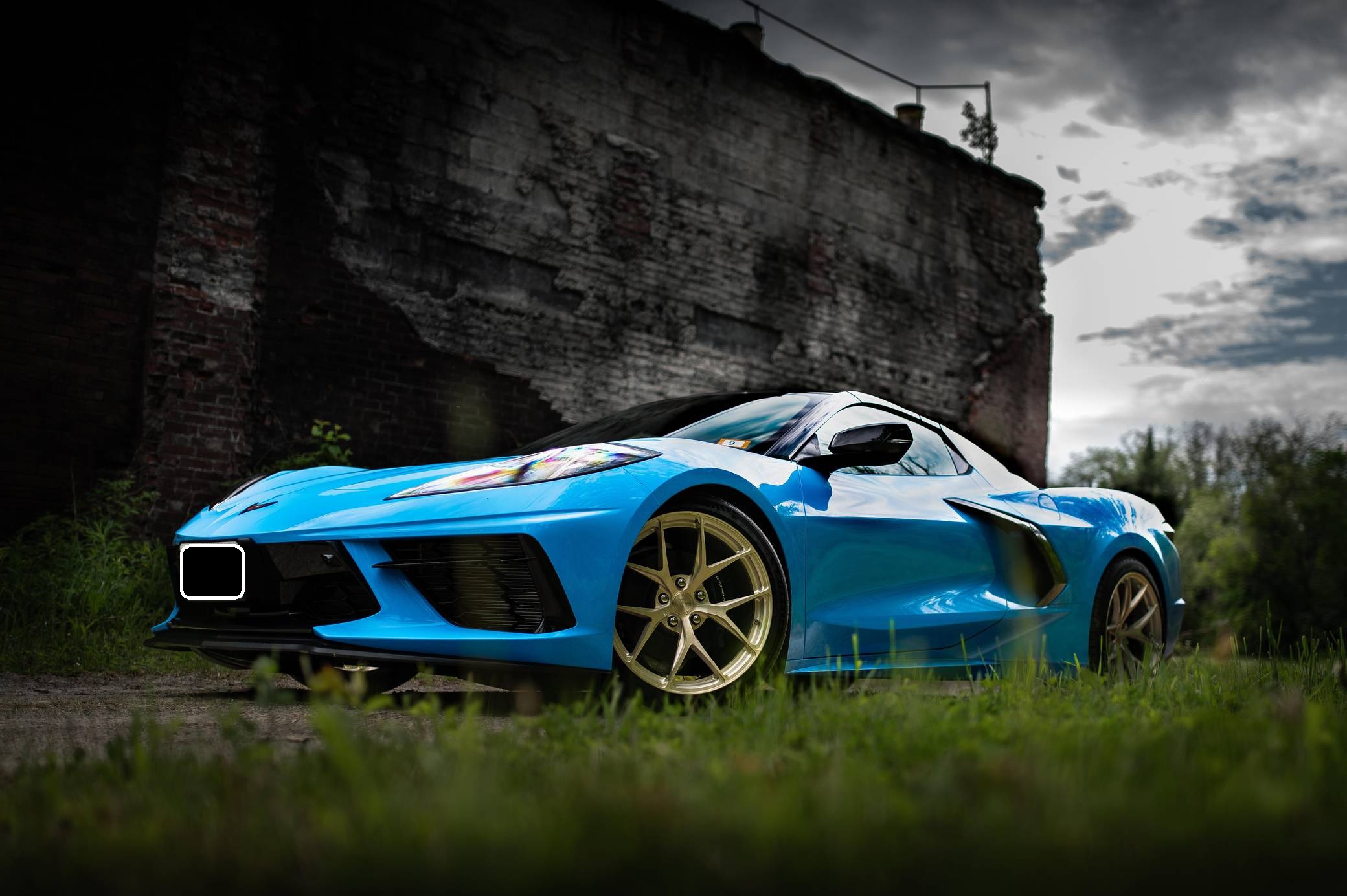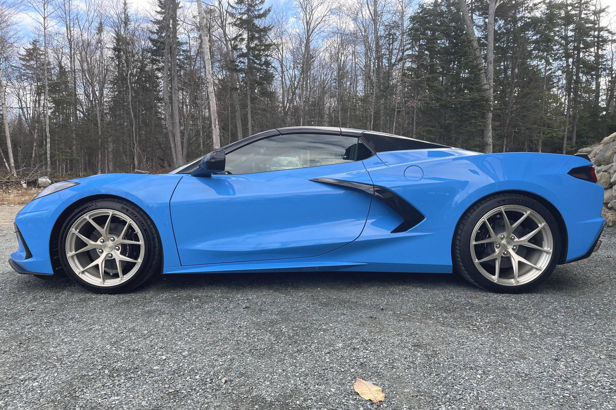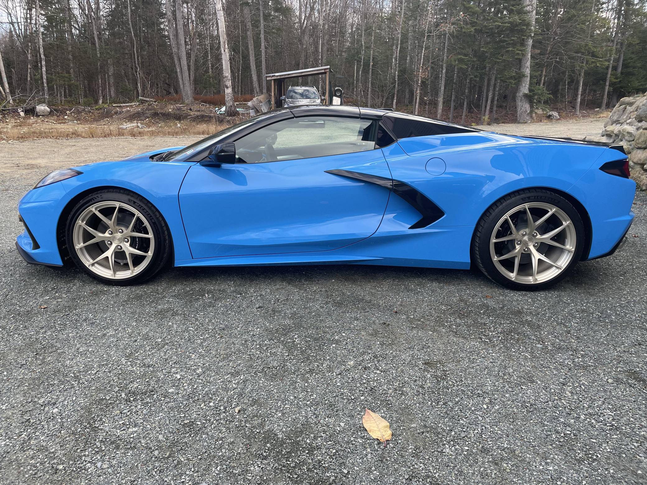 THIS… is a 2022 Chevrolet Corvette Stingray Convertible, finished in Rapid Blue with a Tension and Twilight Blue interior. The odometer on this Corvette currently displays 499 miles. Modifications reported by the seller are limited to BC Forged RZ21 gold-finished aluminum wheels (19-inch in front, 20-inch in rear) and the stock coilover suspension adjusted to a lower ride height. Released for 2020, the eighth-generation Corvette switched to a mid-mounted engine, a configuration that represented the most drastic change in the nameplate's decades-long history. Placing the V8 behind the passenger compartment allowed designers to completely reinvent the Corvette's proportions, while engineers took advantage of the rear-biased weight distribution to dial in sharper handling. The "C8" remains in production as of 2022. Power comes from a 6. 2-liter "LT2" V8, rated at 495 horsepower and 470 lb-ft of torque. Output is sent to the rear wheels via an 8-speed automatic transmission.
