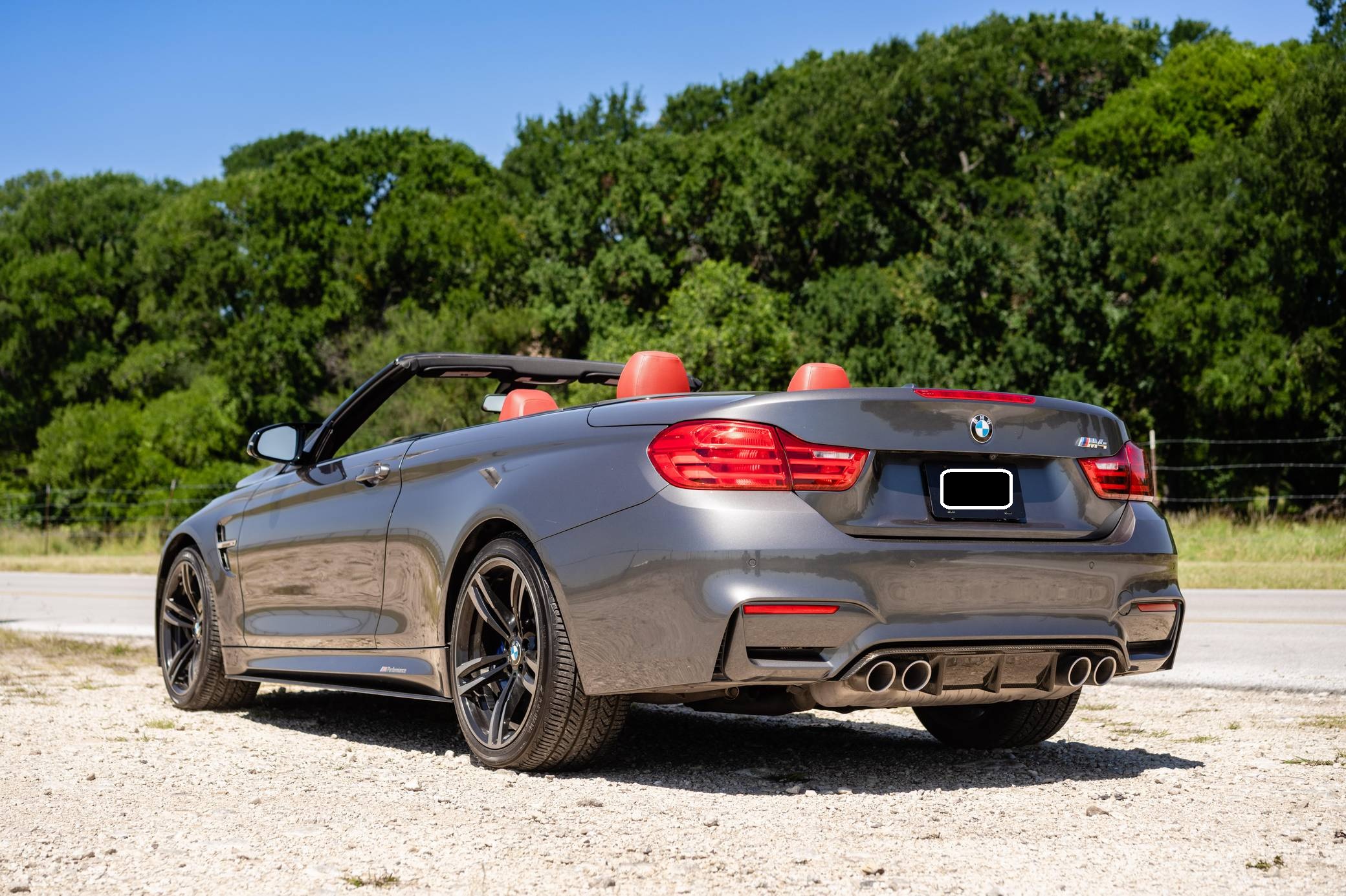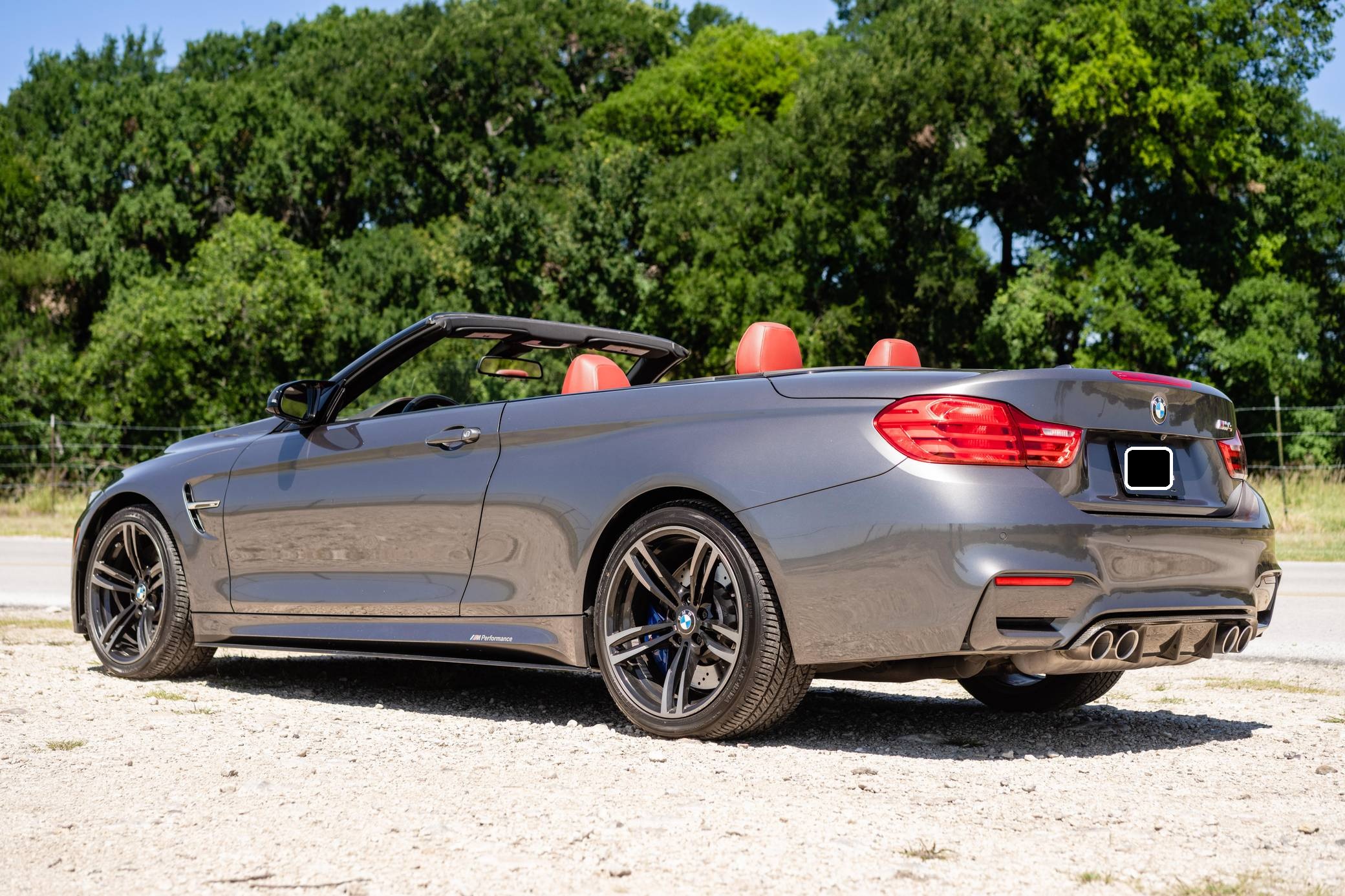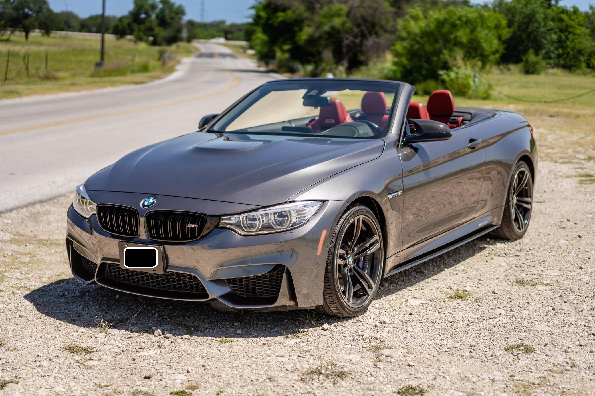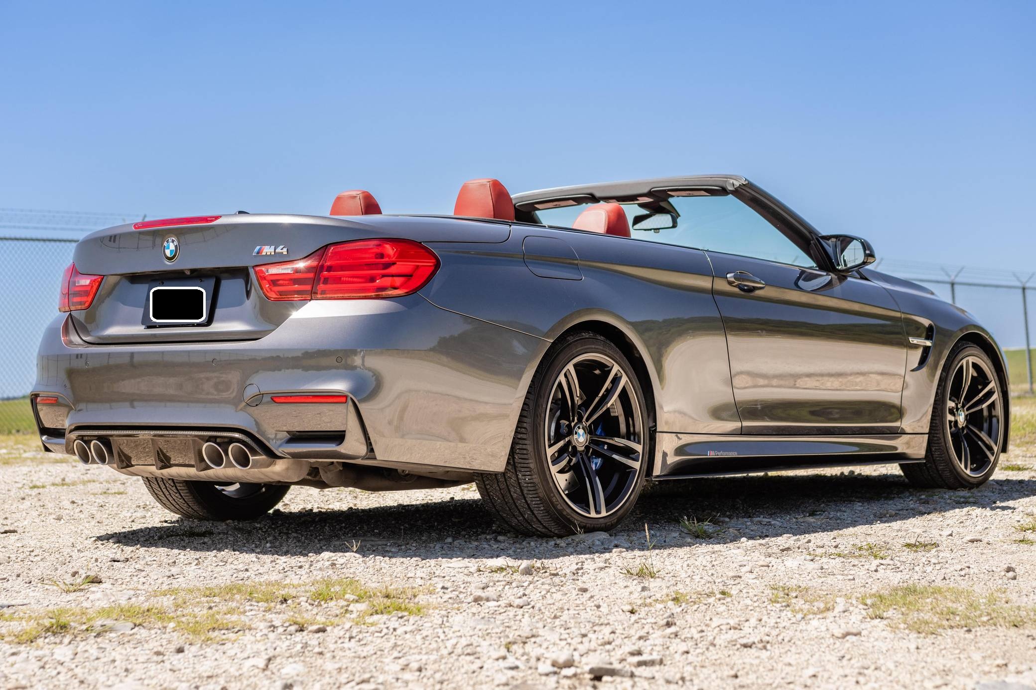 2016 BMW M4 Convertible, finished in Mineral Gray Metallic with a body-colored power hardtop and a Sakhir Orange and black interior. This BMW's odometer displays about 19,000 miles. It's equipped with the Driver Assistance Plus, Executive, and Lighting packages, 19-inch "Style 437M" wheels, black kidney grilles, carbon fiber door mirror caps, a power-operated hardtop, carbon fiber interior trim, heated and power-adjustable front seats, a wind deflector, a Harman Kardon surround sound system, and a navigation system, among other features. The seller reports no modifications. 2015 was the first model year for the M4, which took the torch from the two-door M3. BMW surfed the downsizing wave sweeping across the industry by replacing the naturally-aspirated V8 with a twin-turbocharged straight-6, and a significant torque increase accompanied the new engine. Chopping off two cylinders and replacing metal bits with carbon fiber components allowed BMW to make the M4 up to 176 pounds lighter than the M3 it replaced. Production ended in 2020. Power comes from a 3. 0-liter turbocharged straight-6, rated at 425 horsepower and 406 lb-ft of torque. Called "S55" internally, it spins the rear wheels via a 7-speed automatic transmission.