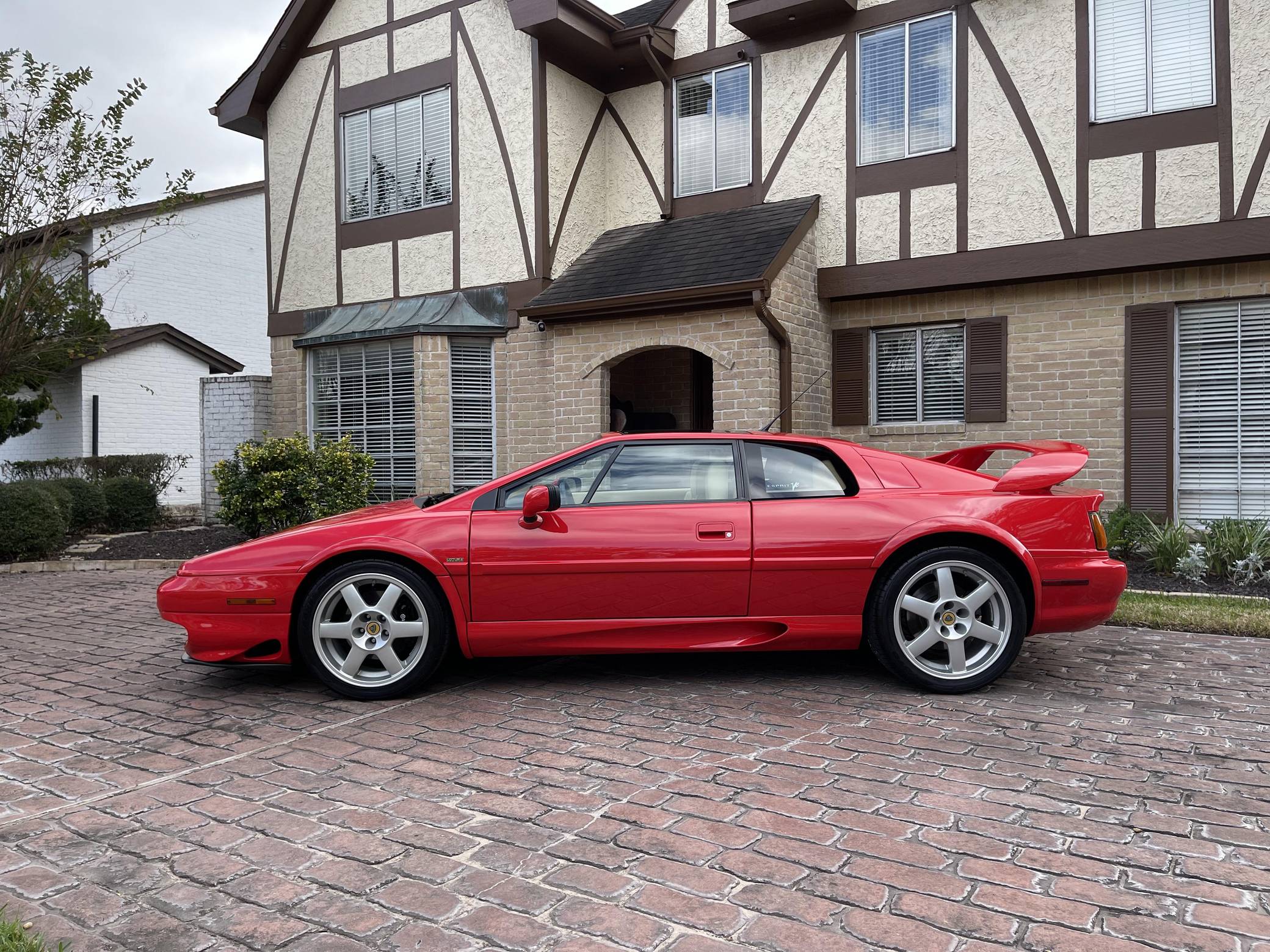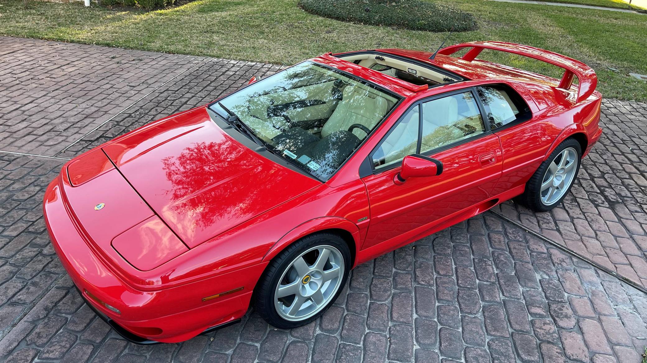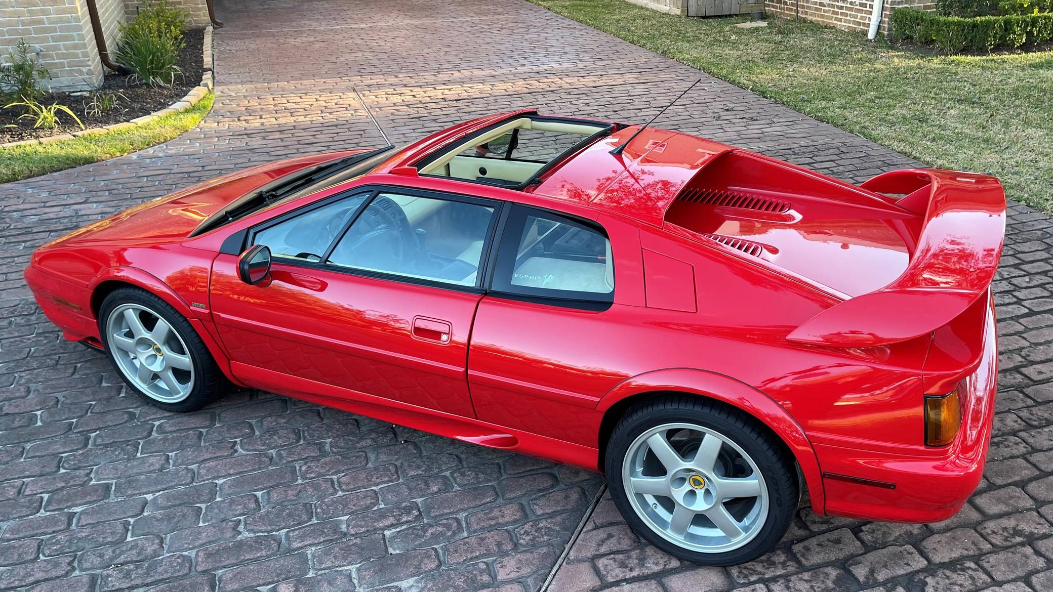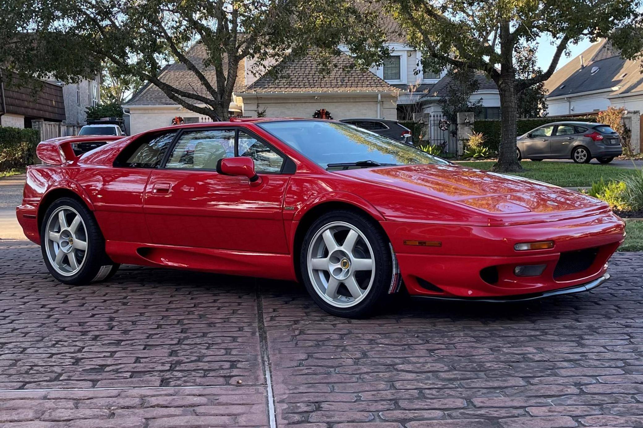 1998 Lotus Esprit V8, finished in Calypso Red with a Magnolia interior. The odometer currently indicates about 36,700 miles. It's equipped with dual fuel tanks, 17-inch front and 18-inch rear wheels, a removable glass roof panel, leather upholstery, sport seats, an Alpine sound system, and more as detailed below. Modifications reported by the seller include the installation of a factory center-outlet exhaust used on the 2004 Lotus Esprit V8 Final Edition, an upgraded three-core radiator with Spal fans, a PUK Red Race ECU upgrade (factory ECU chips included), and ductless ceramic brake pads. Lotus released the Esprit in 1976 and made numerous design and mechanical updates to the model over the next 28 years. Peter Stevens gave it a less angular exterior design in 1988, power steering was made standard in 1994, and the 1997 model year brought a twin-turbocharged V8 (the first in the Esprit's history) that was designed in-house. Production ended in 2004, and only a small handful were shipped to North America. Power comes from a 3. 5-liter twin-turbocharged V8, rated at 350 horsepower and 295 lb-ft of torque in stock form. Due to the modifications performed to this Esprit, it may make more power, but a dyno sheet was not provided to confirm. Mid-mounted, it spins the rear wheels via a 5-speed manual transaxle.