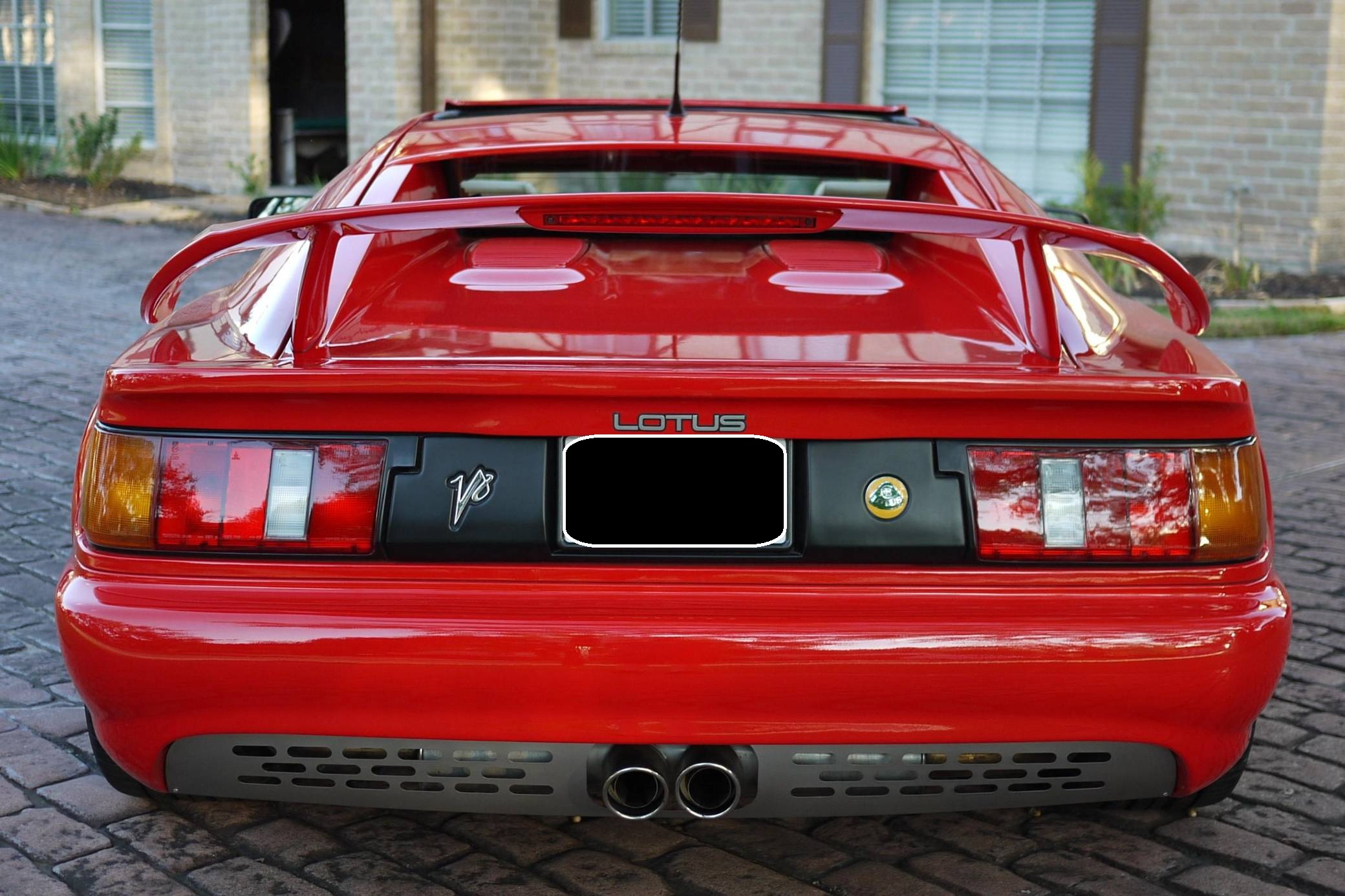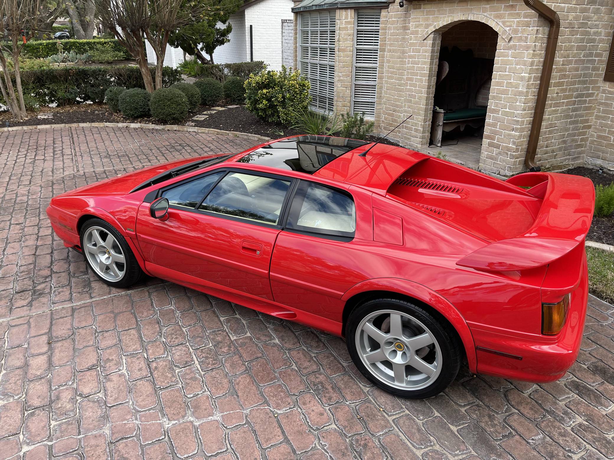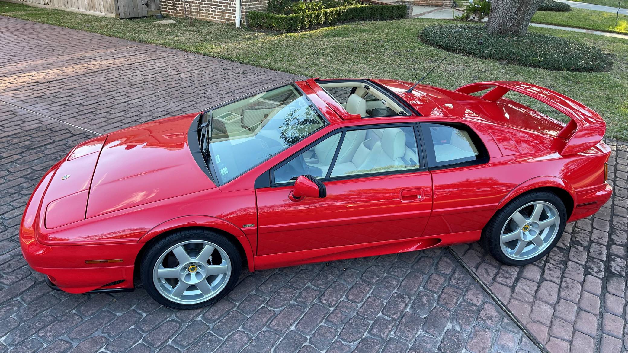 1998 Lotus Esprit V8, finished in Calypso Red with a Magnolia interior. The odometer currently indicates about 36,700 miles. It's equipped with dual fuel tanks, 17-inch front and 18-inch rear wheels, a removable glass roof panel, leather upholstery, sport seats, an Alpine sound system, and more as detailed below. Modifications reported by the seller include the installation of a factory center-outlet exhaust used on the 2004 Lotus Esprit V8 Final Edition, an upgraded three-core radiator with Spal fans, a PUK Red Race ECU upgrade (factory ECU chips included), and ductless ceramic brake pads. Lotus released the Esprit in 1976 and made numerous design and mechanical updates to the model over the next 28 years. Peter Stevens gave it a less angular exterior design in 1988, power steering was made standard in 1994, and the 1997 model year brought a twin-turbocharged V8 (the first in the Esprit's history) that was designed in-house. Production ended in 2004, and only a small handful were shipped to North America. Power comes from a 3. 5-liter twin-turbocharged V8, rated at 350 horsepower and 295 lb-ft of torque in stock form. Due to the modifications performed to this Esprit, it may make more power, but a dyno sheet was not provided to confirm. Mid-mounted, it spins the rear wheels via a 5-speed manual transaxle.