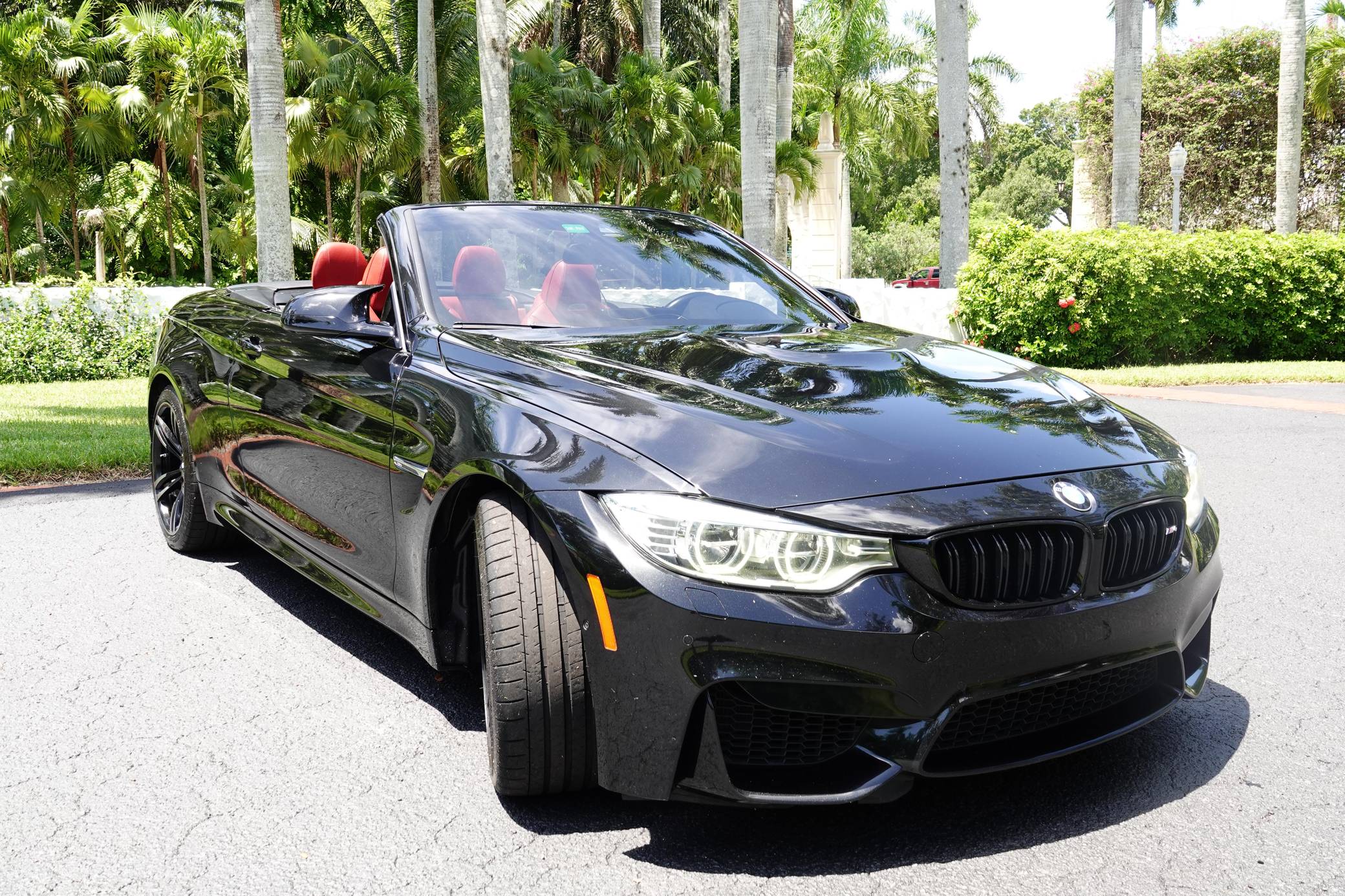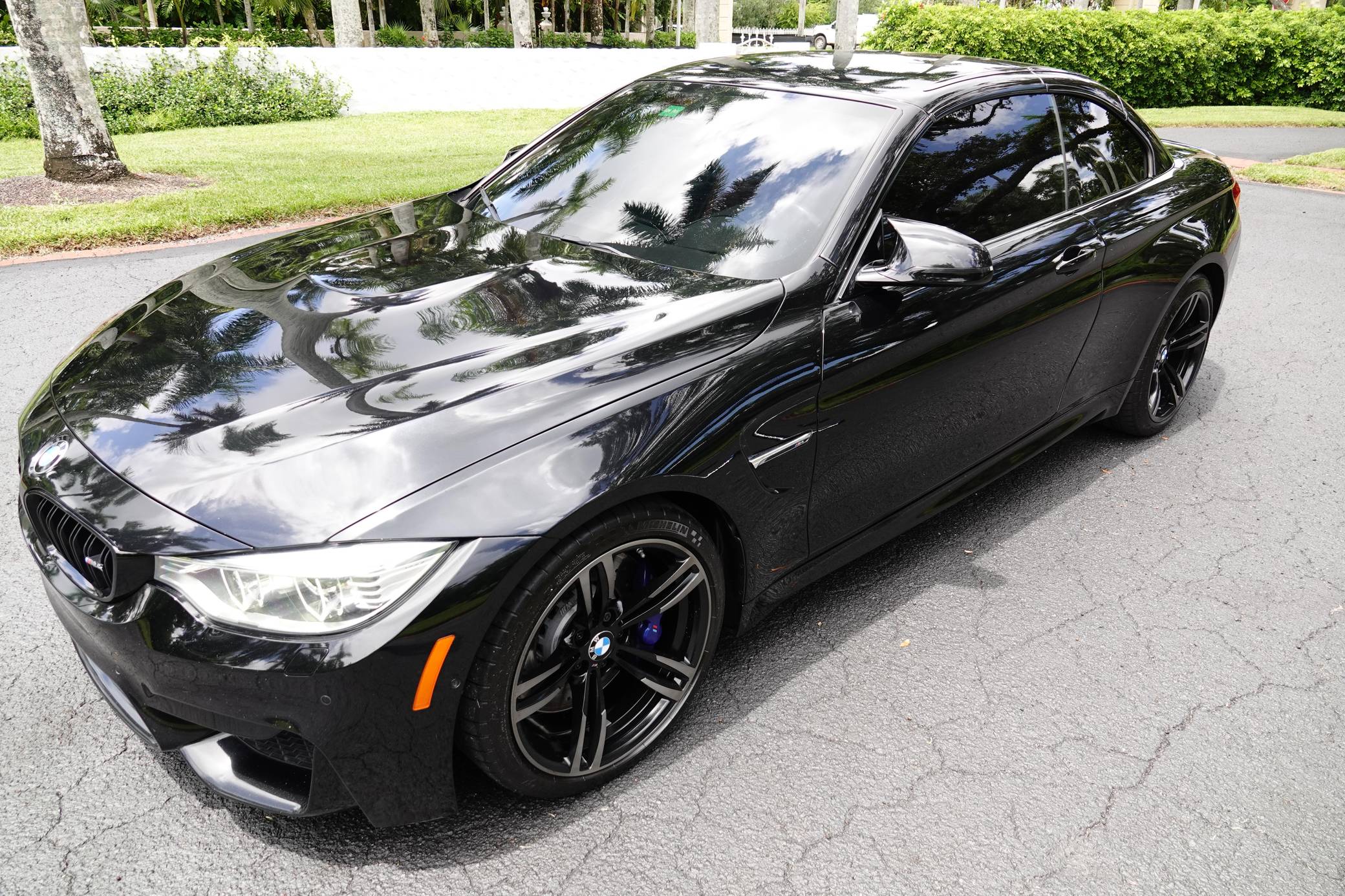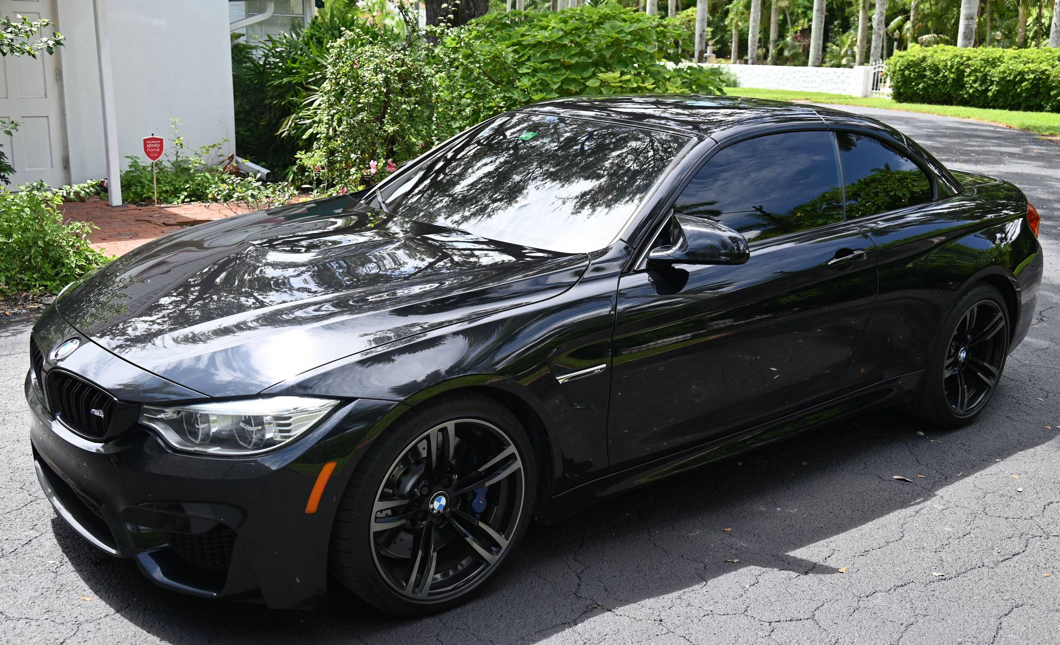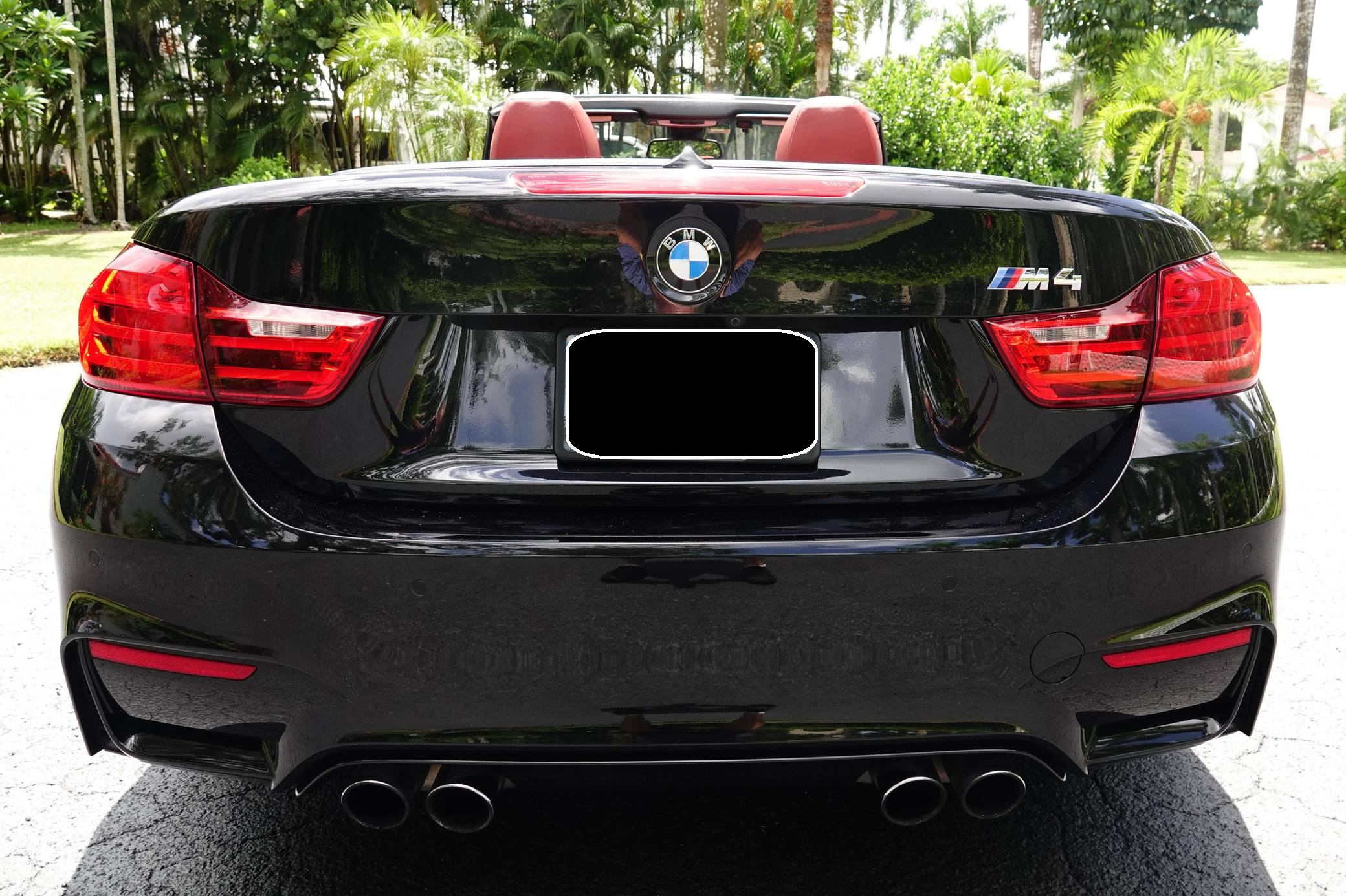 2016 BMW M4 Convertible, finished in Black Sapphire Metallic with a Sakhir Orange and black interior. Factory equipment includes the Executive Package, Driver Assistance Plus, the Lighting Package, Dynamic Stability Control (DSC), a power-retractable hardtop, power-adjustable and heated front seats, and a Harman/Kardon surround sound system. The only modifications reported by the seller are black kidney grilles, tinted windows, and paint protection film on the rear wheel arches. 2015 was the first model year for the M4, which took the torch from the two-door M3. BMW surfed the downsizing wave sweeping across the industry by replacing the naturally-aspirated V8 with a twin-turbocharged straight-6, and a significant torque increase accompanied the new engine. Chopping off two cylinders and replacing metal bits with carbon fiber components allowed BMW to make the M4 up to 176 pounds lighter than the M3 it replaced. Production ended in 2020. Power comes from an "S55" 3. 0-liter turbocharged straight-6, rated at 425 horsepower and 406 lb-ft of torque. Output is sent to the rear wheels via a 7-speed double-clutch automatic transmission.