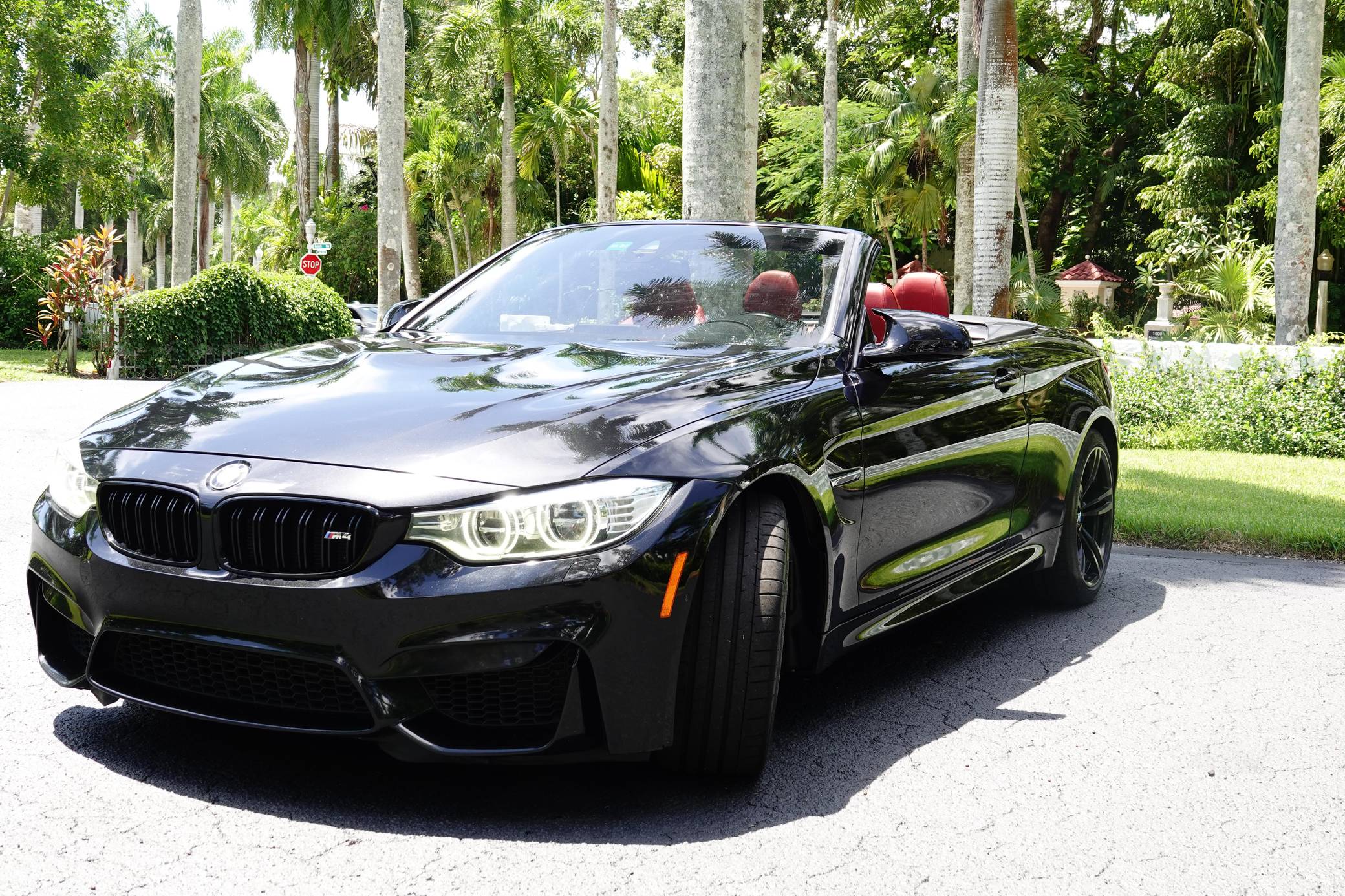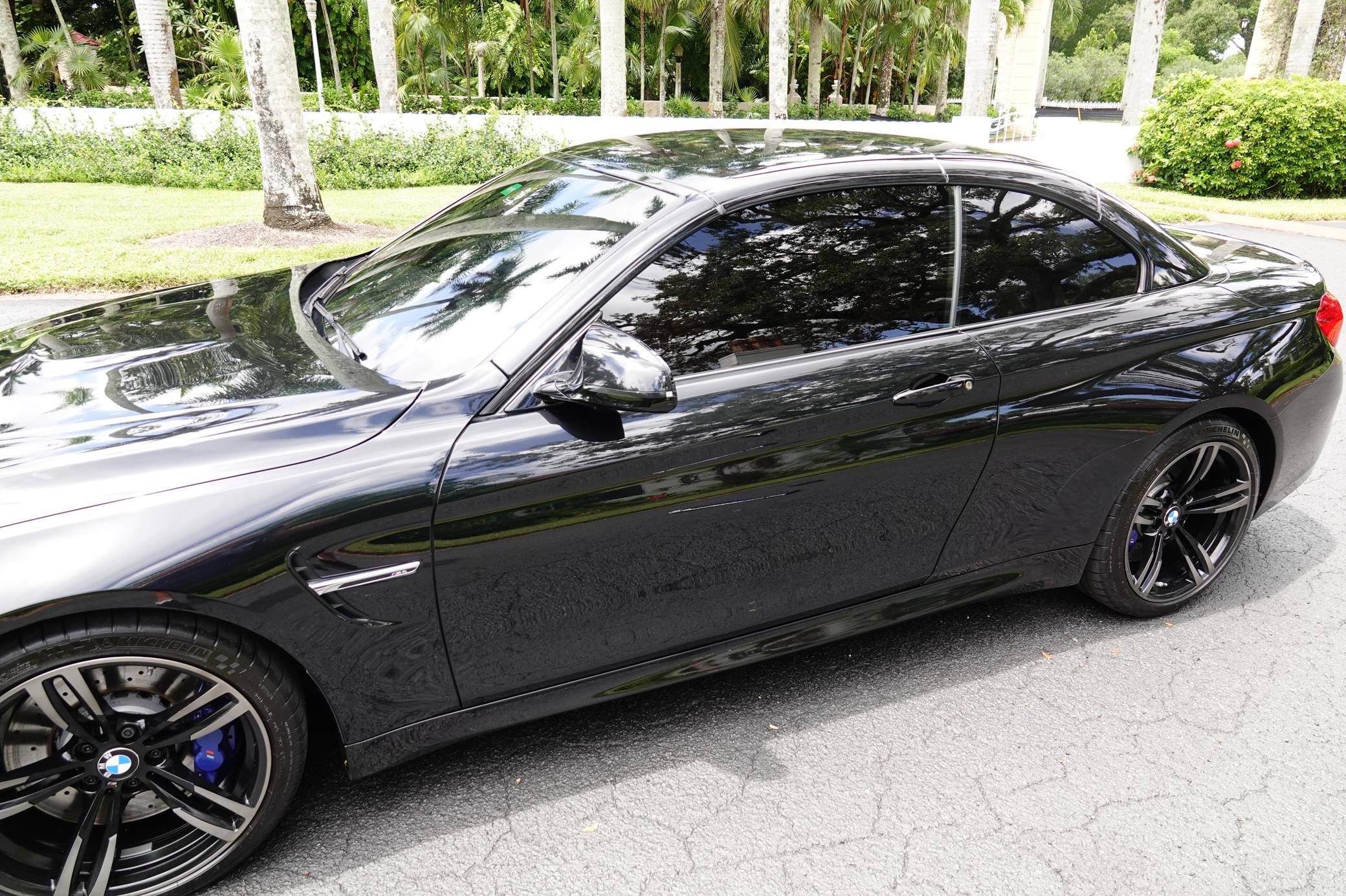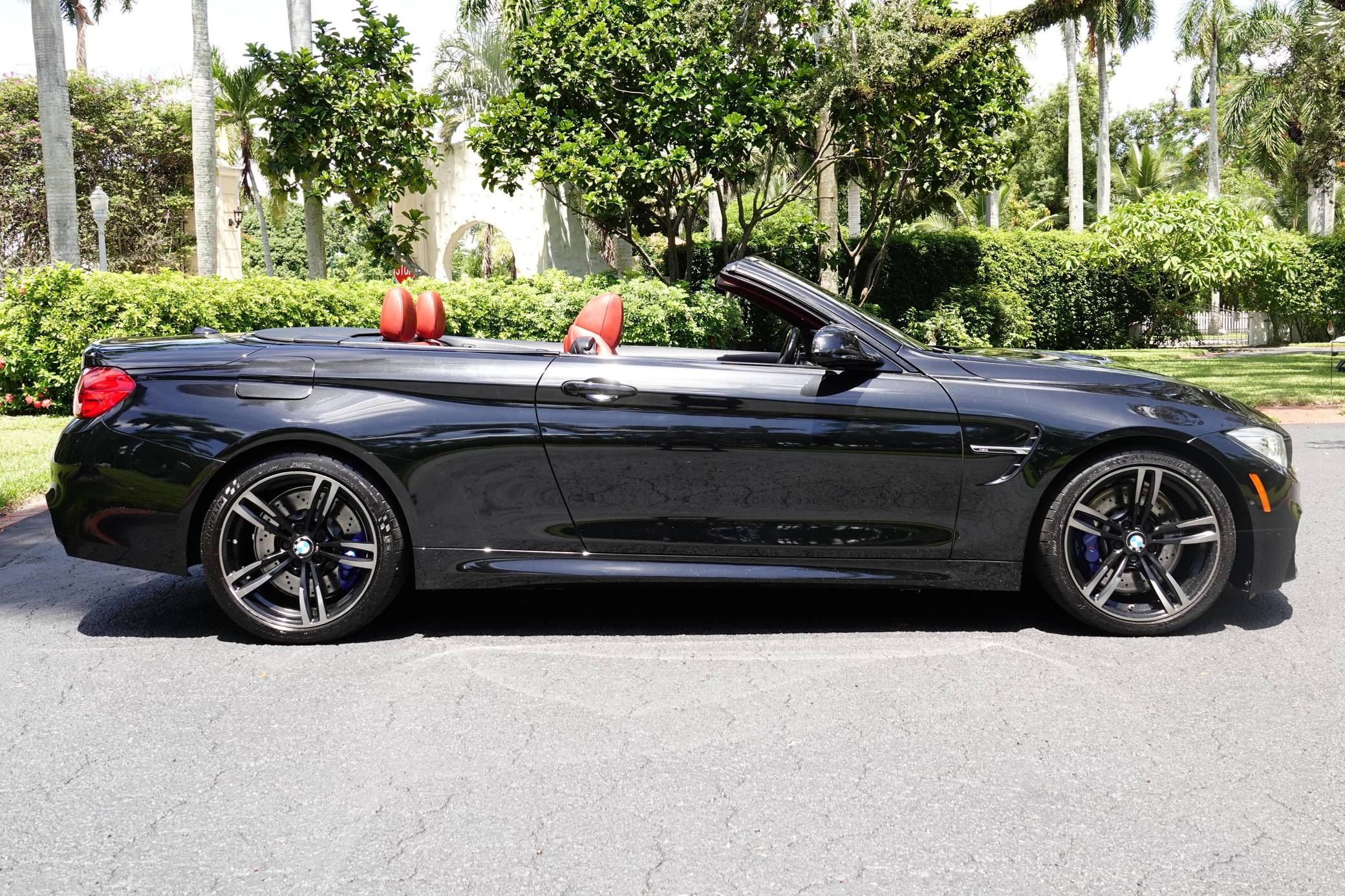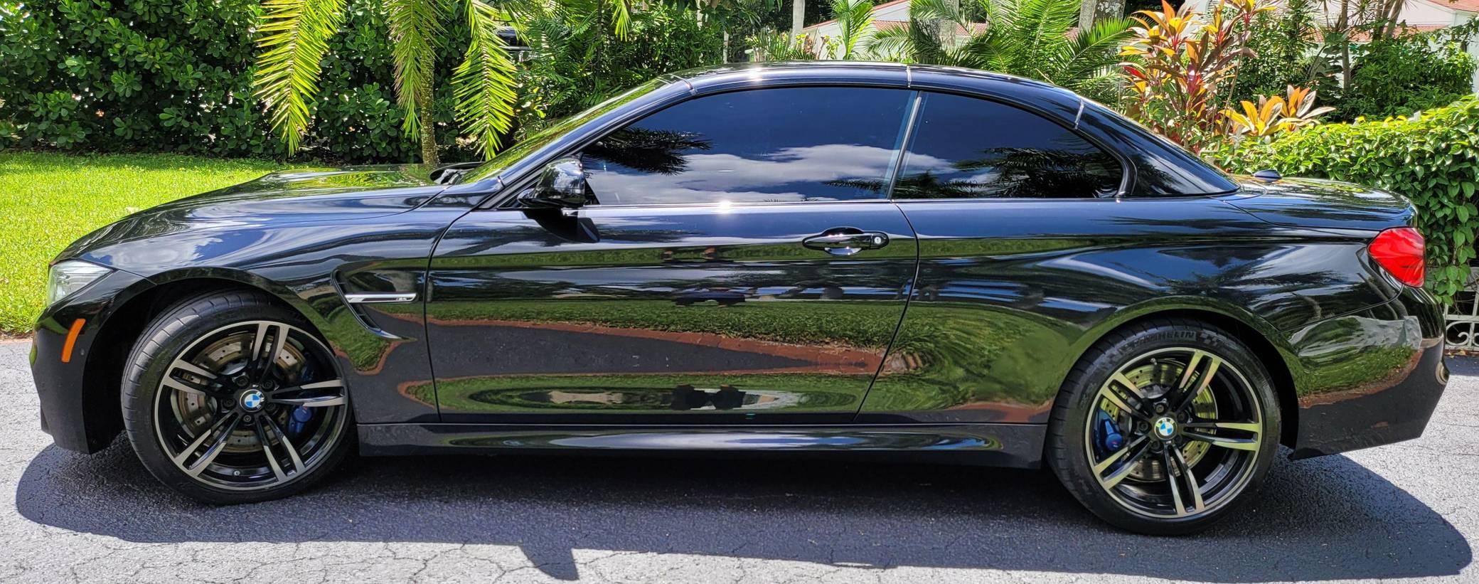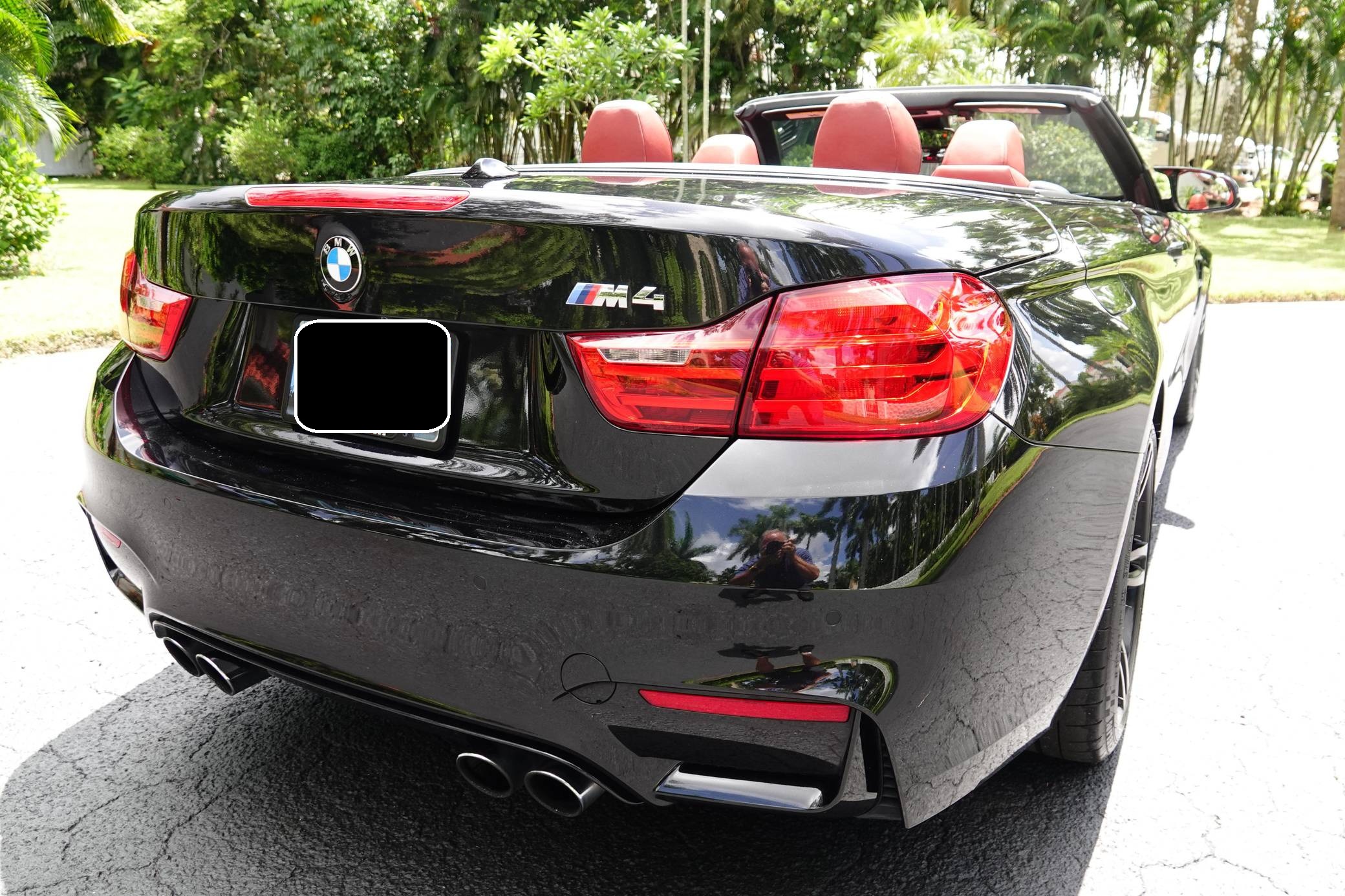 2016 BMW M4 Convertible, finished in Black Sapphire Metallic with a Sakhir Orange and black interior. Factory equipment includes the Executive Package, Driver Assistance Plus, the Lighting Package, Dynamic Stability Control (DSC), a power-retractable hardtop, power-adjustable and heated front seats, and a Harman/Kardon surround sound system. The only modifications reported by the seller are black kidney grilles, tinted windows, and paint protection film on the rear wheel arches. 2015 was the first model year for the M4, which took the torch from the two-door M3. BMW surfed the downsizing wave sweeping across the industry by replacing the naturally-aspirated V8 with a twin-turbocharged straight-6, and a significant torque increase accompanied the new engine. Chopping off two cylinders and replacing metal bits with carbon fiber components allowed BMW to make the M4 up to 176 pounds lighter than the M3 it replaced. Production ended in 2020. Power comes from an "S55" 3. 0-liter turbocharged straight-6, rated at 425 horsepower and 406 lb-ft of torque. Output is sent to the rear wheels via a 7-speed double-clutch automatic transmission.