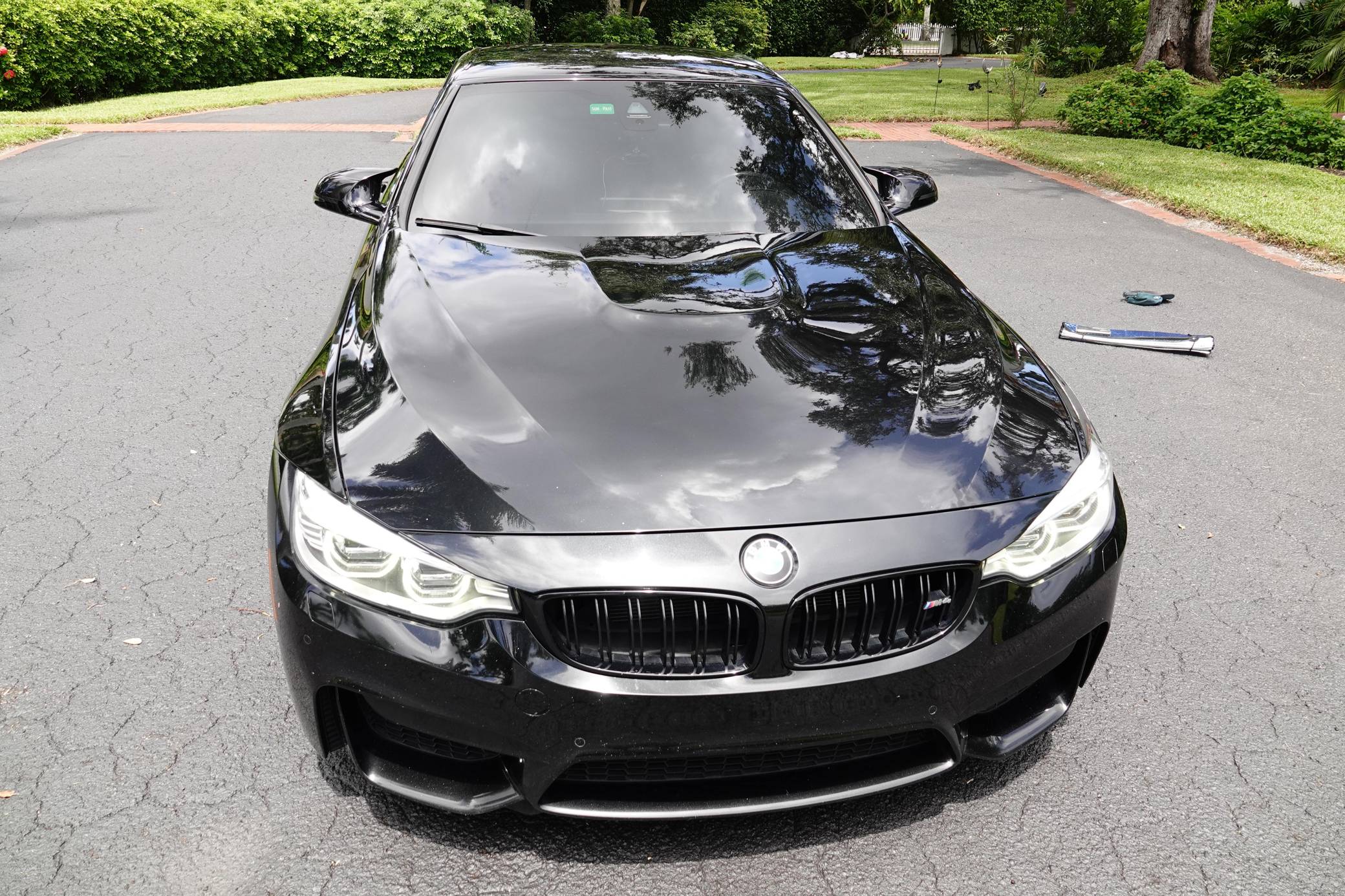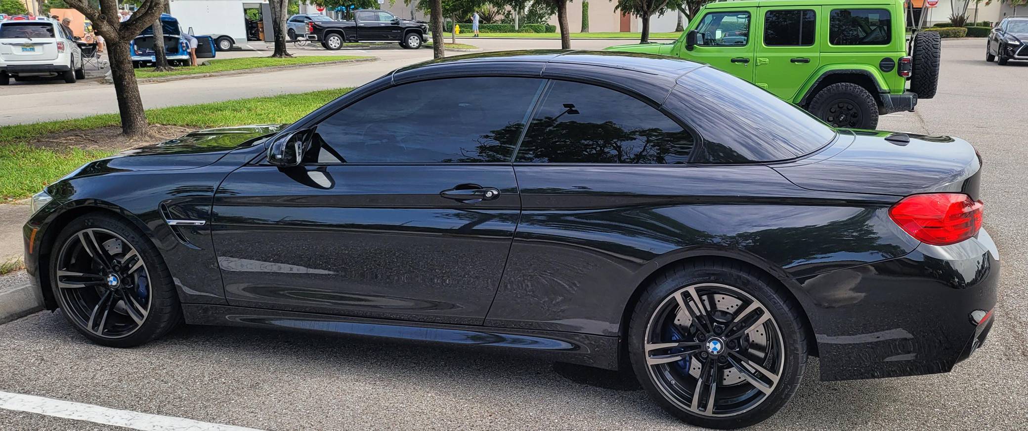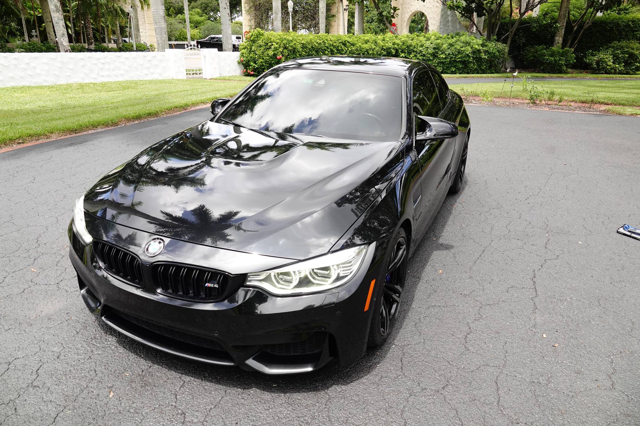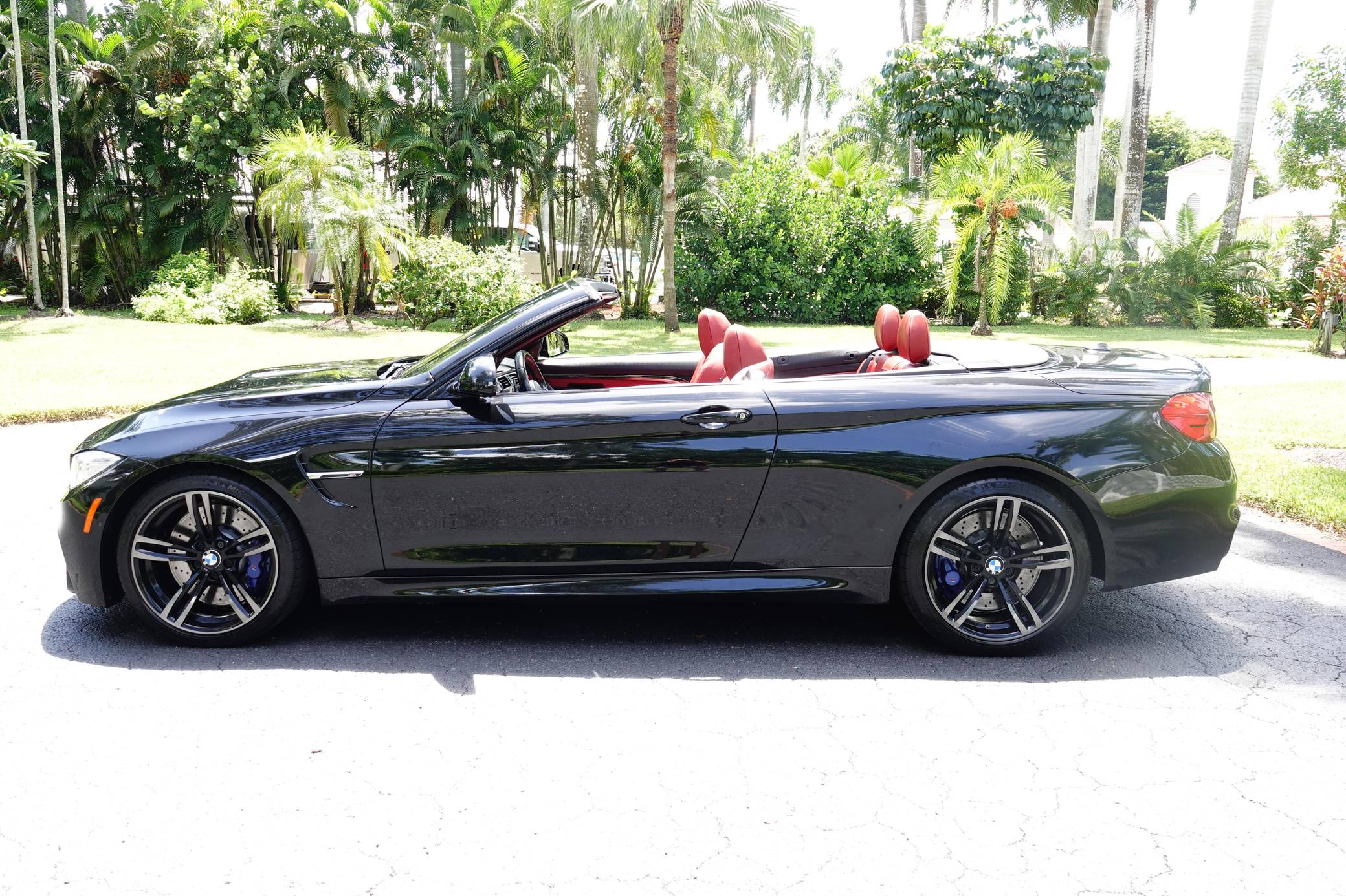 2016 BMW M4 Convertible, finished in Black Sapphire Metallic with a Sakhir Orange and black interior. Factory equipment includes the Executive Package, Driver Assistance Plus, the Lighting Package, Dynamic Stability Control (DSC), a power-retractable hardtop, power-adjustable and heated front seats, and a Harman/Kardon surround sound system. The only modifications reported by the seller are black kidney grilles, tinted windows, and paint protection film on the rear wheel arches. 2015 was the first model year for the M4, which took the torch from the two-door M3. BMW surfed the downsizing wave sweeping across the industry by replacing the naturally-aspirated V8 with a twin-turbocharged straight-6, and a significant torque increase accompanied the new engine. Chopping off two cylinders and replacing metal bits with carbon fiber components allowed BMW to make the M4 up to 176 pounds lighter than the M3 it replaced. Production ended in 2020. Power comes from an "S55" 3. 0-liter turbocharged straight-6, rated at 425 horsepower and 406 lb-ft of torque. Output is sent to the rear wheels via a 7-speed double-clutch automatic transmission.