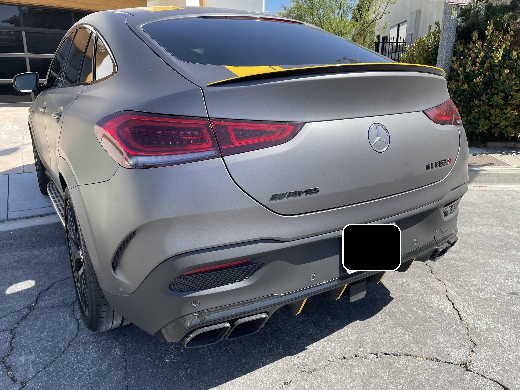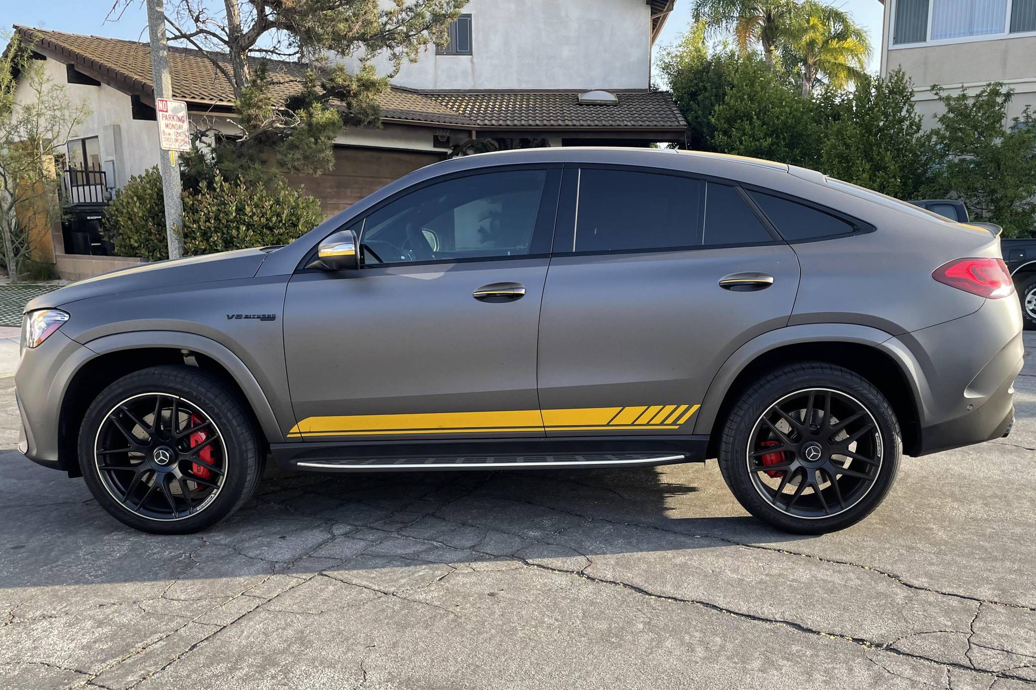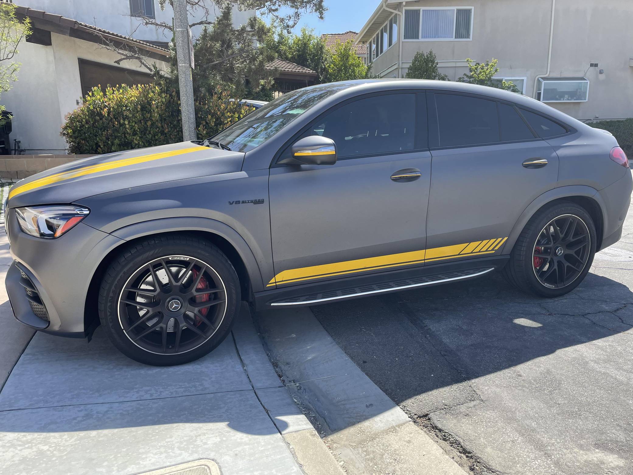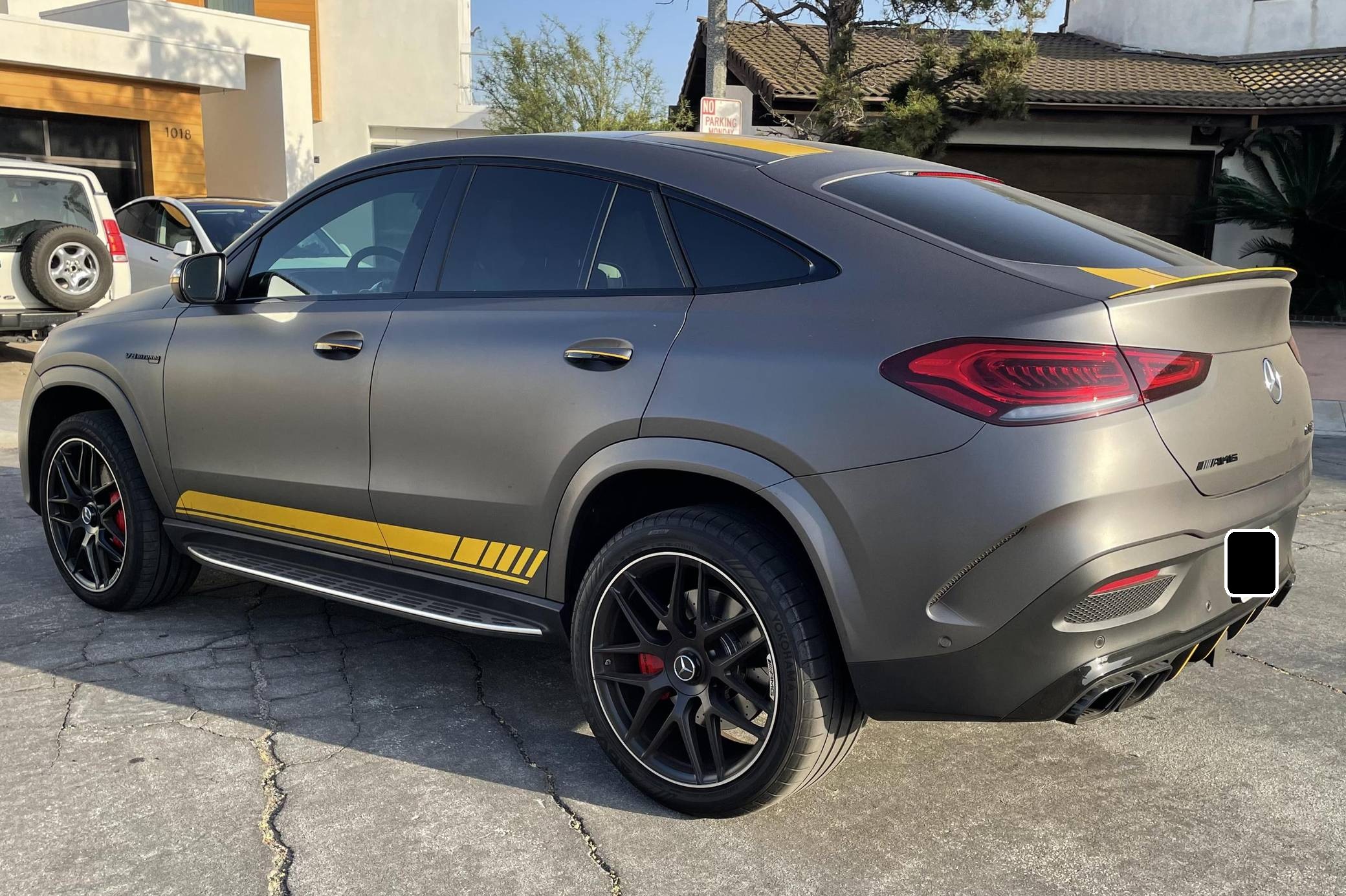 2021 Mercedes-AMG GLE63 S Coupe, finished in Obsidian Black Metallic with a Matte Dark Grey vinyl wrap and a Red/Black interior. Equipped with the AMG Night, the Driver Assistance Plus, and the Warmth and Comfort packages, as well as 22-inch forged AMG wheels, Nappa leather upholstery, a Burmester Surround Sound system, and more as detailed below. Modifications reported by the seller are limited to 3M Matte Grey exterior vinyl wrap. Launched for 2020, the W167-generation GLE offers a more spacious interior than its predecessor, a sleeker-looking exterior design, and a much longer list of standard and optional tech features. It's new from the ground up and offered in two body styles: regular SUV and the sportier-looking Coupe with a lower greenhouse, such as this one. The AMG-tuned GLE 63 S reigns over the range with a powerful twin-turbocharged V8 and a long list of chassis upgrades. Power comes from a twin-turbocharged 4. 0-liter V8 engine, rated at 603 horsepower and 627 lb-ft of torque. Output is sent to all four wheels via a 9-speed automatic transmission.