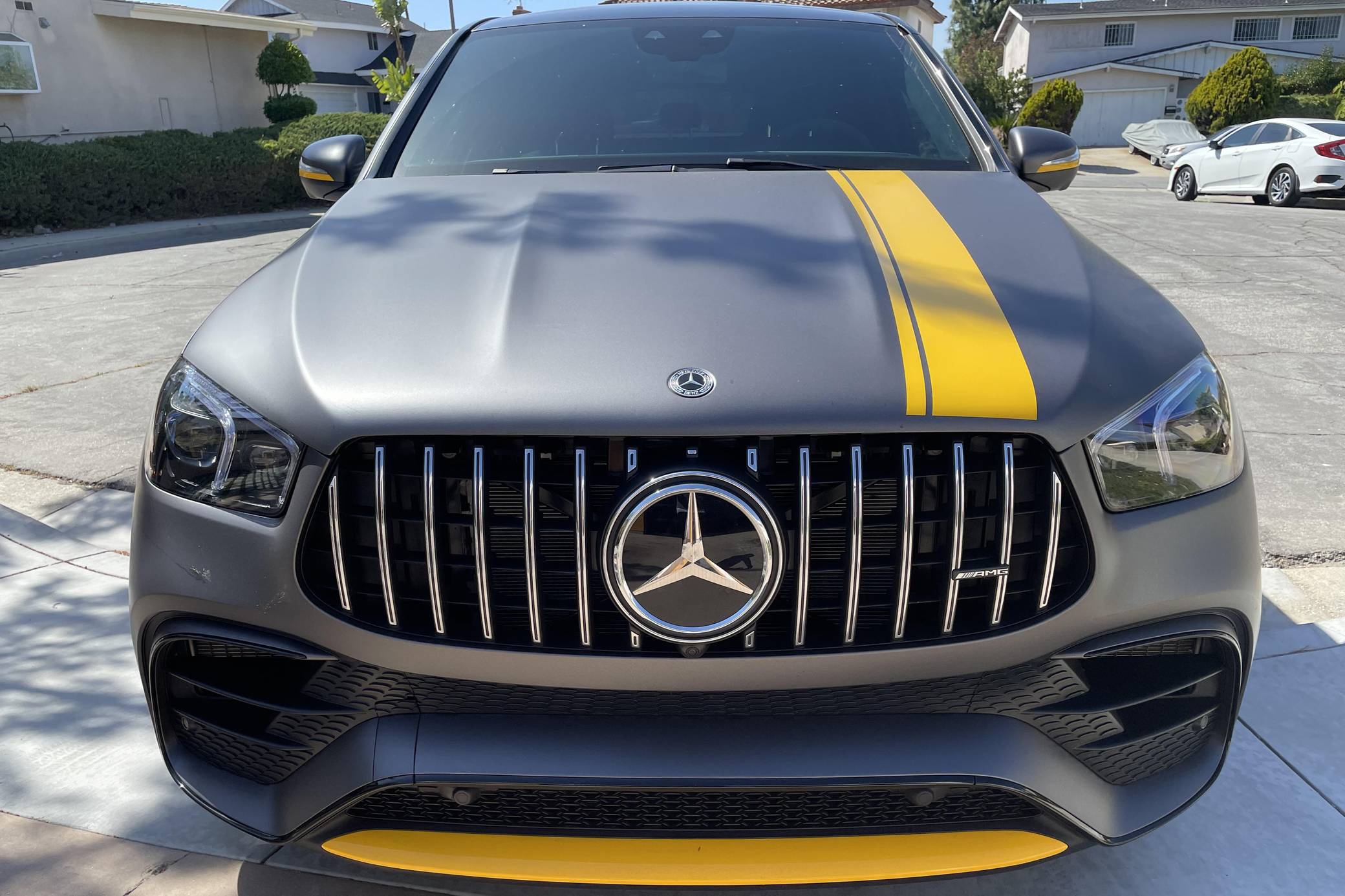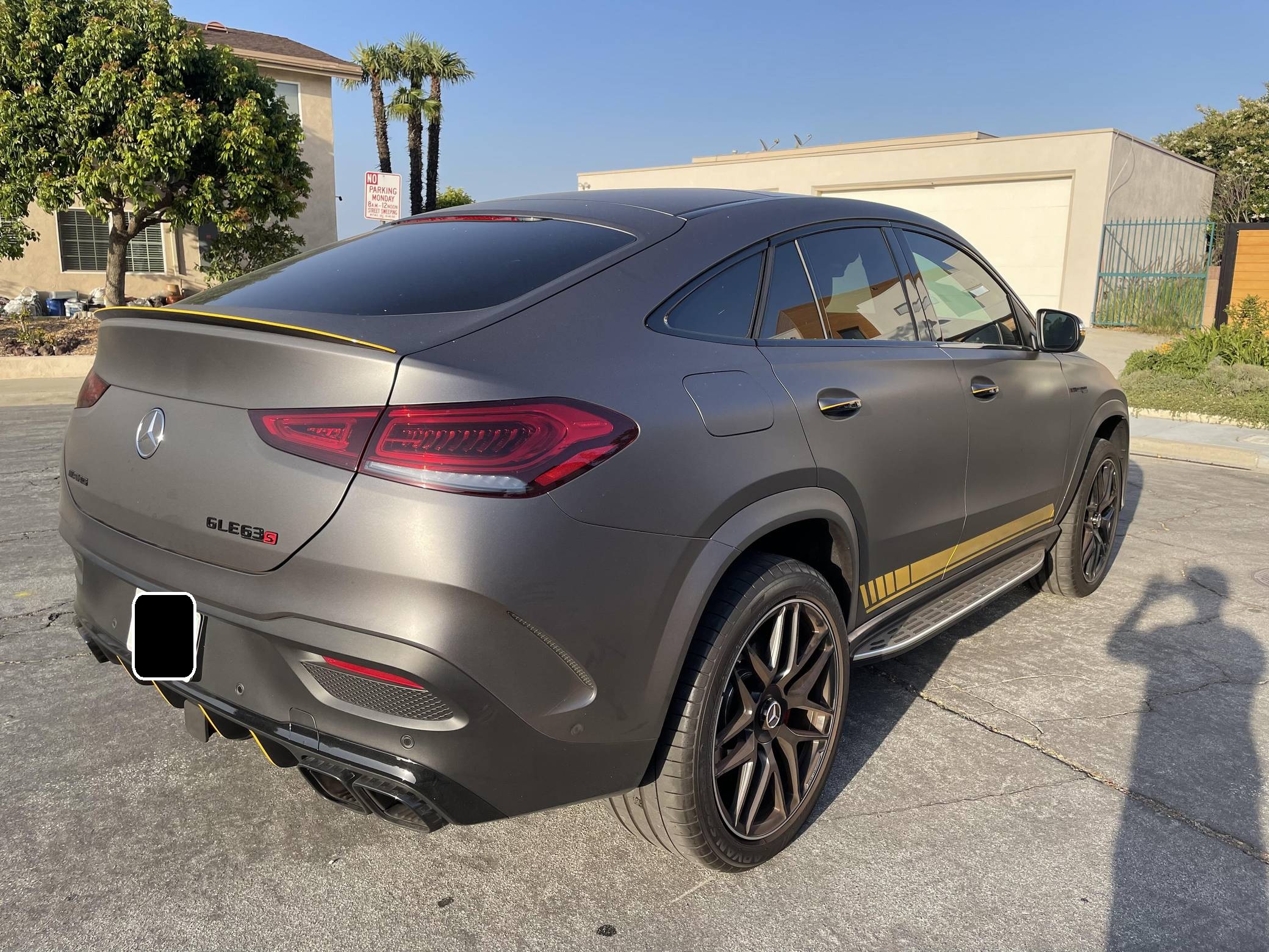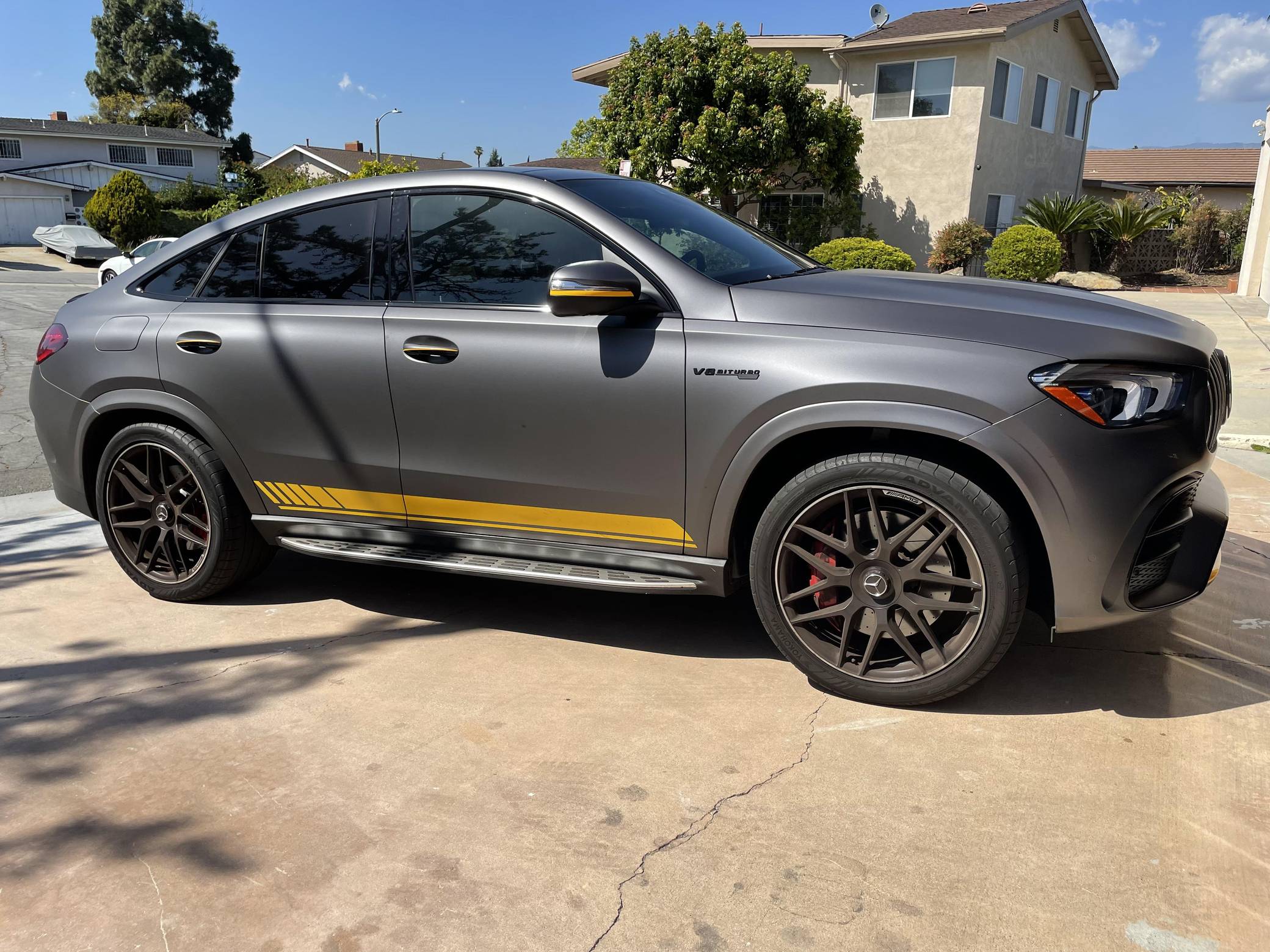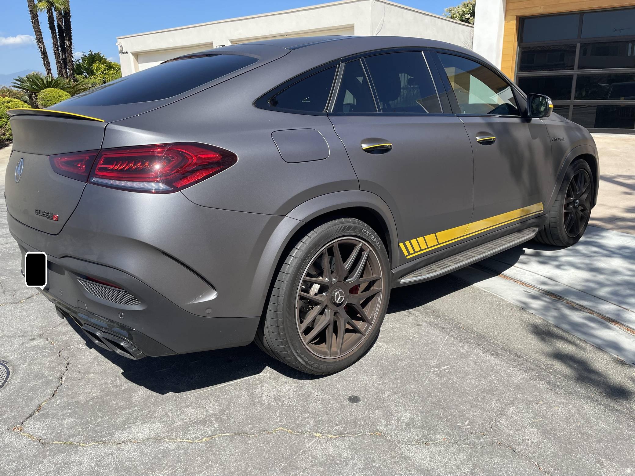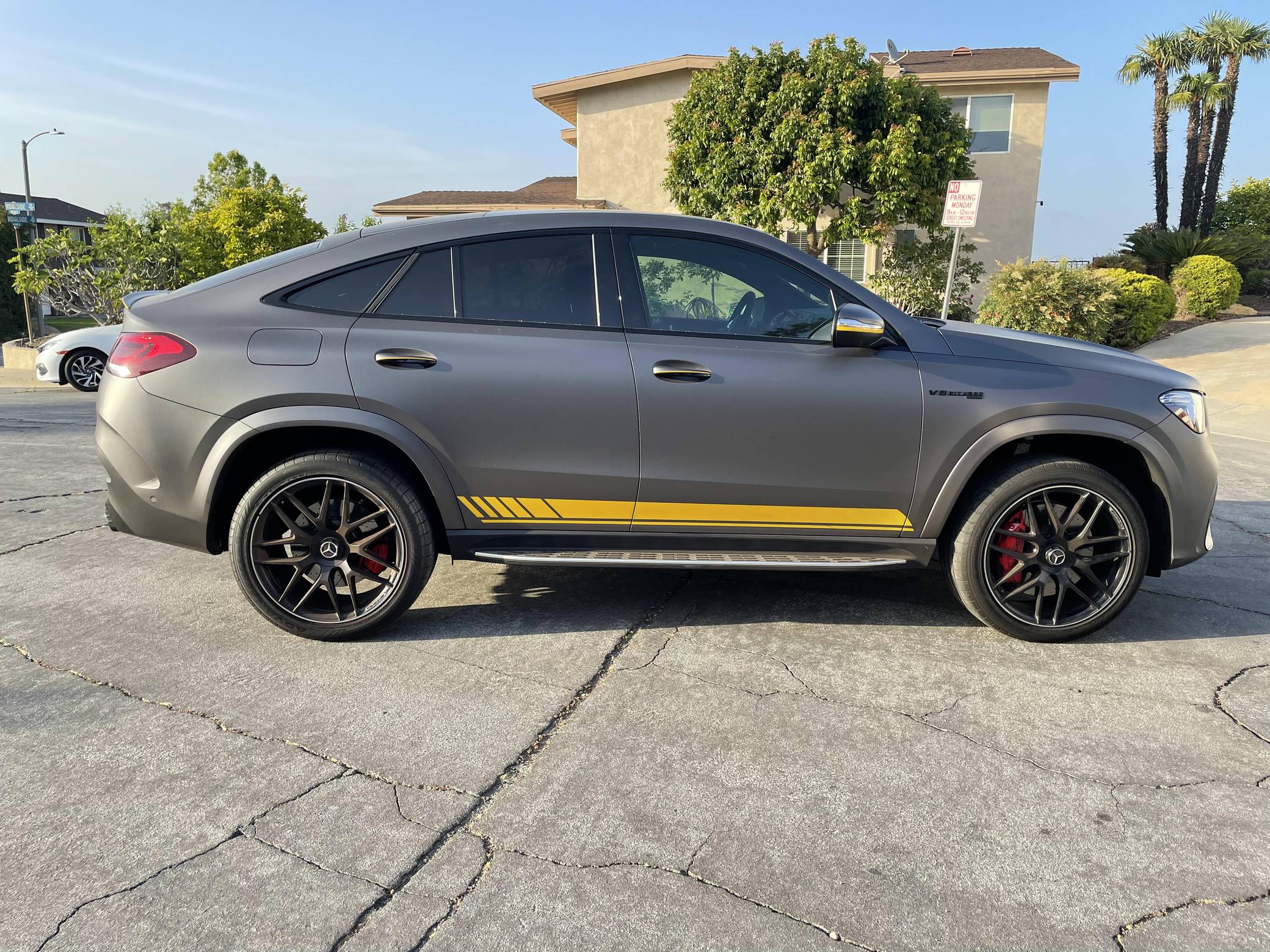 2021 Mercedes-AMG GLE63 S Coupe, finished in Obsidian Black Metallic with a Matte Dark Grey vinyl wrap and a Red/Black interior. Equipped with the AMG Night, the Driver Assistance Plus, and the Warmth and Comfort packages, as well as 22-inch forged AMG wheels, Nappa leather upholstery, a Burmester Surround Sound system, and more as detailed below. Modifications reported by the seller are limited to 3M Matte Grey exterior vinyl wrap. Launched for 2020, the W167-generation GLE offers a more spacious interior than its predecessor, a sleeker-looking exterior design, and a much longer list of standard and optional tech features. It's new from the ground up and offered in two body styles: regular SUV and the sportier-looking Coupe with a lower greenhouse, such as this one. The AMG-tuned GLE 63 S reigns over the range with a powerful twin-turbocharged V8 and a long list of chassis upgrades. Power comes from a twin-turbocharged 4. 0-liter V8 engine, rated at 603 horsepower and 627 lb-ft of torque. Output is sent to all four wheels via a 9-speed automatic transmission.