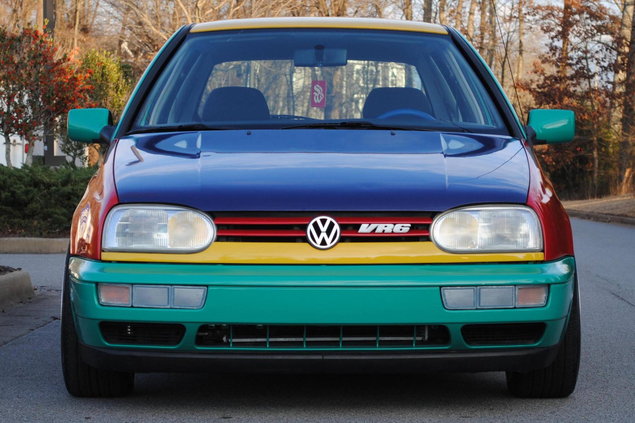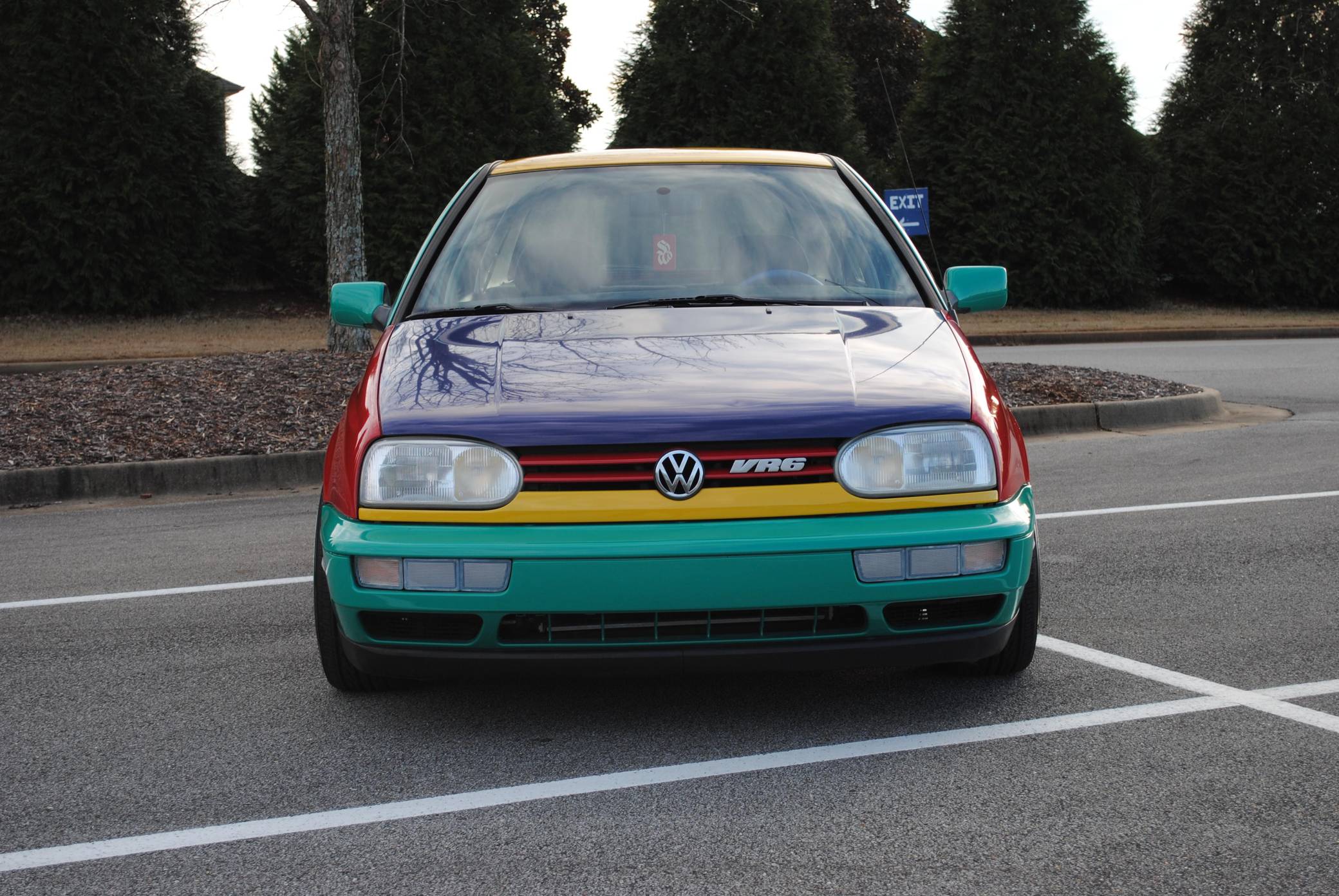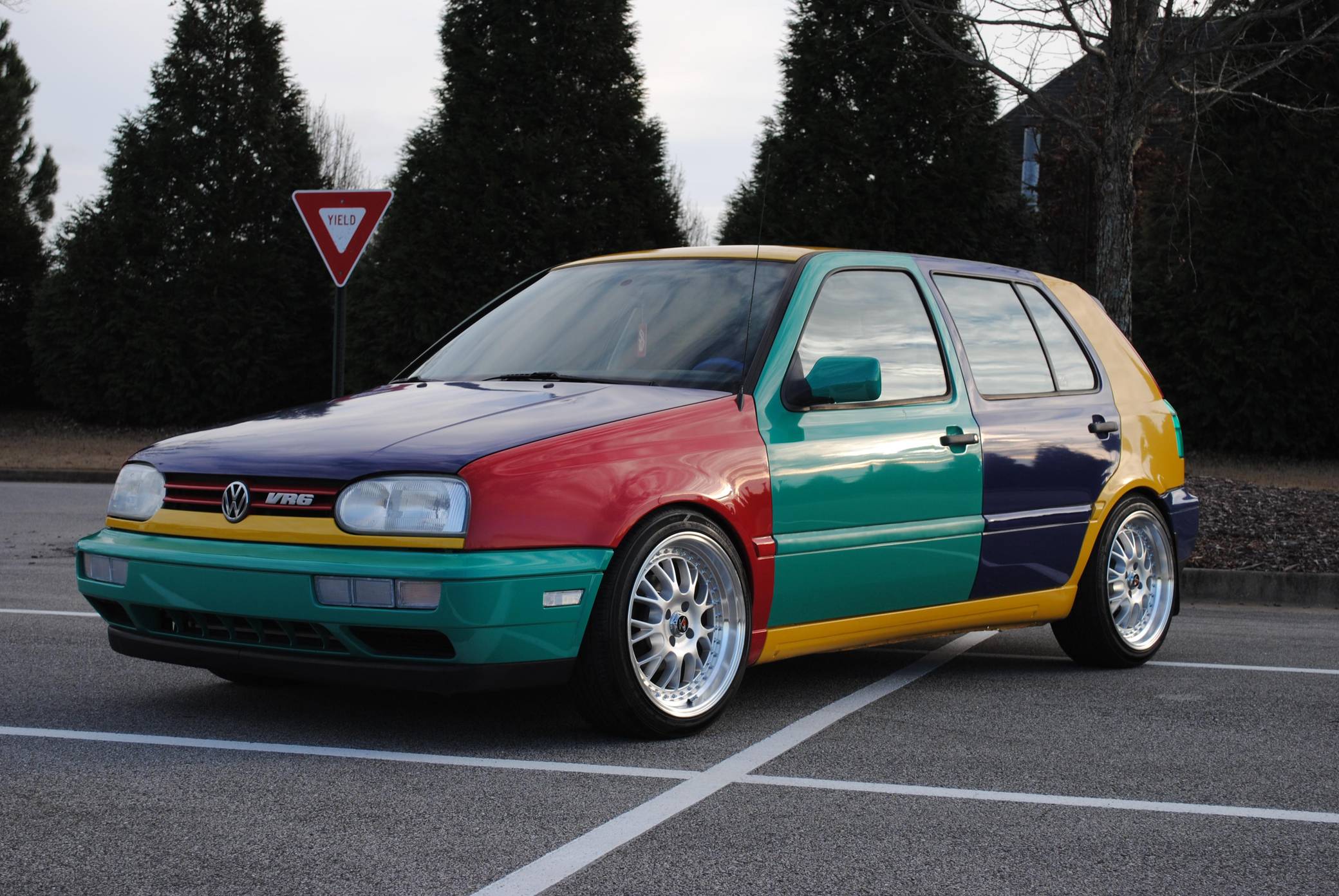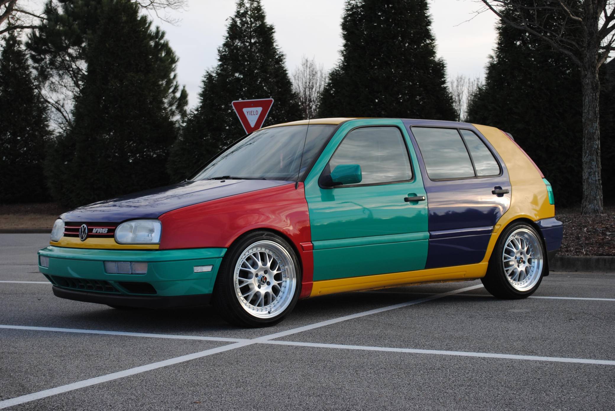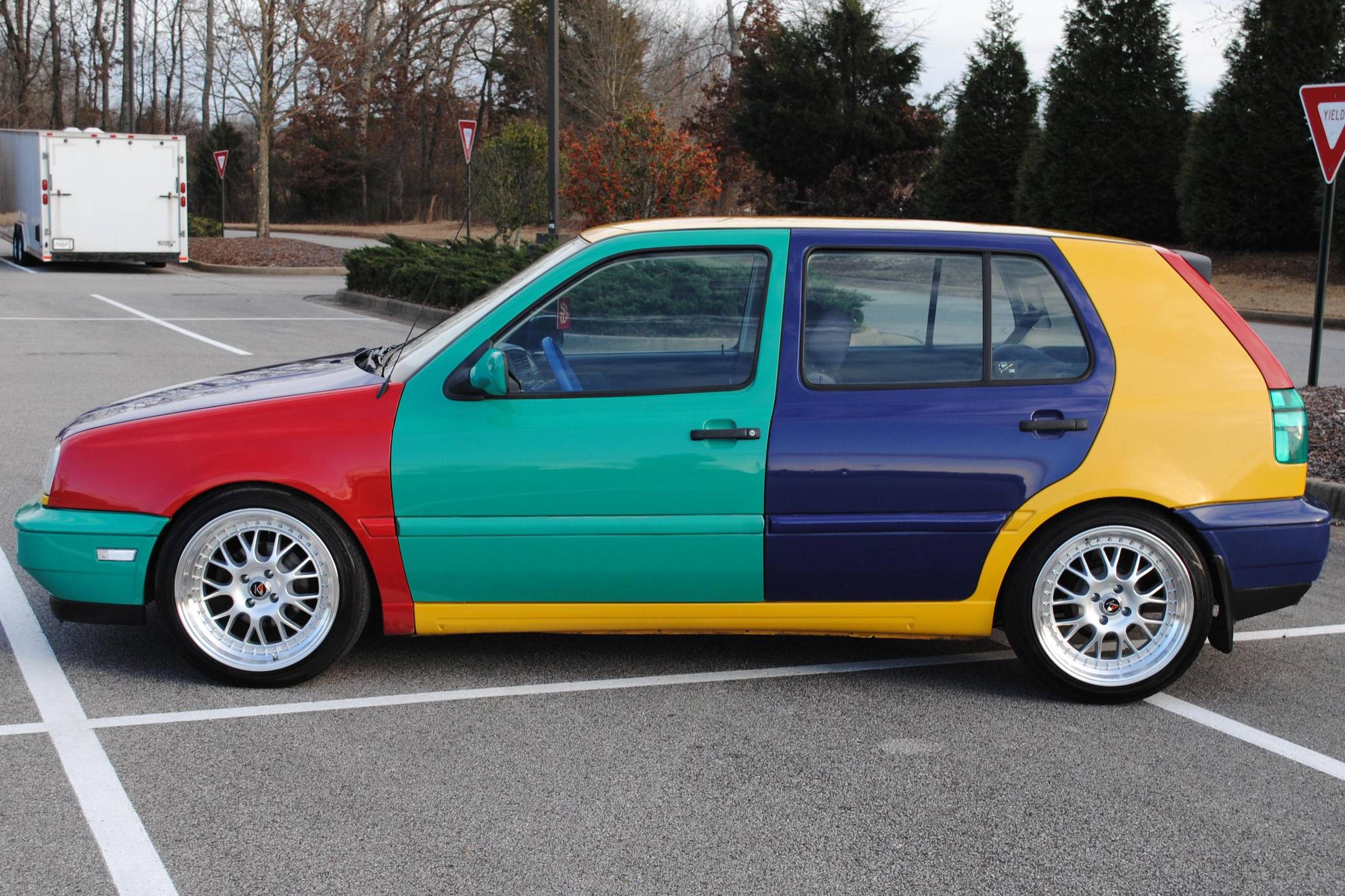 THIS… is a 1996 VW Golf Harlequin, finished in a base Ginster Yellow with Pistachio Green, Tornado Red, and Chagall Blue body panels, and a gray “Joker” interior. This Golf is one of less than 300 Harlequin special edition models offered exclusively in the North American market. VW had to paint 4 Golf cars as a whole in either Ginster Yellow, Pistachio Green, Tornado Red, or Chagall Blue and then exchange body panels by hand to create this special edition. Modifications reported by the seller include a 2. 8-liter VR6 engine and 5-speed manual transmission swap, 17-inch aftermarket wheels, Hella Magic Green taillights, and more, as detailed below. Factory equipment includes dual front airbags, air conditioning, manual windows, and more as listed below. Volkswagen brought the third-generation Golf to America in 1993. Bigger than its predecessor, it gained a more aerodynamic exterior design and a number of chassis modifications that improved handling. Power comes from a 2. 8-liter V6, rated at 172 horsepower and 173 lb-ft of torque. Output is sent to the front wheels through a 5-speed manual transmission.