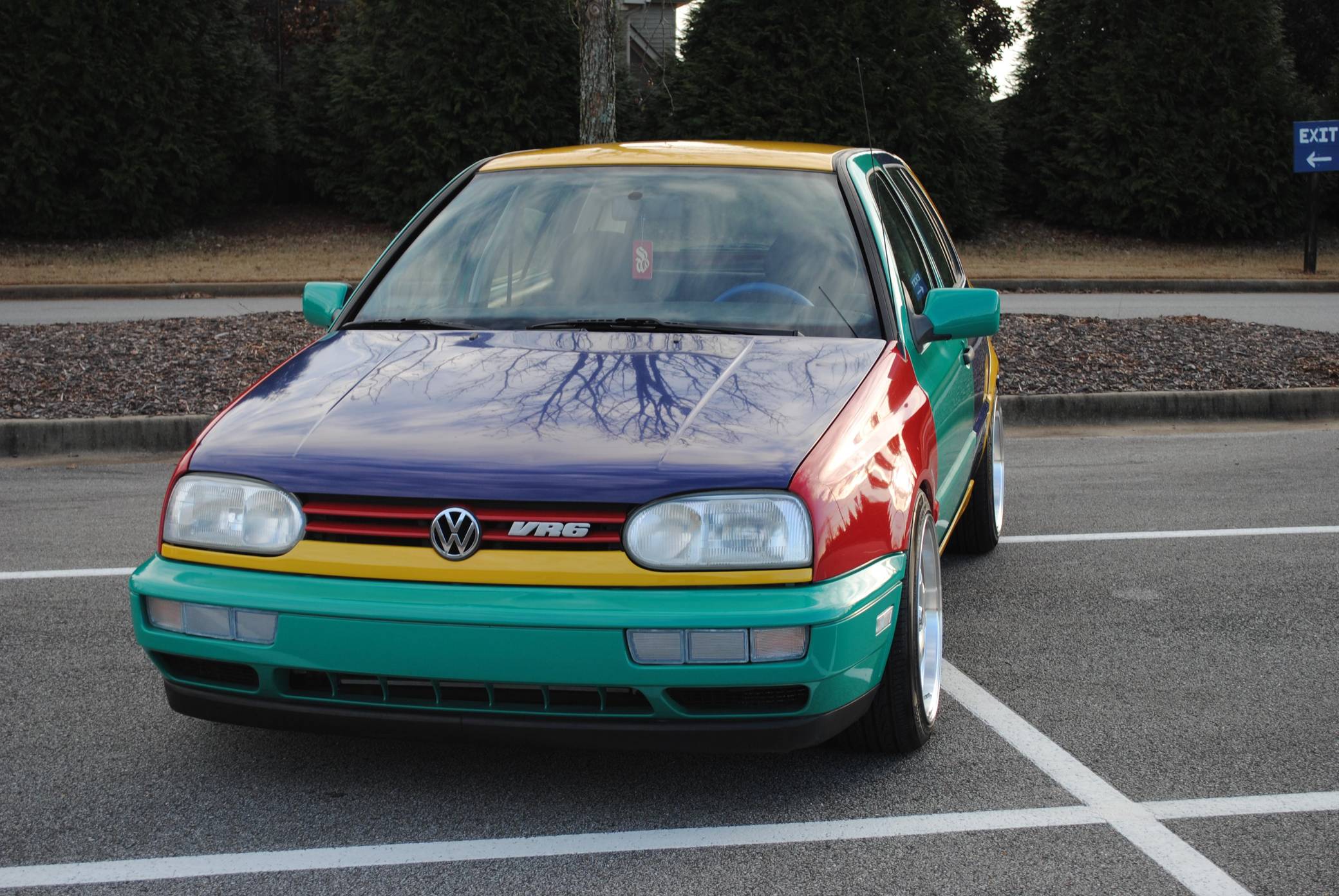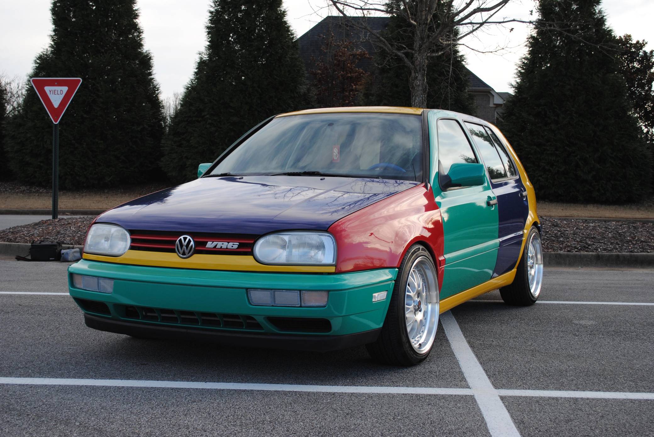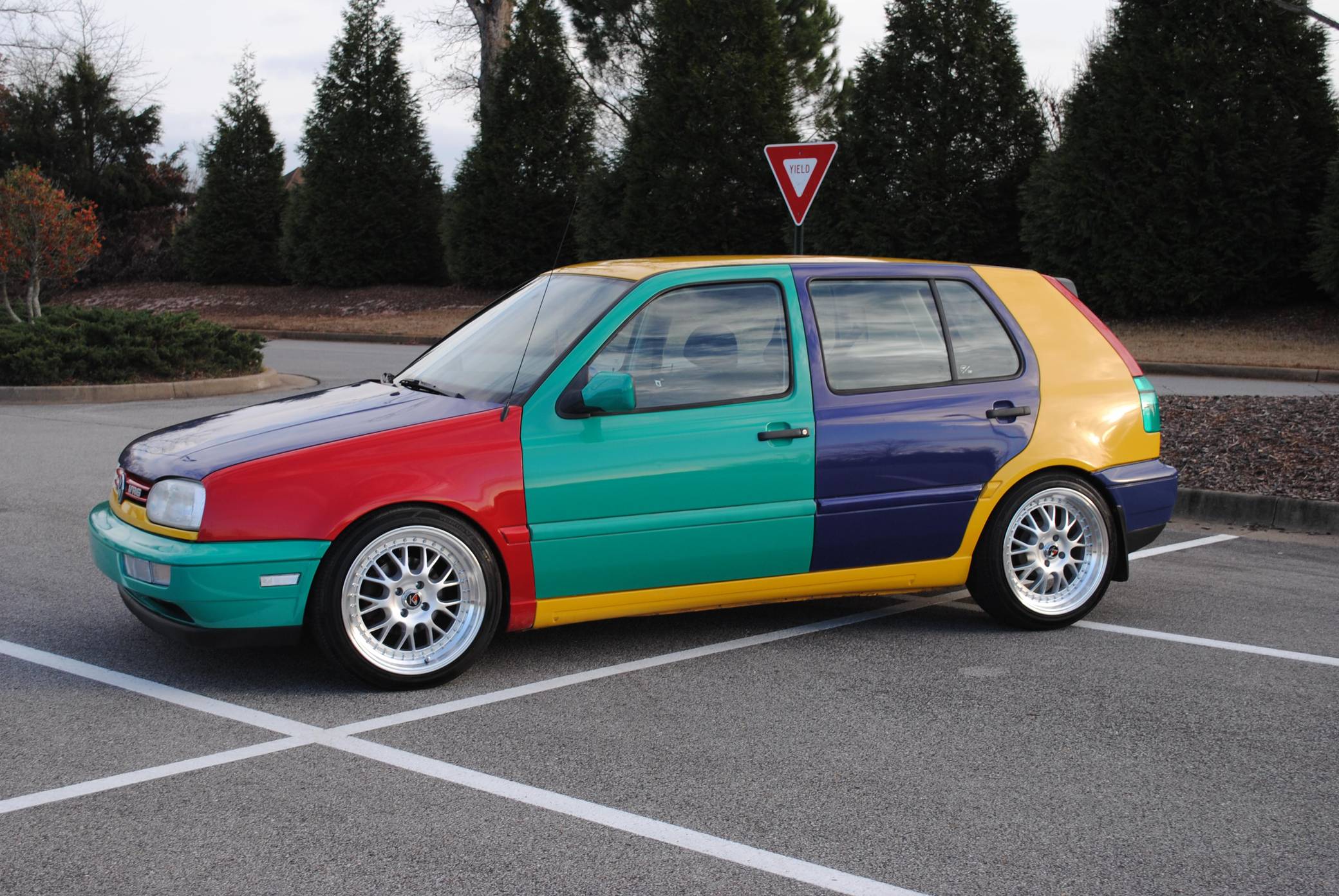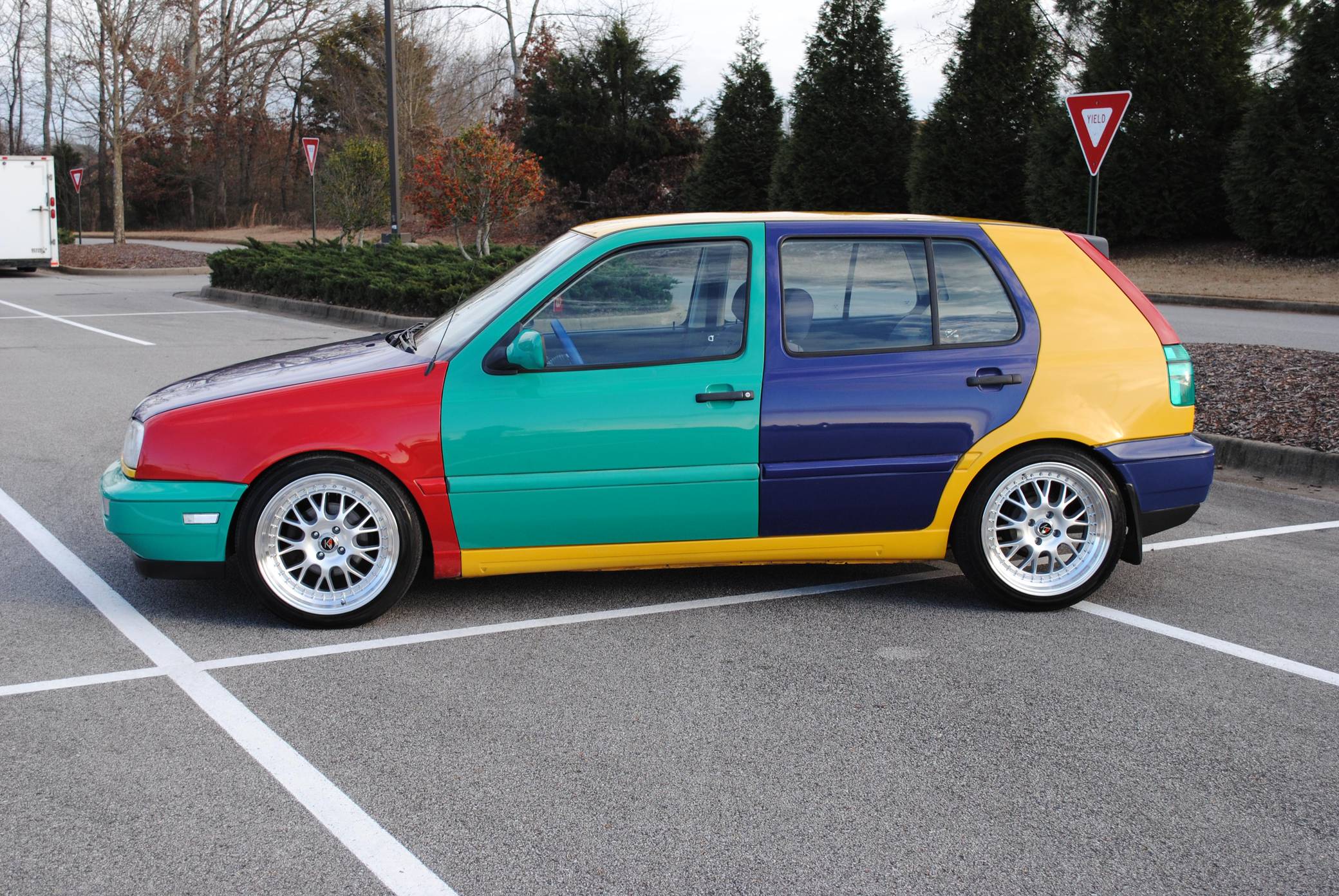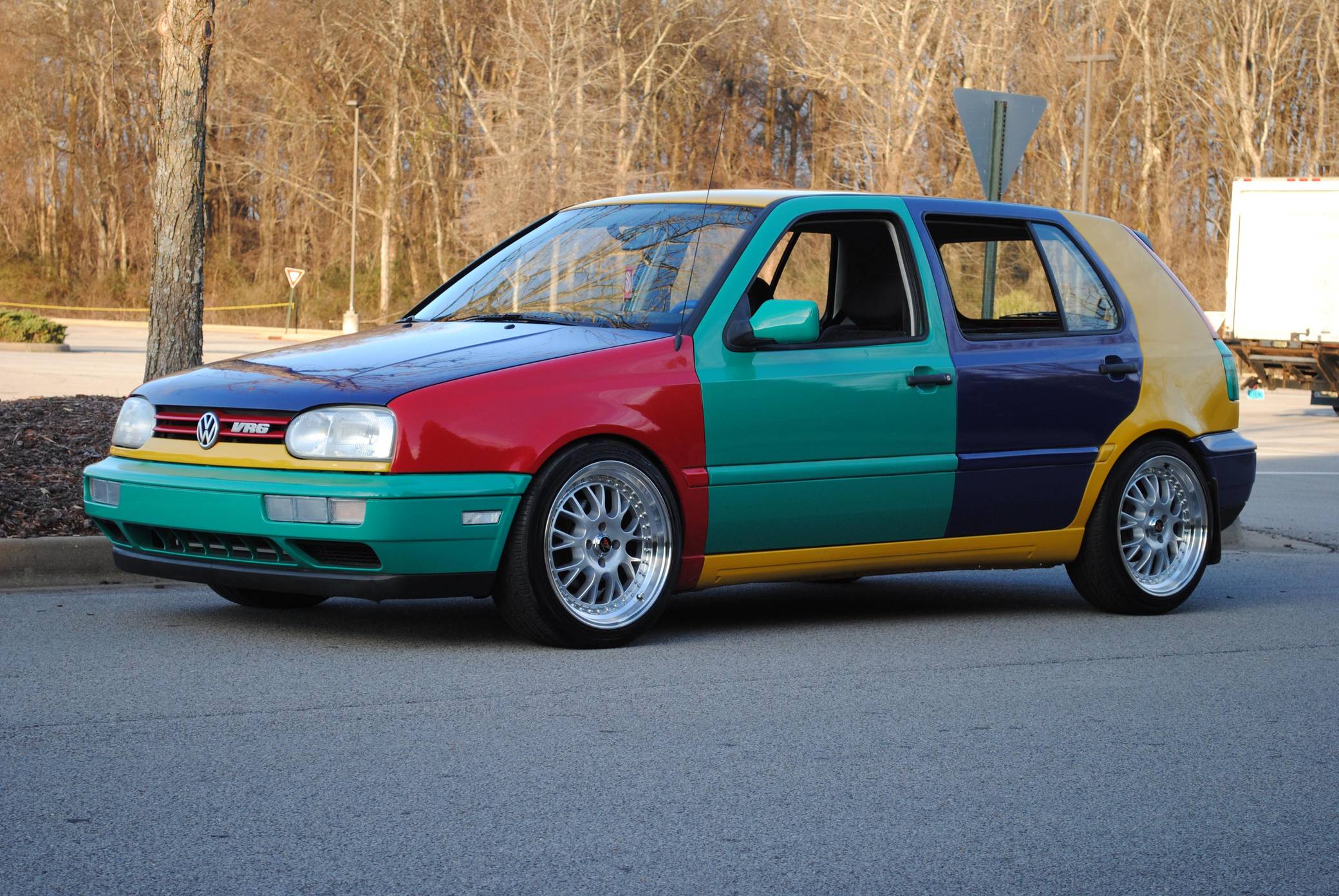 THIS… is a 1996 VW Golf Harlequin, finished in a base Ginster Yellow with Pistachio Green, Tornado Red, and Chagall Blue body panels, and a gray “Joker” interior. This Golf is one of less than 300 Harlequin special edition models offered exclusively in the North American market. VW had to paint 4 Golf cars as a whole in either Ginster Yellow, Pistachio Green, Tornado Red, or Chagall Blue and then exchange body panels by hand to create this special edition. Modifications reported by the seller include a 2. 8-liter VR6 engine and 5-speed manual transmission swap, 17-inch aftermarket wheels, Hella Magic Green taillights, and more, as detailed below. Factory equipment includes dual front airbags, air conditioning, manual windows, and more as listed below. Volkswagen brought the third-generation Golf to America in 1993. Bigger than its predecessor, it gained a more aerodynamic exterior design and a number of chassis modifications that improved handling. Power comes from a 2. 8-liter V6, rated at 172 horsepower and 173 lb-ft of torque. Output is sent to the front wheels through a 5-speed manual transmission.