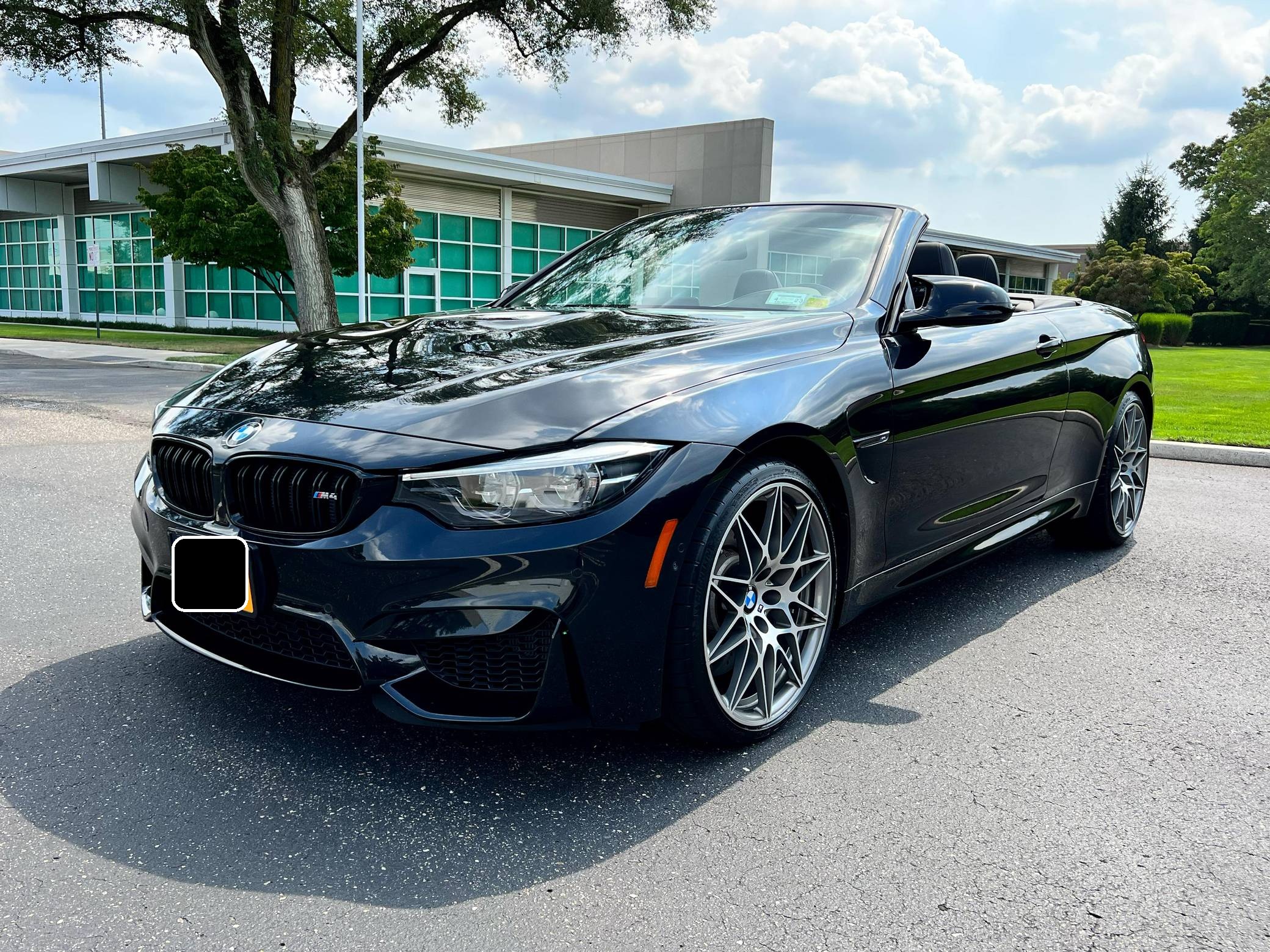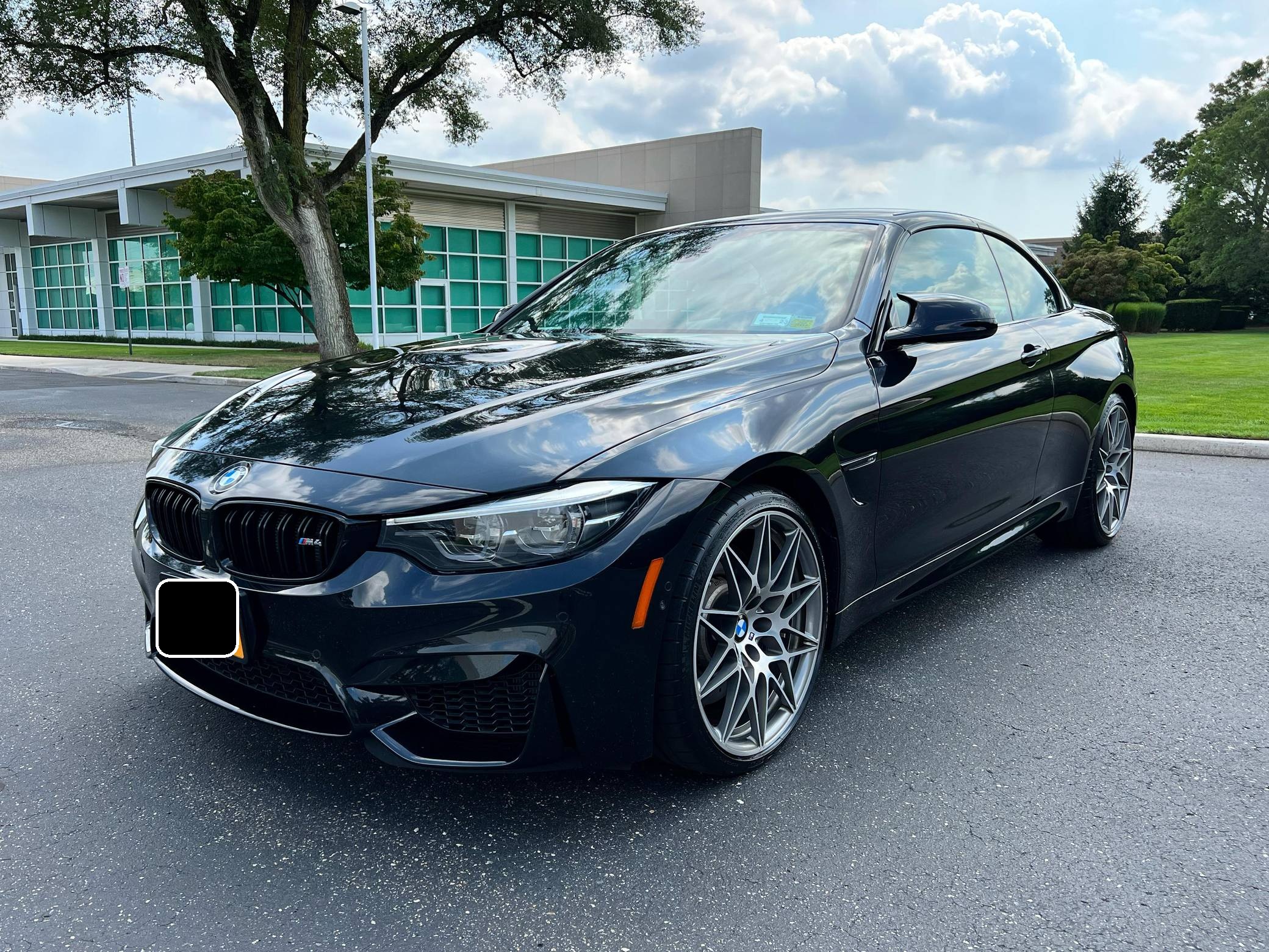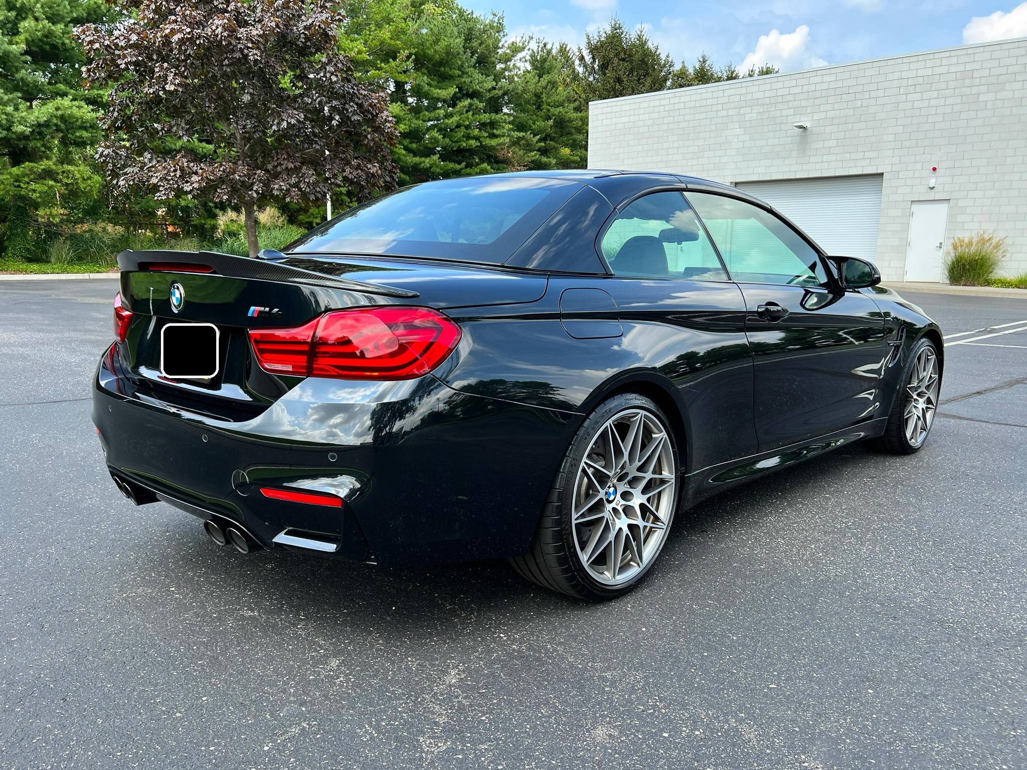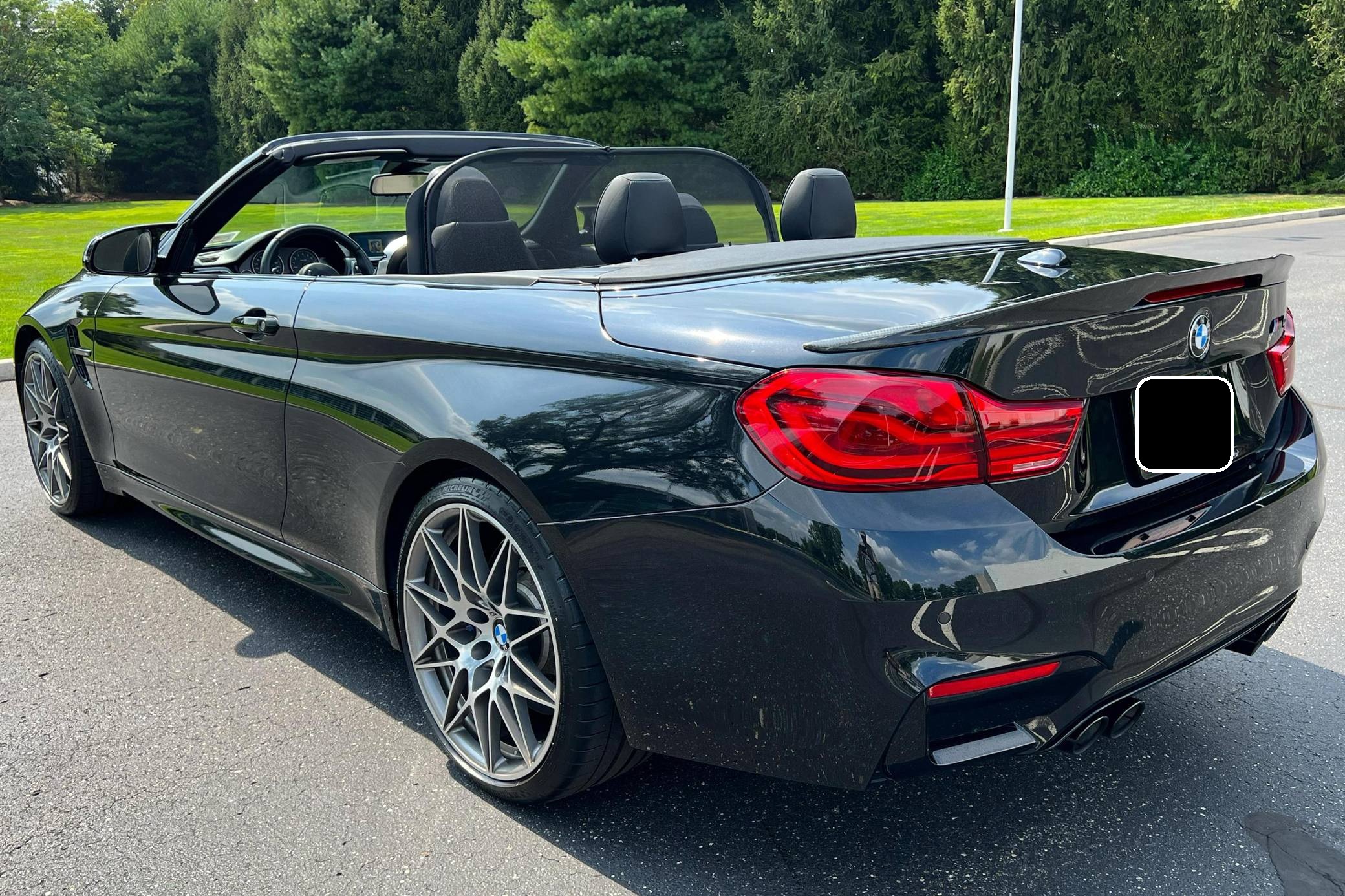 2018 BMW M4 Convertible, finished in Black Sapphire Metallic with a black interior. The odometer currently displays approximately 4,700 miles. Modifications reported by the seller are limited to an XPEL paint protection film on the front end, side skirts, and rear bumper, as well as a carbon fiber rear spoiler. 2015 was the first model year for the M4, which took the torch from the two-door M3. BMW surfed the downsizing wave sweeping across the industry by replacing the naturally-aspirated V8 with a twin-turbocharged straight-6, and a significant torque increase accompanied the new engine. Chopping off two cylinders and replacing metal bits with carbon fiber components allowed BMW to make the M4 up to 176 pounds lighter than the M3 it replaced. Production ended in 2020. Power comes from a 3. 0-liter twin-turbocharged straight-6, rated at 444 horsepower and 406 lb-ft of torque. Called "S55" internally, it spins the rear wheels via a 7-speed dual-clutch automatic transmission.