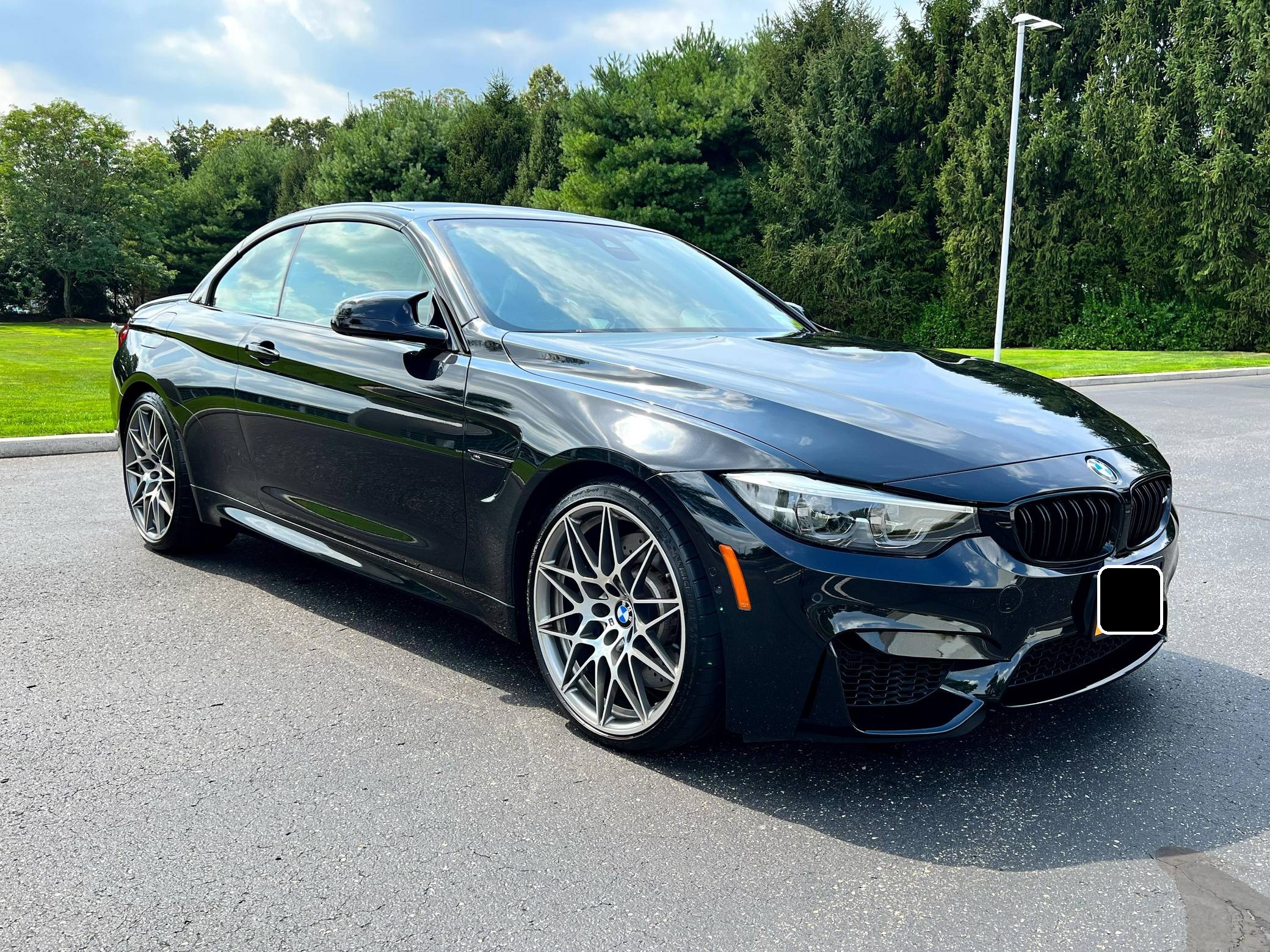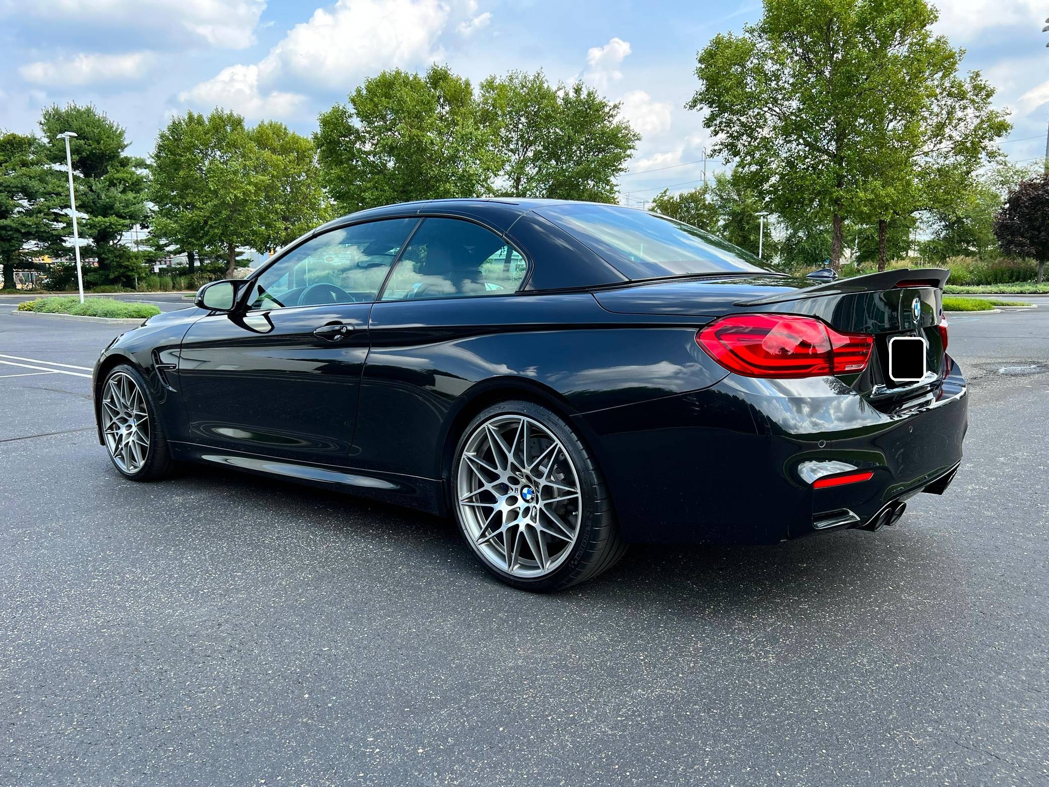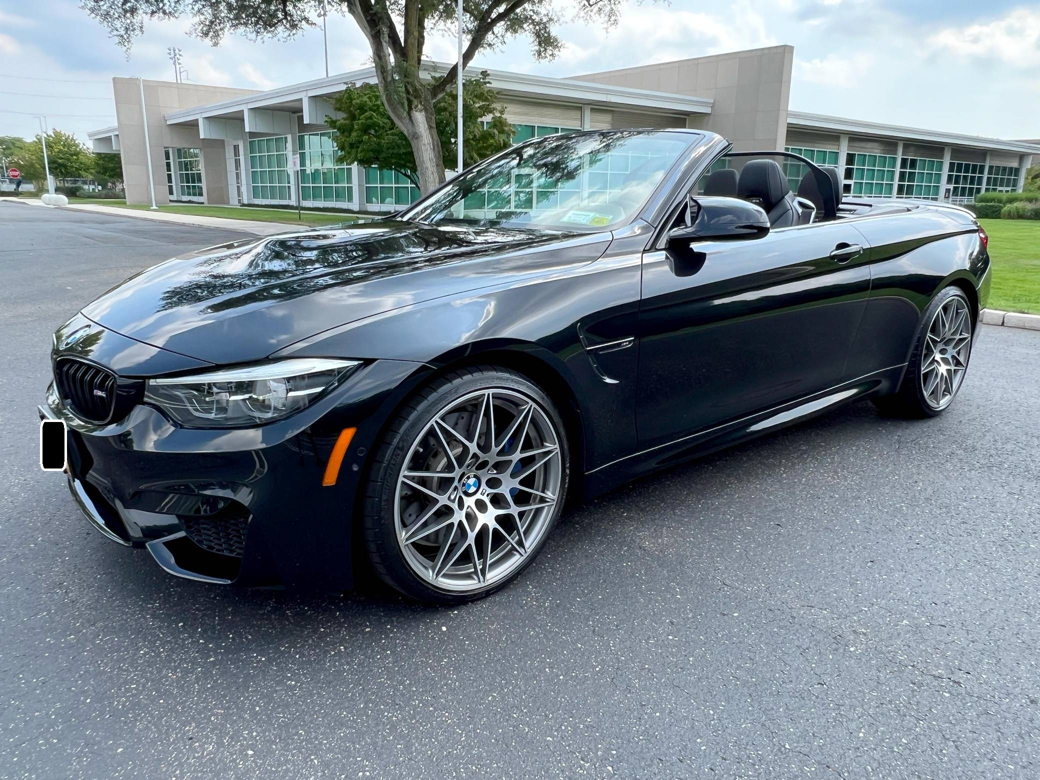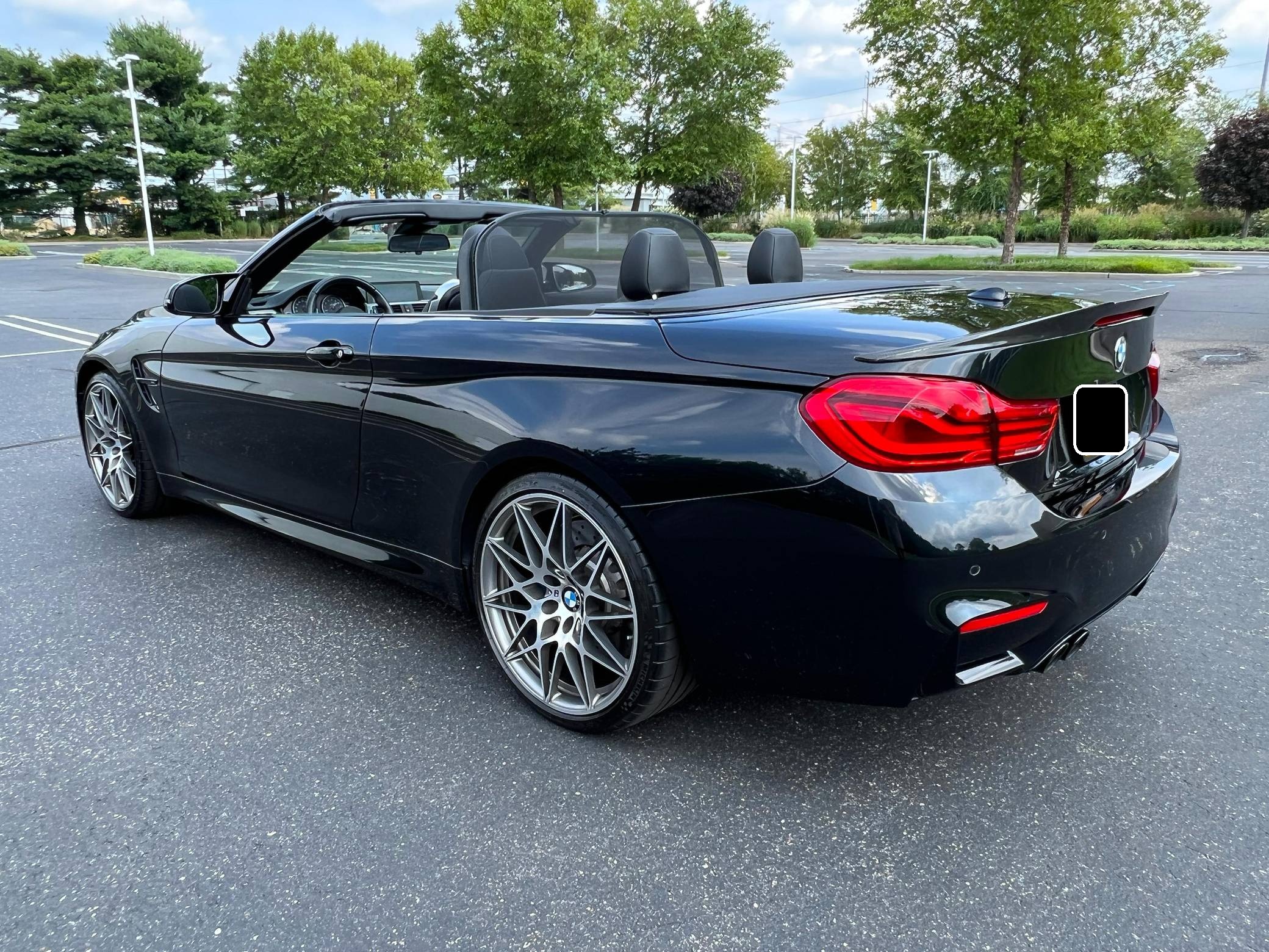 2018 BMW M4 Convertible, finished in Black Sapphire Metallic with a black interior. The odometer currently displays approximately 4,700 miles. Modifications reported by the seller are limited to an XPEL paint protection film on the front end, side skirts, and rear bumper, as well as a carbon fiber rear spoiler. 2015 was the first model year for the M4, which took the torch from the two-door M3. BMW surfed the downsizing wave sweeping across the industry by replacing the naturally-aspirated V8 with a twin-turbocharged straight-6, and a significant torque increase accompanied the new engine. Chopping off two cylinders and replacing metal bits with carbon fiber components allowed BMW to make the M4 up to 176 pounds lighter than the M3 it replaced. Production ended in 2020. Power comes from a 3. 0-liter twin-turbocharged straight-6, rated at 444 horsepower and 406 lb-ft of torque. Called "S55" internally, it spins the rear wheels via a 7-speed dual-clutch automatic transmission.