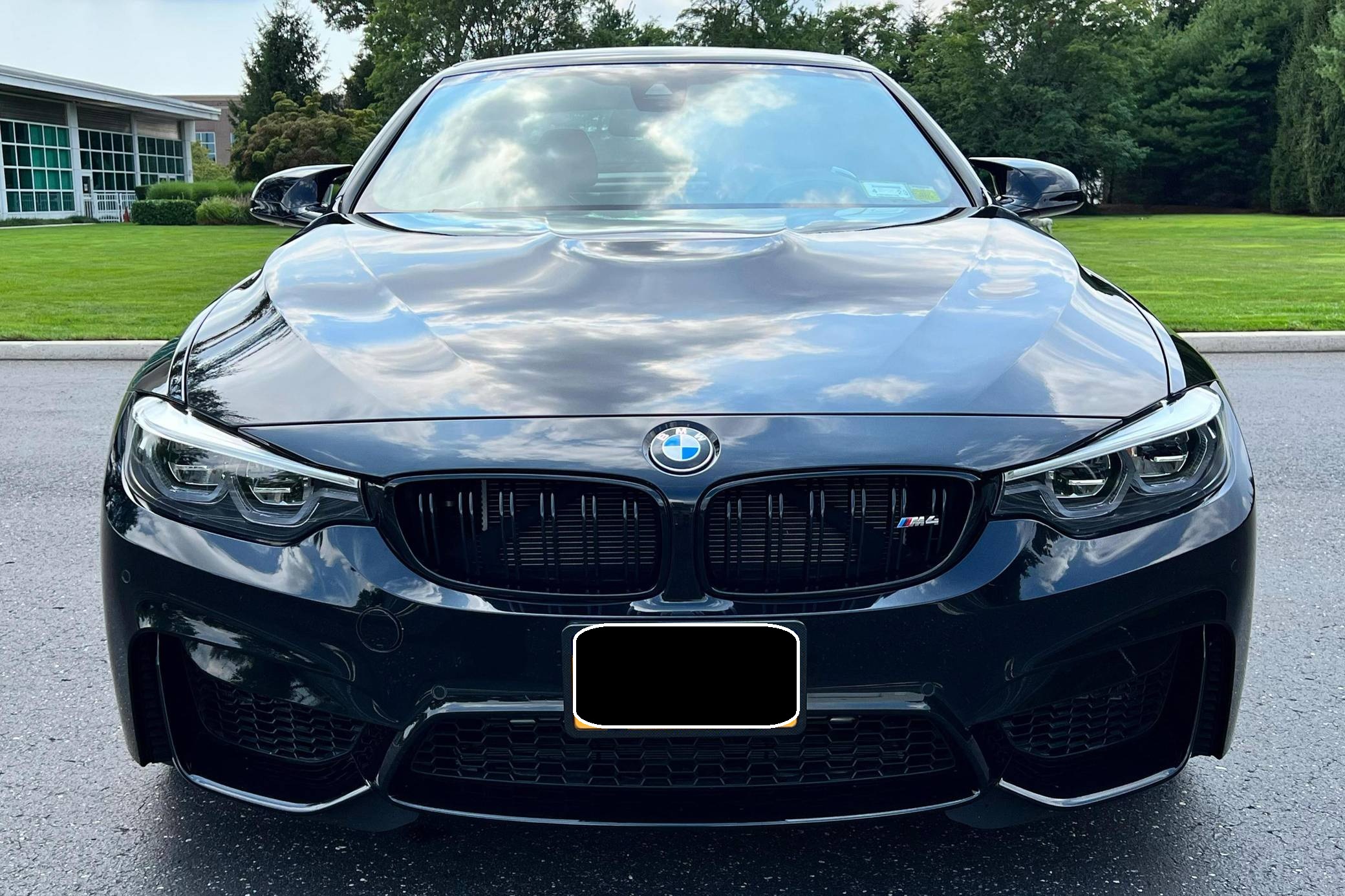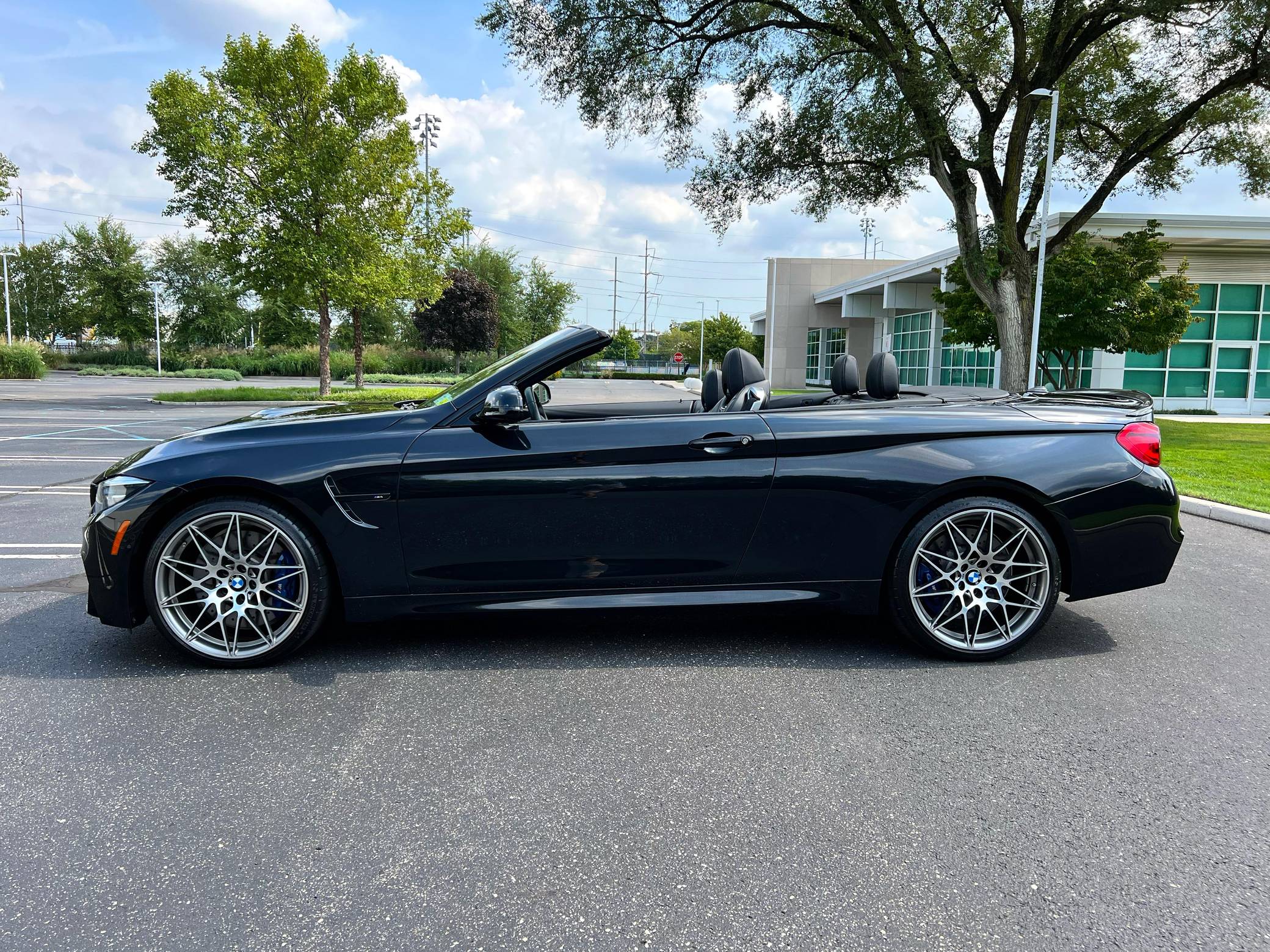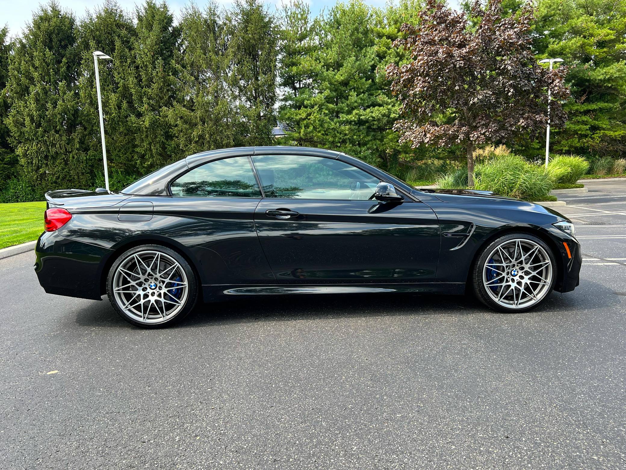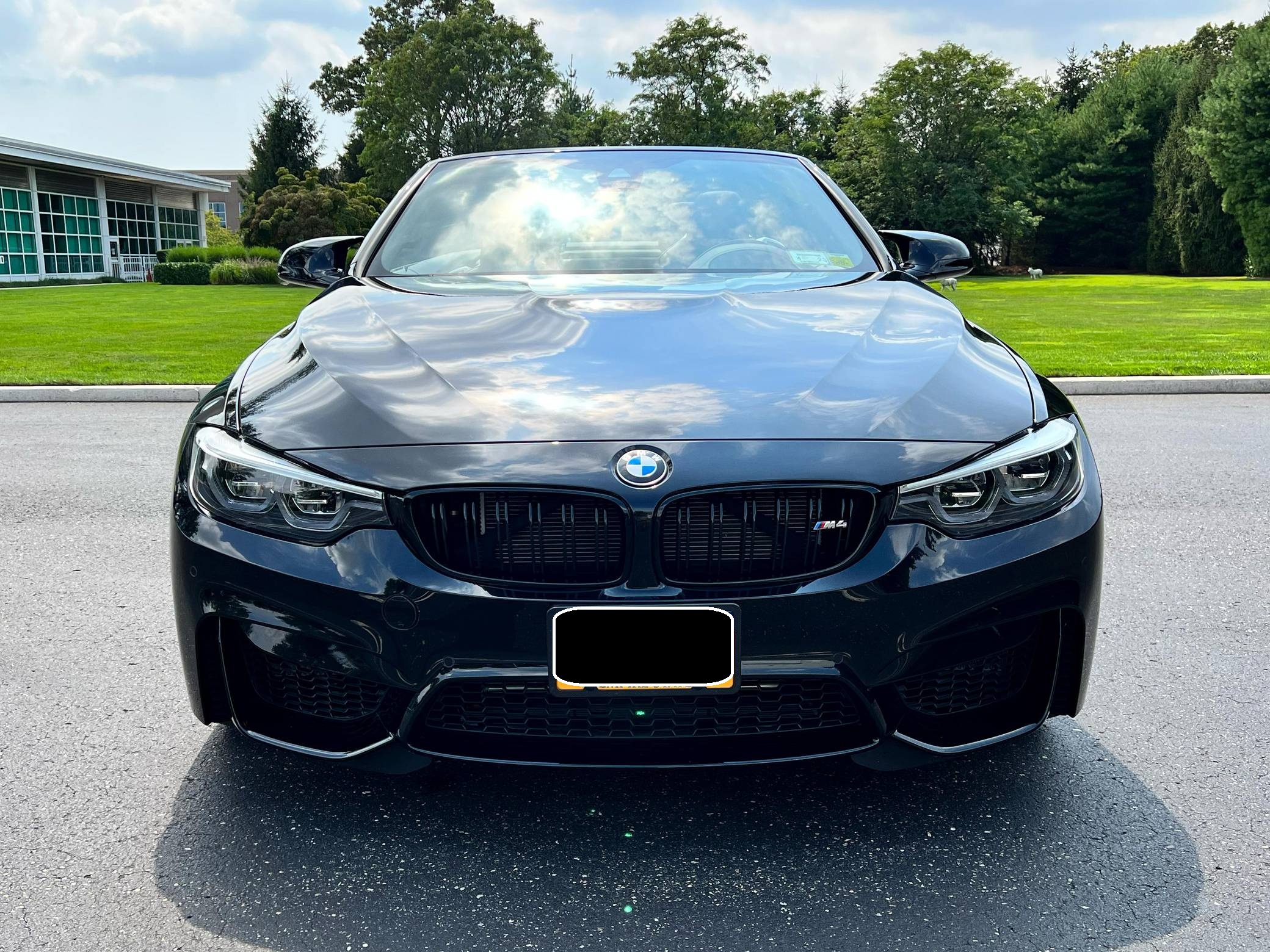 2018 BMW M4 Convertible, finished in Black Sapphire Metallic with a black interior. The odometer currently displays approximately 4,700 miles. Modifications reported by the seller are limited to an XPEL paint protection film on the front end, side skirts, and rear bumper, as well as a carbon fiber rear spoiler. 2015 was the first model year for the M4, which took the torch from the two-door M3. BMW surfed the downsizing wave sweeping across the industry by replacing the naturally-aspirated V8 with a twin-turbocharged straight-6, and a significant torque increase accompanied the new engine. Chopping off two cylinders and replacing metal bits with carbon fiber components allowed BMW to make the M4 up to 176 pounds lighter than the M3 it replaced. Production ended in 2020. Power comes from a 3. 0-liter twin-turbocharged straight-6, rated at 444 horsepower and 406 lb-ft of torque. Called "S55" internally, it spins the rear wheels via a 7-speed dual-clutch automatic transmission.