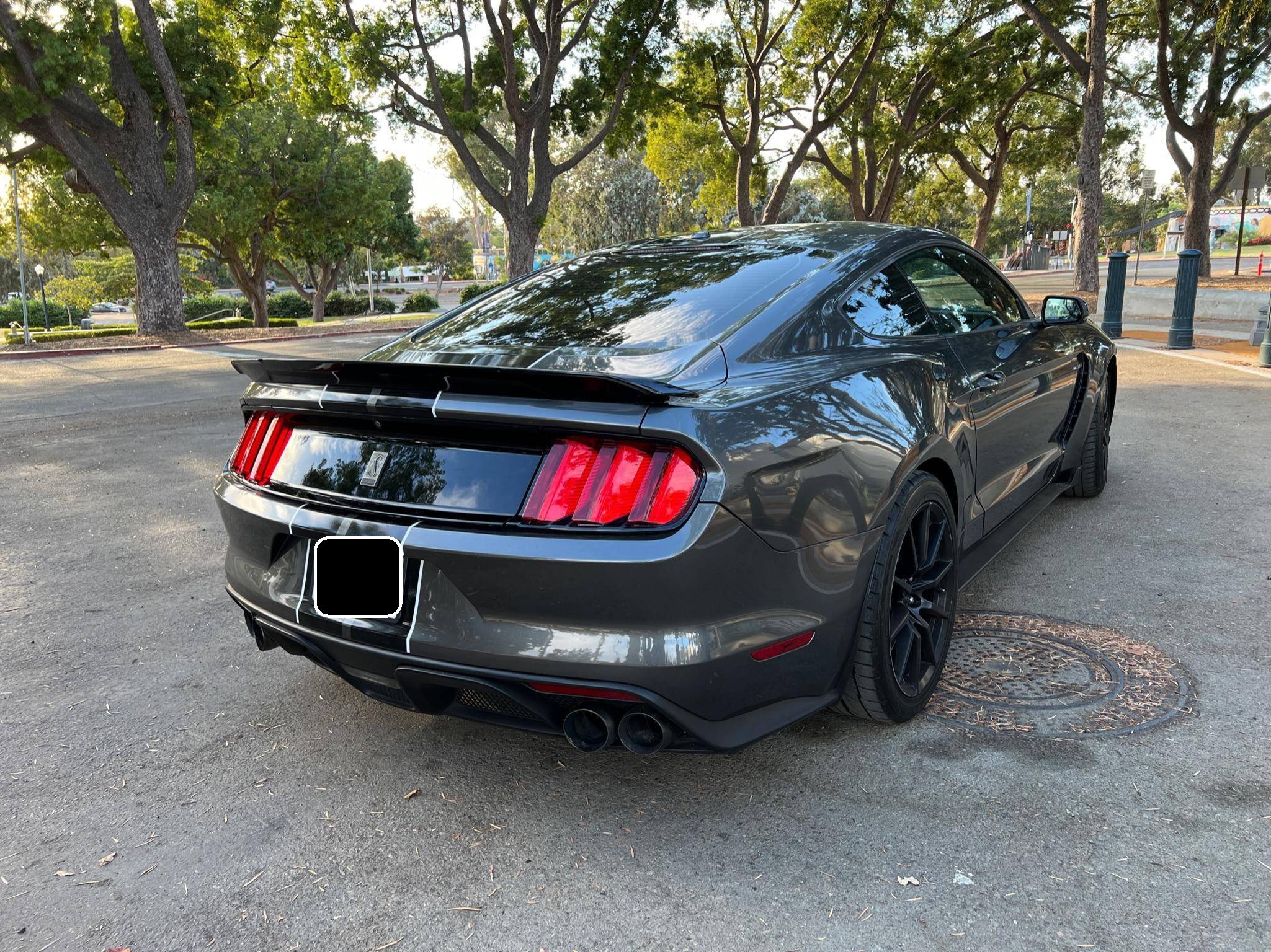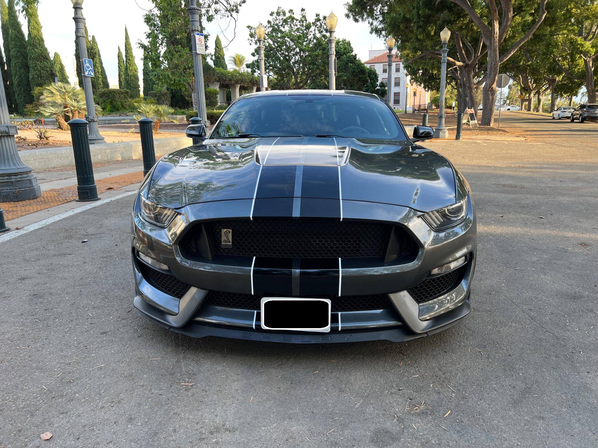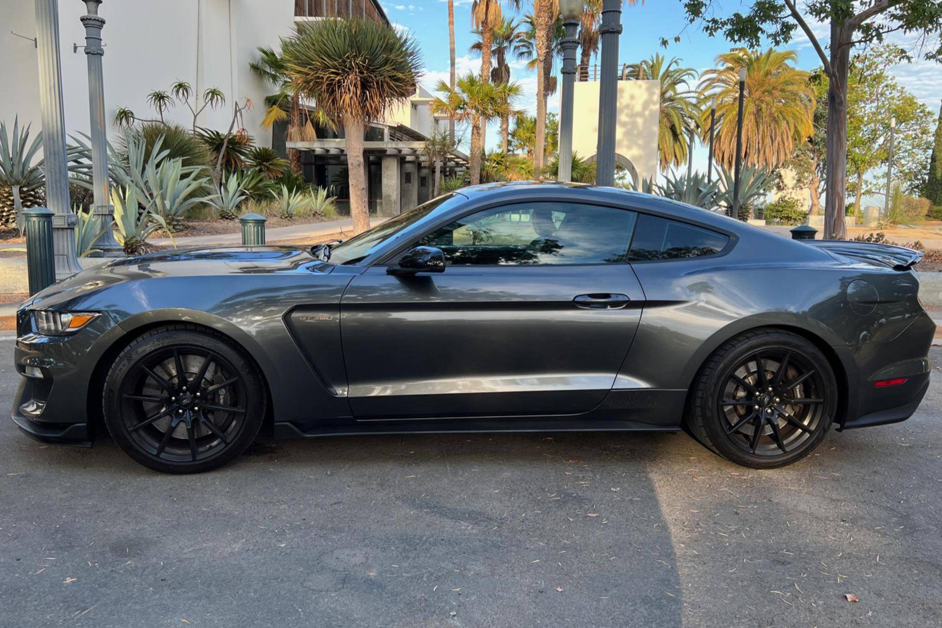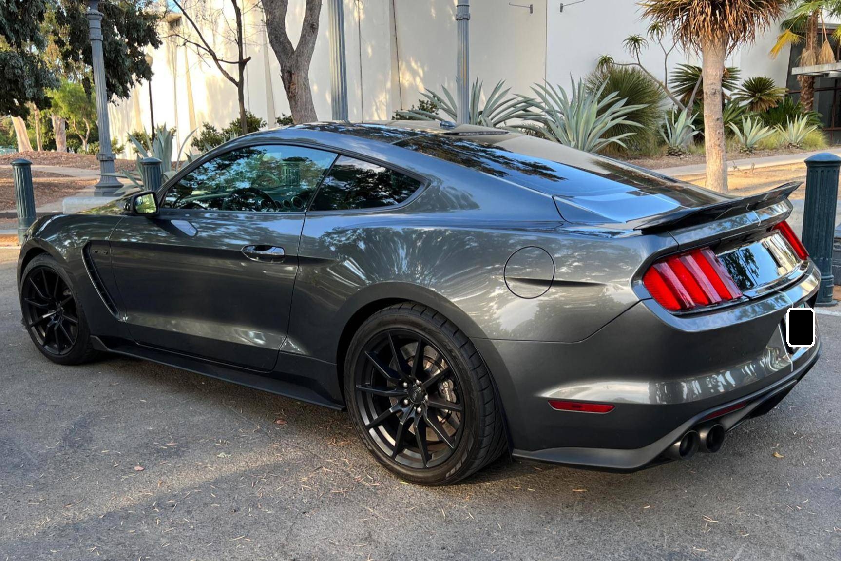 2016 Ford Mustang Shelby GT350, finished in Magnetic Metallic with an Ebony interior. A partial list of notable equipment includes Brembo brakes, a quad-tip dual exhaust, a MagneRide damping system, leather seats with suede inserts, heated and cooled front seats, navigation, and a SYNC 3 infotainment system. Modifications are limited to tinted rear windows. The track-oriented Shelby GT350 variant of the "S550" Ford Mustang is notable for its "Voodoo" V8 engine which employs a flat-plane crank and a unique crankpin configuration and firing order. It also has upgraded aerodynamics, a revised suspension, and various lightweight components that result in a highly competent muscle car. Power comes from a 5. 2-liter "Voodoo" V8 engine, rated at 526 horsepower and 429 lb-ft of torque. Output is sent to the rear wheels via a 6-speed manual transmission.