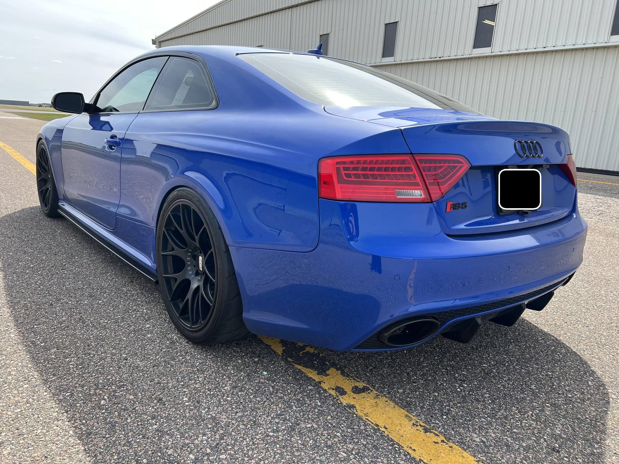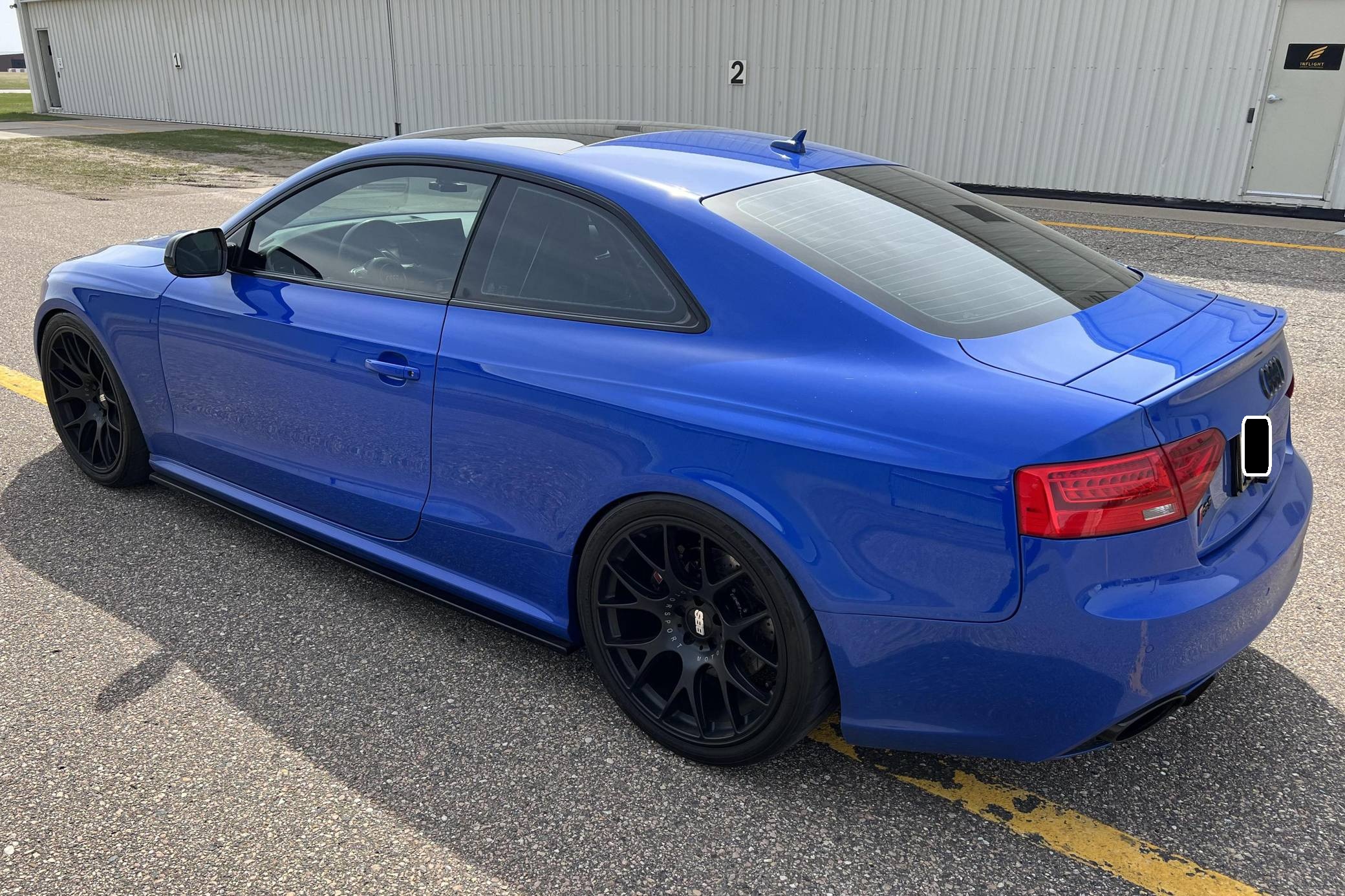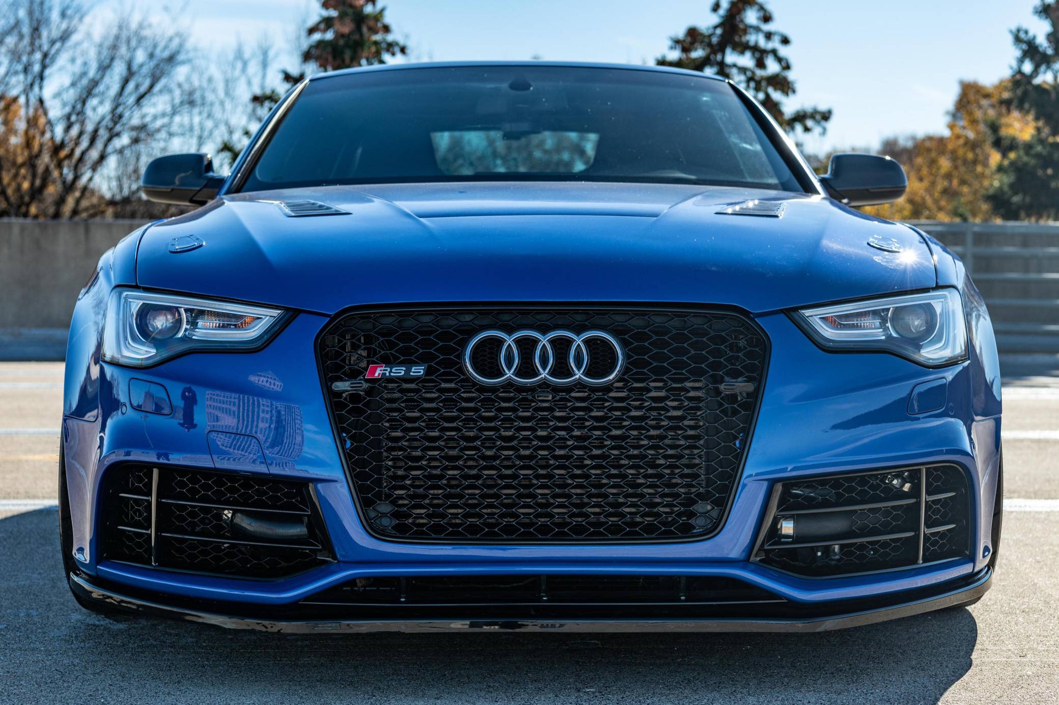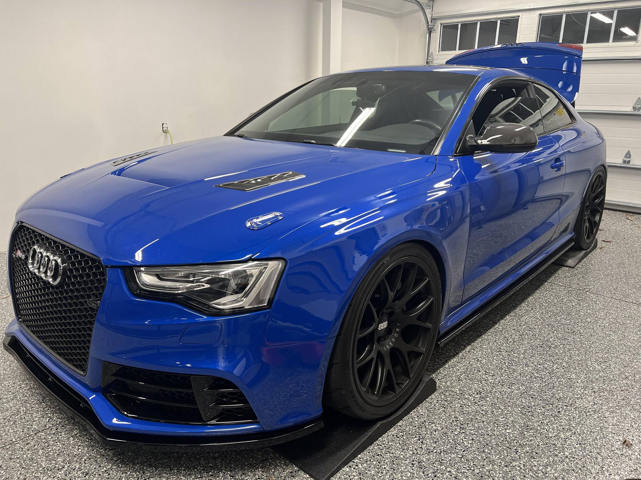 THIS. . . is a 2015 Audi RS5, finished in Nogaro Blue with a black interior. This coupe is equipped with a 6-speed manual transmission, and its odometer displays about 24,600 miles. Extensively modified, this RS5 is fitted with a pair of XONA ROTOR X2C XR6557S turbochargers, JE Pistons custom-made pistons, a Radium Engineering 6-gallon fuel cell, a Haltech Engine Management Systems Elite 2500 ECU with a premium harness, a custom-made 3-inch exhaust system with Borla XR-1 Raceline mufflers, a 6-speed manual transmission from a B8-generation S5, a JXB Performance limited-slip front differential, Bilstein B16 coilovers, a RevoZport carbon fiber hood, and RECARO Automotive Sportster GT front seats. More details about the aftermarket parts installed on this car are provided below. The first-generation RS5 made its debut for the 2011 model year as Audi's answer to the Mercedes-Benz C63 AMG. Based on the A5, it gained comprehensive chassis updates and a sportier exterior design, but its strongest asset was its naturally-aspirated V8 engine. Production ended in 2015, and the second-generation model downsized to a V6. Power comes from a 4. 2-liter twin-turbocharged V8, rated at 450 horsepower and 316 lb-ft of torque when left stock and naturally-aspirated. The modifications increase those figures to 1,051 and 822, respectively, according to a dyno sheet pictured in the gallery. The engine spins the four wheels via a 6-speed manual transmission and Audi's permanent Quattro all-wheel-drive system.