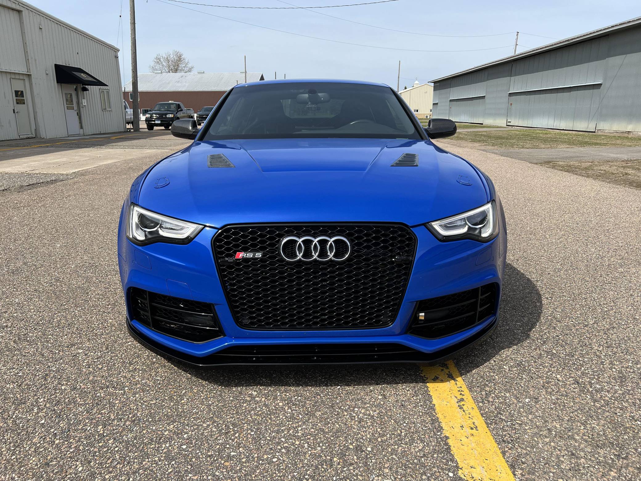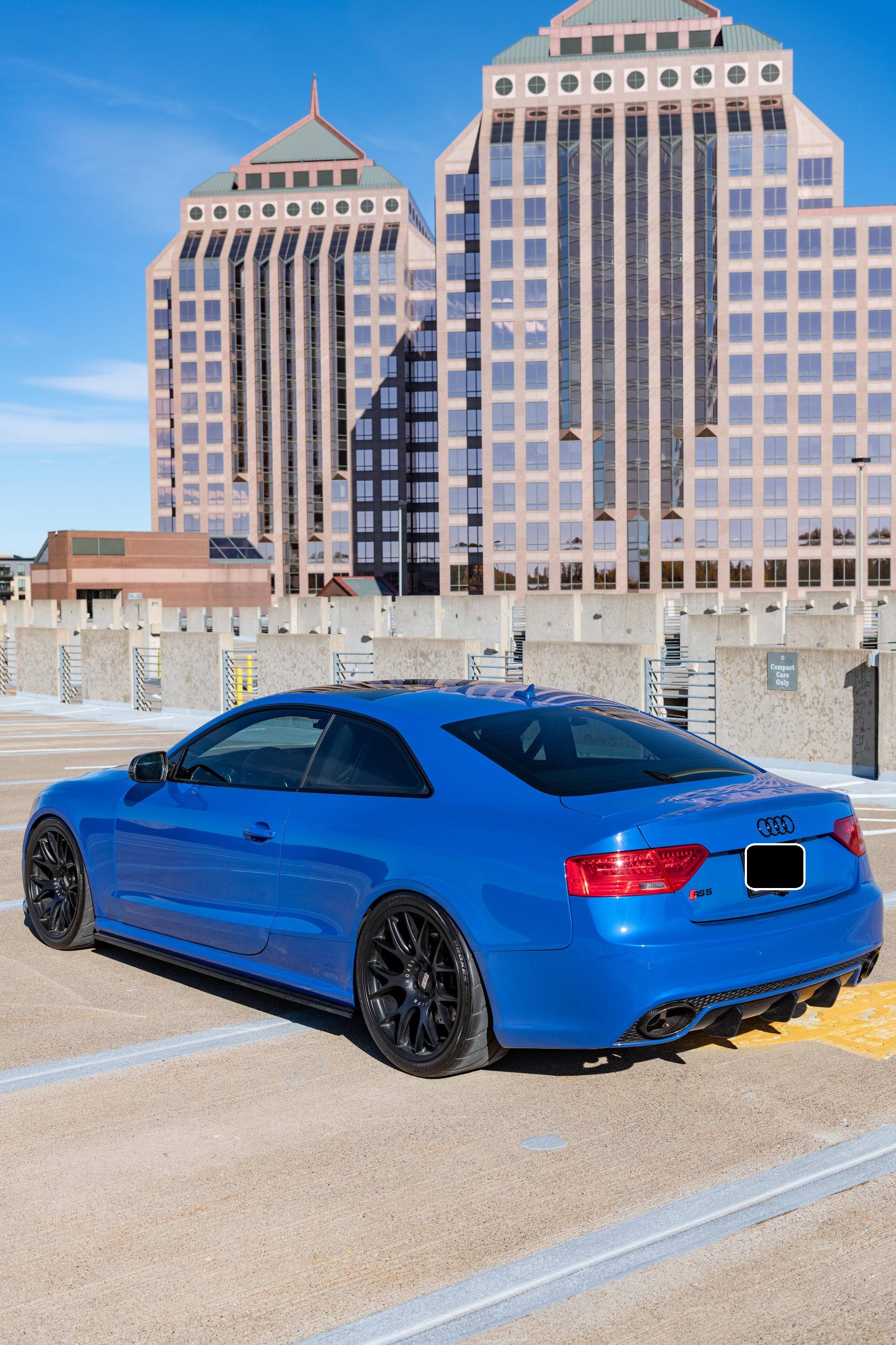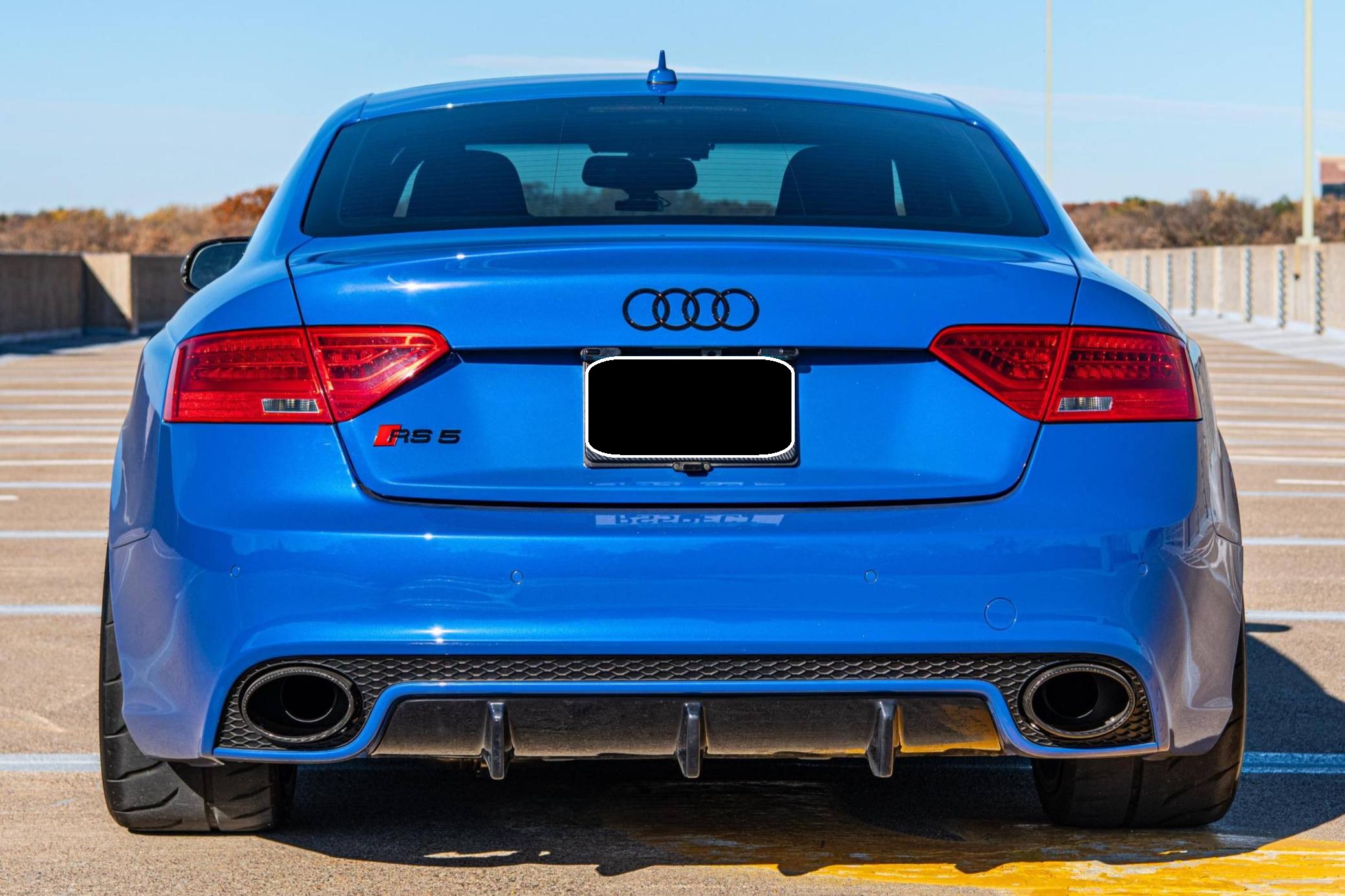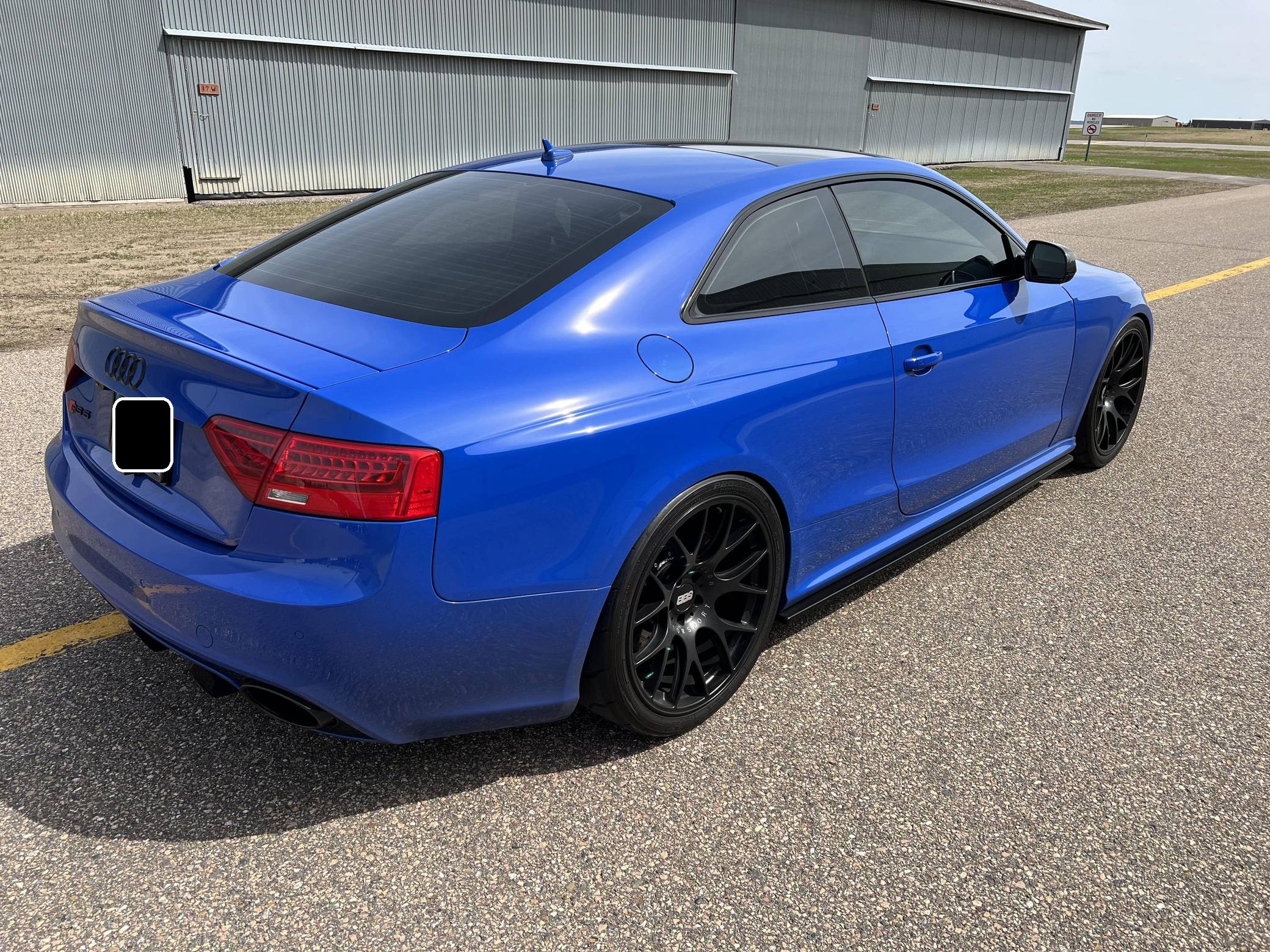 THIS. . . is a 2015 Audi RS5, finished in Nogaro Blue with a black interior. This coupe is equipped with a 6-speed manual transmission, and its odometer displays about 24,600 miles. Extensively modified, this RS5 is fitted with a pair of XONA ROTOR X2C XR6557S turbochargers, JE Pistons custom-made pistons, a Radium Engineering 6-gallon fuel cell, a Haltech Engine Management Systems Elite 2500 ECU with a premium harness, a custom-made 3-inch exhaust system with Borla XR-1 Raceline mufflers, a 6-speed manual transmission from a B8-generation S5, a JXB Performance limited-slip front differential, Bilstein B16 coilovers, a RevoZport carbon fiber hood, and RECARO Automotive Sportster GT front seats. More details about the aftermarket parts installed on this car are provided below. The first-generation RS5 made its debut for the 2011 model year as Audi's answer to the Mercedes-Benz C63 AMG. Based on the A5, it gained comprehensive chassis updates and a sportier exterior design, but its strongest asset was its naturally-aspirated V8 engine. Production ended in 2015, and the second-generation model downsized to a V6. Power comes from a 4. 2-liter twin-turbocharged V8, rated at 450 horsepower and 316 lb-ft of torque when left stock and naturally-aspirated. The modifications increase those figures to 1,051 and 822, respectively, according to a dyno sheet pictured in the gallery. The engine spins the four wheels via a 6-speed manual transmission and Audi's permanent Quattro all-wheel-drive system.