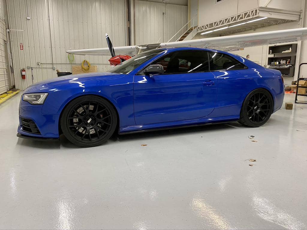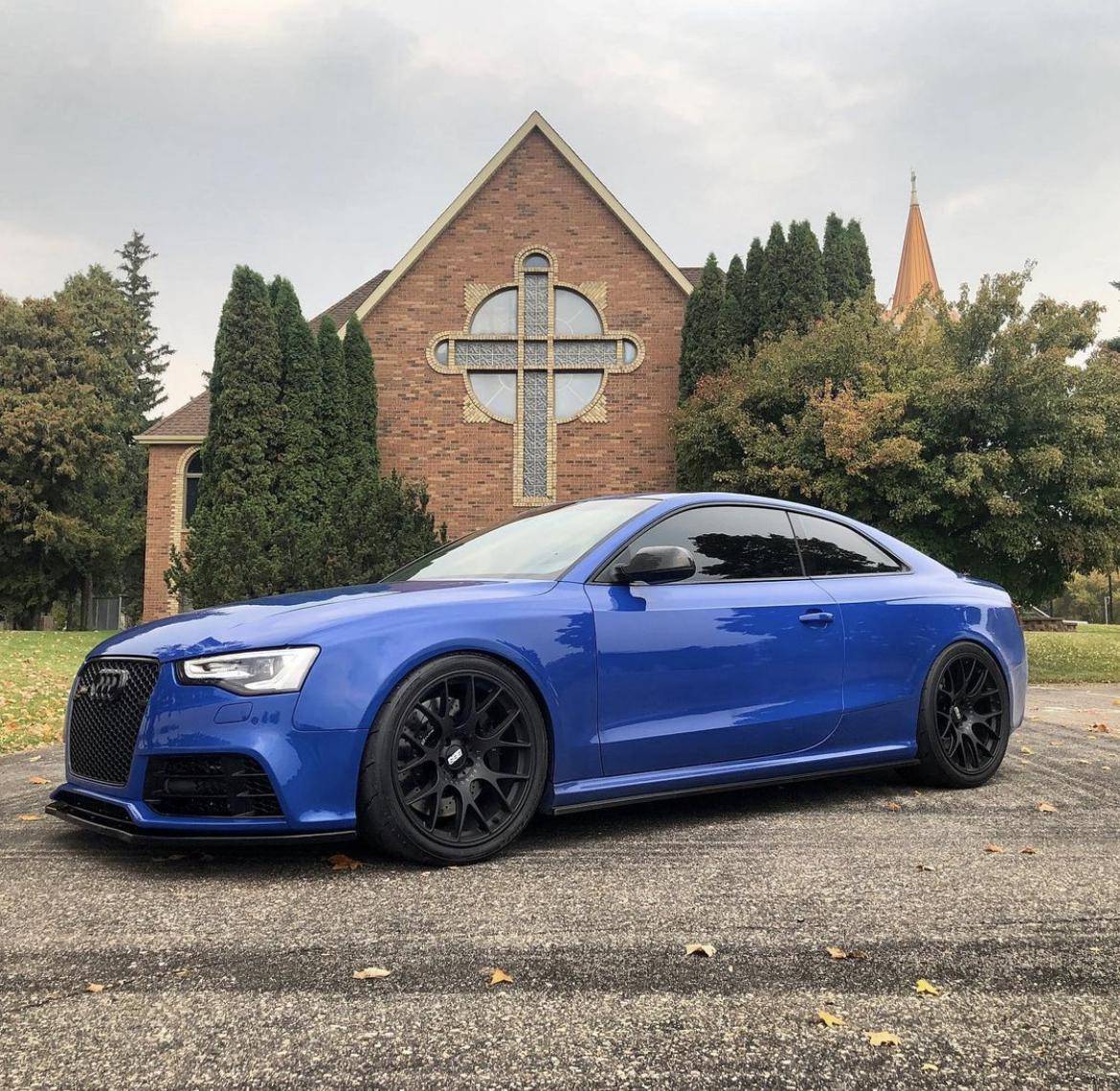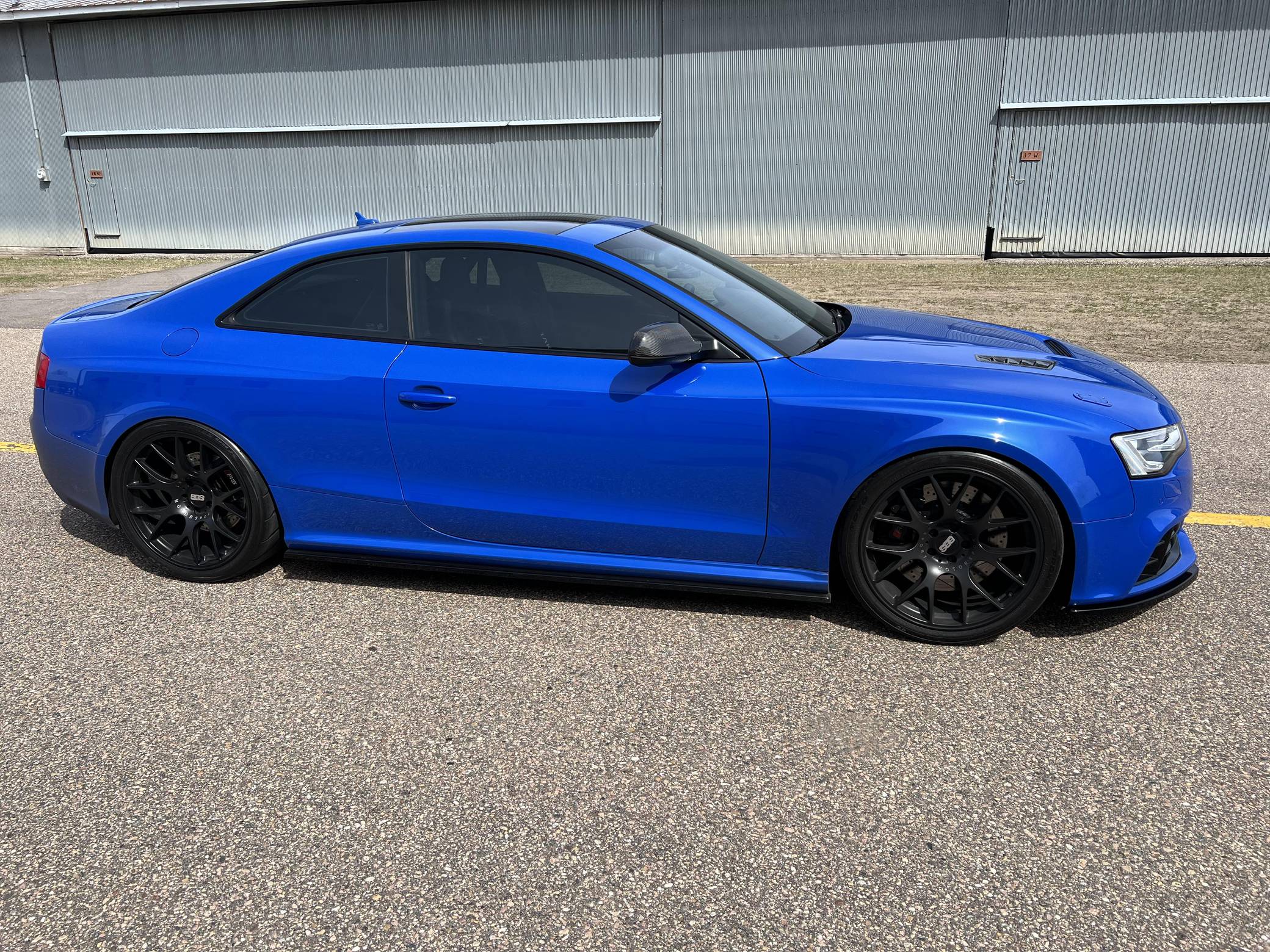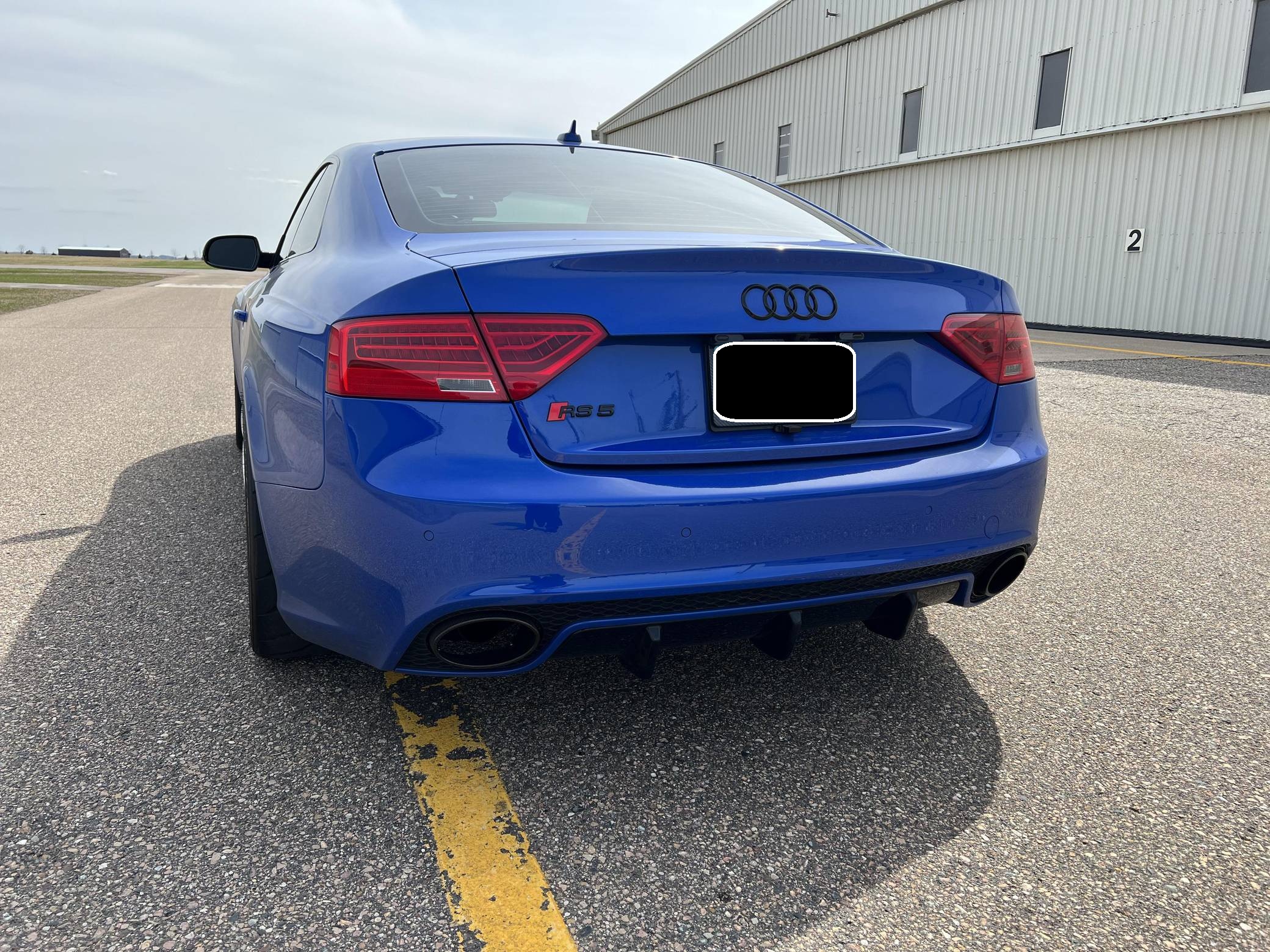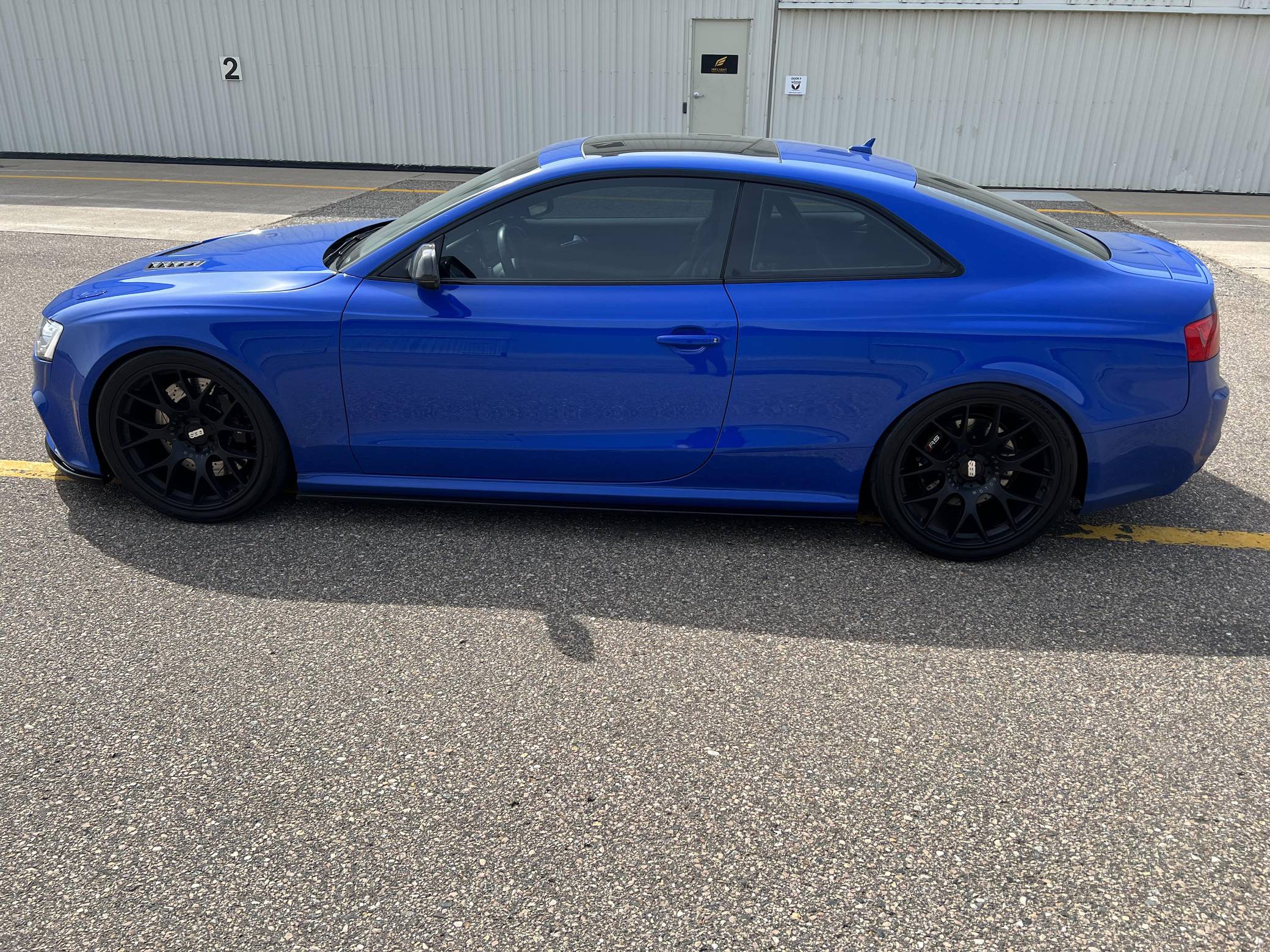 THIS. . . is a 2015 Audi RS5, finished in Nogaro Blue with a black interior. This coupe is equipped with a 6-speed manual transmission, and its odometer displays about 24,600 miles. Extensively modified, this RS5 is fitted with a pair of XONA ROTOR X2C XR6557S turbochargers, JE Pistons custom-made pistons, a Radium Engineering 6-gallon fuel cell, a Haltech Engine Management Systems Elite 2500 ECU with a premium harness, a custom-made 3-inch exhaust system with Borla XR-1 Raceline mufflers, a 6-speed manual transmission from a B8-generation S5, a JXB Performance limited-slip front differential, Bilstein B16 coilovers, a RevoZport carbon fiber hood, and RECARO Automotive Sportster GT front seats. More details about the aftermarket parts installed on this car are provided below. The first-generation RS5 made its debut for the 2011 model year as Audi's answer to the Mercedes-Benz C63 AMG. Based on the A5, it gained comprehensive chassis updates and a sportier exterior design, but its strongest asset was its naturally-aspirated V8 engine. Production ended in 2015, and the second-generation model downsized to a V6. Power comes from a 4. 2-liter twin-turbocharged V8, rated at 450 horsepower and 316 lb-ft of torque when left stock and naturally-aspirated. The modifications increase those figures to 1,051 and 822, respectively, according to a dyno sheet pictured in the gallery. The engine spins the four wheels via a 6-speed manual transmission and Audi's permanent Quattro all-wheel-drive system.
