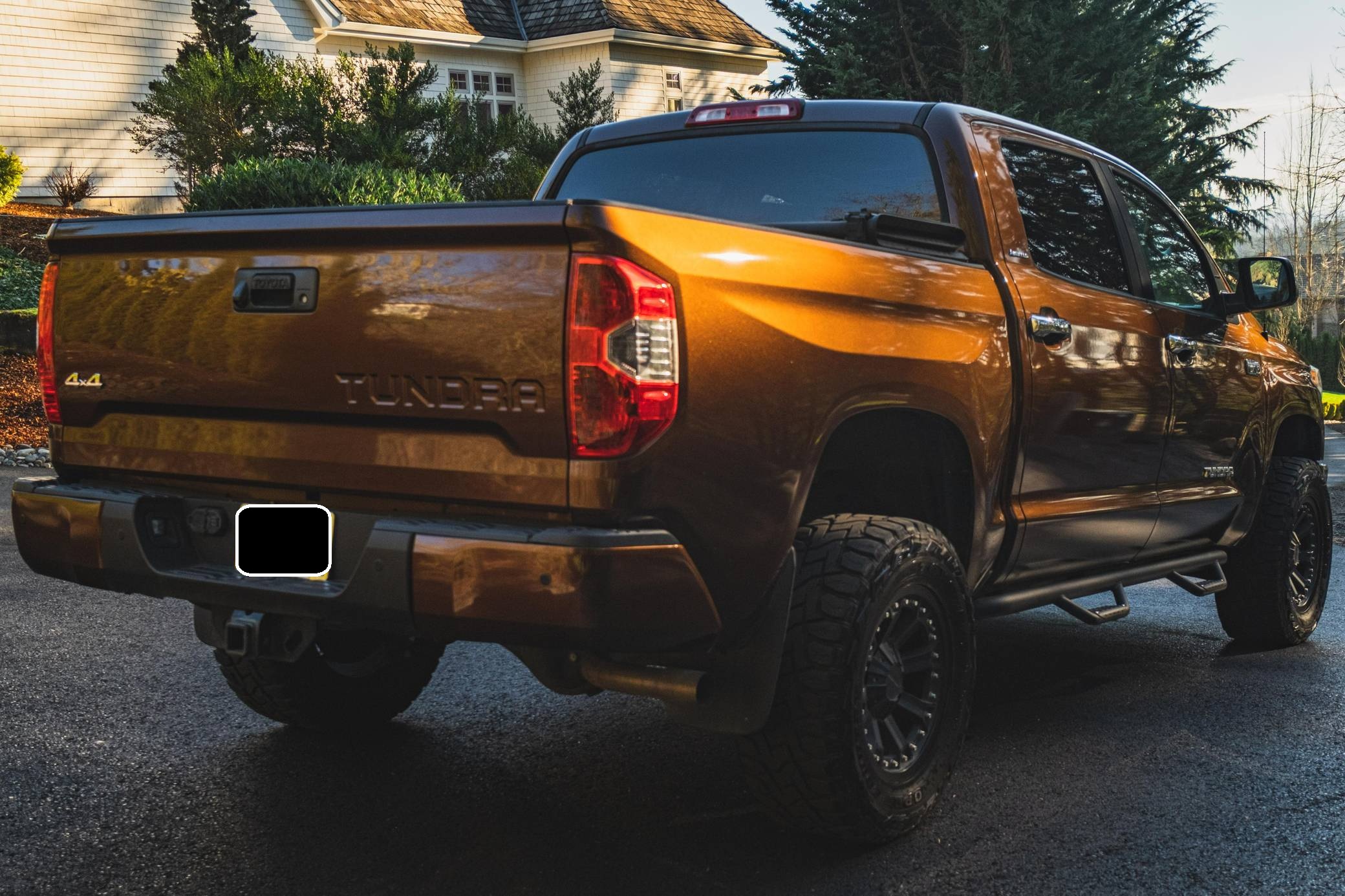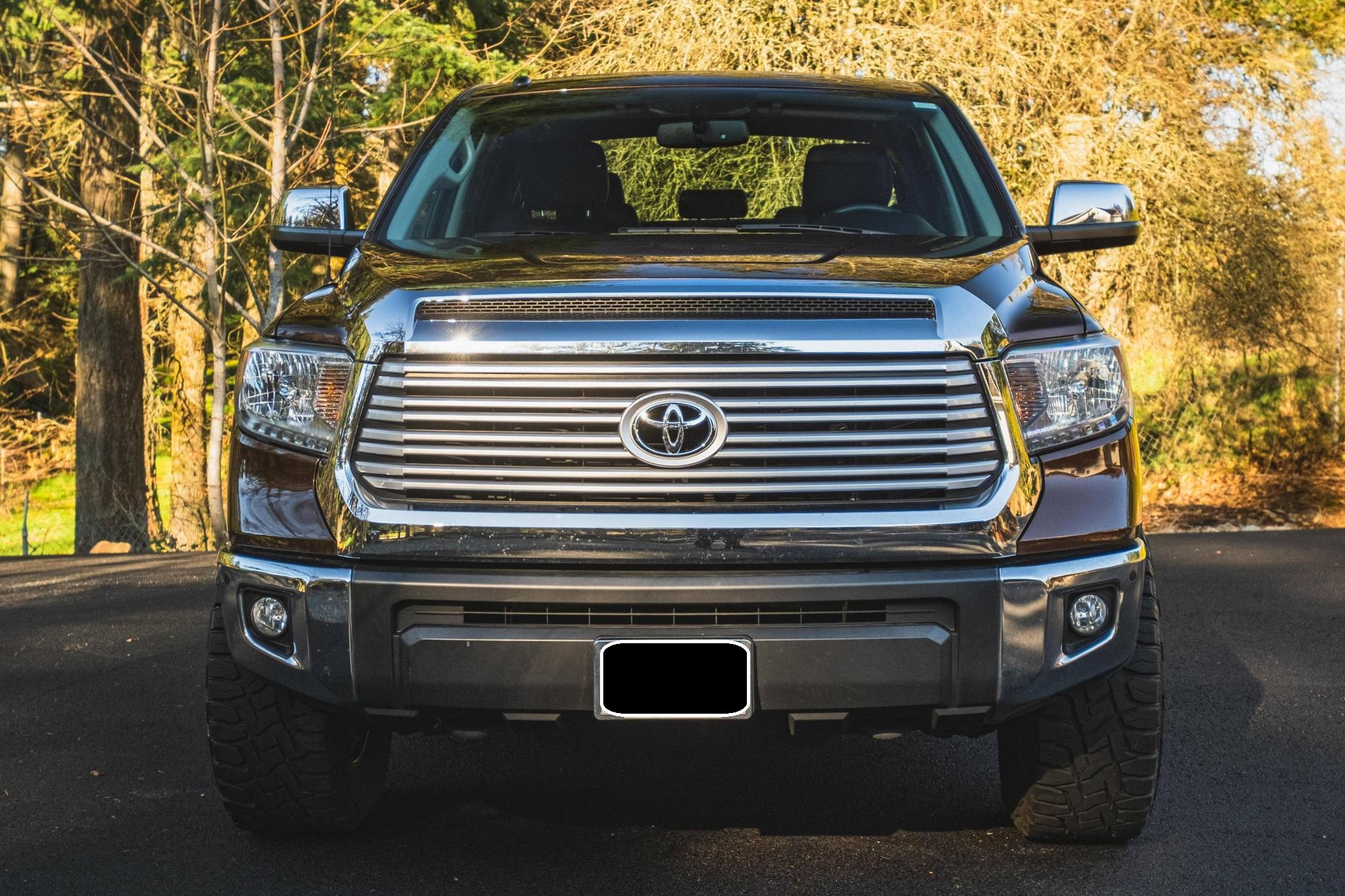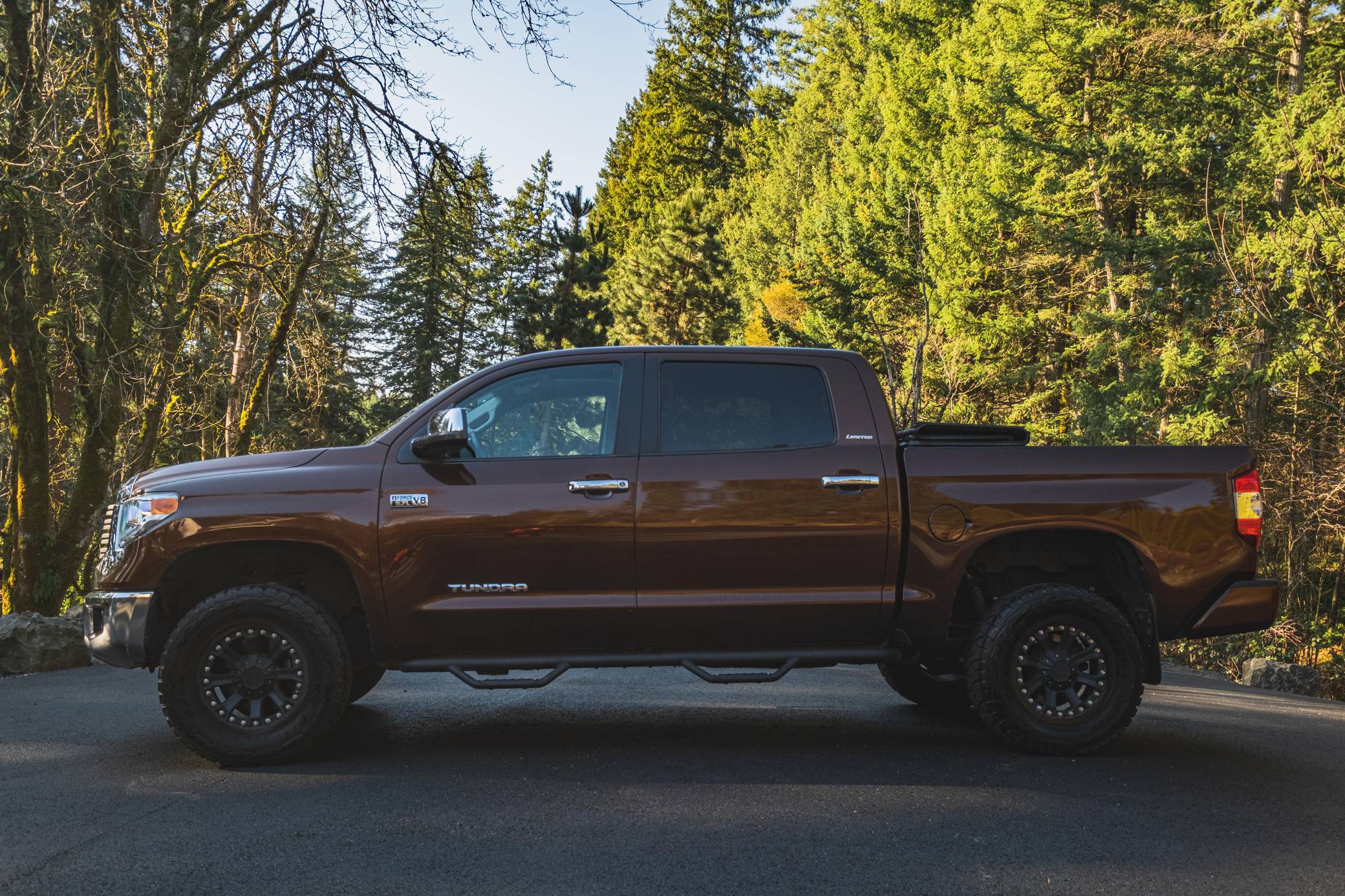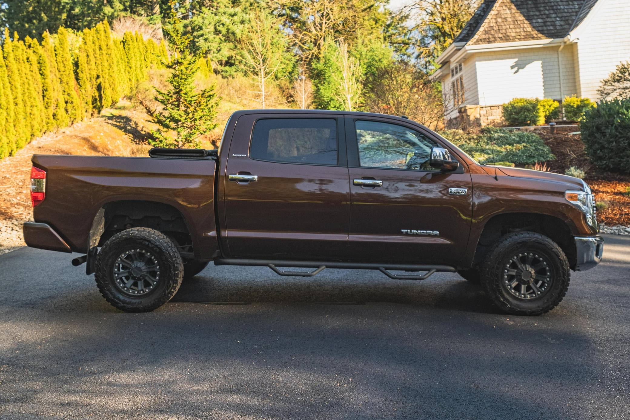 THIS. . . is a 2014 Toyota Tundra CrewMax Limited, finished in Sunset Bronze Mica with a black interior. The odometer on this Tundra currently displays about 35,200 miles. Factory equipment includes A-TRAC traction control, an automatic limited-slip differential, power-operated rear window, leather upholstery, power-adjustable heated front seats, dual-zone automatic climate control, 7-inch infotainment screen, Entune JBL premium audio system, navigation system, Bluetooth connectivity, and a rear backup camera. Modifications are limited to 18-inch Pro Comp alloy wheels, Toyo R/T Open Country tires, an electronic trailer brake, a 3-inch lift kit, Go Rhino side steps, Trifecta truck bed cover, and all-weather floor mats. Toyota released the "XK50"-generation Tundra for the 2007 model year. Designed in America for Americans and built in Texas, the second-generation Tundra was much bigger and brawnier than its predecessor to take the fight directly to Detroit's Big Three. It was available in a wide selection of configurations until production ended in 2021. Power comes from a 5. 7-liter V8, rated at 381 horsepower and 401 lb-ft of torque. Output is directed to the rear or all four wheels through a 6-speed automatic transmission and a 2-speed transfer case.