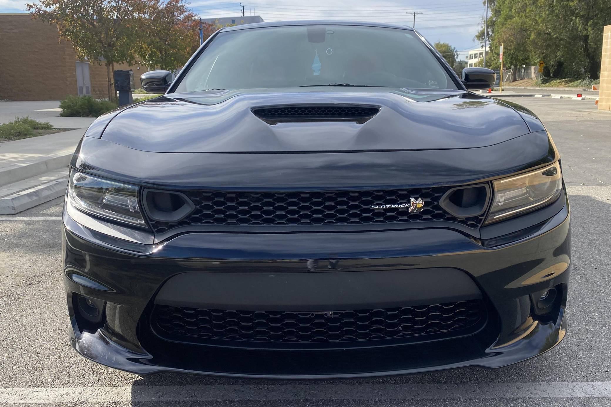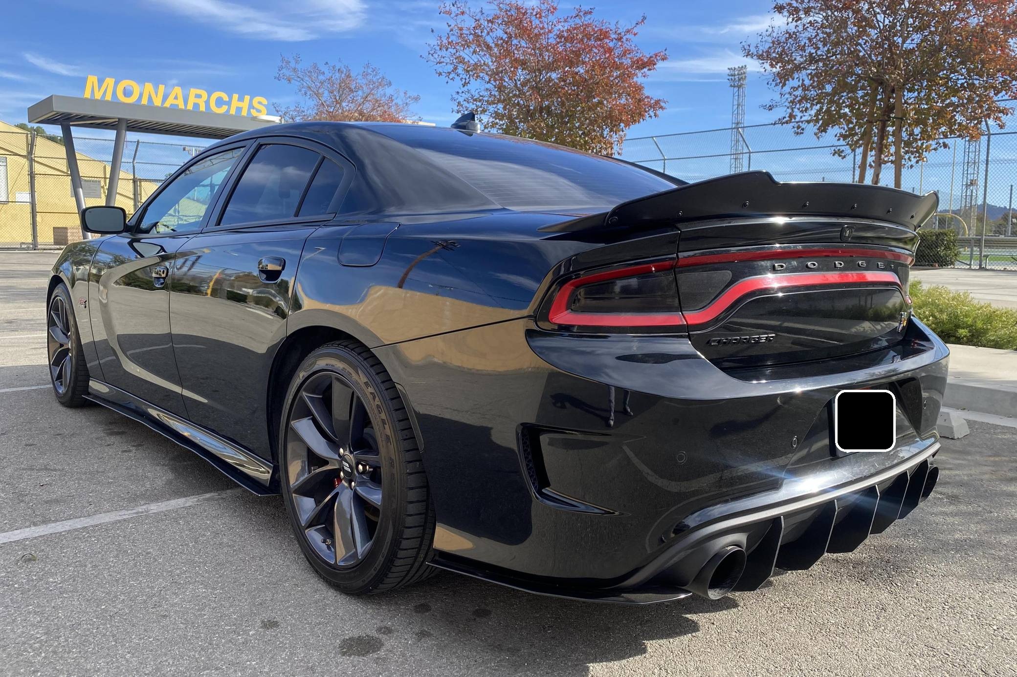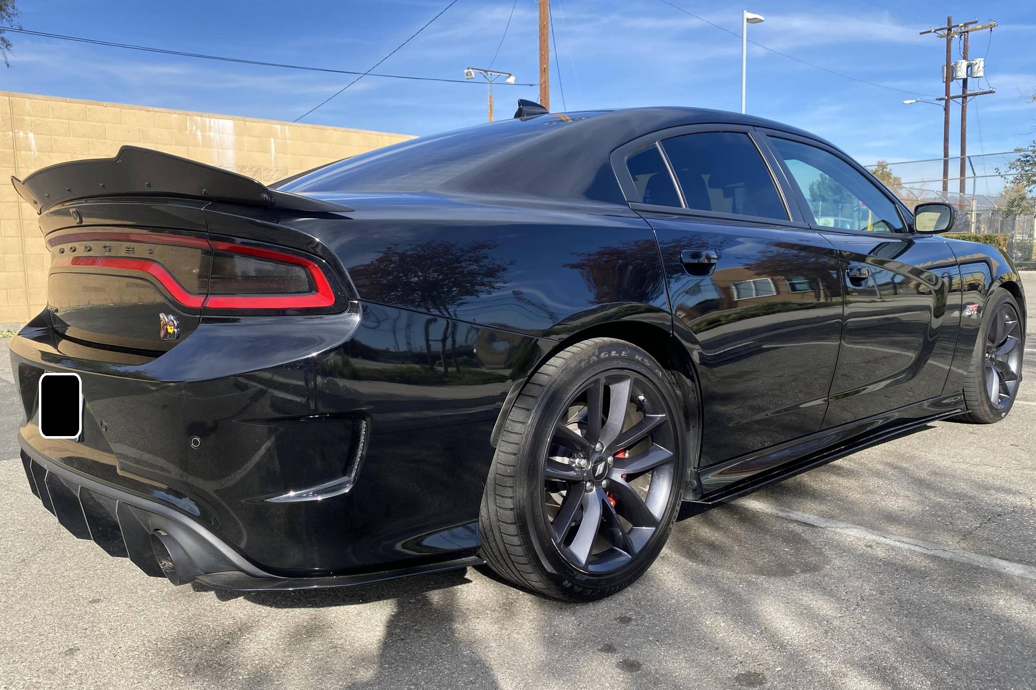 2019 Dodge Charger Scat Pack, finished in Pitch Black with a custom Red interior. Modifications reported by the seller include Dynomax Race Bullet resonators, Carven 5-inch exhaust tips in black, King Wraps custom side skirts, "wicker bill" spoiler, spats, and rear diffuser, tinted windows and taillights, Sto N Sho license plate holder, custom red leather interior, LED interior bulbs, and painted brake calipers. Dodge rebooted the Charger for the 2011 model year with a new exterior design and better visibility. 2015 brought a facelift that ushered in a more muscular-looking design and better interior materials. Power comes from a 6. 4-liter Hemi V8 engine, which produces 485 horsepower and 475 lb-ft of torque. Power is sent to the rear wheels via an 8-speed automatic transmission.