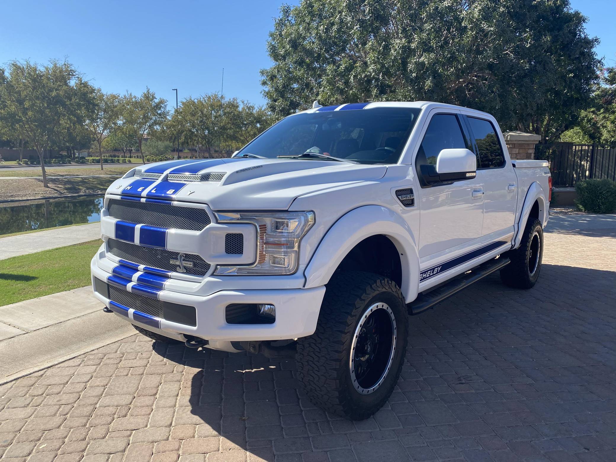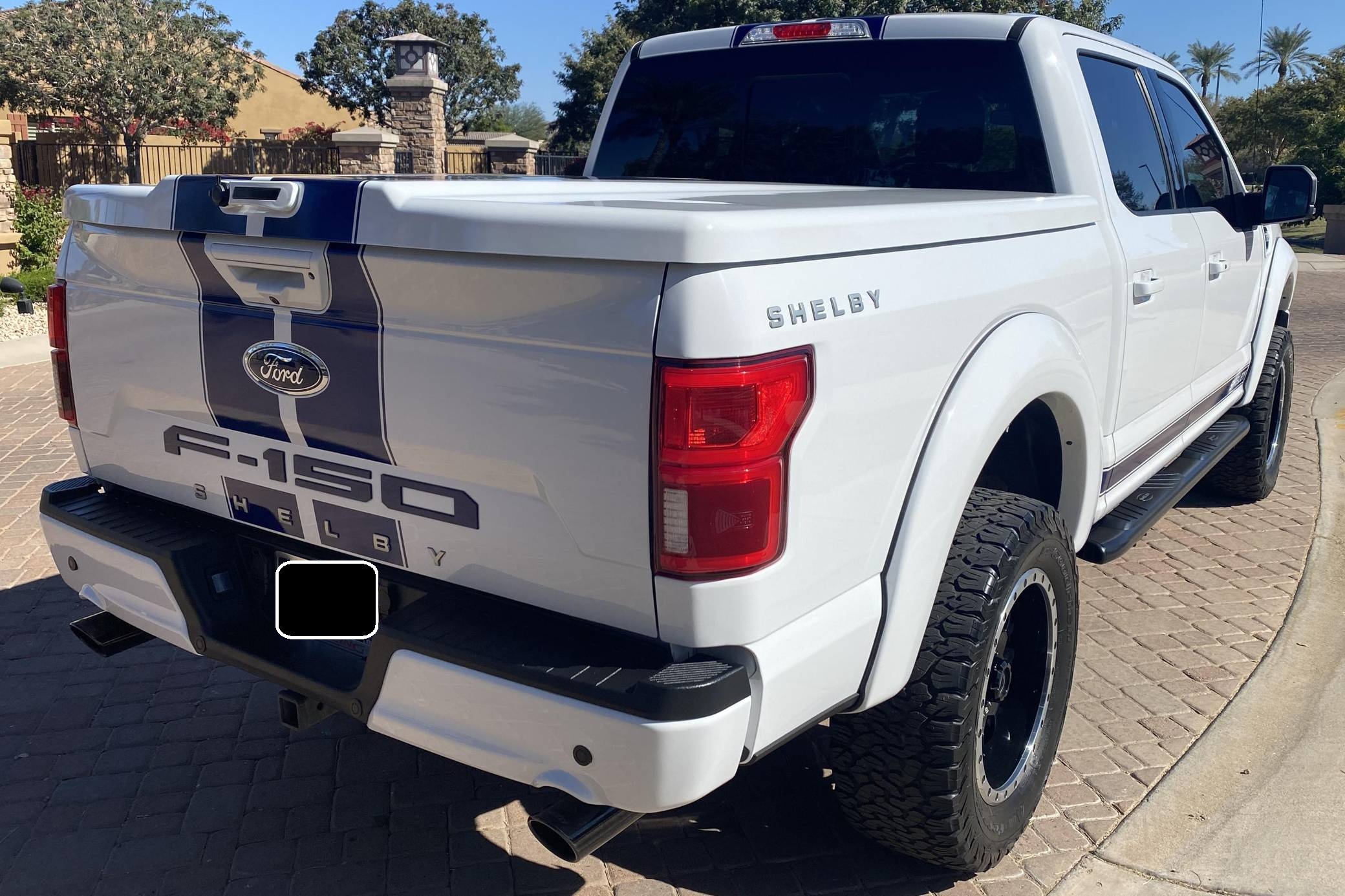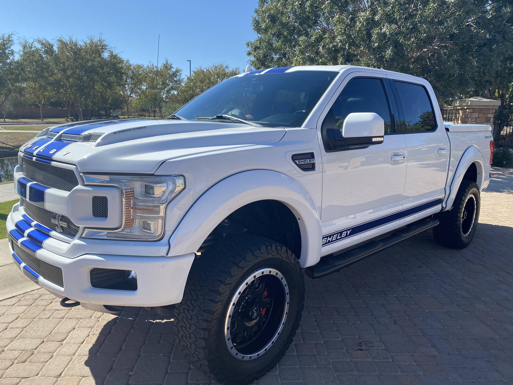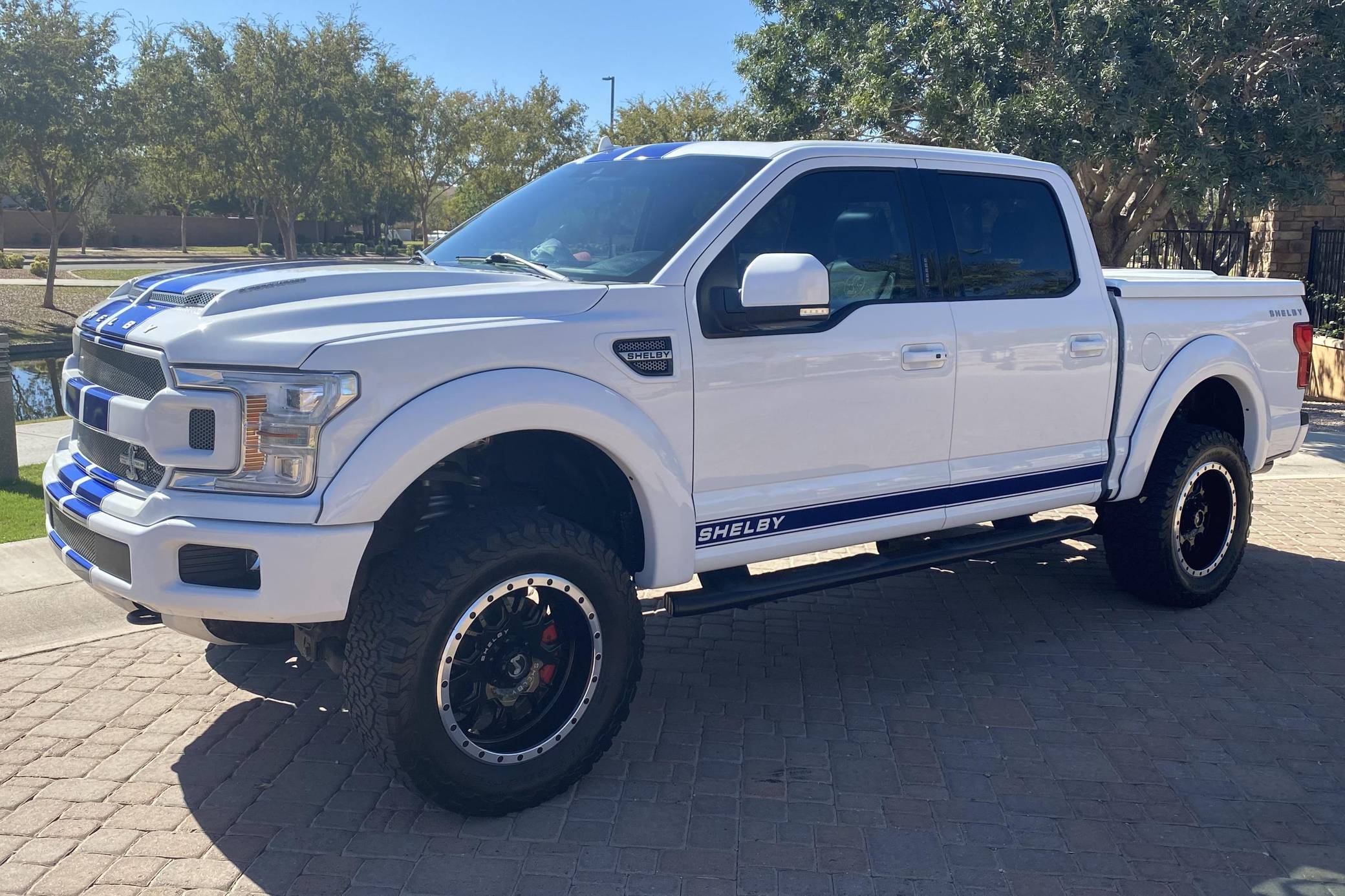 2018 Ford Shelby F-150, finished in white with a black interior. Whipple supercharger, a performance air intake system, a Borla exhaust system with black tips, 20-inch wheels, a Shelby-tuned Fox suspension system, carbon fiber interior trim, and carpet in the cargo box, among other Shelby modifications. Highly optioned, this F-150 is equipped with a trailer hitch, panoramic sunroof, heated and ventilated front seats, heated rear seats, and a Bang & Olufsen sound system. Ford gave the perennially popular F-150 a major overhaul for 2015. Again available in a mind-bogglingly vast selection of configurations, the truck relied on aluminum to shed up to 700 pounds over its predecessor, and it was offered with a longer list of tech and comfort features. Production ended in 2020. Launched for the 2018 model year, the Shelby F-150 wore a head-turning exterior design inspired by the firm's Mustang-based builds. Additionally, it received a redesigned suspension system, and it was available with nearly twice the horsepower of the standard F-150. Every unit built was entered in the Shelby registry. Power comes from a supercharged 5. 0-liter "Coyote" V8, rated at 755 horsepower. For context, the V8-powered F-150's factory output checks in at 395 horsepower. The engine spins the rear or all four wheels via a 2-speed transfer case and a 10-speed automatic transmission.