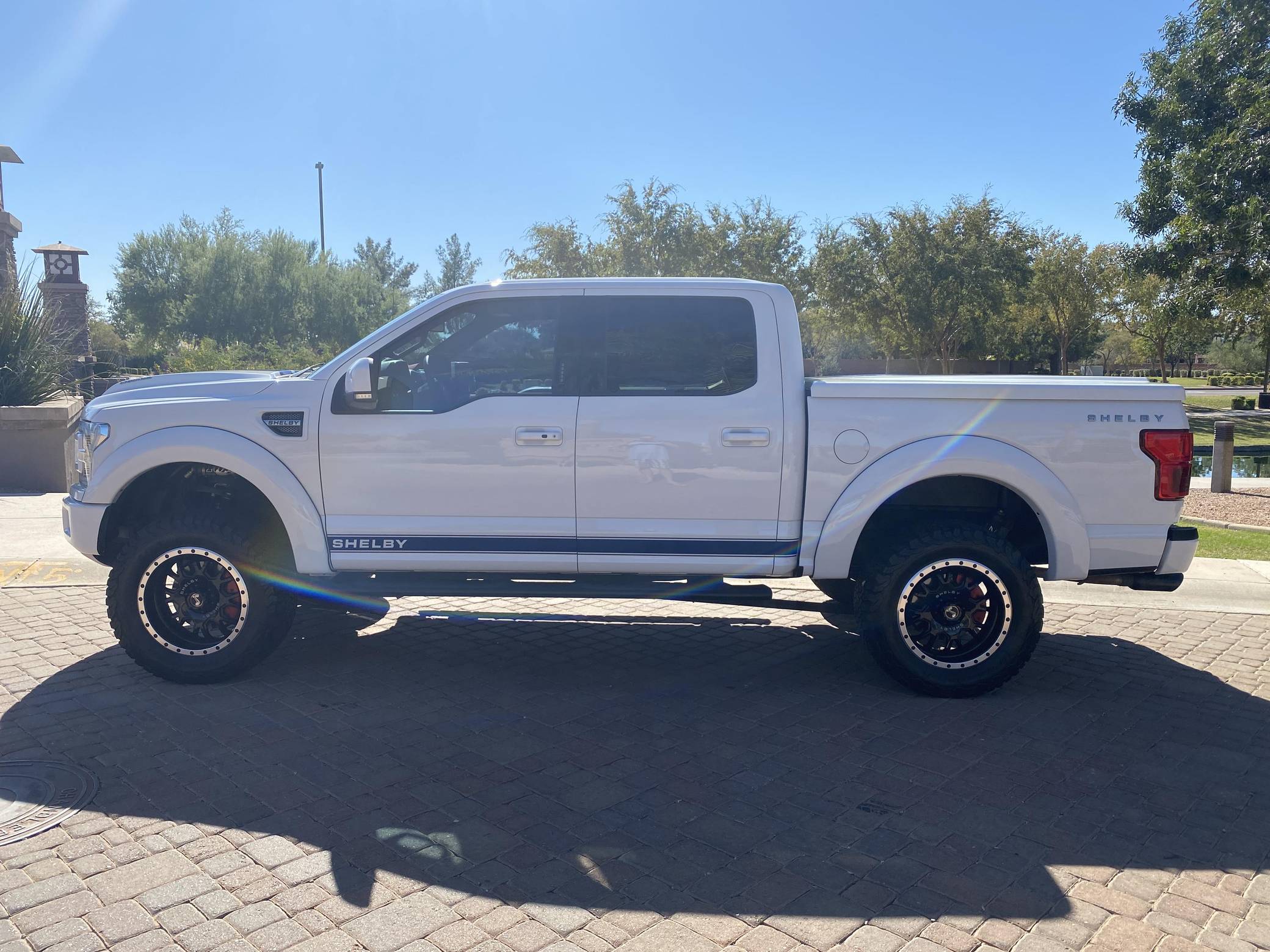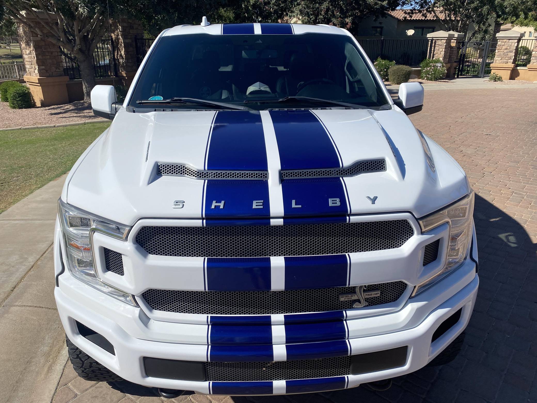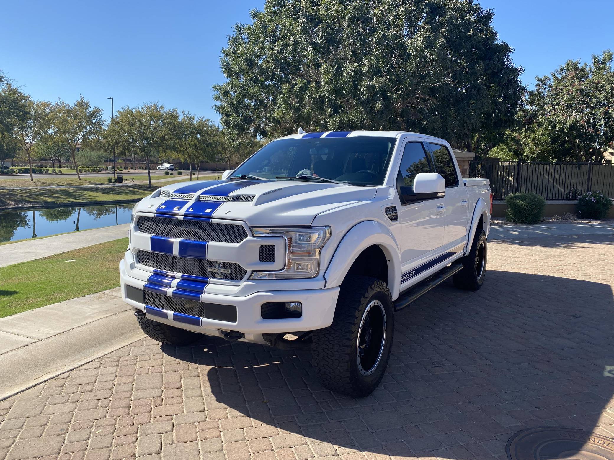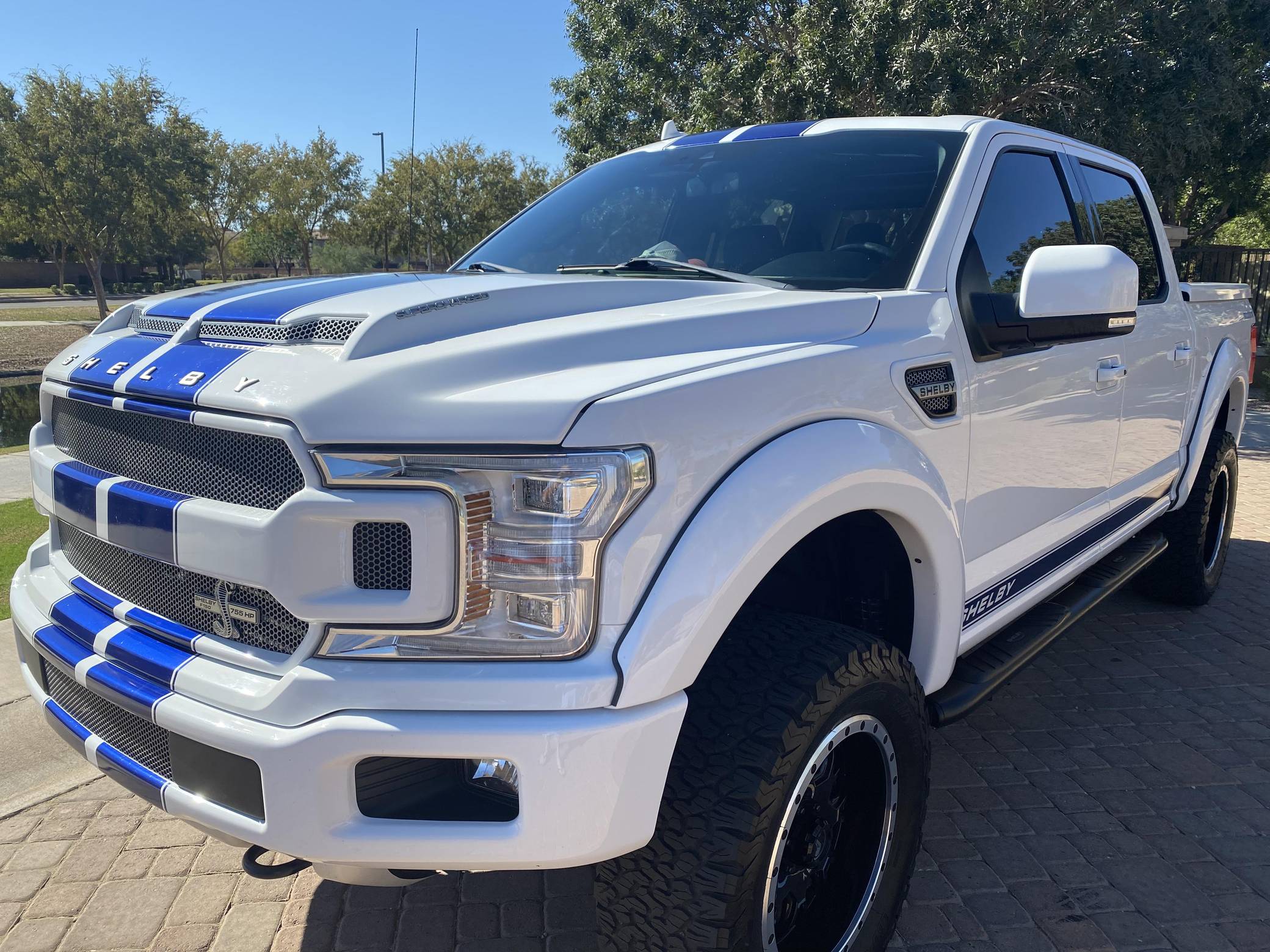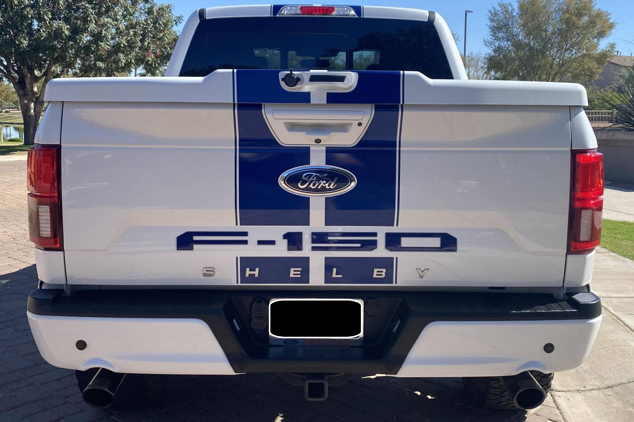 2018 Ford Shelby F-150, finished in white with a black interior. Whipple supercharger, a performance air intake system, a Borla exhaust system with black tips, 20-inch wheels, a Shelby-tuned Fox suspension system, carbon fiber interior trim, and carpet in the cargo box, among other Shelby modifications. Highly optioned, this F-150 is equipped with a trailer hitch, panoramic sunroof, heated and ventilated front seats, heated rear seats, and a Bang & Olufsen sound system. Ford gave the perennially popular F-150 a major overhaul for 2015. Again available in a mind-bogglingly vast selection of configurations, the truck relied on aluminum to shed up to 700 pounds over its predecessor, and it was offered with a longer list of tech and comfort features. Production ended in 2020. Launched for the 2018 model year, the Shelby F-150 wore a head-turning exterior design inspired by the firm's Mustang-based builds. Additionally, it received a redesigned suspension system, and it was available with nearly twice the horsepower of the standard F-150. Every unit built was entered in the Shelby registry. Power comes from a supercharged 5. 0-liter "Coyote" V8, rated at 755 horsepower. For context, the V8-powered F-150's factory output checks in at 395 horsepower. The engine spins the rear or all four wheels via a 2-speed transfer case and a 10-speed automatic transmission.