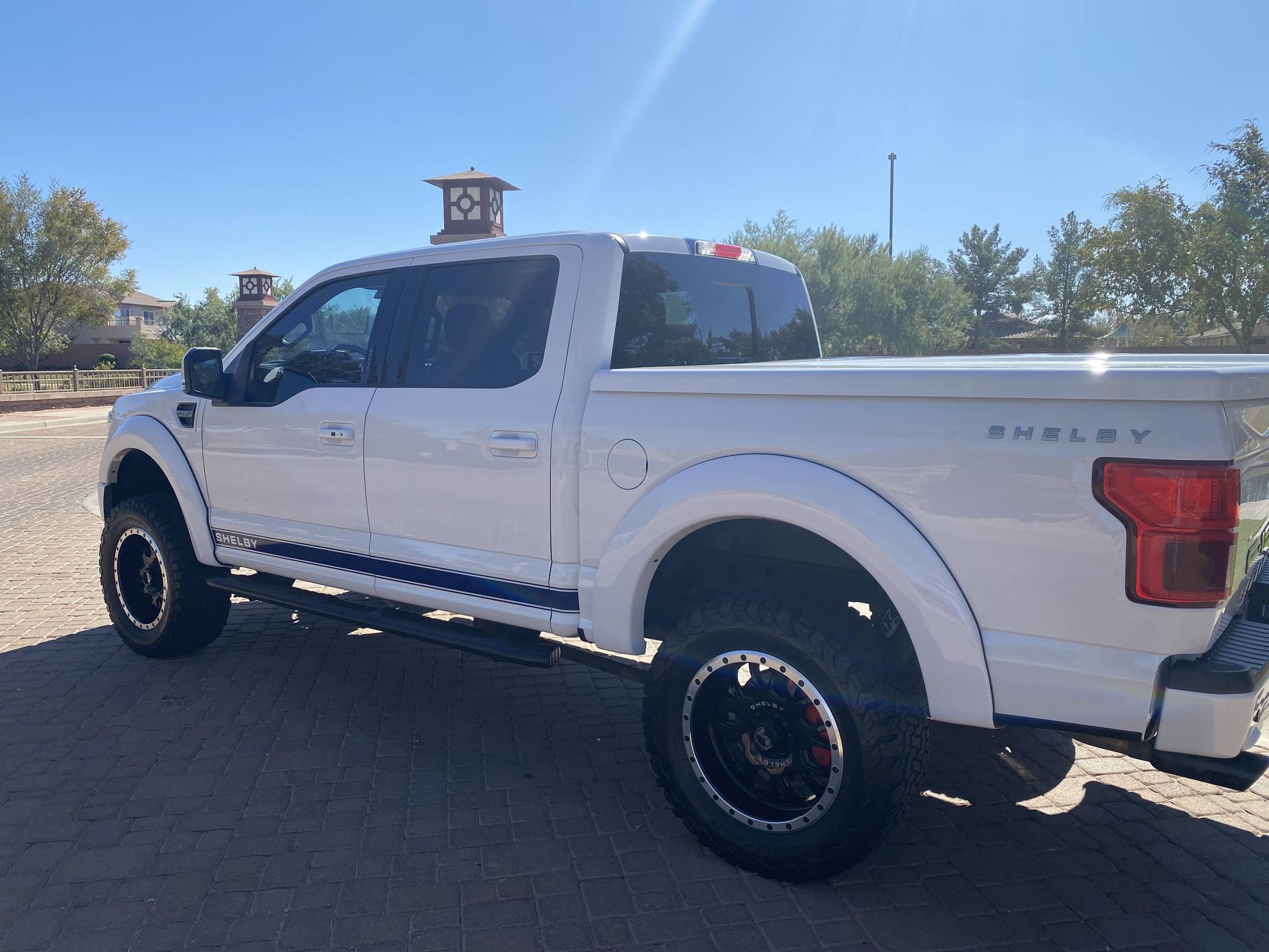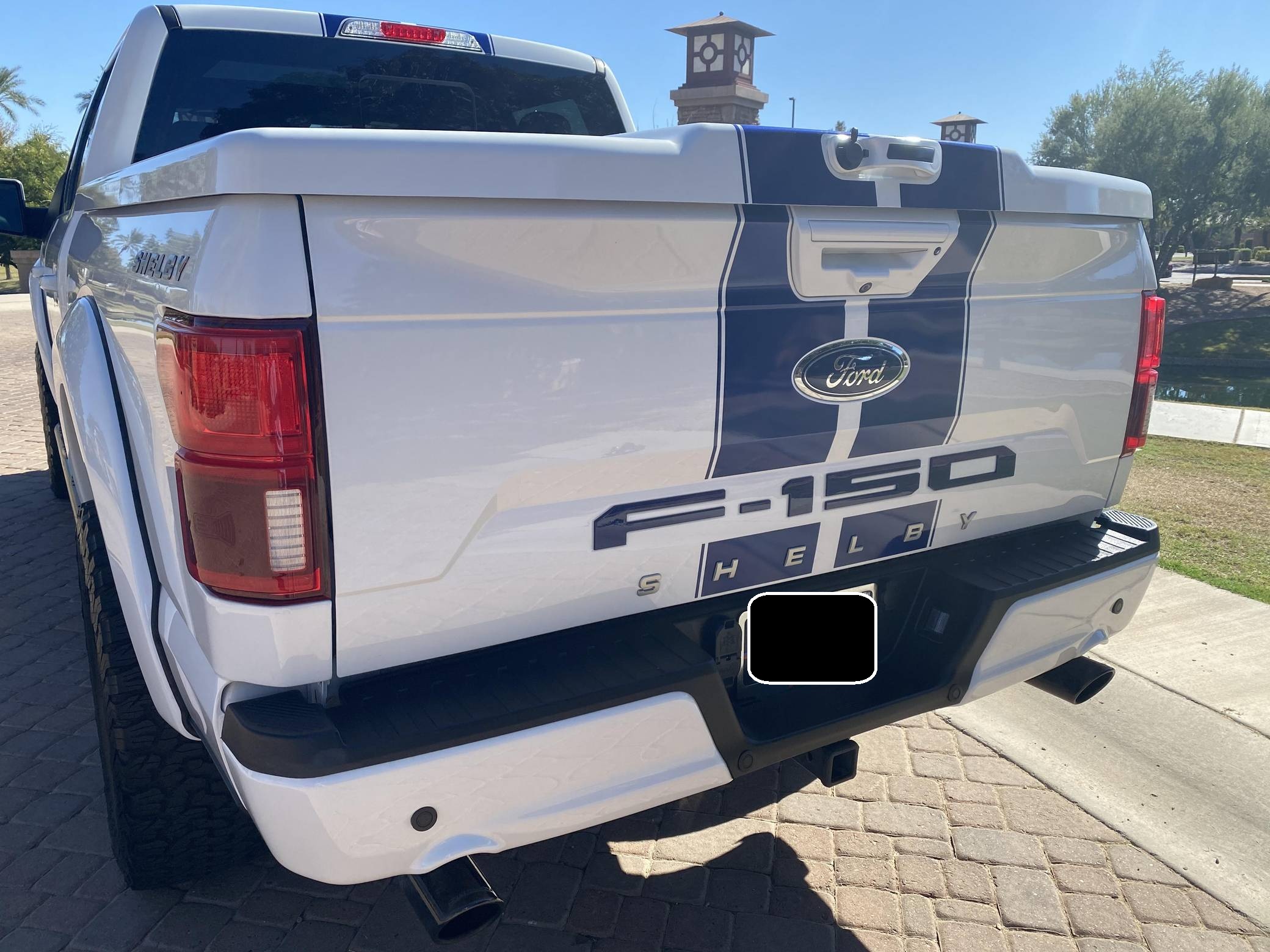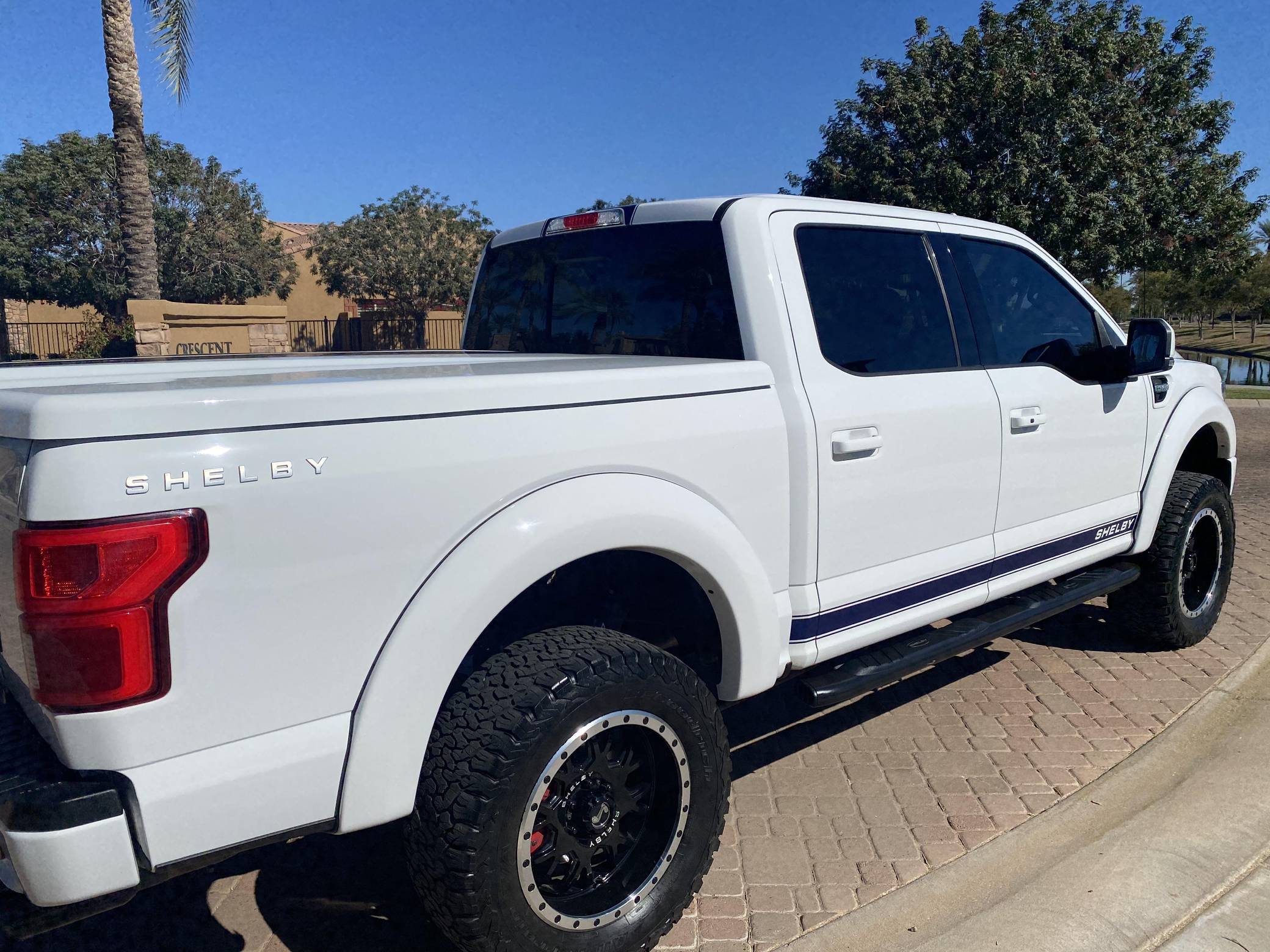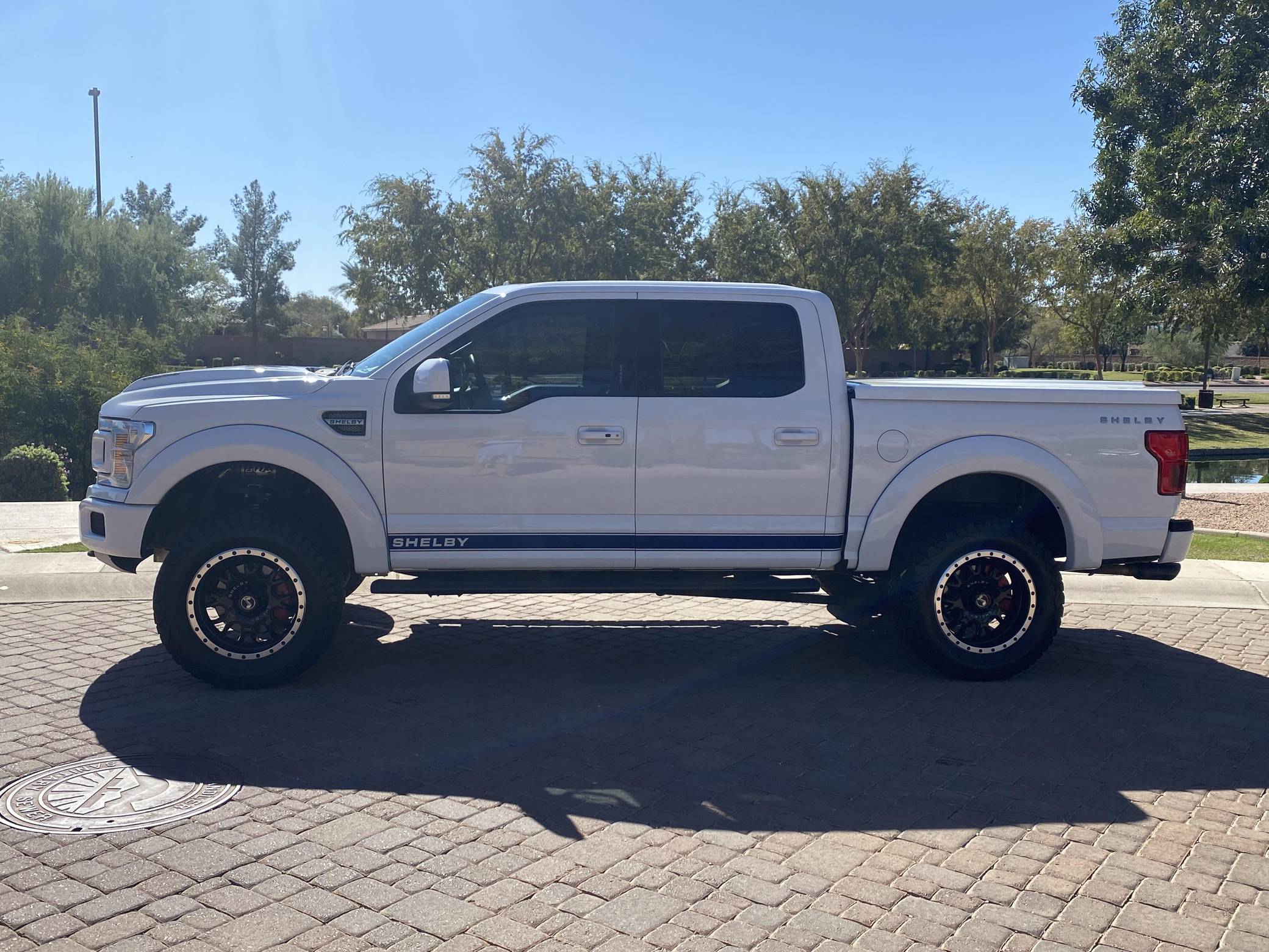 2018 Ford Shelby F-150, finished in white with a black interior. Whipple supercharger, a performance air intake system, a Borla exhaust system with black tips, 20-inch wheels, a Shelby-tuned Fox suspension system, carbon fiber interior trim, and carpet in the cargo box, among other Shelby modifications. Highly optioned, this F-150 is equipped with a trailer hitch, panoramic sunroof, heated and ventilated front seats, heated rear seats, and a Bang & Olufsen sound system. Ford gave the perennially popular F-150 a major overhaul for 2015. Again available in a mind-bogglingly vast selection of configurations, the truck relied on aluminum to shed up to 700 pounds over its predecessor, and it was offered with a longer list of tech and comfort features. Production ended in 2020. Launched for the 2018 model year, the Shelby F-150 wore a head-turning exterior design inspired by the firm's Mustang-based builds. Additionally, it received a redesigned suspension system, and it was available with nearly twice the horsepower of the standard F-150. Every unit built was entered in the Shelby registry. Power comes from a supercharged 5. 0-liter "Coyote" V8, rated at 755 horsepower. For context, the V8-powered F-150's factory output checks in at 395 horsepower. The engine spins the rear or all four wheels via a 2-speed transfer case and a 10-speed automatic transmission.