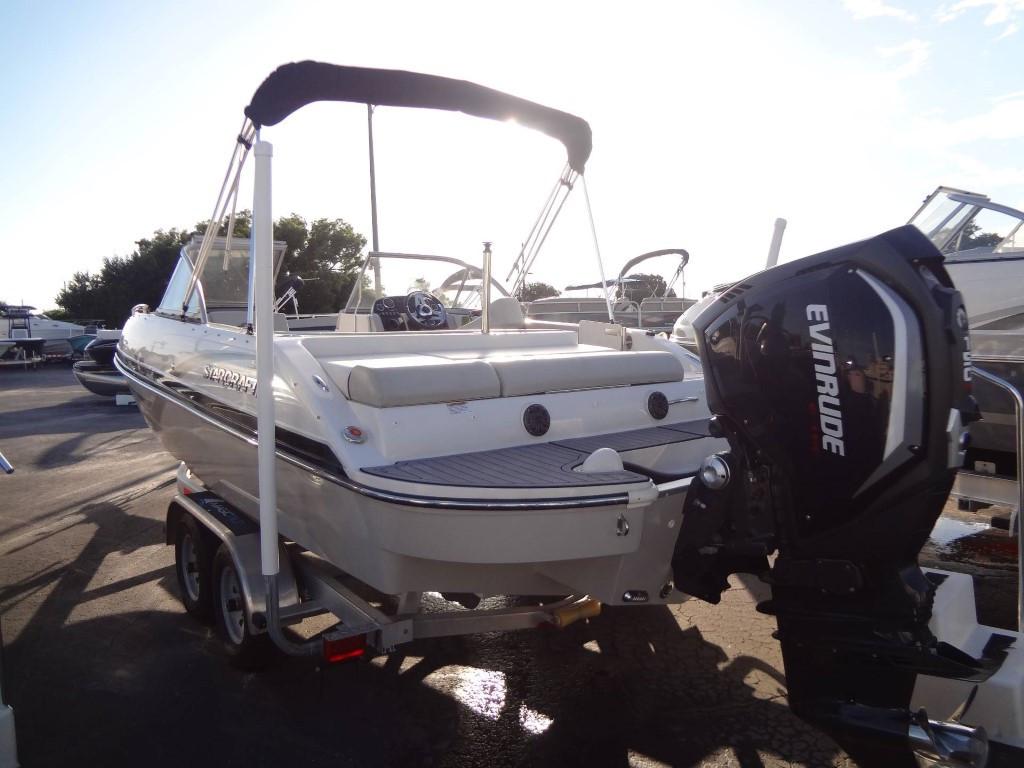 This 2019 Starcraft MDX 210 OB is powered by a 150 HP Evinrude V-TEC outboard. The helm features a walk-through windscreen, G2 hydraulic steering, interior lights, courtesy lights, an audio input/USB plug, a 12V plug, cup holders, and a captain’s chair. Other features include a black Bimini top, black bow and cockpit cover, a bow platform with a ladder, bow seating, underwater lights, exterior lights, cleats, ski tow, and black stainless steel rub rails.