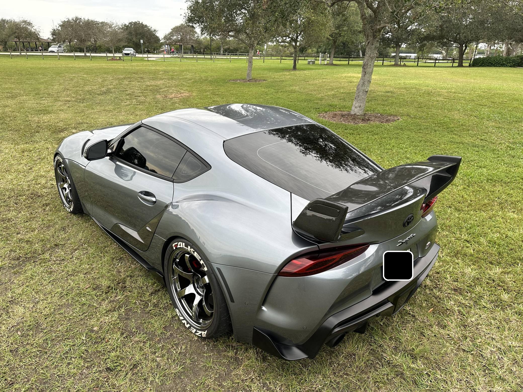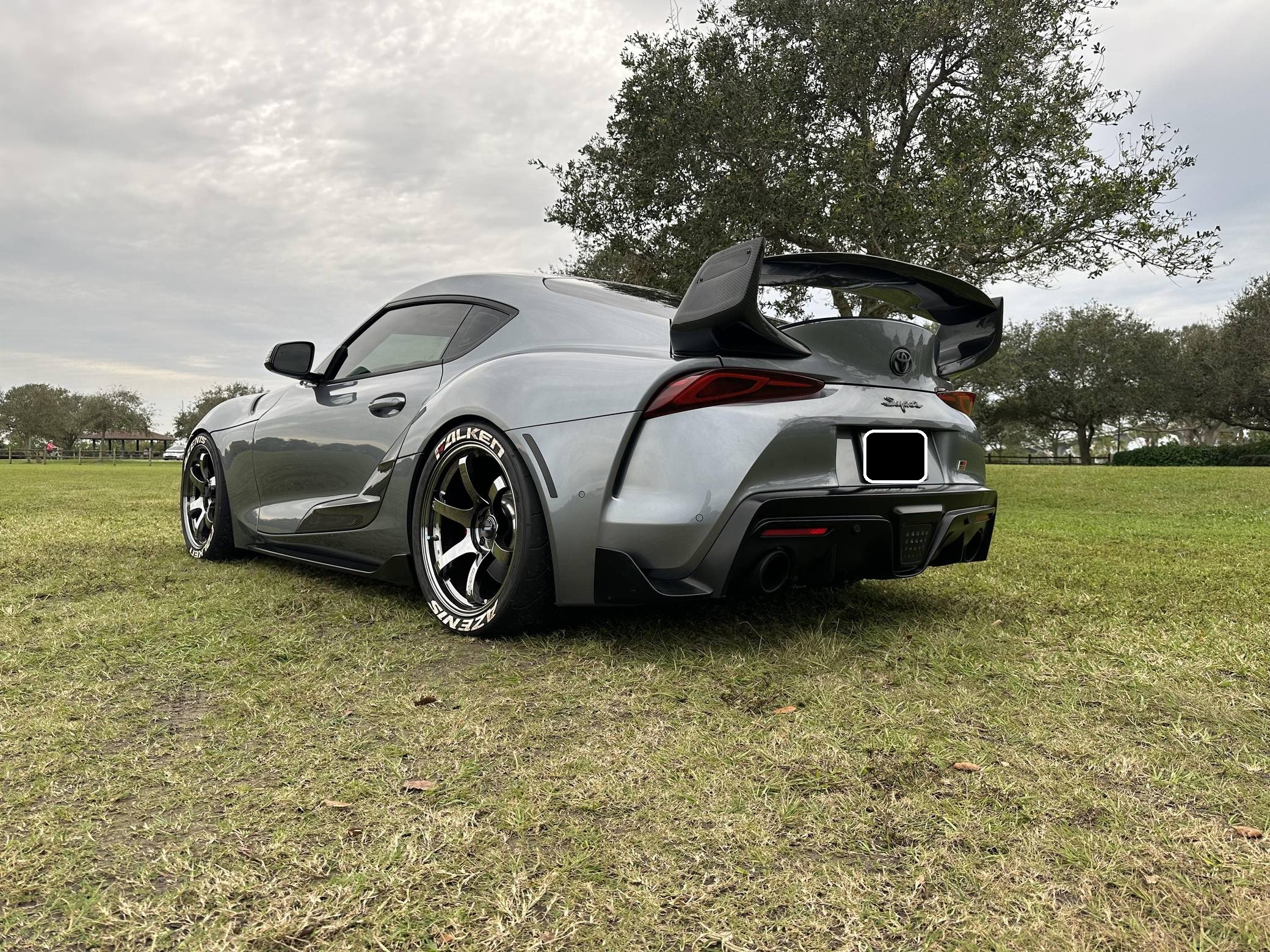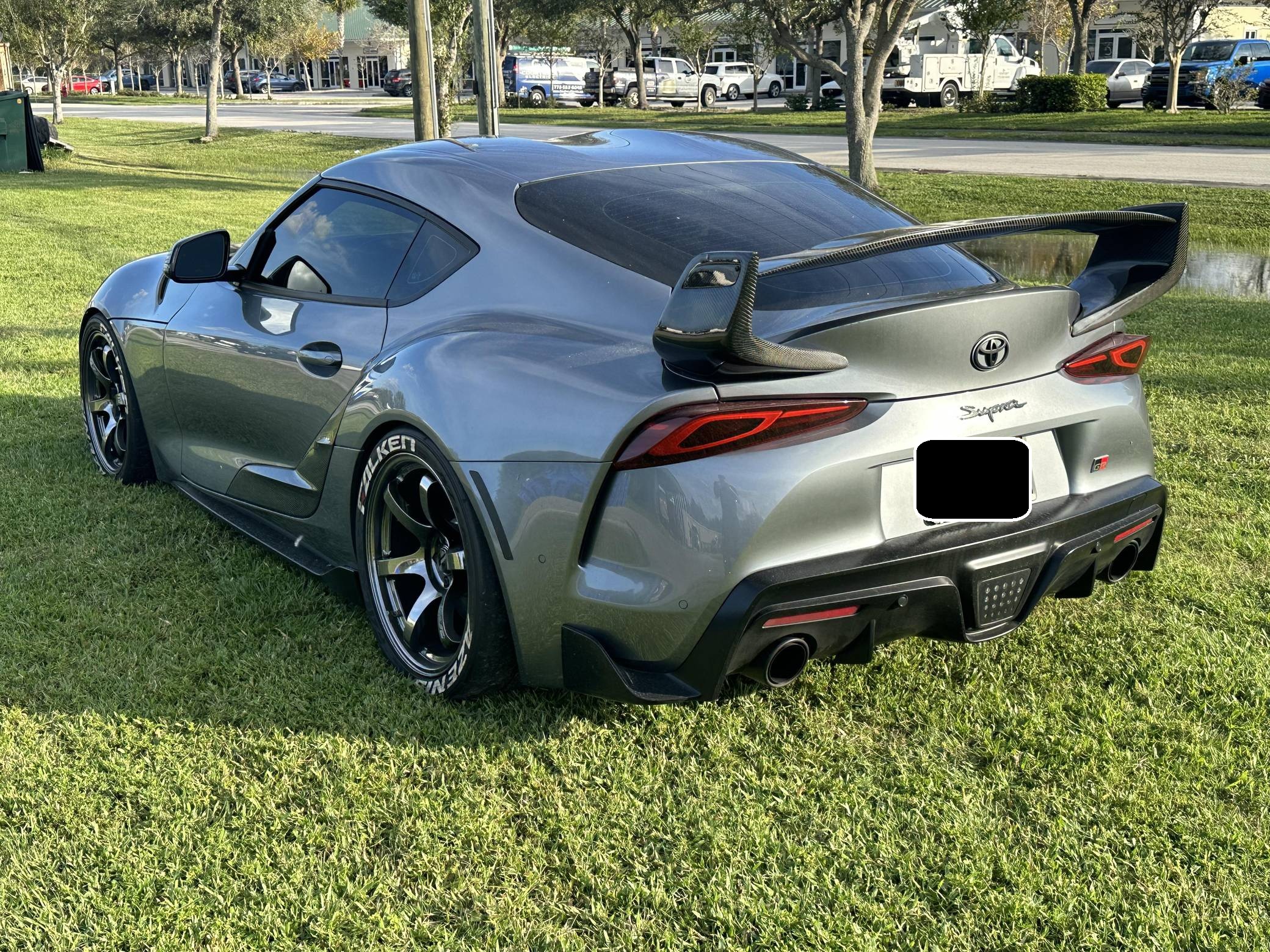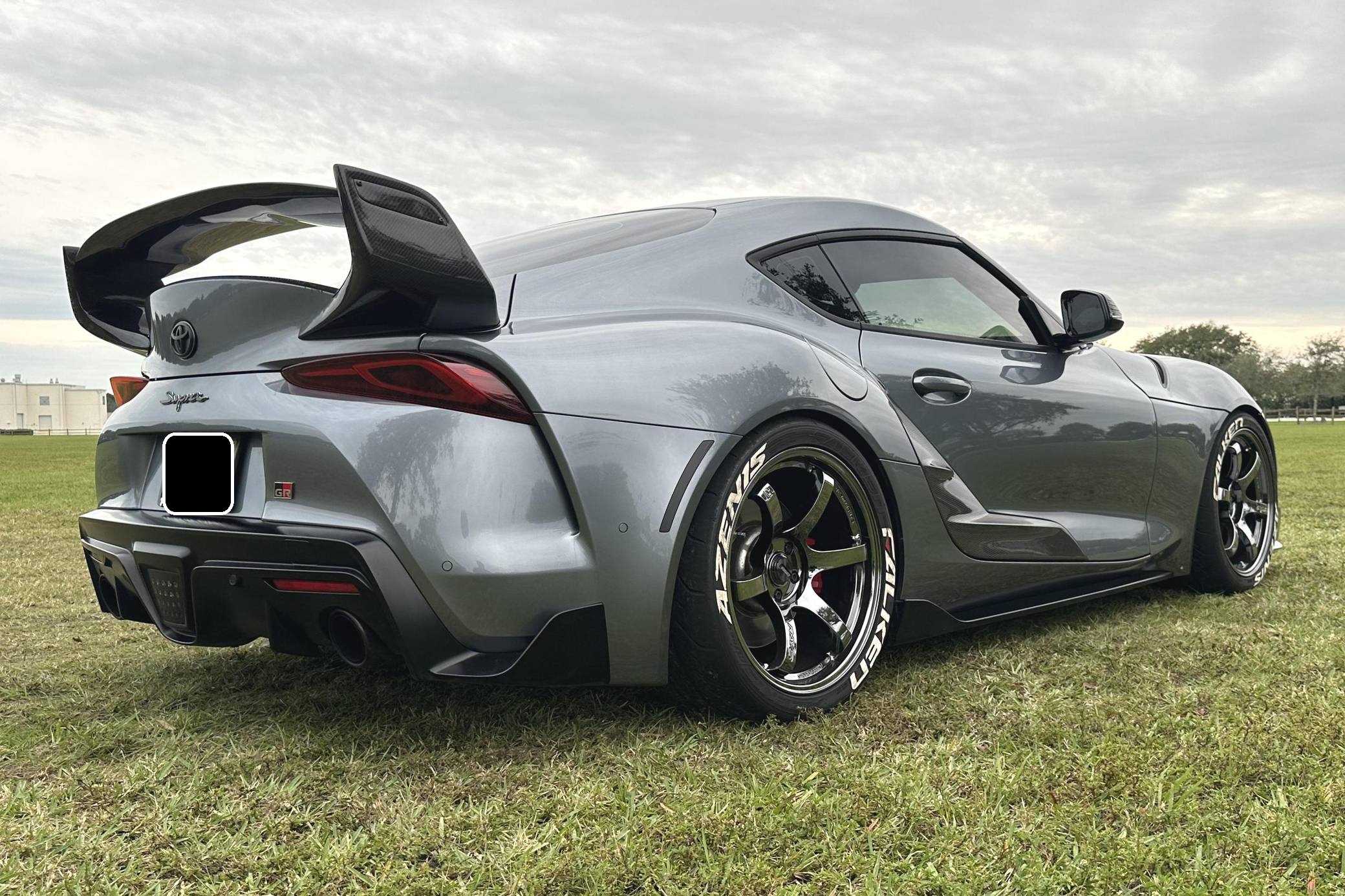 THIS… is a 2021 Toyota Supra 3. 0 Premium, finished in Turbulence Gray with a black interior. Modifications reported by the seller include RAYS Gram Lights wheels with Falken Azenis RT660 tires, HKS HIPERMAX springs, an EcuTek tune, a Pure800 turbocharger, a Titan Motorsports downpipe and methanol injection kit, a MagnaFlow catback modular exhaust, various Rexspeed carbon fiber exterior parts, and a Suvneer Motorsports rear wing. After a nearly two-decade absence, the Supra was revived as part of a major partnership with BMW. With turbocharged 4- or 6-cylinder power, the Graz, Austria-built Supra went on sale in mid-2019. Changes for 2021 included a hefty bump in power and numerous chassis tweaks. Power comes from a 3. 0-liter turbocharged inline-6, rated at 382 horsepower and 368 lb-ft of torque in stock form. Due to the modifications performed to this Supra, it likely produces more power, but a dyno sheet was not provided to confirm. Output is sent to the rear wheels via an 8-speed automatic transmission.