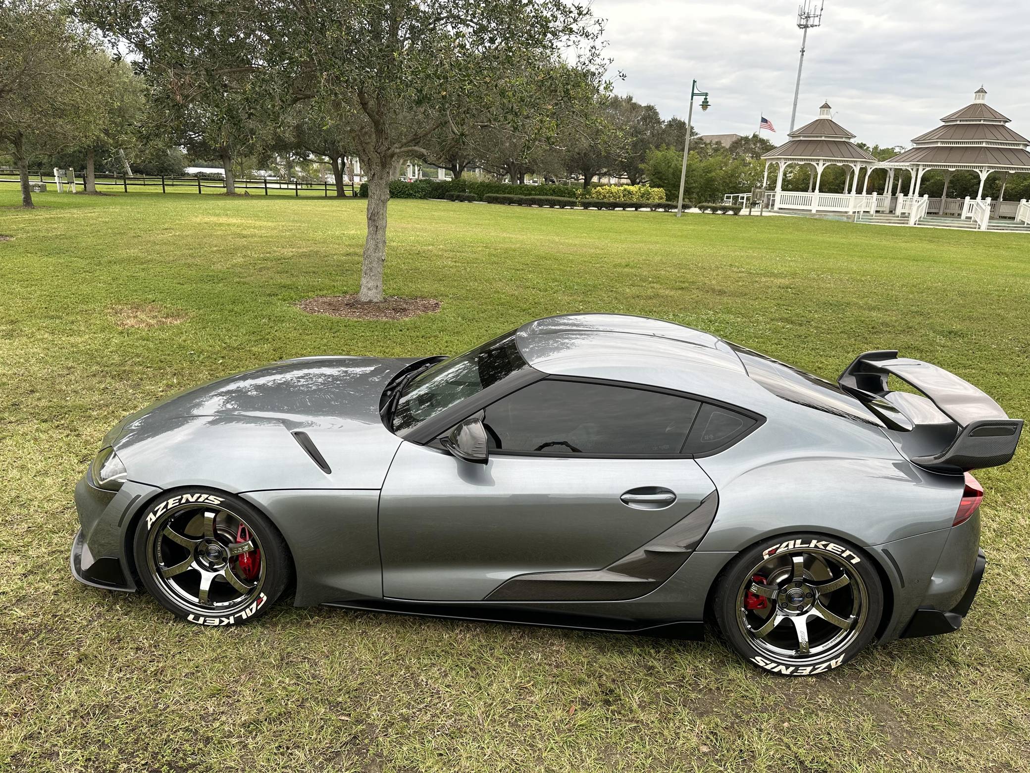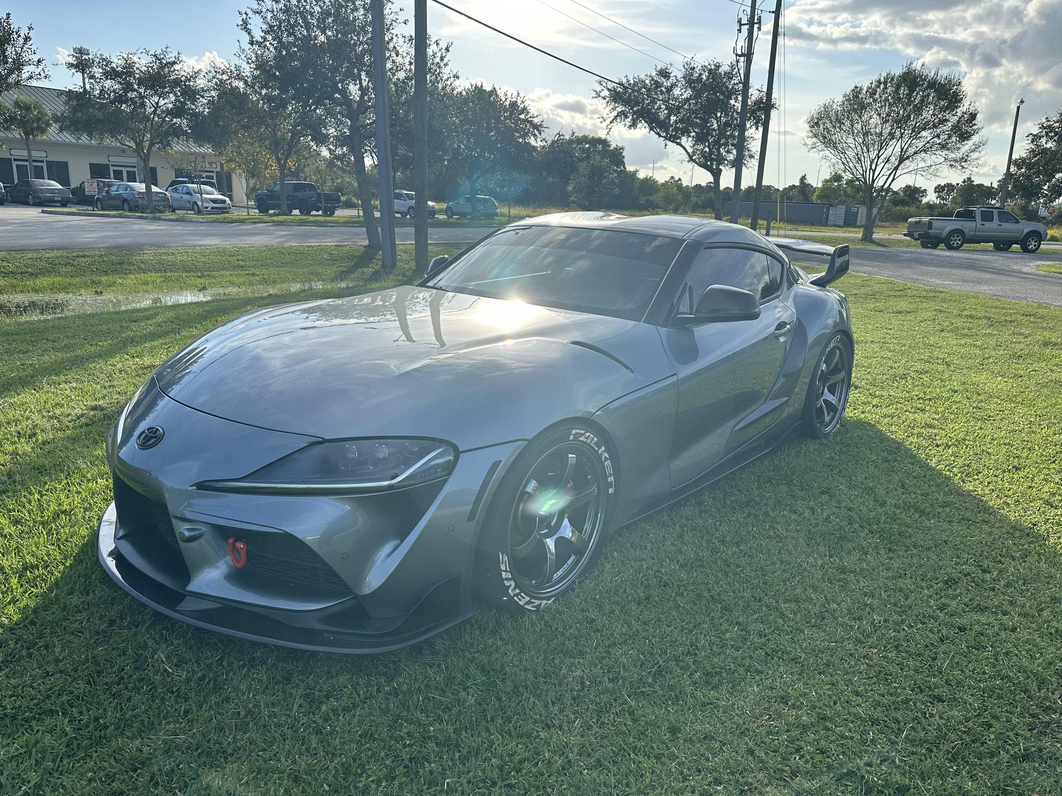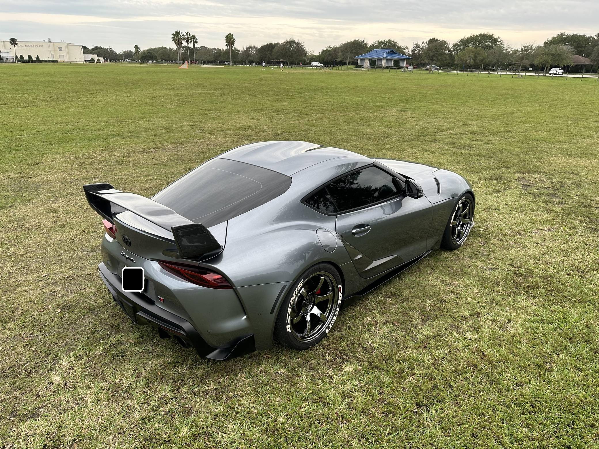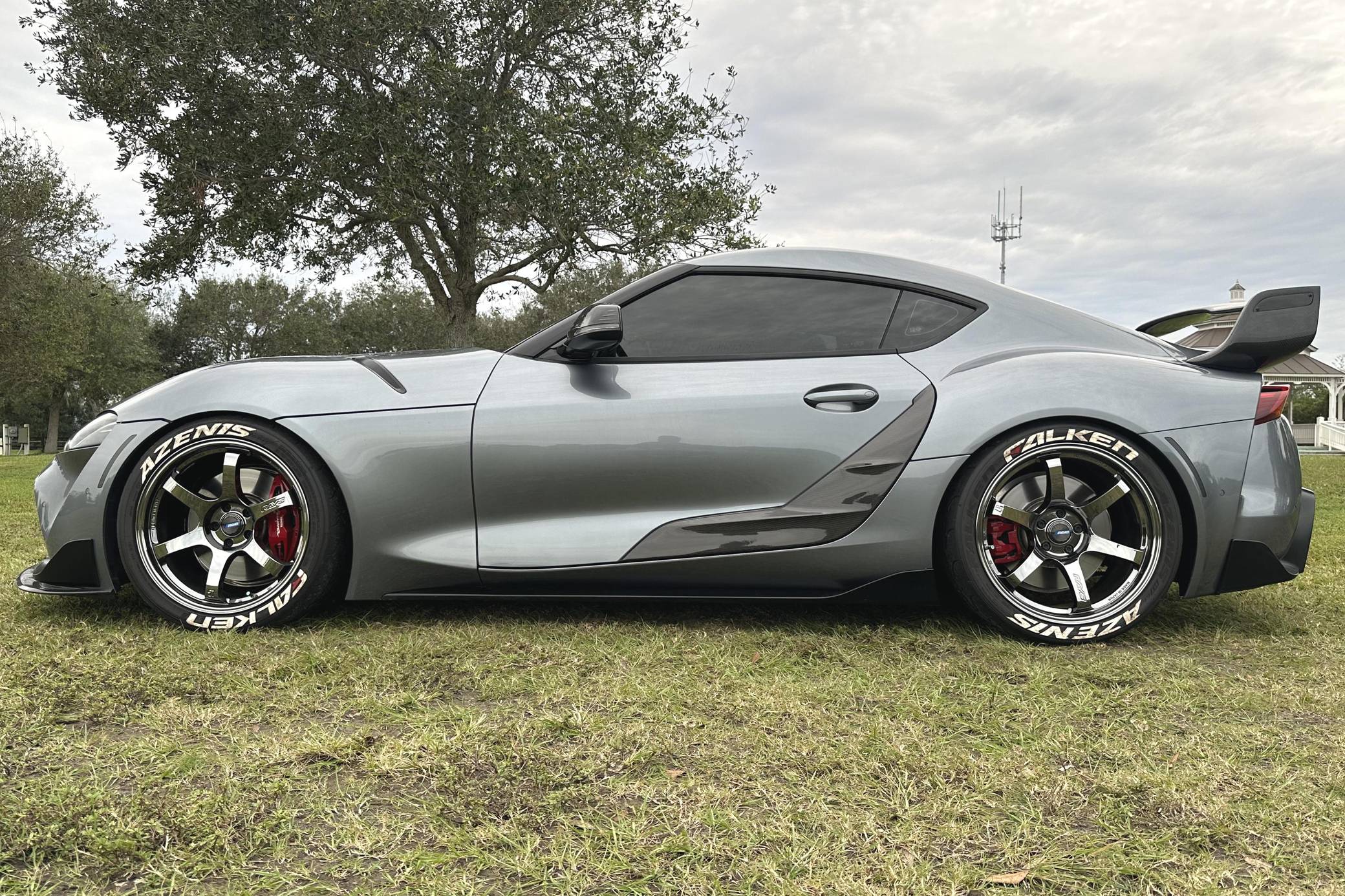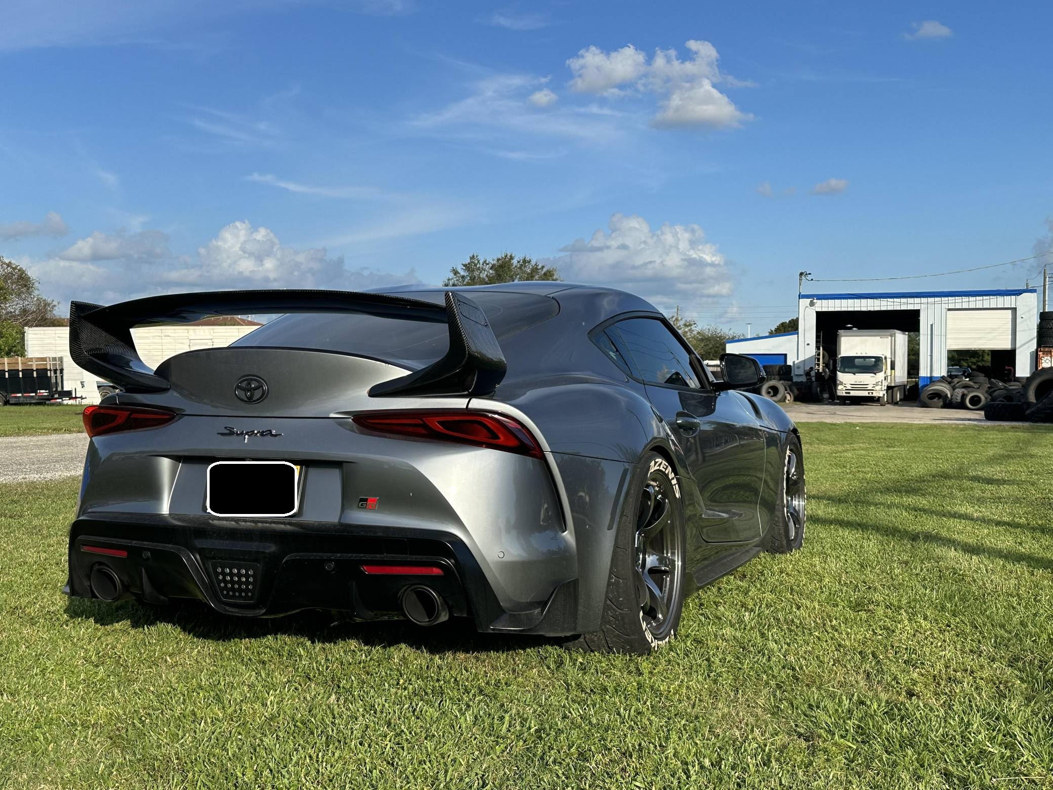 THIS… is a 2021 Toyota Supra 3. 0 Premium, finished in Turbulence Gray with a black interior. Modifications reported by the seller include RAYS Gram Lights wheels with Falken Azenis RT660 tires, HKS HIPERMAX springs, an EcuTek tune, a Pure800 turbocharger, a Titan Motorsports downpipe and methanol injection kit, a MagnaFlow catback modular exhaust, various Rexspeed carbon fiber exterior parts, and a Suvneer Motorsports rear wing. After a nearly two-decade absence, the Supra was revived as part of a major partnership with BMW. With turbocharged 4- or 6-cylinder power, the Graz, Austria-built Supra went on sale in mid-2019. Changes for 2021 included a hefty bump in power and numerous chassis tweaks. Power comes from a 3. 0-liter turbocharged inline-6, rated at 382 horsepower and 368 lb-ft of torque in stock form. Due to the modifications performed to this Supra, it likely produces more power, but a dyno sheet was not provided to confirm. Output is sent to the rear wheels via an 8-speed automatic transmission.
