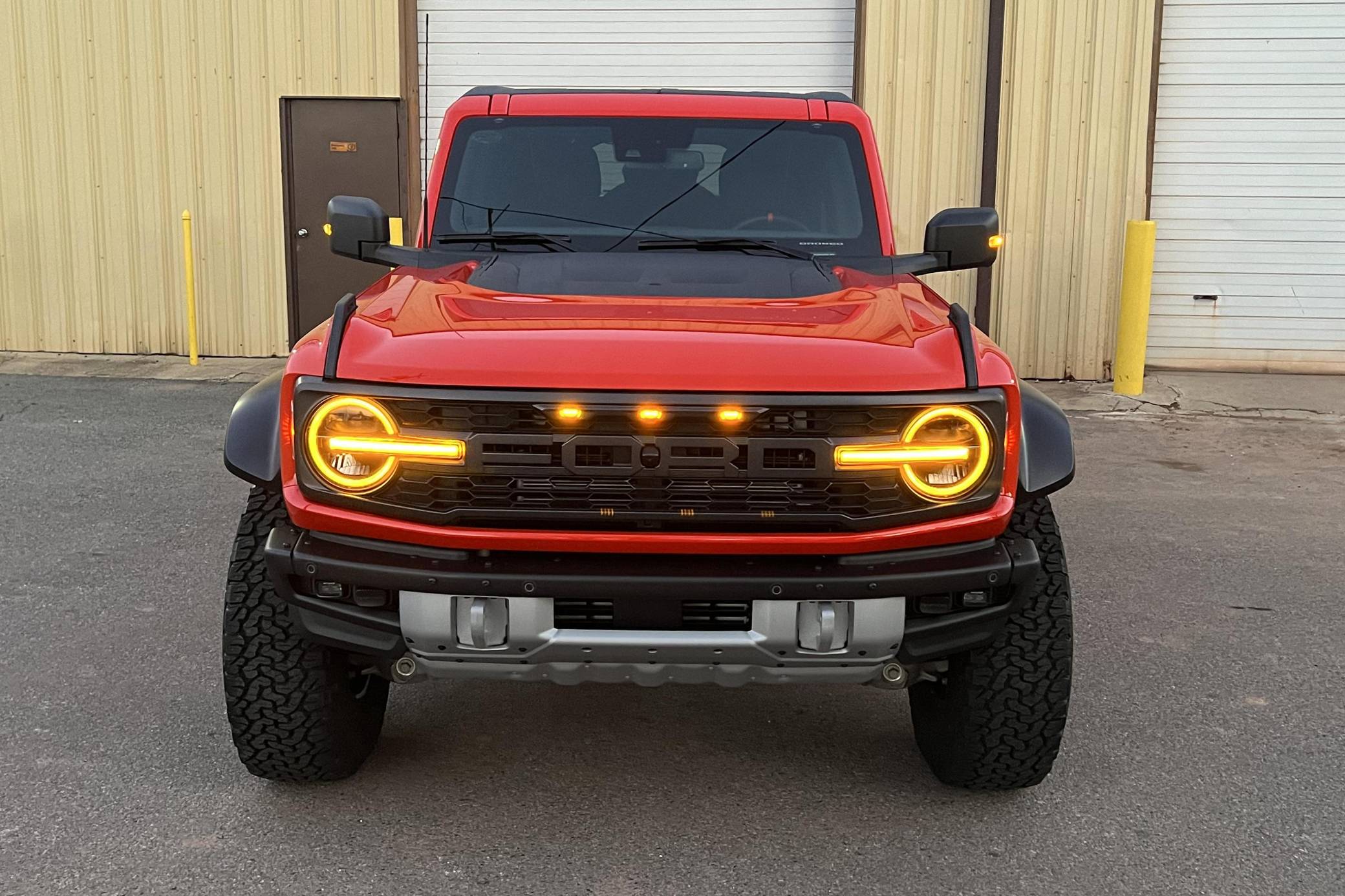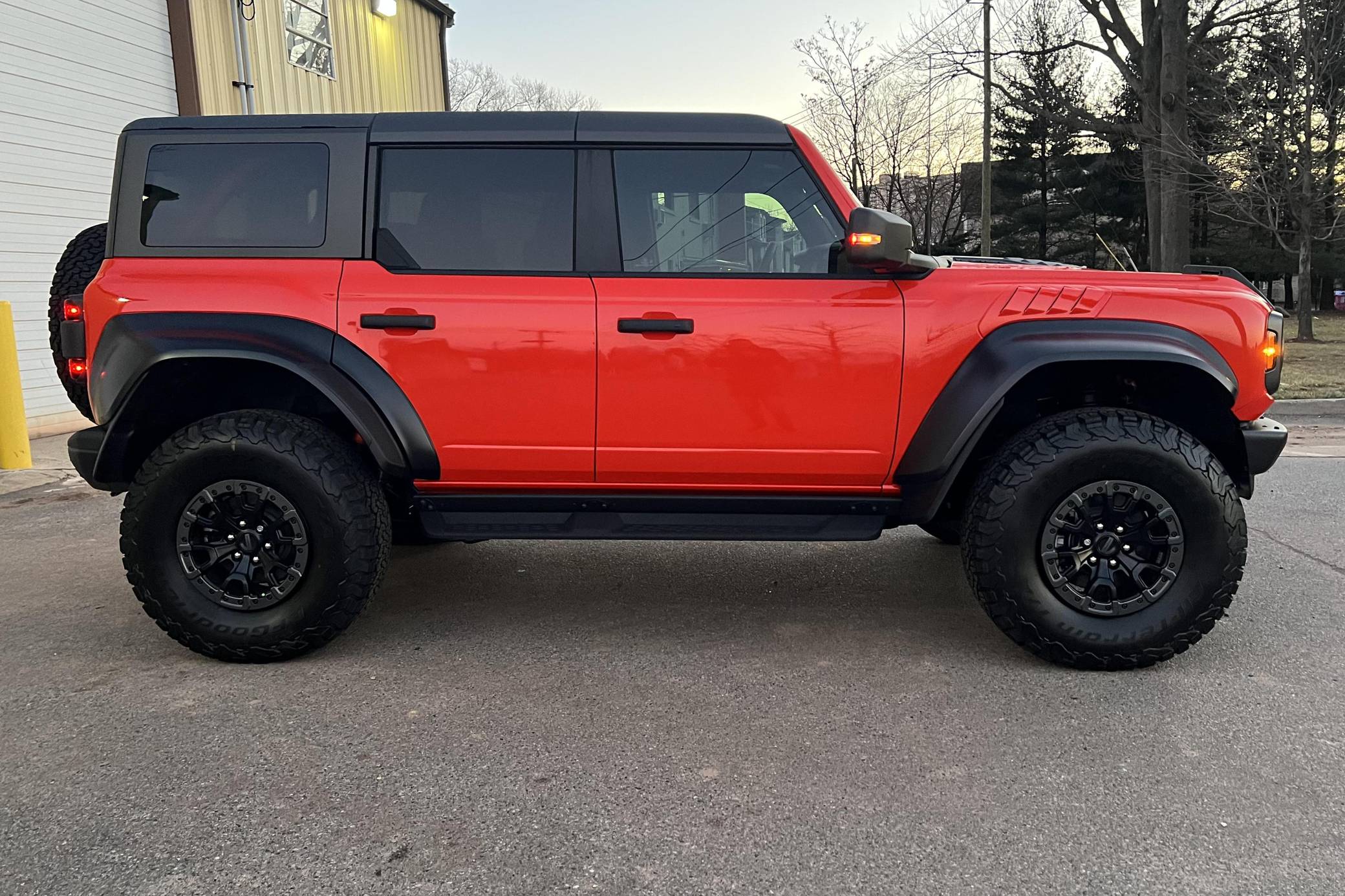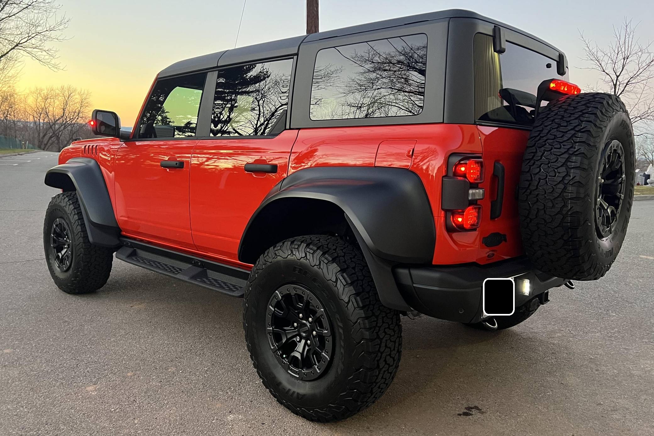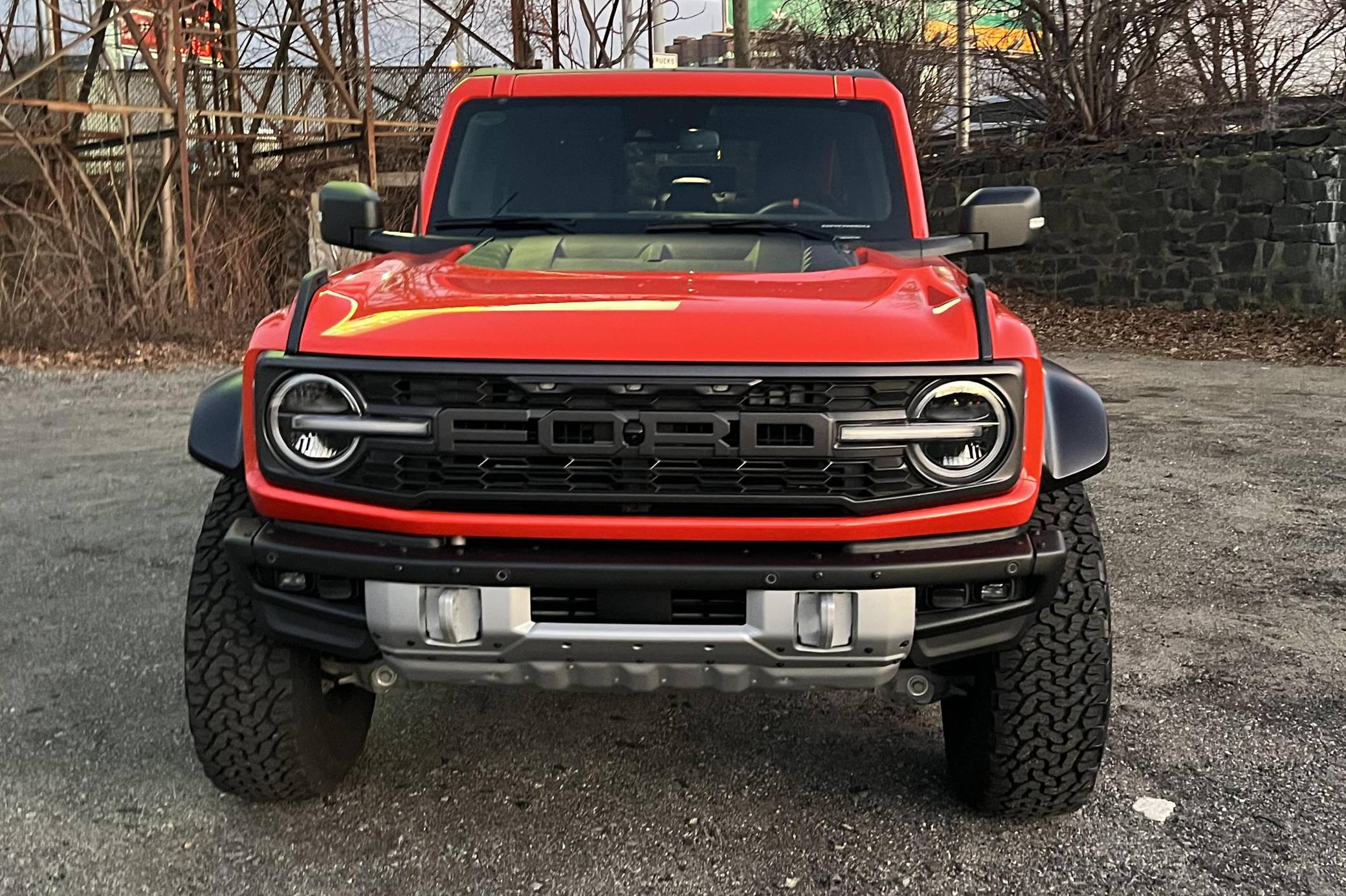 THIS. . . is a 2022 Ford Bronco Raptor, finished in Code Orange with a gray hardtop and an Onyx interior. Factory equipment includes the High and Interior Carbon Fiber packages, 17-inch forged wheels, a HOSS 4. 0 suspension system, a front sway bar disconnect system, locking front and rear differentials, Raptor-specific fender flares, rock rails with removable running boards, a removable hardtop, and Terrain Management technology with seven G. O. A. T. modes. The seller reports that modifications are limited to tinted windows. The sixth-generation Bronco was introduced for 2021, ending a 25-year hiatus and nearly a decade of speculation about its return. Retro styling, body-on-frame construction, and a suite of off-road equipment help to ensure this truck lives up to the Bronco name. It's not all old-school, however; modern features like an available 12-inch touchscreen and a wireless phone charger bring it into the 21st century. Launched for 2022, the long-awaited Raptor builds on the standard Bronco with a more powerful engine, huge tires tucked under correspondingly wide wheel arch flares, and a model-specific suspension system that includes FOX Factory Live Valve dampers. It's still available new today. Power comes from a 3. 0-liter twin-turbocharged "EcoBoost" V6, rated at 418 horsepower and 440 lb-ft of torque. It spins the four wheels via a 10-speed automatic transmission and a 2-speed transfer case.