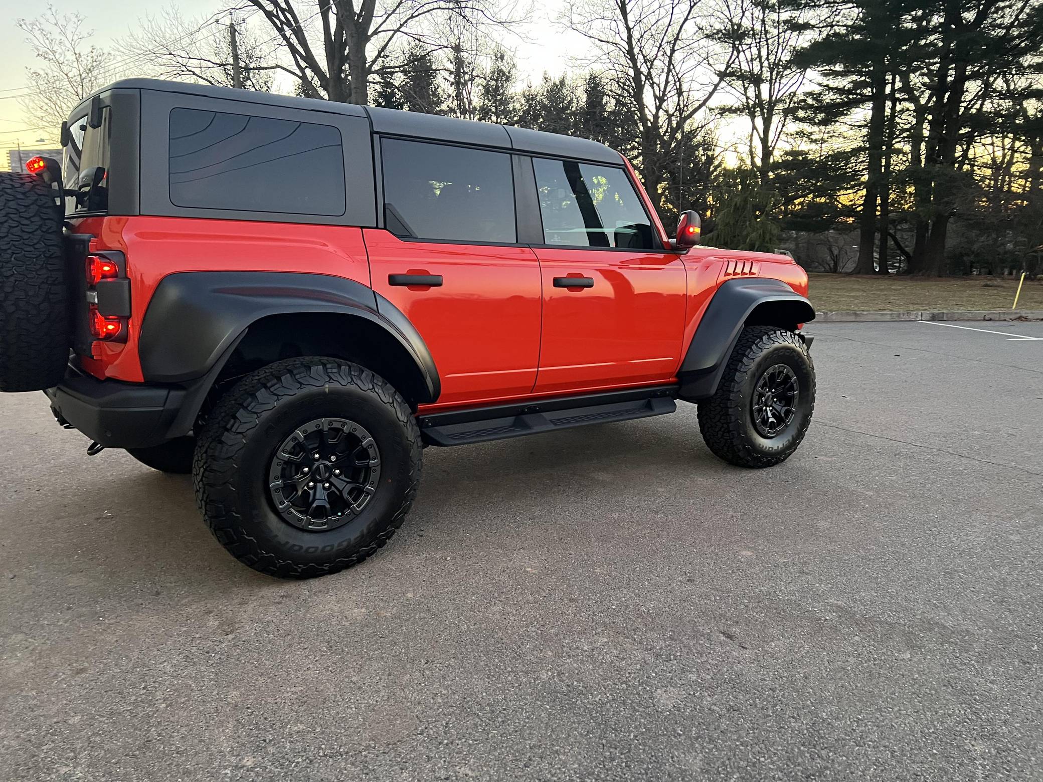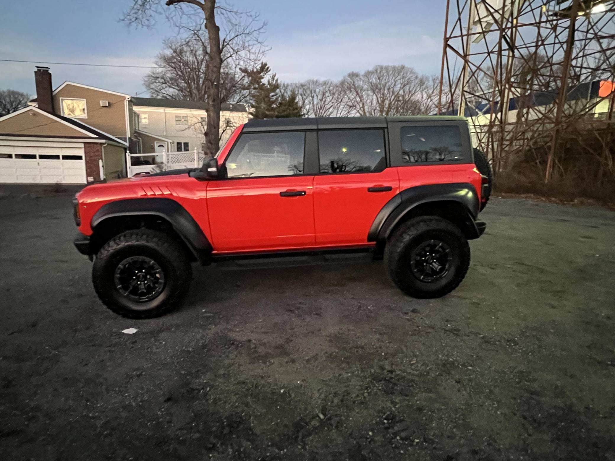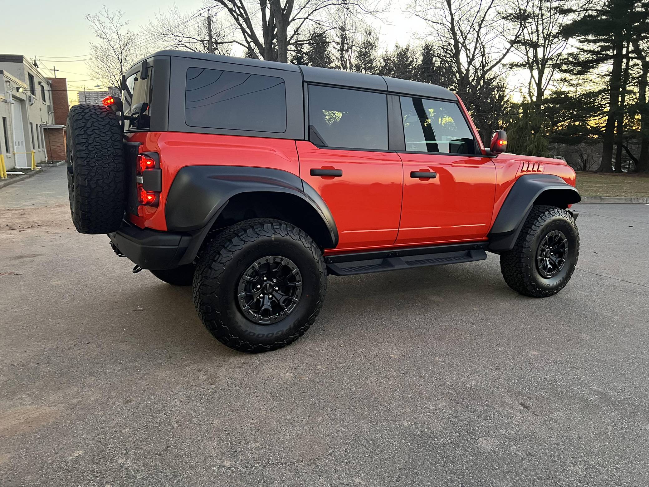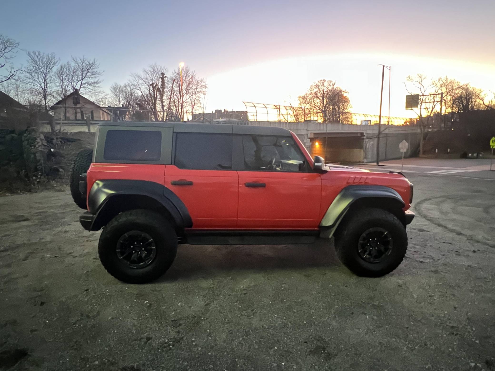THIS. . . is a 2022 Ford Bronco Raptor, finished in Code Orange with a gray hardtop and an Onyx interior. Factory equipment includes the High and Interior Carbon Fiber packages, 17-inch forged wheels, a HOSS 4. 0 suspension system, a front sway bar disconnect system, locking front and rear differentials, Raptor-specific fender flares, rock rails with removable running boards, a removable hardtop, and Terrain Management technology with seven G. O. A. T. modes. The seller reports that modifications are limited to tinted windows. The sixth-generation Bronco was introduced for 2021, ending a 25-year hiatus and nearly a decade of speculation about its return. Retro styling, body-on-frame construction, and a suite of off-road equipment help to ensure this truck lives up to the Bronco name. It's not all old-school, however; modern features like an available 12-inch touchscreen and a wireless phone charger bring it into the 21st century. Launched for 2022, the long-awaited Raptor builds on the standard Bronco with a more powerful engine, huge tires tucked under correspondingly wide wheel arch flares, and a model-specific suspension system that includes FOX Factory Live Valve dampers. It's still available new today. Power comes from a 3. 0-liter twin-turbocharged "EcoBoost" V6, rated at 418 horsepower and 440 lb-ft of torque. It spins the four wheels via a 10-speed automatic transmission and a 2-speed transfer case.