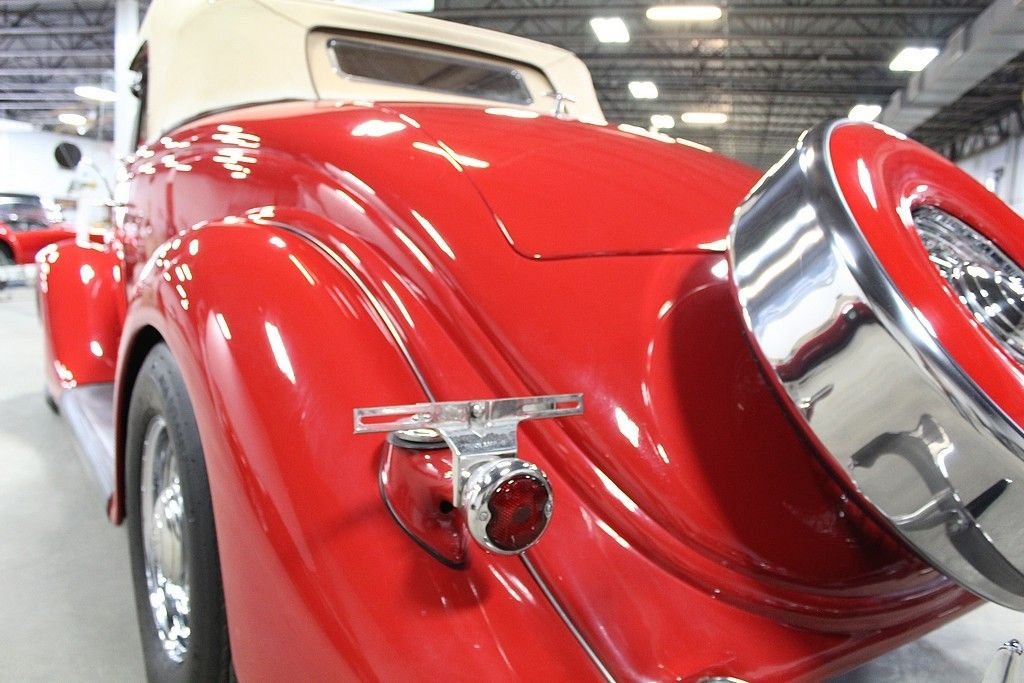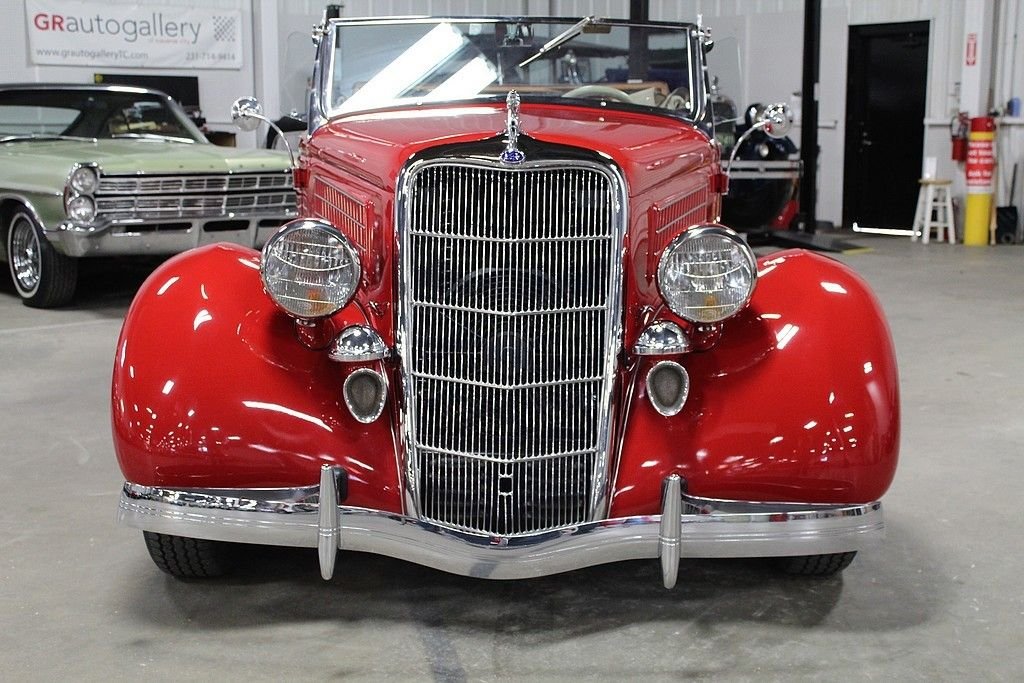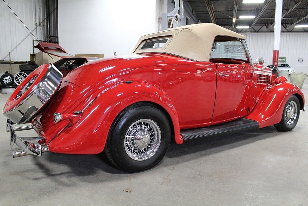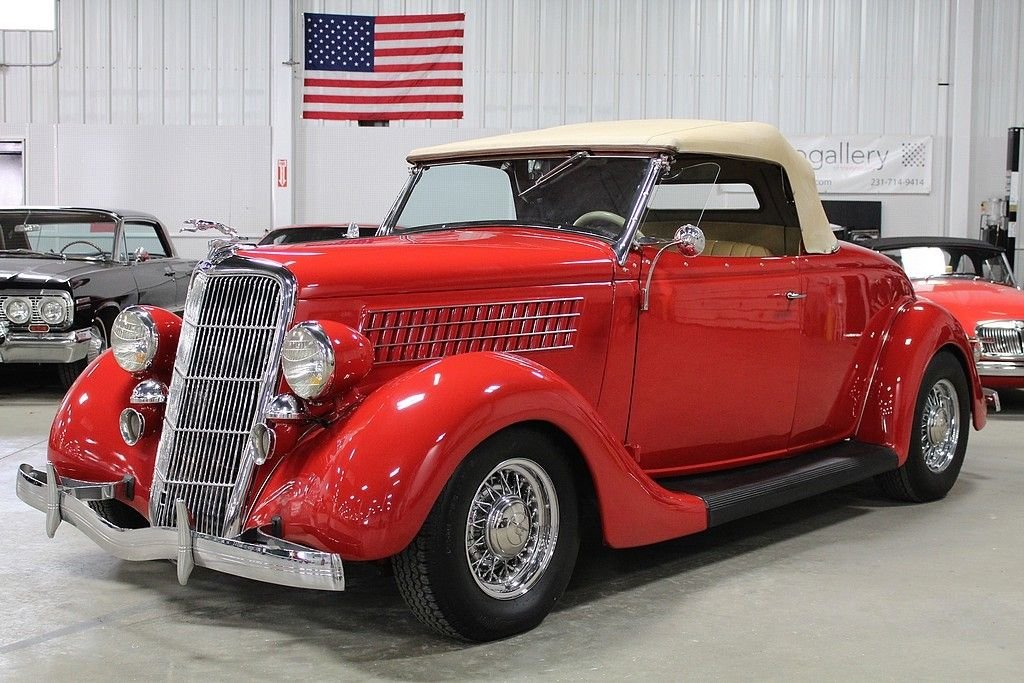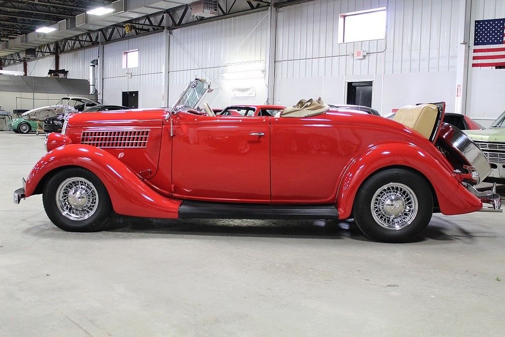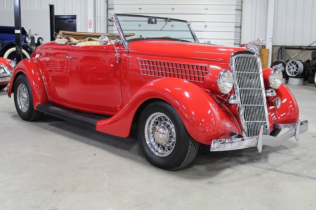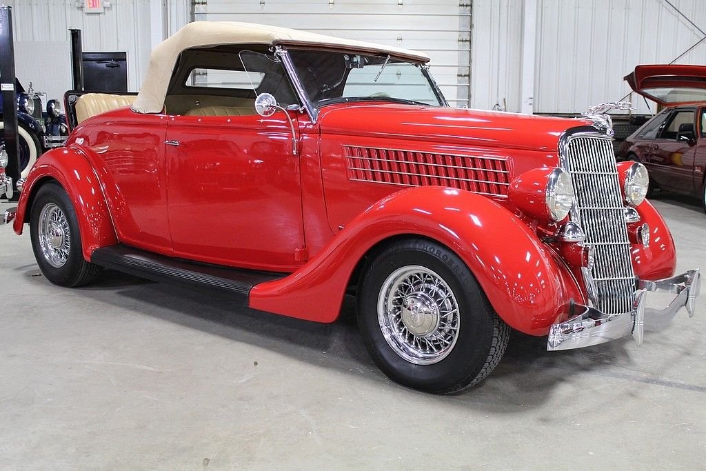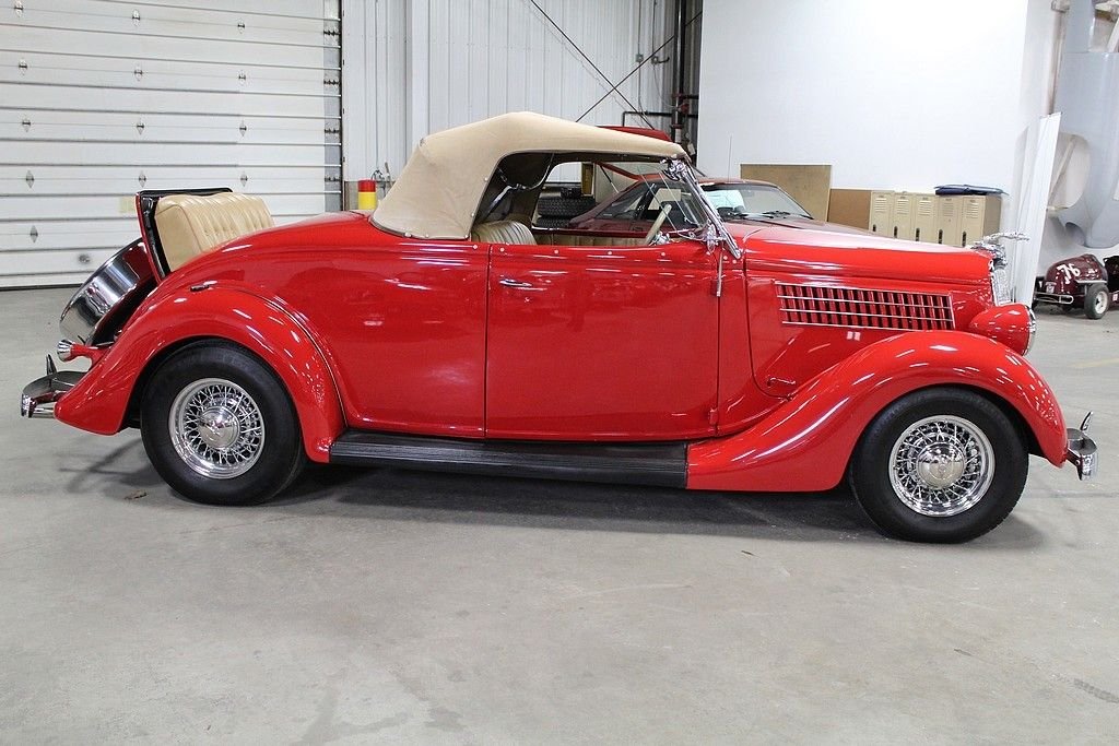 A completely refreshed Ford came in 1935 with the 4-cylinder no longer being offered, leaving just the 221 Cubic Inch V8 to power every Ford car and truck. The body was lowered and new comfort seating was designed. It was a much more modern car with a pushed forward grille and integrating fenders into the body. Another major design advance was integrating the trunk into the body. This spectacular Ford we are offering here today comes with its original Steel body and original “X” Frame. Fenders and firewall were replaced with fiberglass. The restoration was done several years ago that shows extremely well. The engine has been replaced using a modern GM power plant and turbo 350 transmission. It is equipped with front disc brakes and working heat/air condition. In addition to the drivetrain it has a LeCarra Wheel, GM Tilt, cruise, classic gauges, AM/FM Cassette radio and topping off the look with McLean wire wheels. It also comes matching side-curtains.