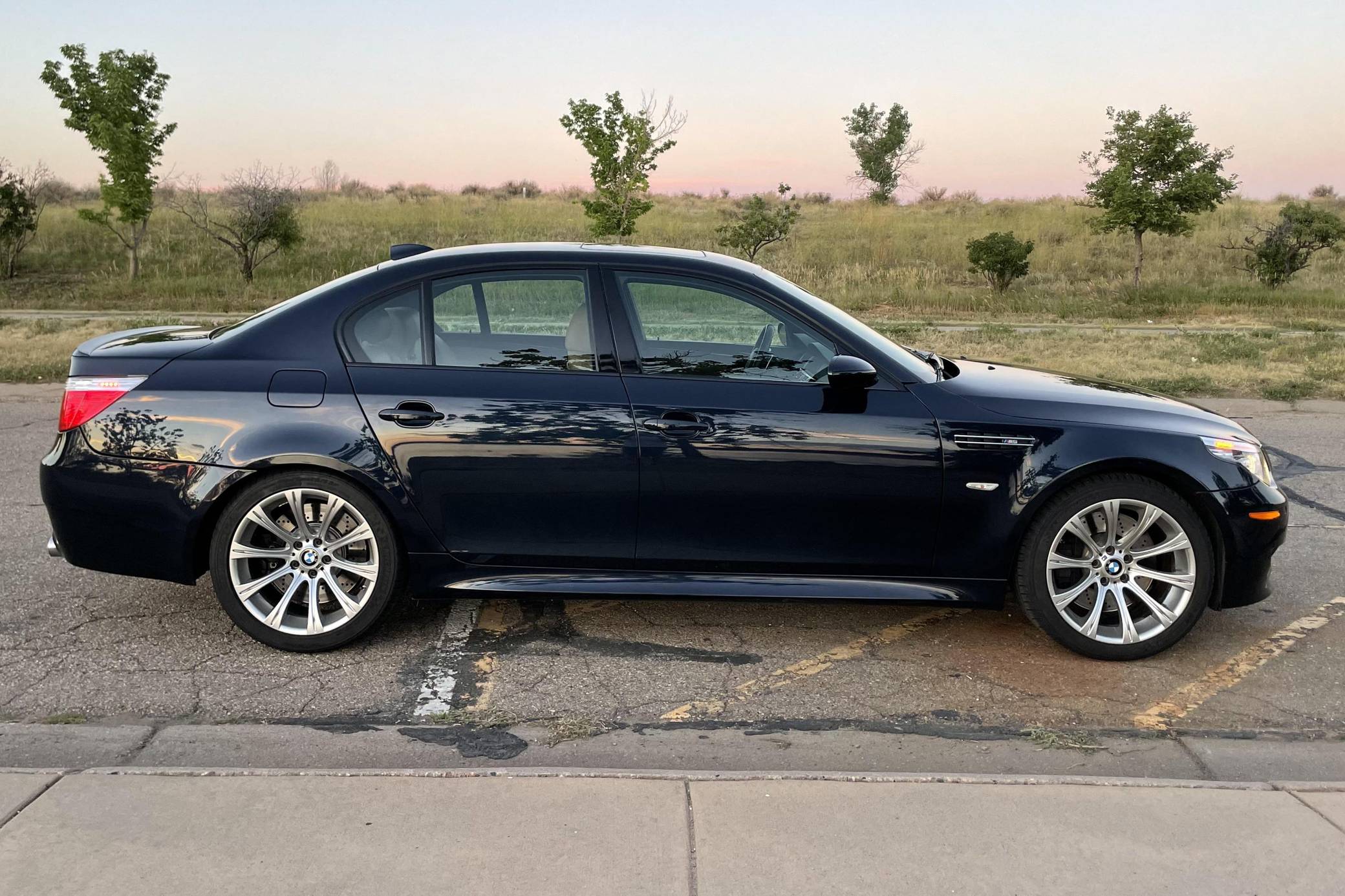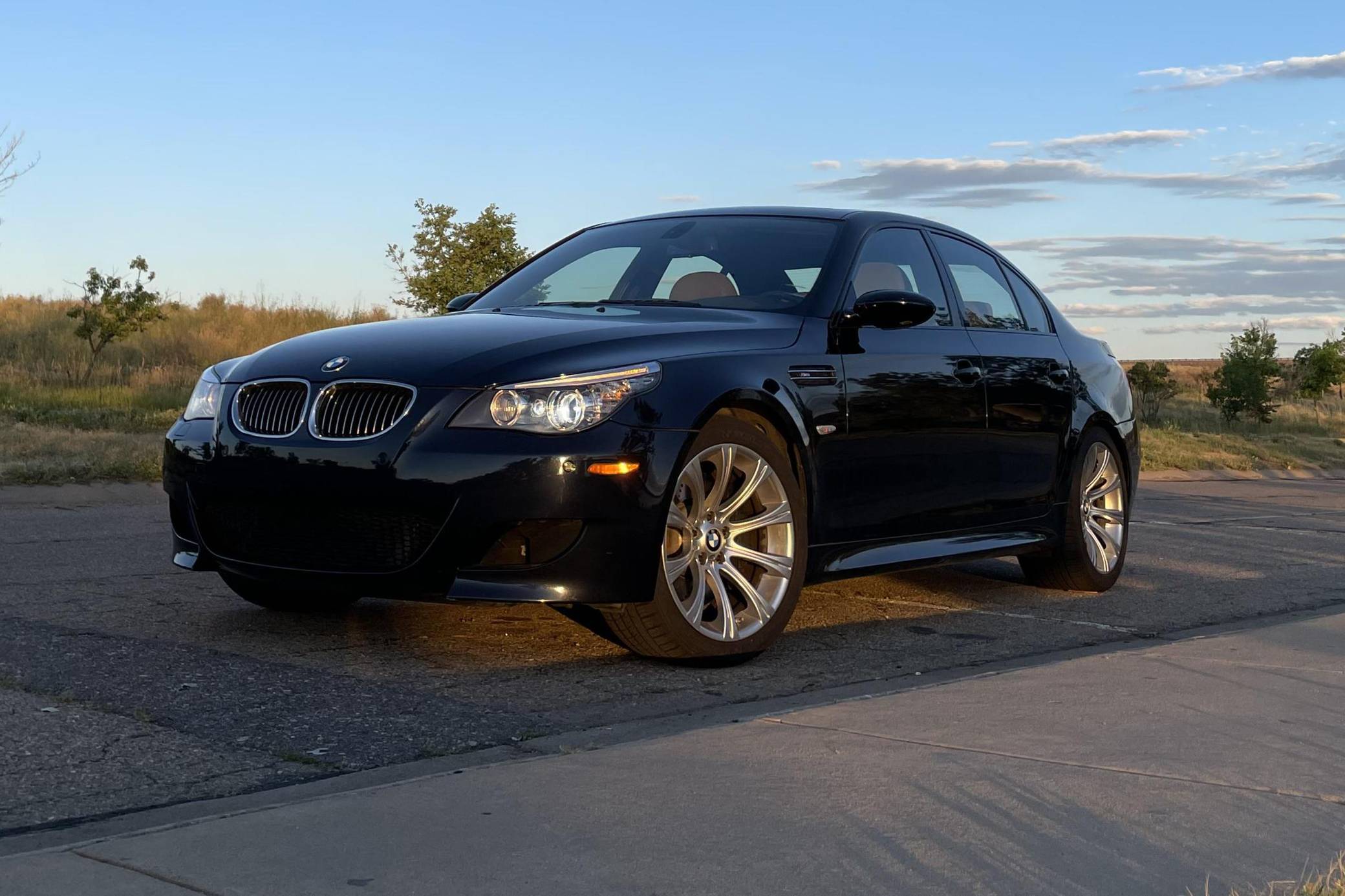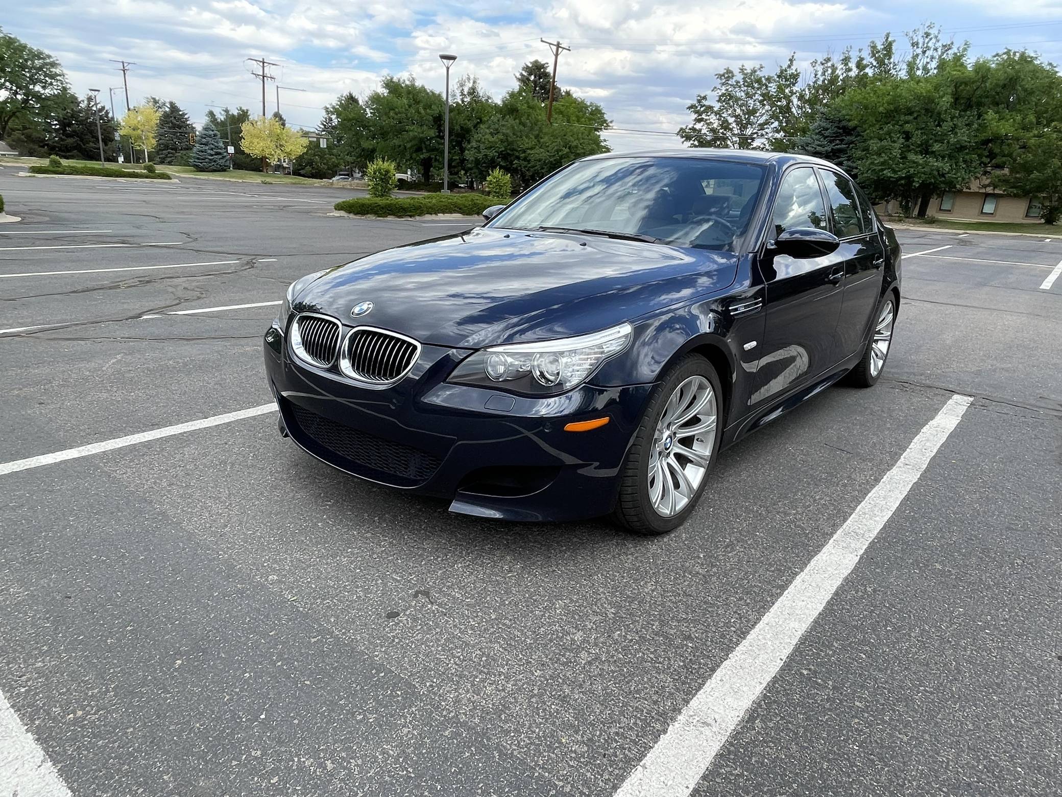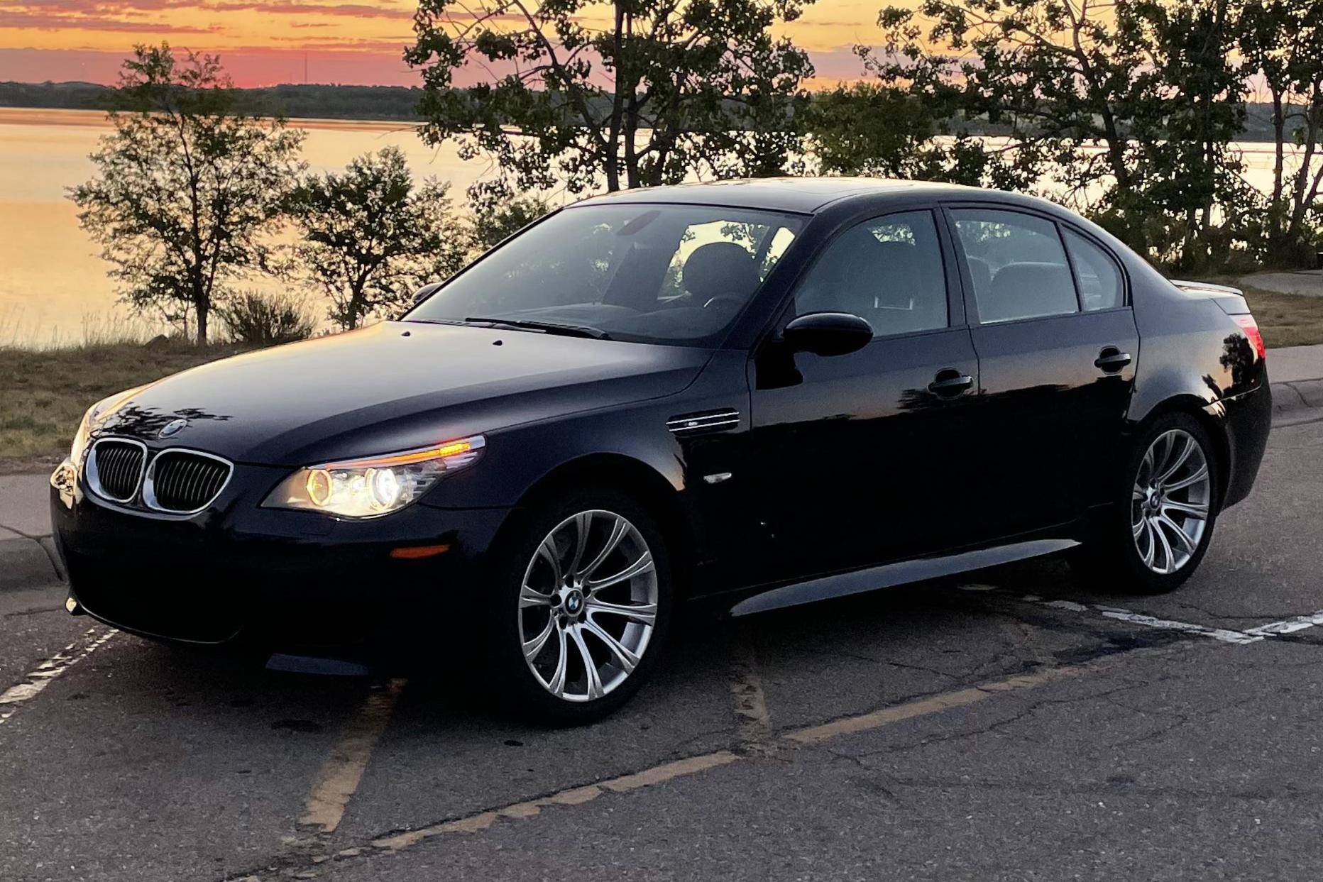 2008 BMW M5, finished in Monaco Blue Metallic with a Portland Brown interior. The odometer on this M5 currently displays approximately 35,400 miles. Factory equipment includes 19-inch Style 166M wheels, a power sunroof, Merino leather upholstery, power-adjustable and heated front seats, Madeira Walnut wood trim, Park Distance Control (PDC), and a head-up display. The seller reports no modifications. The "E60"-generation BMW M5 made its debut for the 2006 model year. On top of a muscular naturally-aspirated V10 engine, the differences that set it apart from the standard 5 Series included flared fenders with cooling vents, quad exhaust tips, and a wider track. It was the final M5 to be naturally aspirated, the only one fitted with a 10-cylinder engine, and it remains a favorite among enthusiasts. Power comes from an "S85" 5. 0-liter V10, rated at 500 horsepower and 383 lb-ft of torque. Output is sent to the rear wheels via a 7-speed SMG-III automatic transmission.