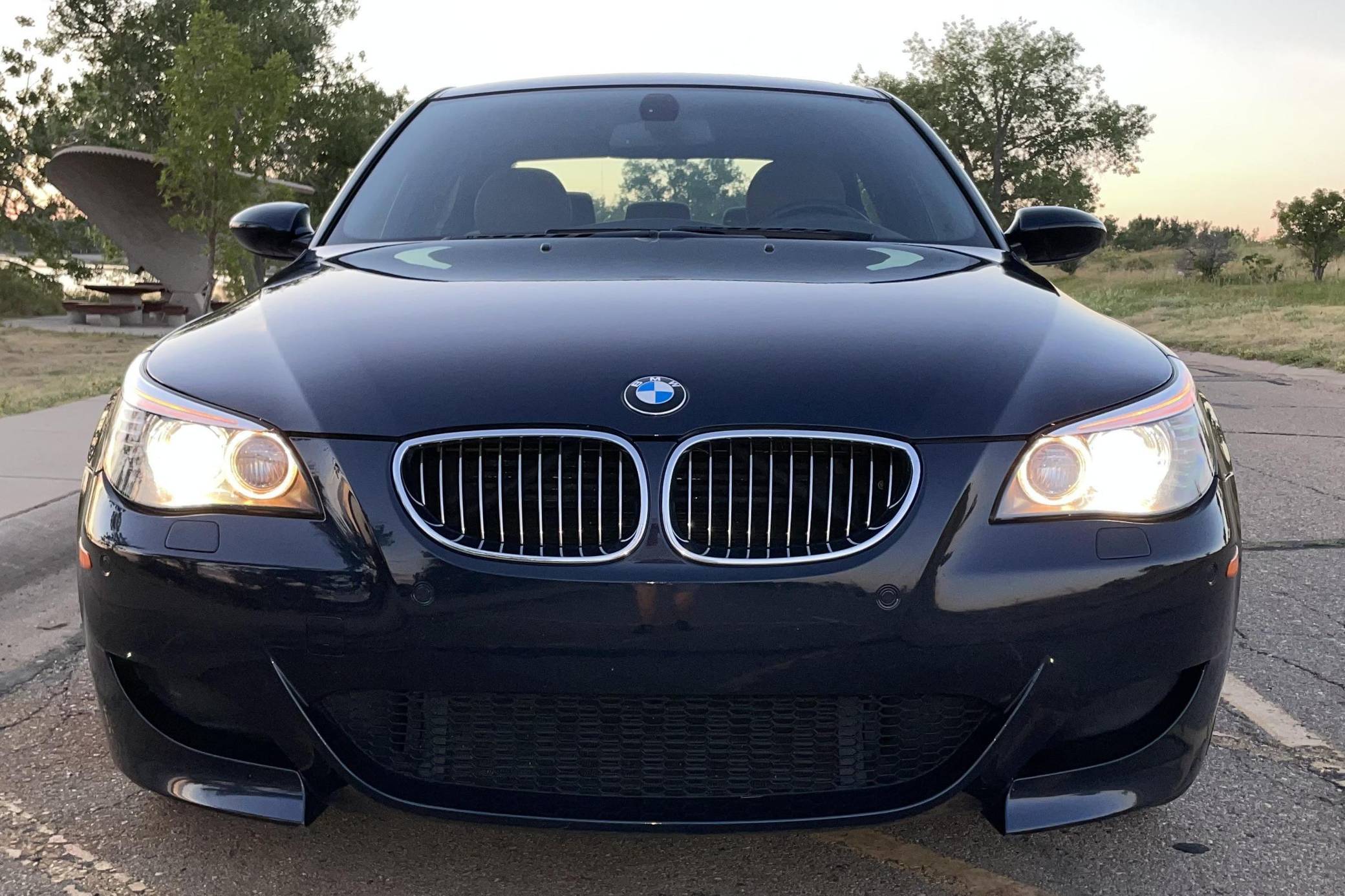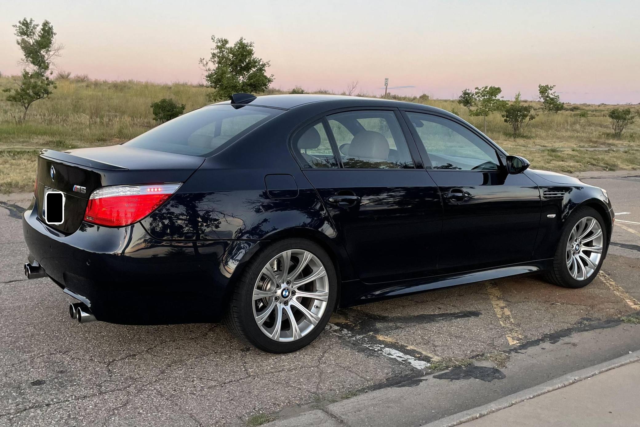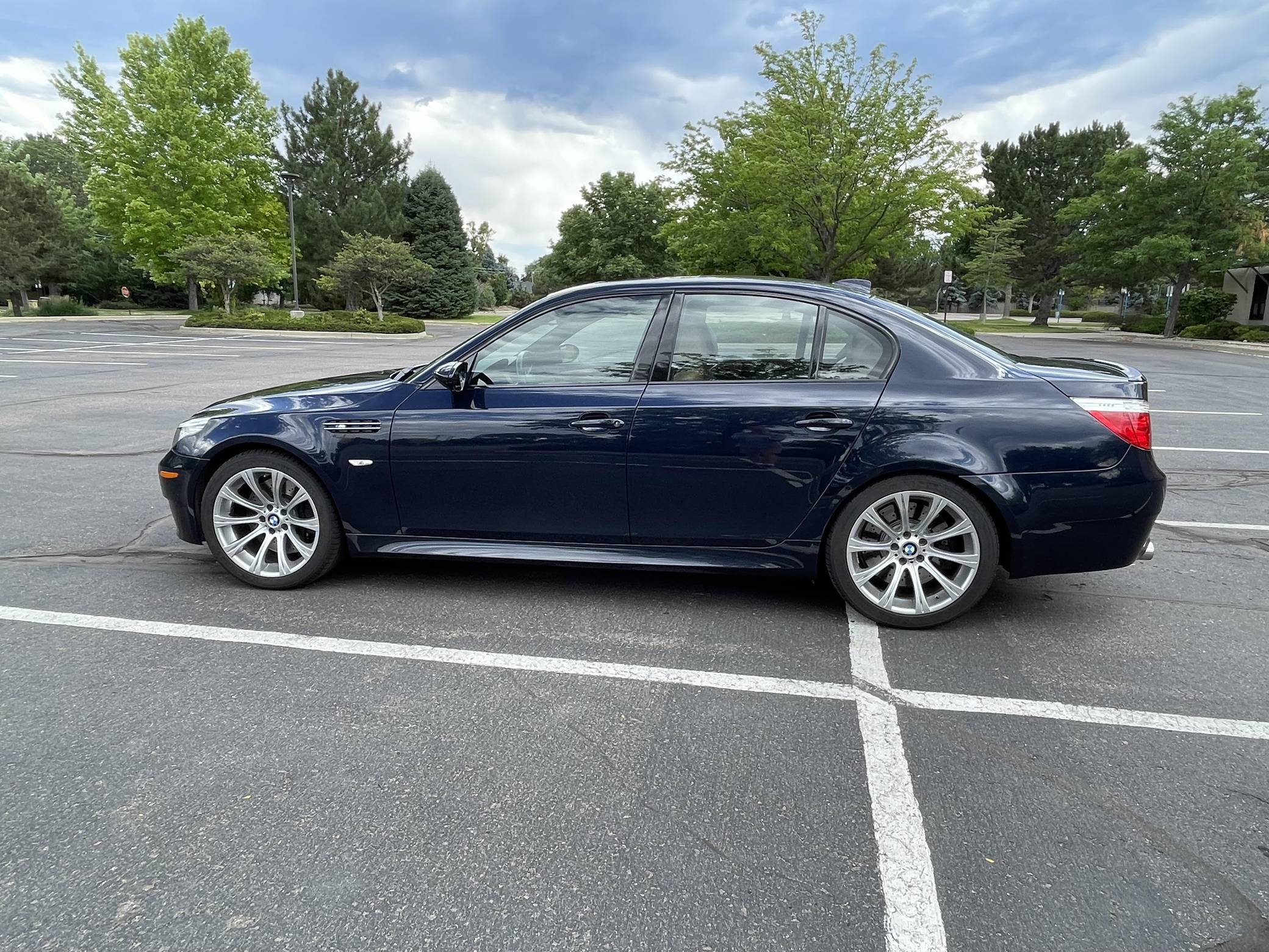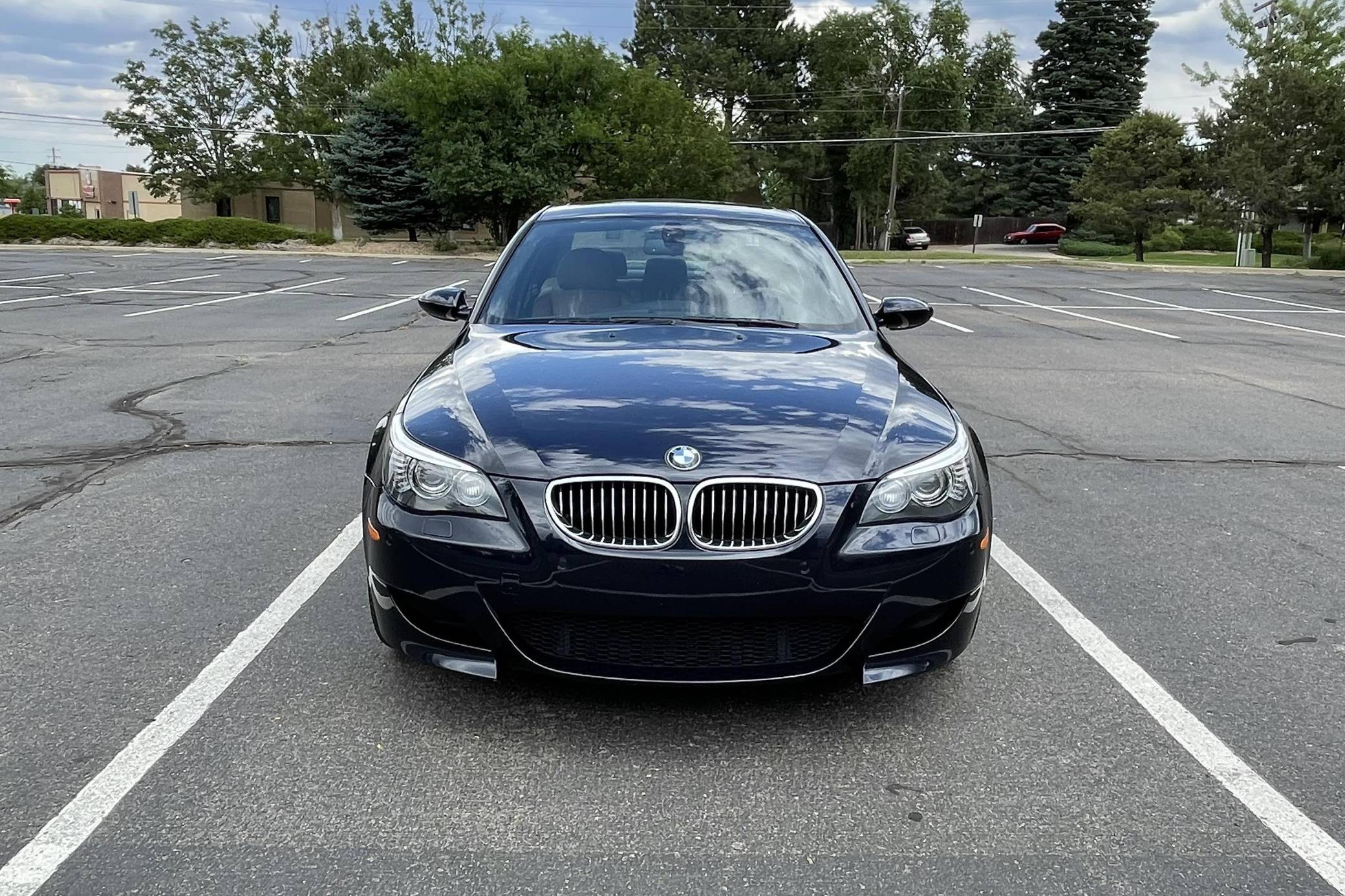 2008 BMW M5, finished in Monaco Blue Metallic with a Portland Brown interior. The odometer on this M5 currently displays approximately 35,400 miles. Factory equipment includes 19-inch Style 166M wheels, a power sunroof, Merino leather upholstery, power-adjustable and heated front seats, Madeira Walnut wood trim, Park Distance Control (PDC), and a head-up display. The seller reports no modifications. The "E60"-generation BMW M5 made its debut for the 2006 model year. On top of a muscular naturally-aspirated V10 engine, the differences that set it apart from the standard 5 Series included flared fenders with cooling vents, quad exhaust tips, and a wider track. It was the final M5 to be naturally aspirated, the only one fitted with a 10-cylinder engine, and it remains a favorite among enthusiasts. Power comes from an "S85" 5. 0-liter V10, rated at 500 horsepower and 383 lb-ft of torque. Output is sent to the rear wheels via a 7-speed SMG-III automatic transmission.