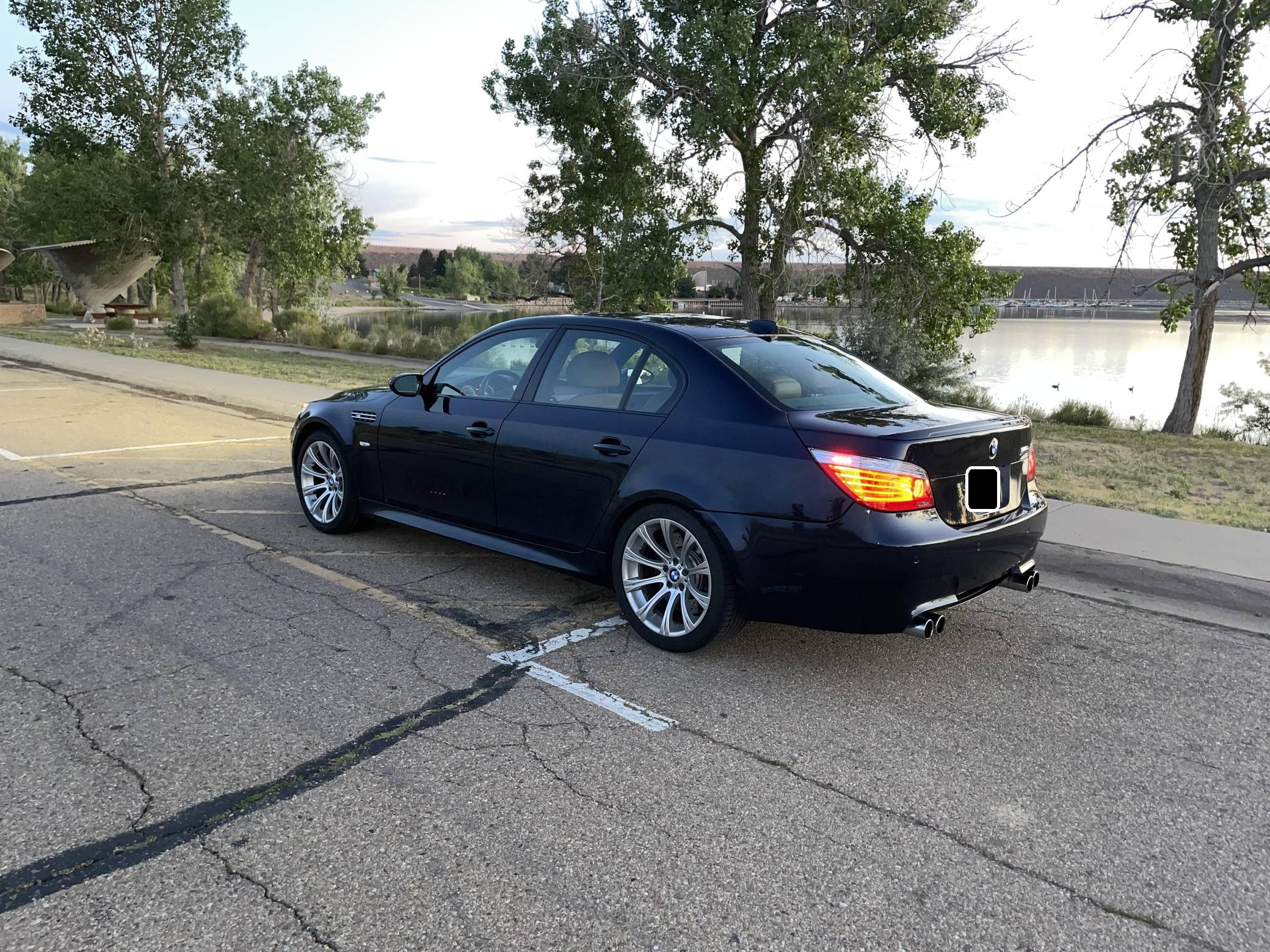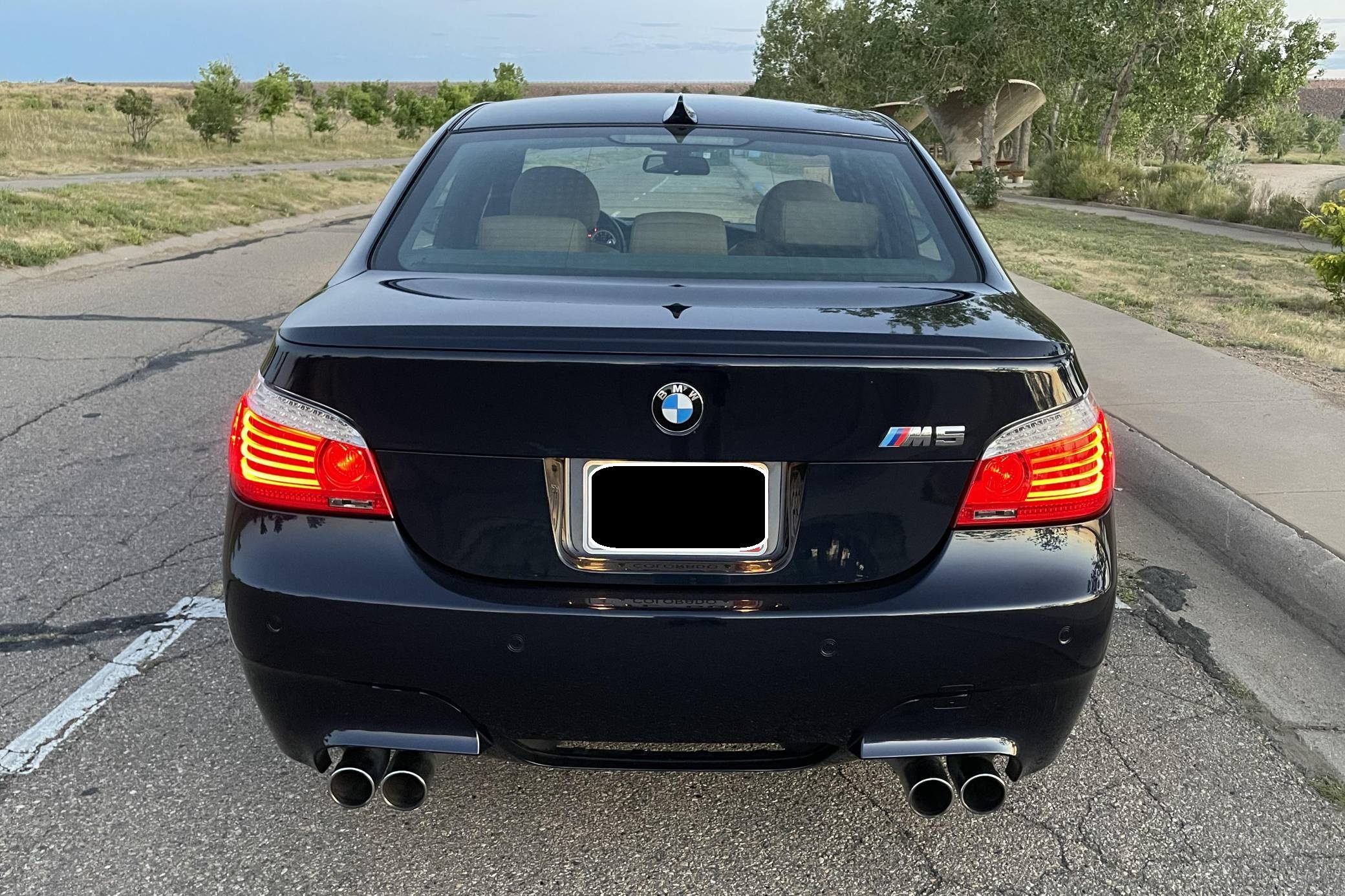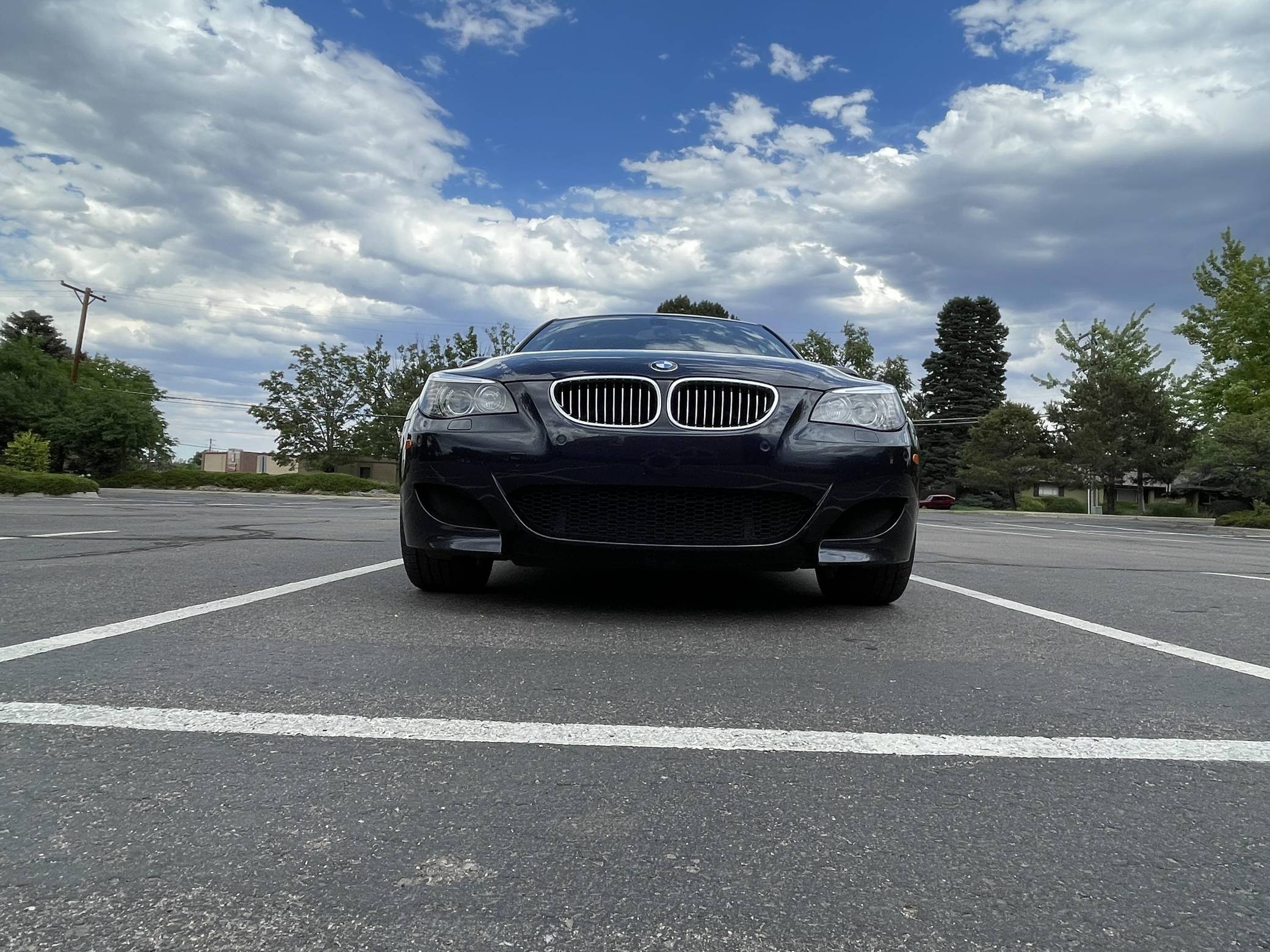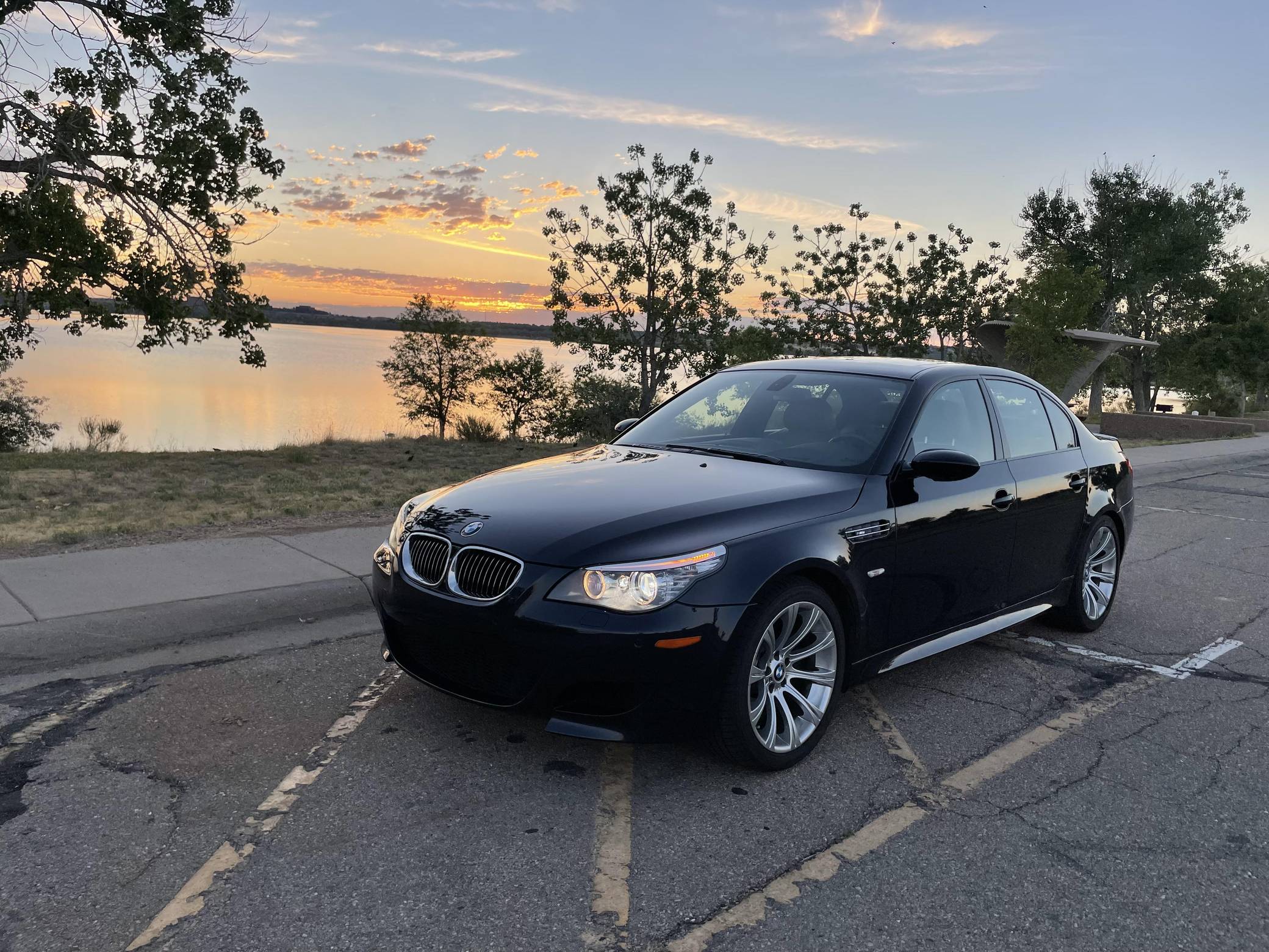 2008 BMW M5, finished in Monaco Blue Metallic with a Portland Brown interior. The odometer on this M5 currently displays approximately 35,400 miles. Factory equipment includes 19-inch Style 166M wheels, a power sunroof, Merino leather upholstery, power-adjustable and heated front seats, Madeira Walnut wood trim, Park Distance Control (PDC), and a head-up display. The seller reports no modifications. The "E60"-generation BMW M5 made its debut for the 2006 model year. On top of a muscular naturally-aspirated V10 engine, the differences that set it apart from the standard 5 Series included flared fenders with cooling vents, quad exhaust tips, and a wider track. It was the final M5 to be naturally aspirated, the only one fitted with a 10-cylinder engine, and it remains a favorite among enthusiasts. Power comes from an "S85" 5. 0-liter V10, rated at 500 horsepower and 383 lb-ft of torque. Output is sent to the rear wheels via a 7-speed SMG-III automatic transmission.