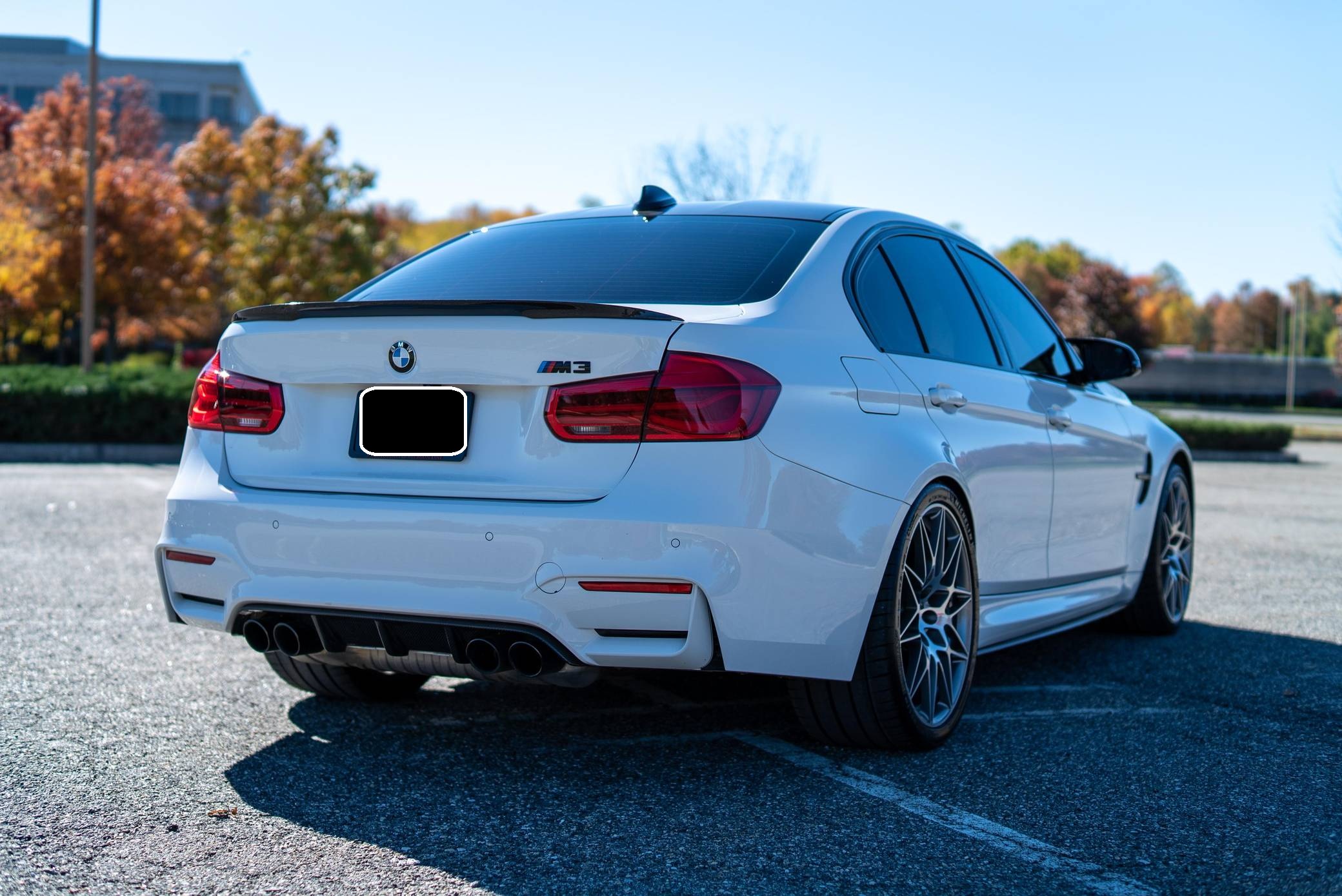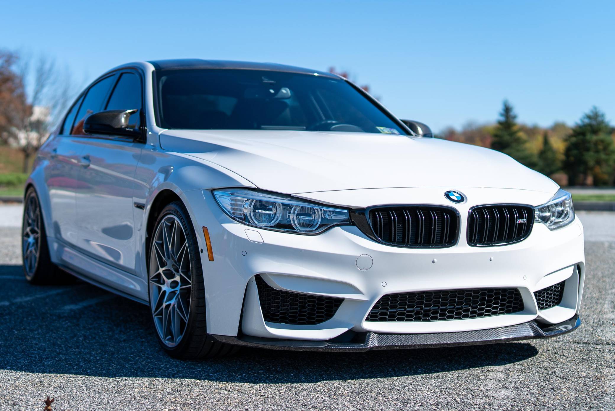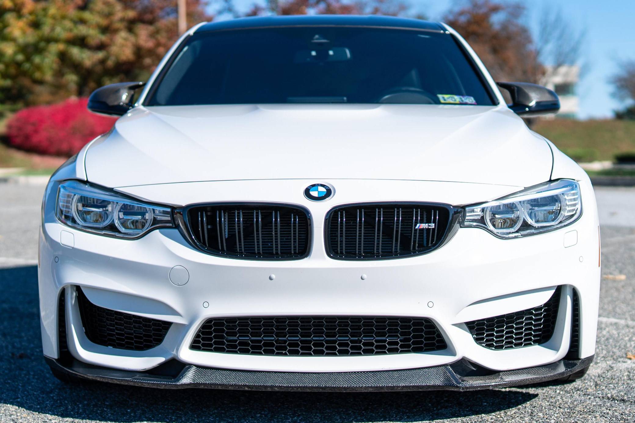 THIS… is a 2017 BMW M3, finished in Alpine White with a black interior. According to the build sheet provided in the gallery, factory equipment includes the Competition, Executive, Driver Assistance Plus, and Lighting packages, a carbon fiber roof panel, Merino leather upholstery, heated front and rear seats, a head-up display, Comfort Acess keyless entry, and a Harman/Kardon surround sound system. Modifications reported by the seller include paint protection film, tinted windows, a carbon fiber front splitter, side mirror caps, side skirt extensions, rear decklid spoiler, and rear diffuser. BMW's fifth-generation M3 went on sale for the 2015 model year. Based on the "F30" 3 Series, and called "F80" internally, it swapped its predecessor's V8 for a turbocharged straight-6 and picked up more horsepower and a lot more torque along the way. It wore a muscular-looking exterior design, and M added a carbon fiber roof panel to keep weight in check. Production ended in 2018. Power comes from an "S55" 3. 0-liter twin-turbocharged inline-6 engine, rated at 444 horsepower and 406 lb-ft of torque. Output is sent to the rear wheels via a 7-speed dual-clutch automatic transmission.