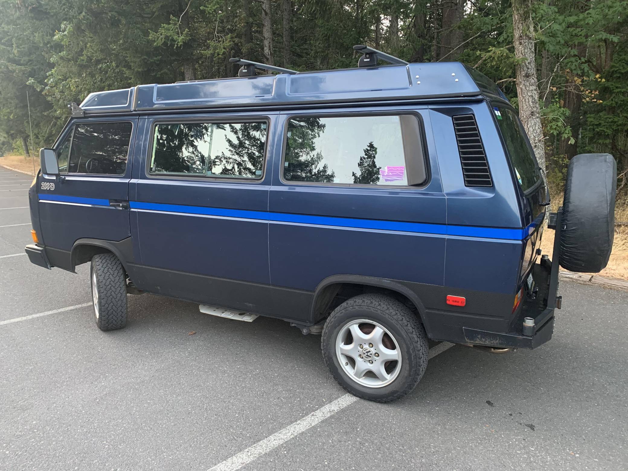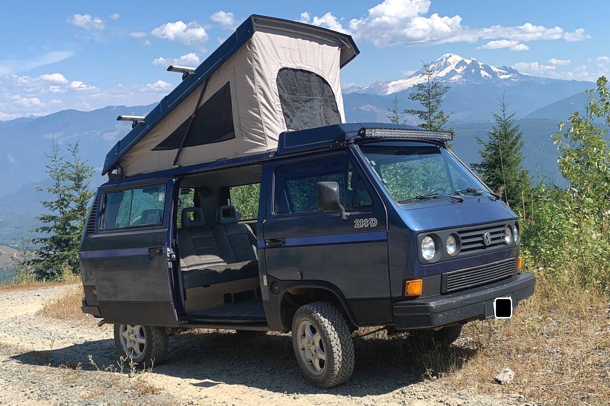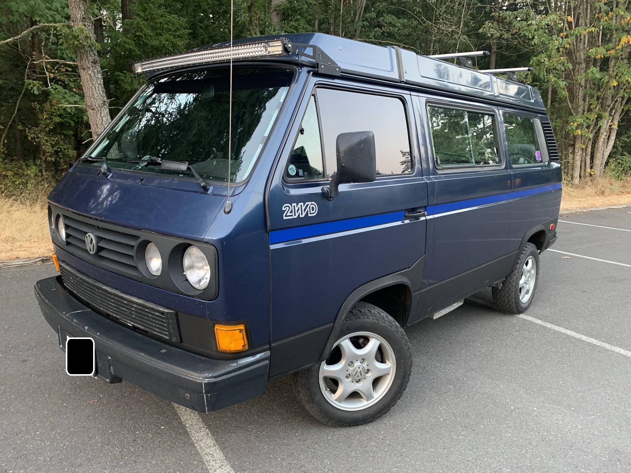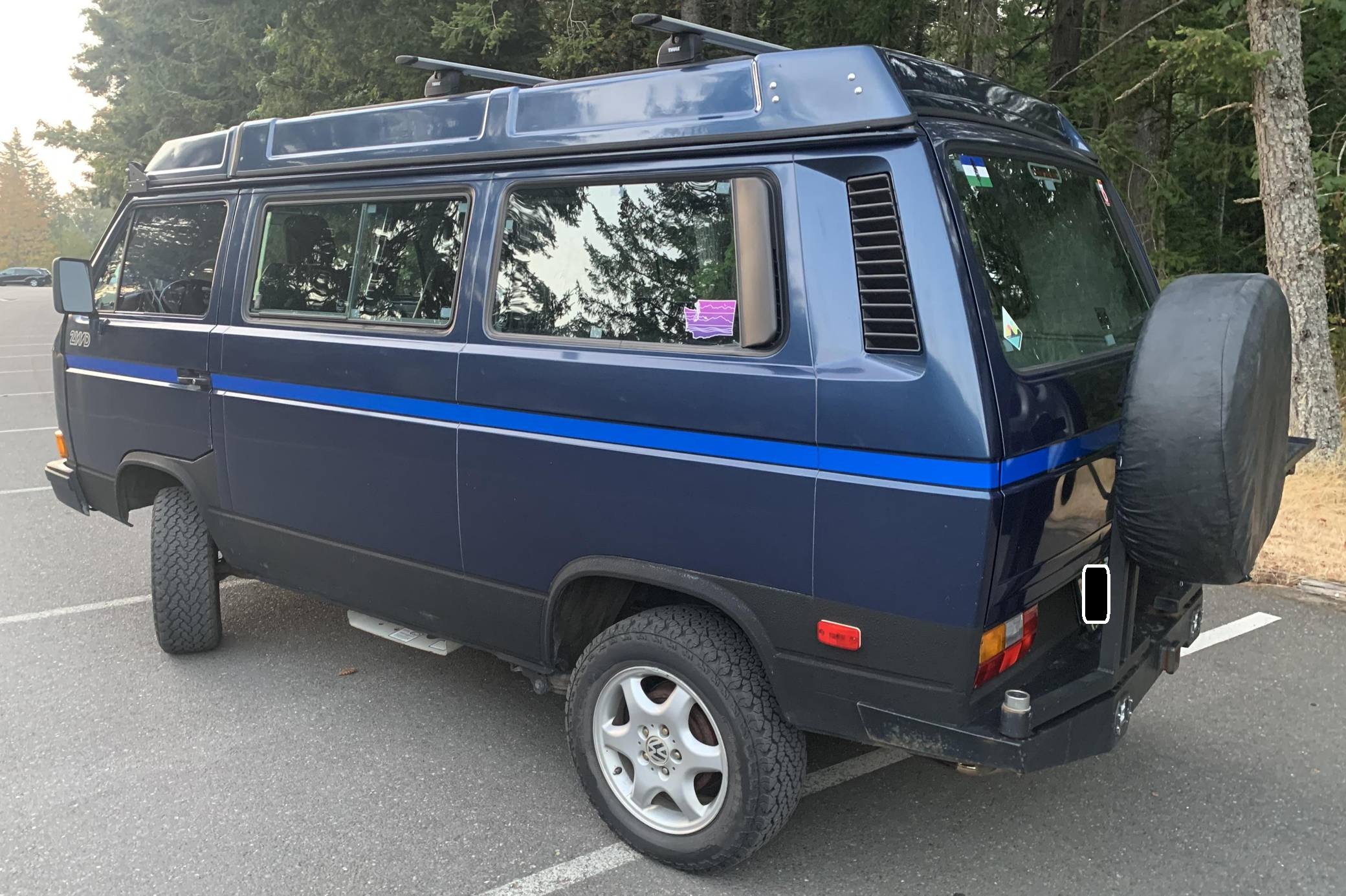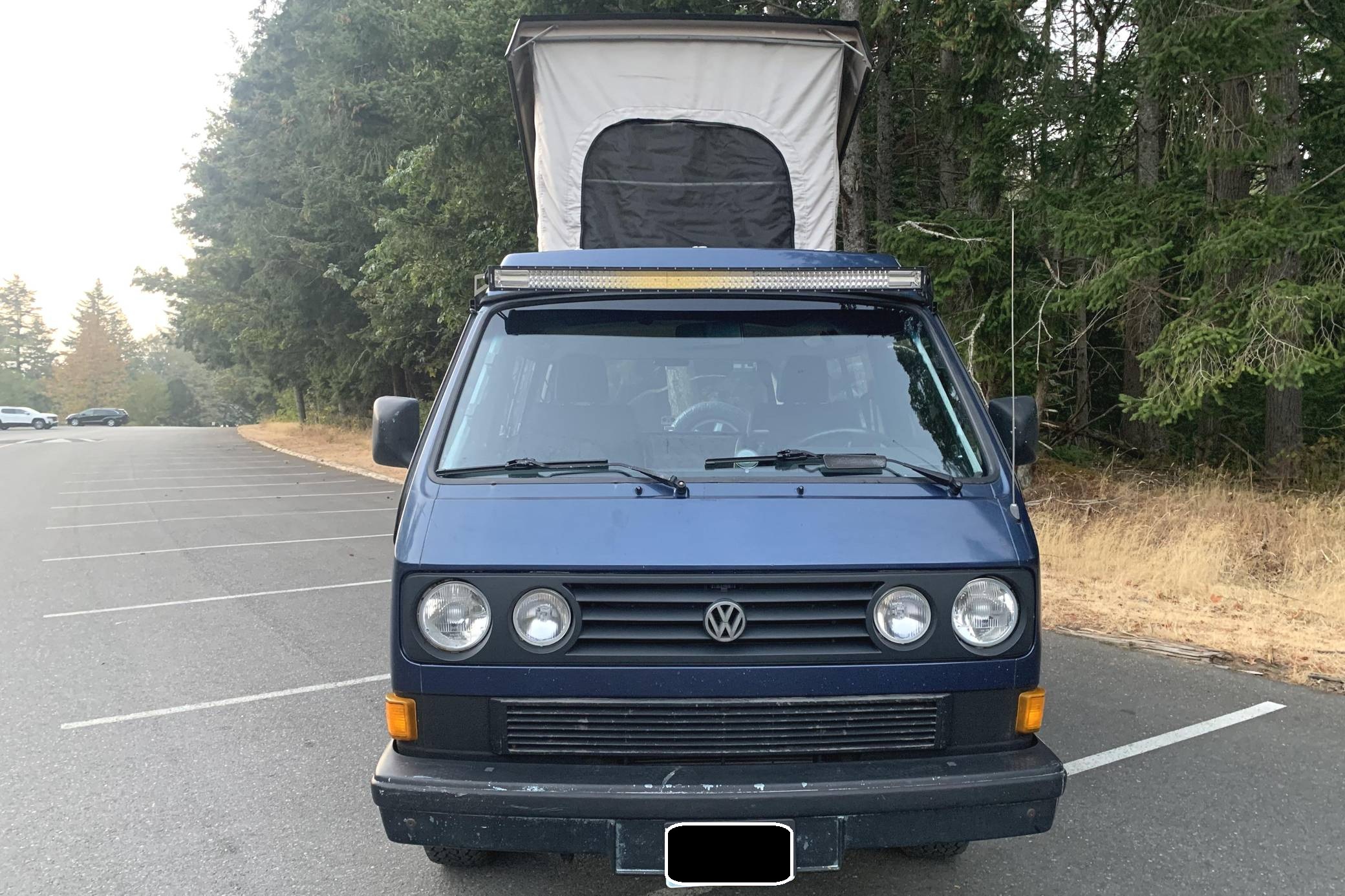 THIS… is a 1989 Volkswagen Vanagon Carat, finished in Orly Blue Metallic with a grey interior. This Vanagon features the desirable 4-speed manual transmission. A partial list of notable factory equipment includes power steering, a sliding side door, and more as detailed below. Modifications to this Vanagon are extensive, and the full list is detailed below. include a Subaru "EJ25" 2. 5-liter flat-4 engine swap, a rebuilt transmission with a taller 4th gear, a GoWesty 2-inch lift kit and Bigger Brake system, 16-inch GoWesty alloy wheels with General Grabber AT2 tires, a Volkswagen Vanagon pop-top camper roof, a 52-inch curved front light bar, black leather folding front seats with passenger swivel, a queen-size Z-bed rear bench seat, an undercarriage-mounted propane tank, a Westfalia cabinet with 2-burner stove and sink, a 100 amp-hour house battery, and a 7-gallon water tank. Volkswagen released the Vanagon for the 1980 model year to replace the Transporter, which traced its roots to the original Bus launched in 1950. It kept its predecessor's rear-mounted engine, but it was longer, wider, and characterized by a boxier design. 1983 brought a water-cooled engine, and production for the American market ended in 1991, though Volkswagen continued selling the model in South Africa until 2002. Power comes from an "EJ25" 2. 5-liter flat-4, rated at 173 horsepower and 166 lb-ft of torque. Output is sent to the rear wheels via a 4-speed manual transmission.