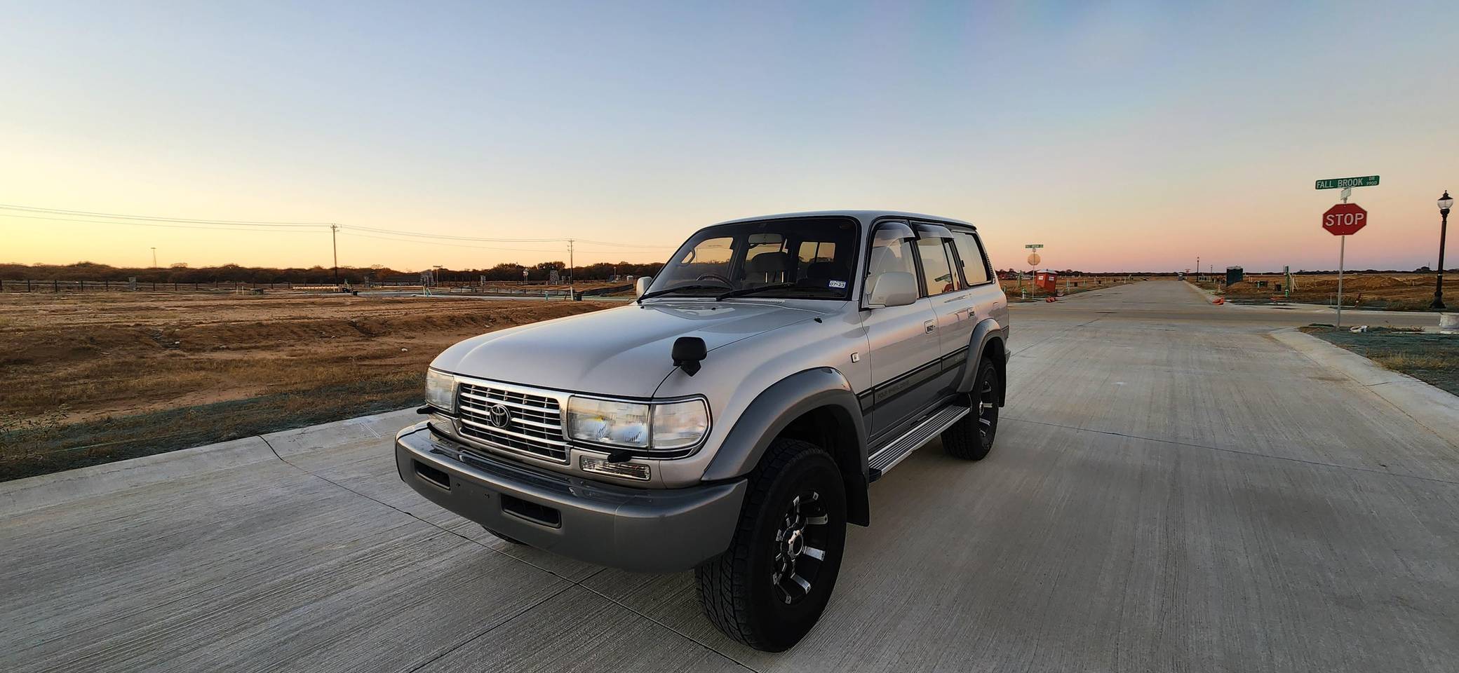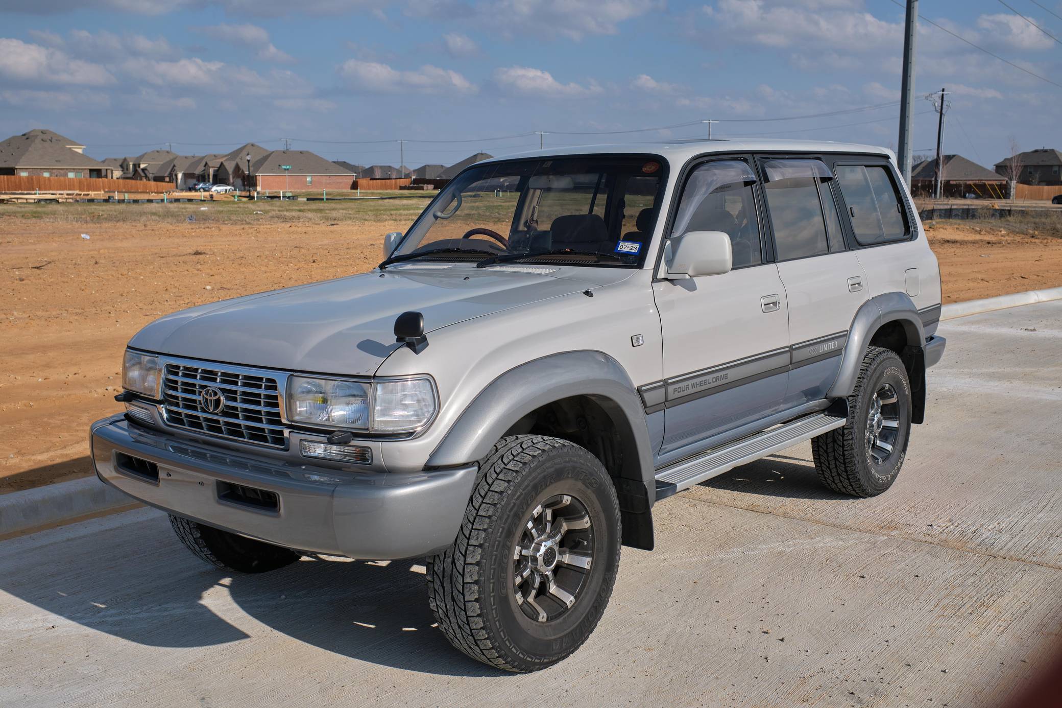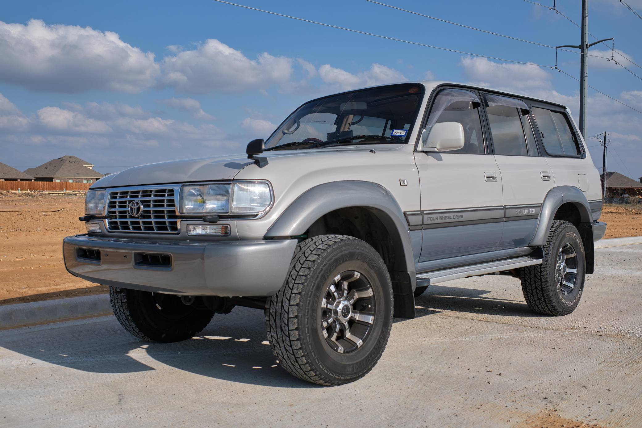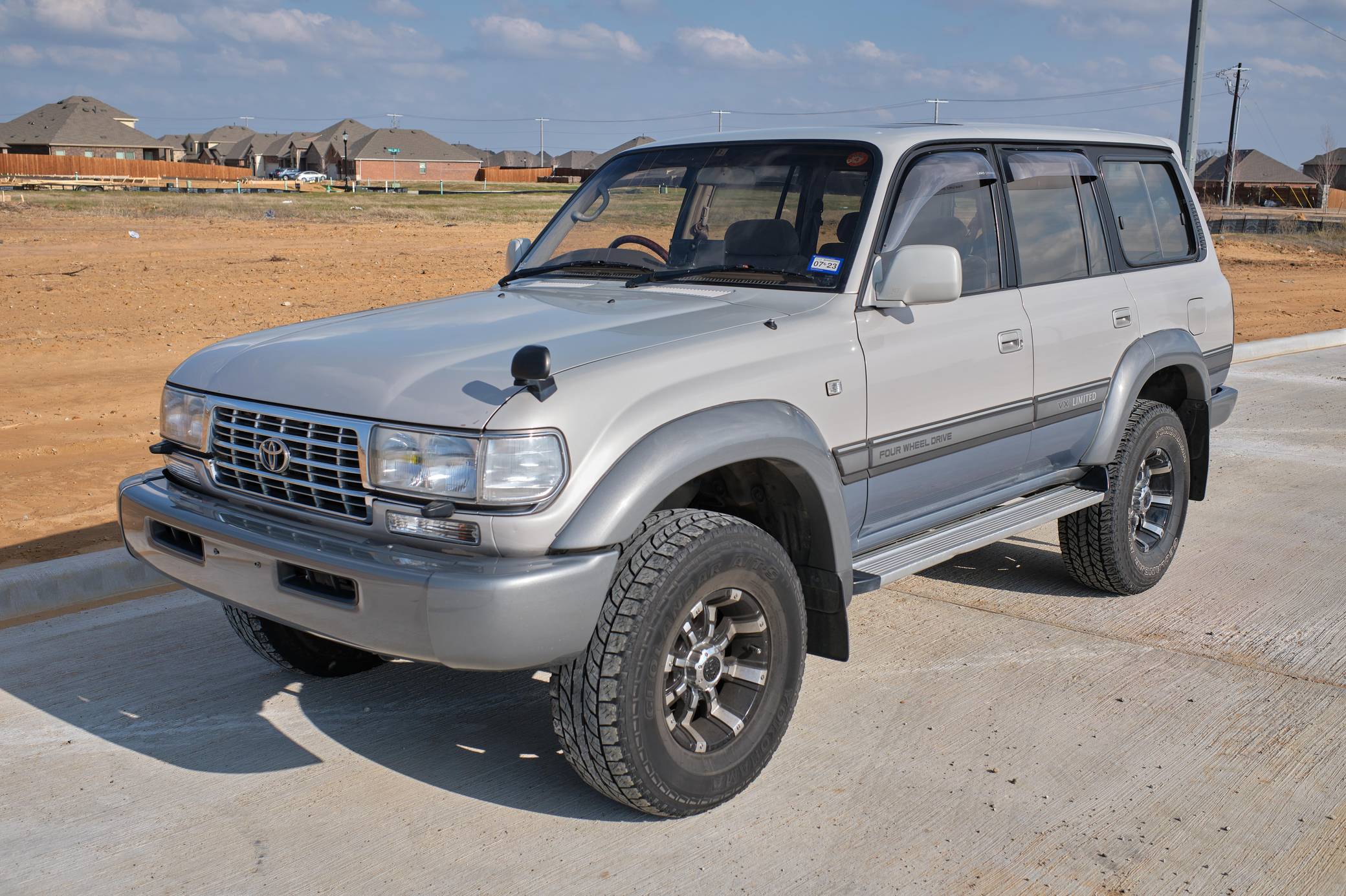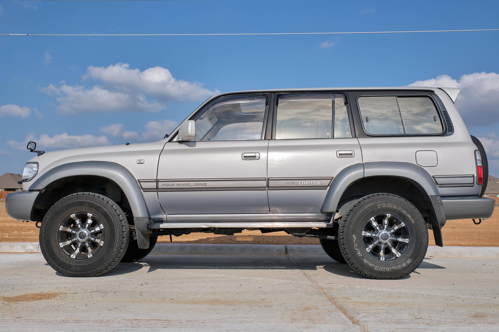 1997 Toyota Land Cruiser VX Limited, finished in Desert Dune and Moonglow with a brown interior. Imported from Japan in June 2022, it's equipped with a metric instrument cluster and its odometer shows about 170,100 kilometers, which represents approximately 105,700 miles. Modifications reported by the seller include a 2-inch Big Country suspension lift kit, Rancho shocks, a Big Country steering stabilizer, a Jasma GANADOR muffler, aftermarket rear lights, wood-look interior trim, a Kenwood touchscreen, and a rear-view camera. Factory equipment includes headlight washers, running boards, a sunroof, cloth upholstery, a refrigerated compartment in the center console, and cruise control. The 80-Series Land Cruiser was built for the Japanese and North American markets between 1990 and 1997. The Japanese-market VX Limited was the range-topping version, and it included features not offered on the contemporary North American Land Cruiser including automatic front and rear climate control systems, adjustable shock absorbers, and a center console cooling box. Power comes from a "1HD-FT" 4. 2-liter turbodiesel inline-6, rated at about 165 horsepower and 268 lb-ft of torque. Output is sent to all four wheels through a 4-speed automatic transmission and a 2-speed transfer case.