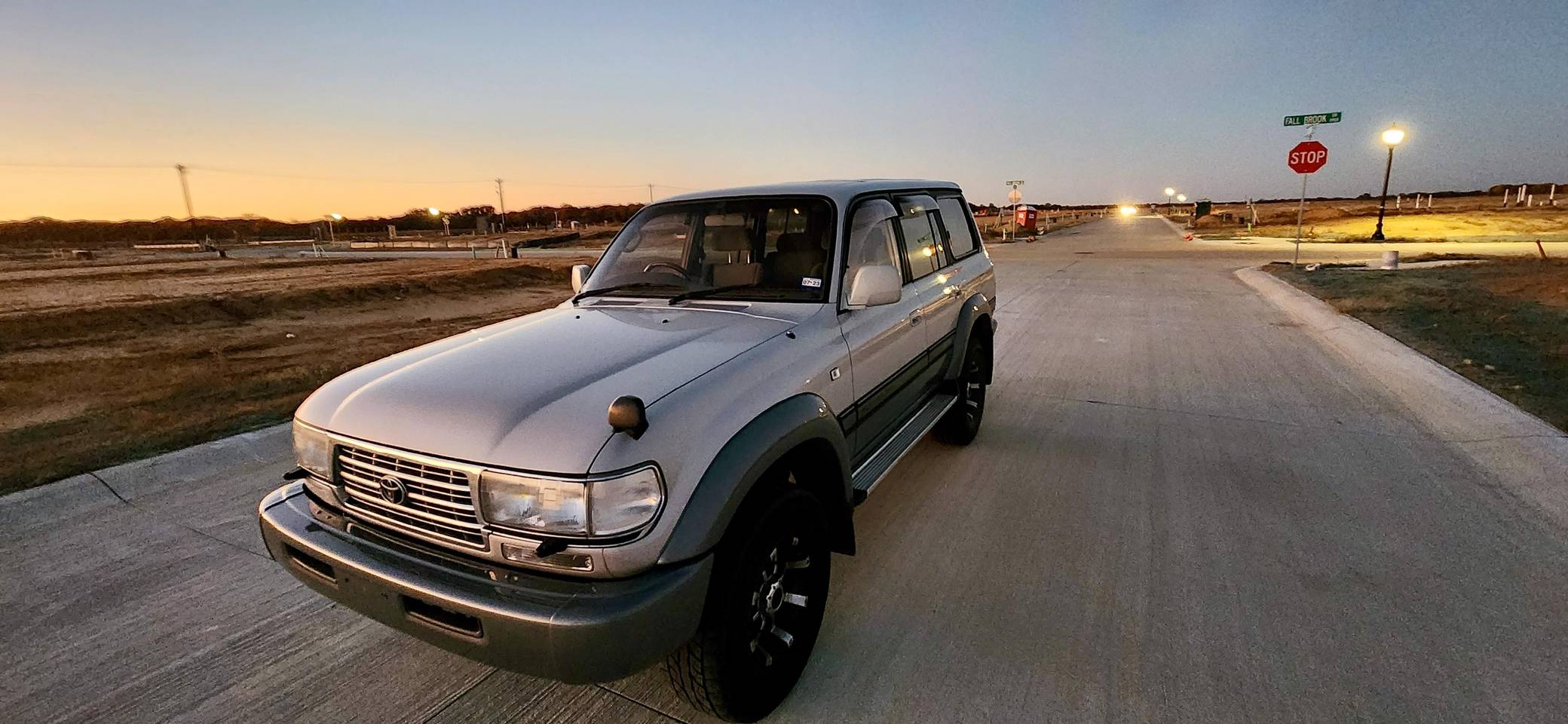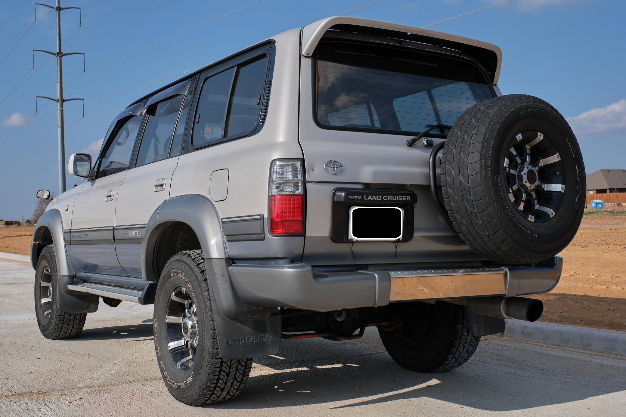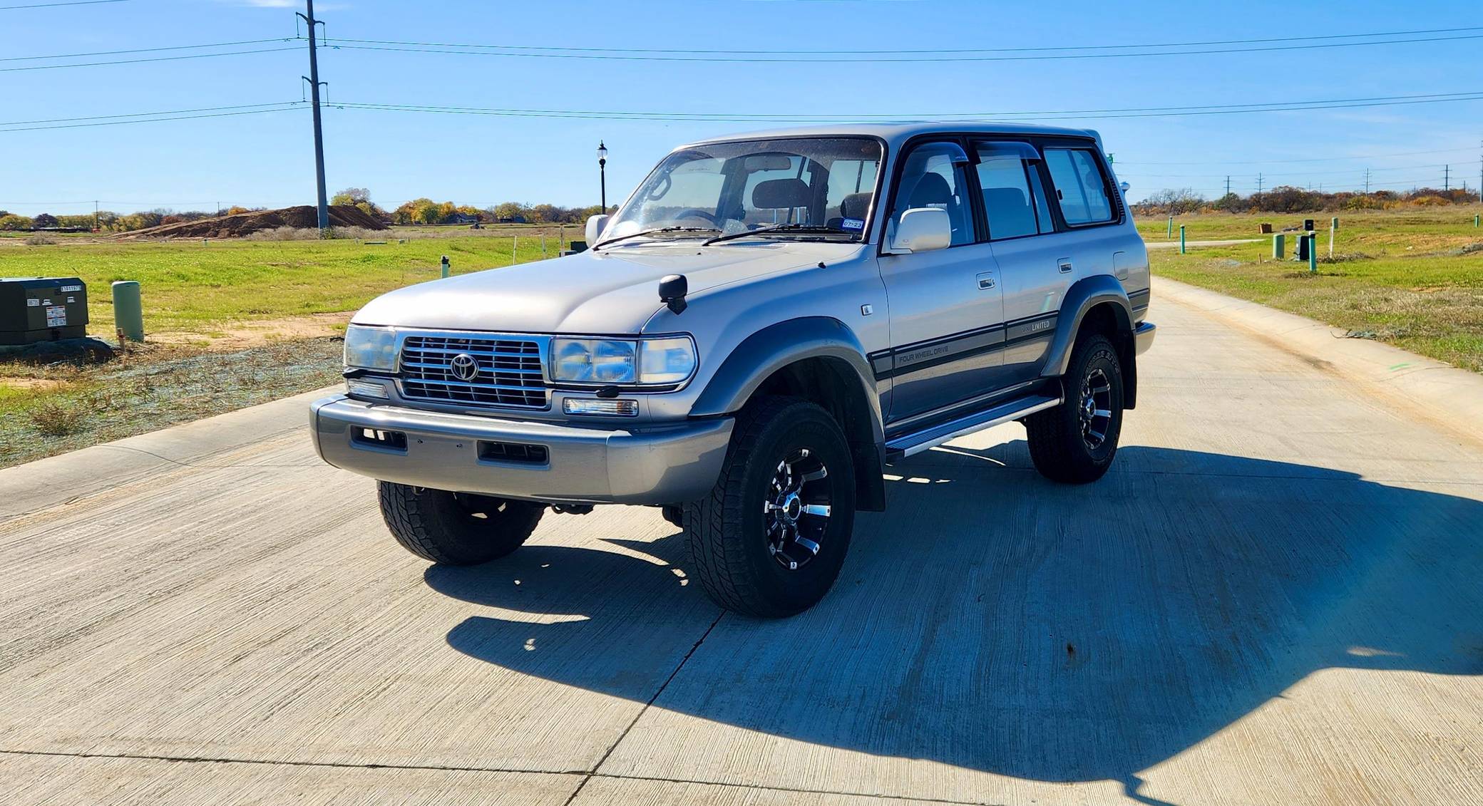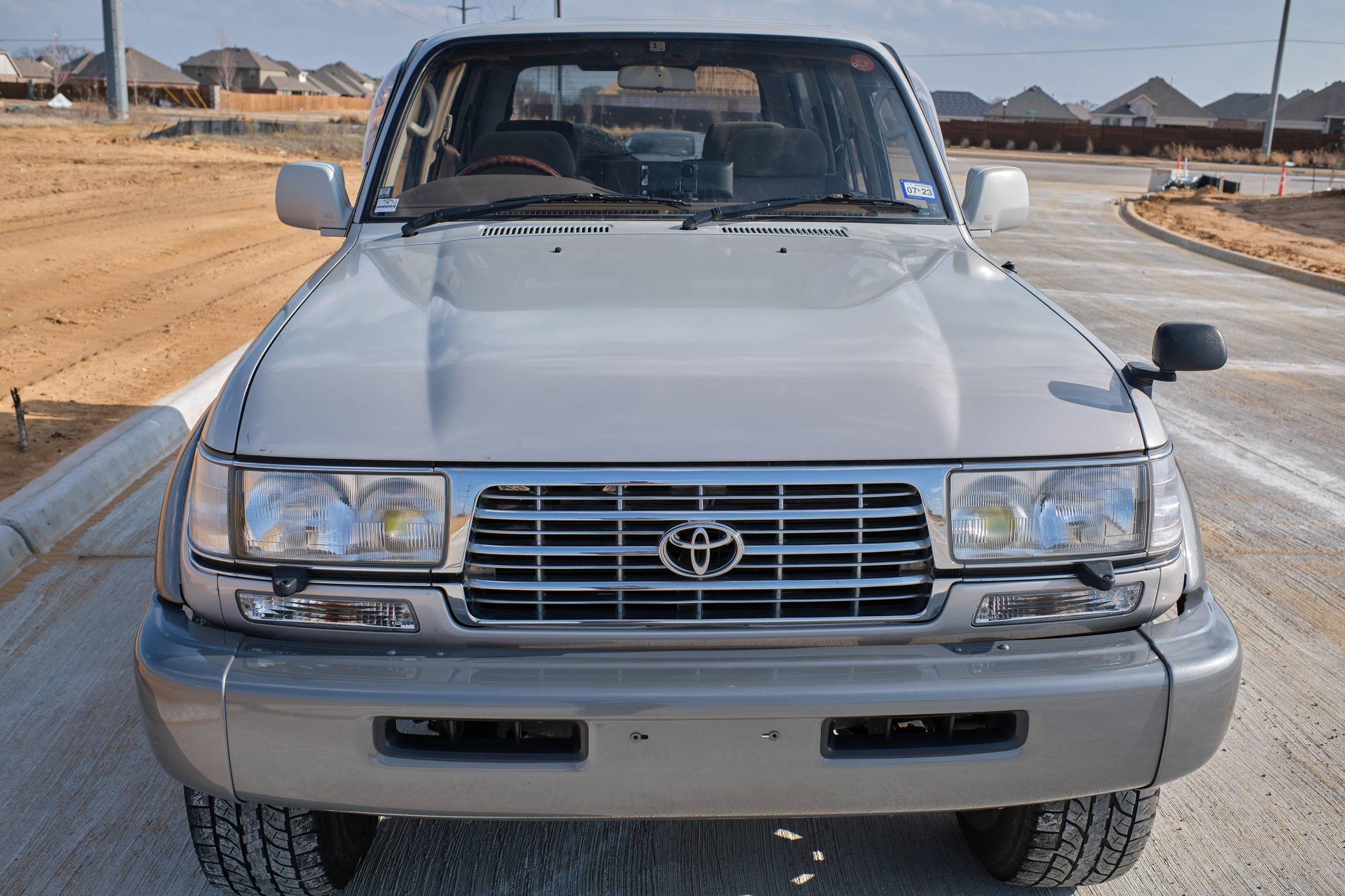 1997 Toyota Land Cruiser VX Limited, finished in Desert Dune and Moonglow with a brown interior. Imported from Japan in June 2022, it's equipped with a metric instrument cluster and its odometer shows about 170,100 kilometers, which represents approximately 105,700 miles. Modifications reported by the seller include a 2-inch Big Country suspension lift kit, Rancho shocks, a Big Country steering stabilizer, a Jasma GANADOR muffler, aftermarket rear lights, wood-look interior trim, a Kenwood touchscreen, and a rear-view camera. Factory equipment includes headlight washers, running boards, a sunroof, cloth upholstery, a refrigerated compartment in the center console, and cruise control. The 80-Series Land Cruiser was built for the Japanese and North American markets between 1990 and 1997. The Japanese-market VX Limited was the range-topping version, and it included features not offered on the contemporary North American Land Cruiser including automatic front and rear climate control systems, adjustable shock absorbers, and a center console cooling box. Power comes from a "1HD-FT" 4. 2-liter turbodiesel inline-6, rated at about 165 horsepower and 268 lb-ft of torque. Output is sent to all four wheels through a 4-speed automatic transmission and a 2-speed transfer case.