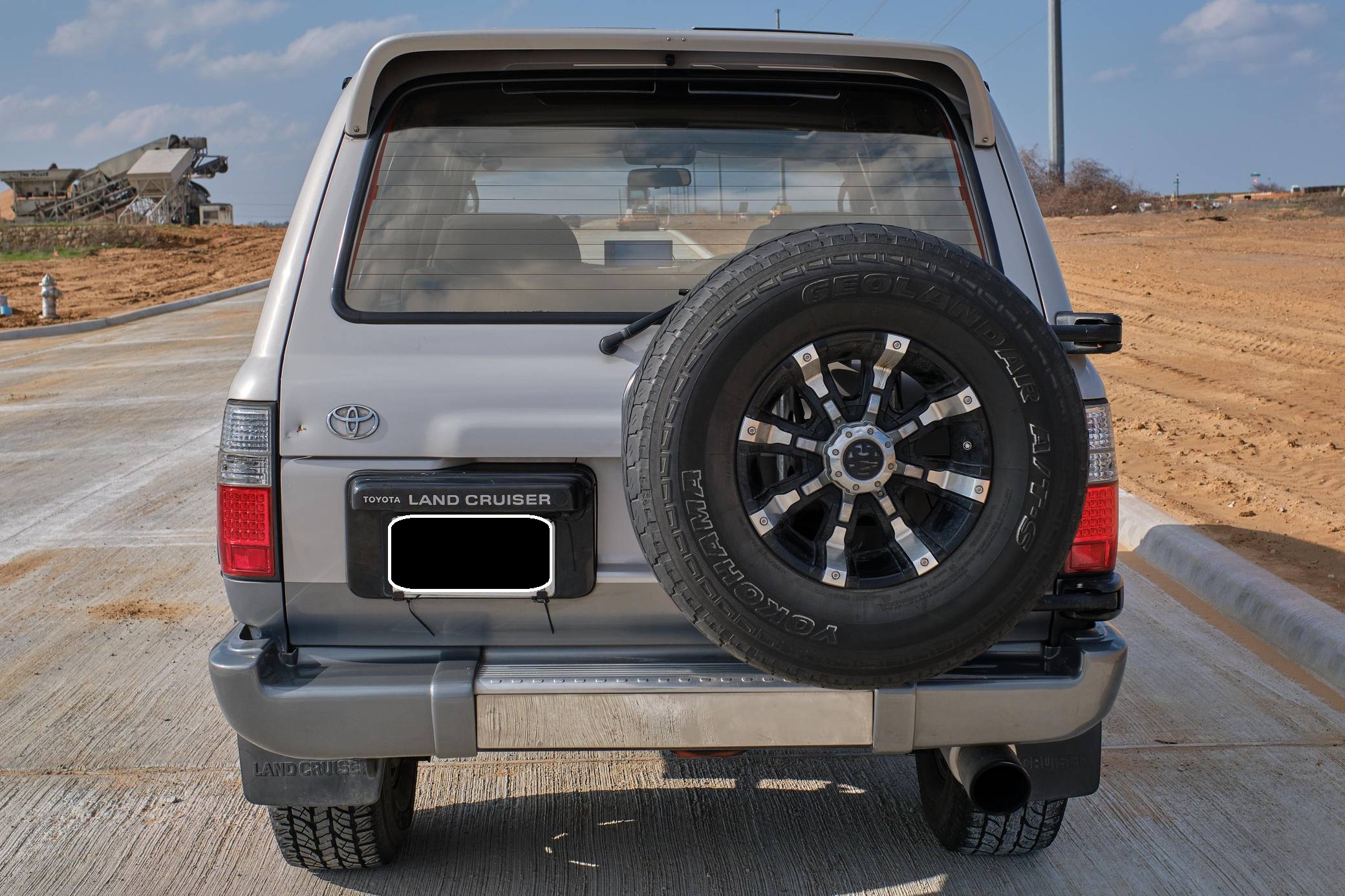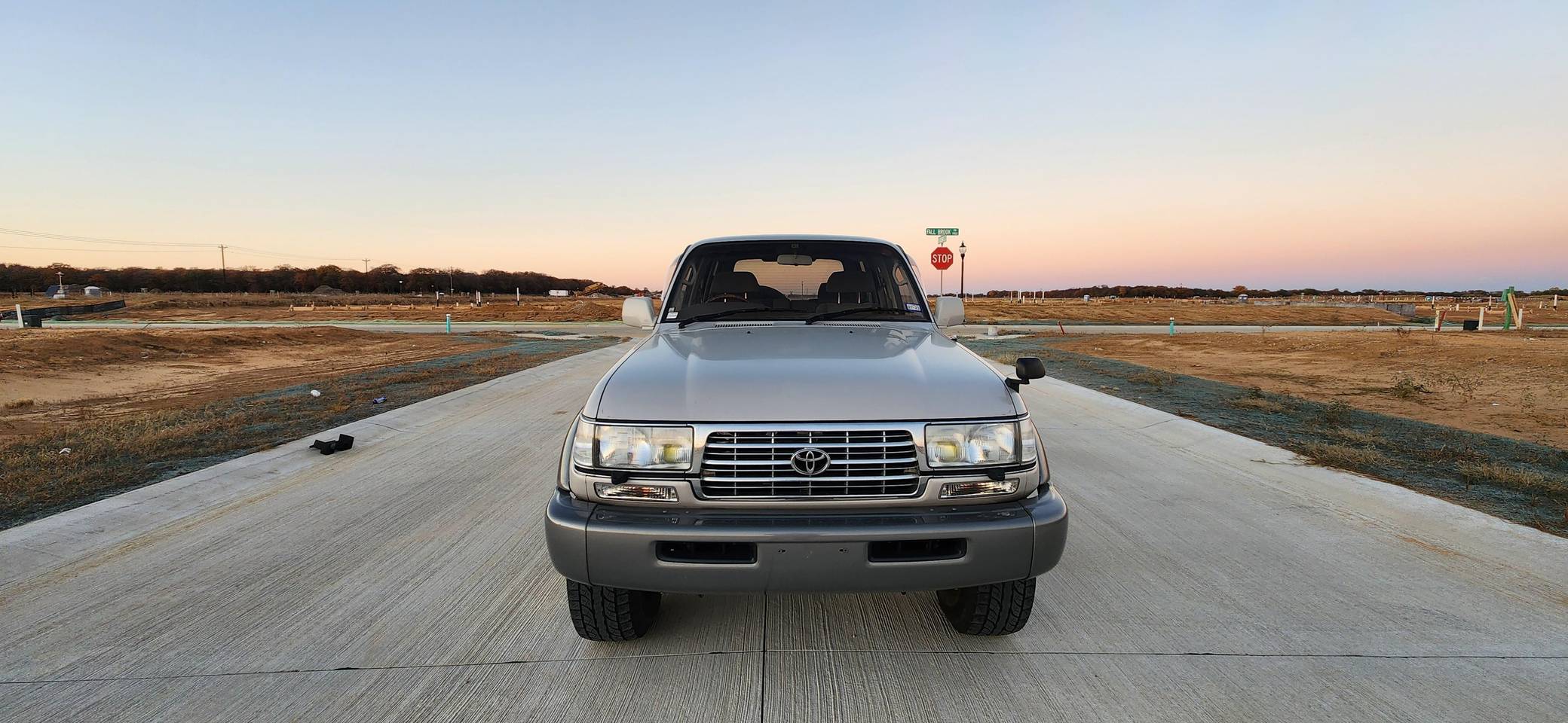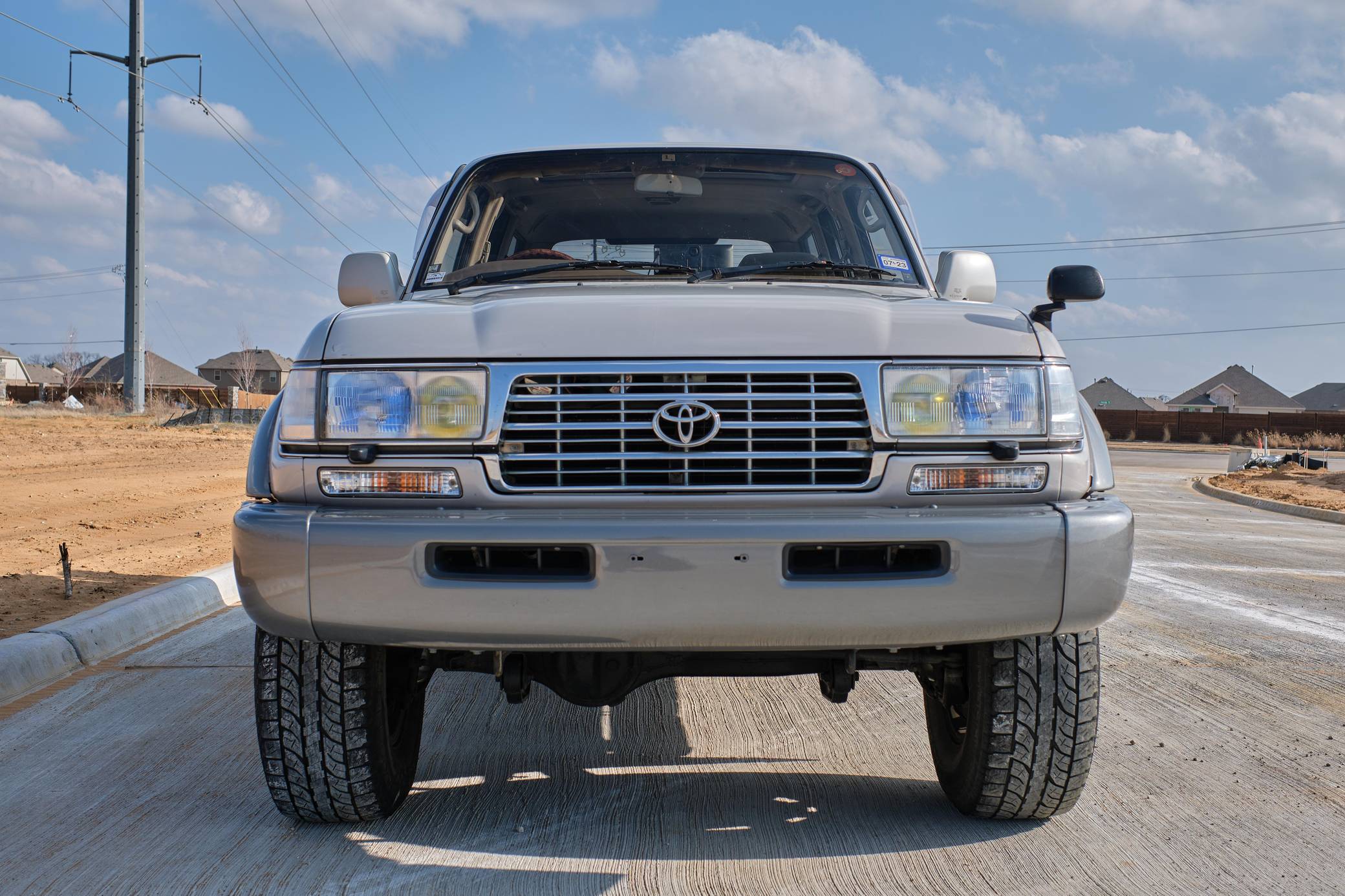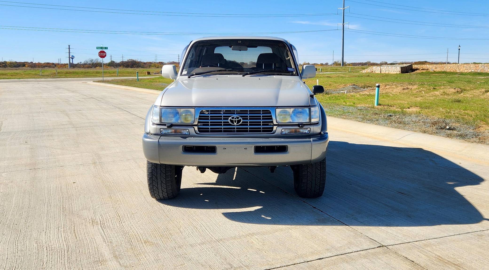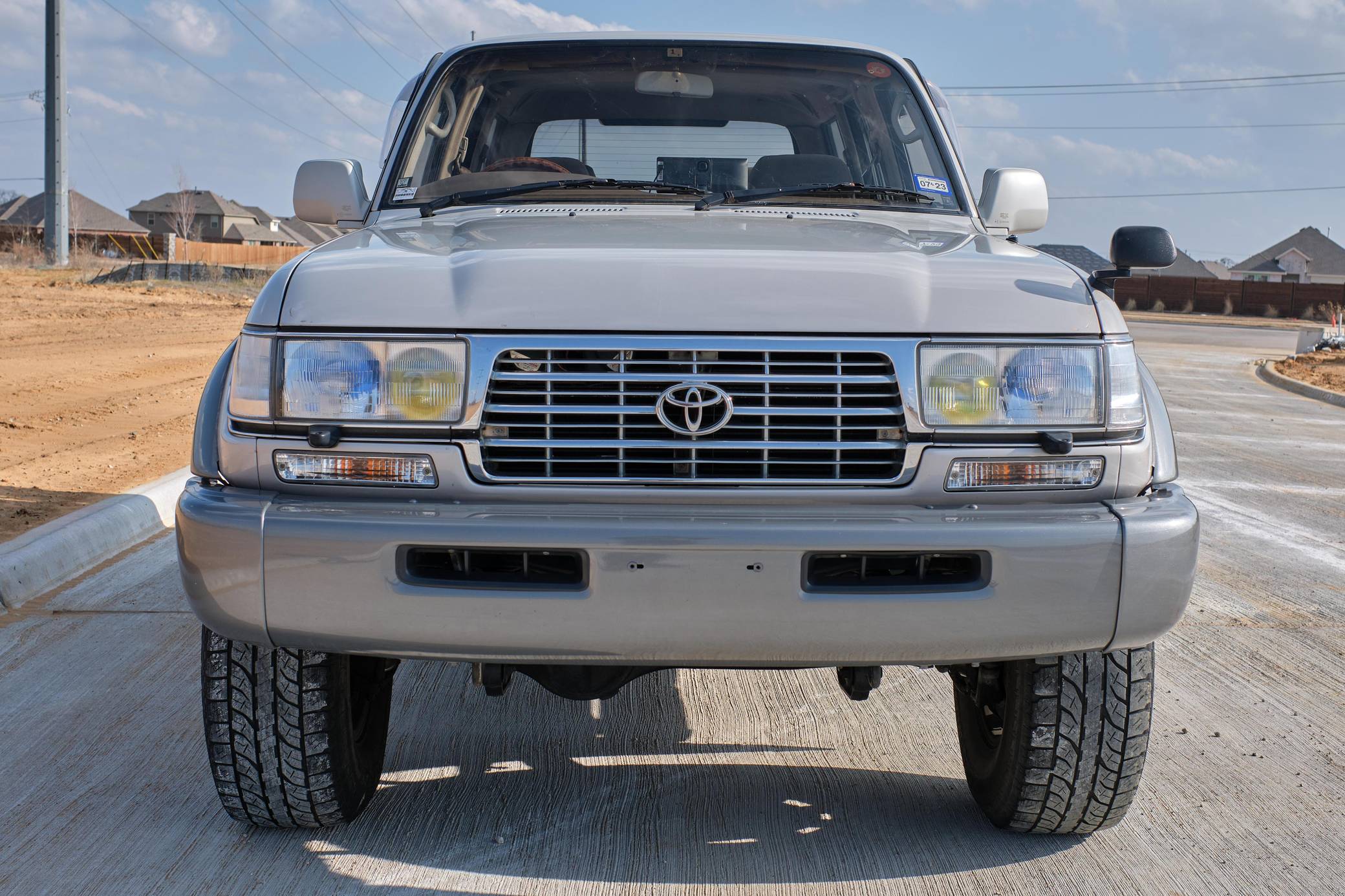 1997 Toyota Land Cruiser VX Limited, finished in Desert Dune and Moonglow with a brown interior. Imported from Japan in June 2022, it's equipped with a metric instrument cluster and its odometer shows about 170,100 kilometers, which represents approximately 105,700 miles. Modifications reported by the seller include a 2-inch Big Country suspension lift kit, Rancho shocks, a Big Country steering stabilizer, a Jasma GANADOR muffler, aftermarket rear lights, wood-look interior trim, a Kenwood touchscreen, and a rear-view camera. Factory equipment includes headlight washers, running boards, a sunroof, cloth upholstery, a refrigerated compartment in the center console, and cruise control. The 80-Series Land Cruiser was built for the Japanese and North American markets between 1990 and 1997. The Japanese-market VX Limited was the range-topping version, and it included features not offered on the contemporary North American Land Cruiser including automatic front and rear climate control systems, adjustable shock absorbers, and a center console cooling box. Power comes from a "1HD-FT" 4. 2-liter turbodiesel inline-6, rated at about 165 horsepower and 268 lb-ft of torque. Output is sent to all four wheels through a 4-speed automatic transmission and a 2-speed transfer case.