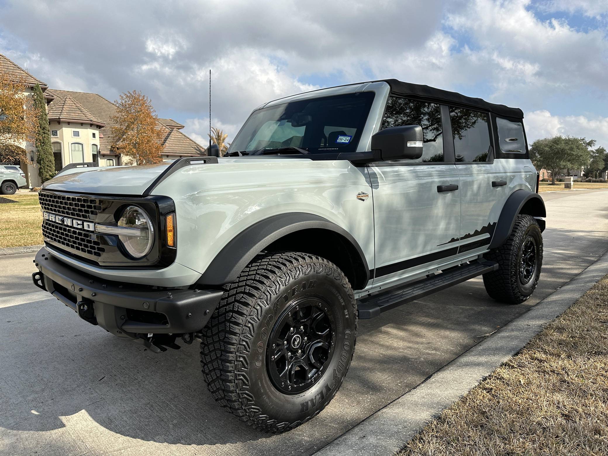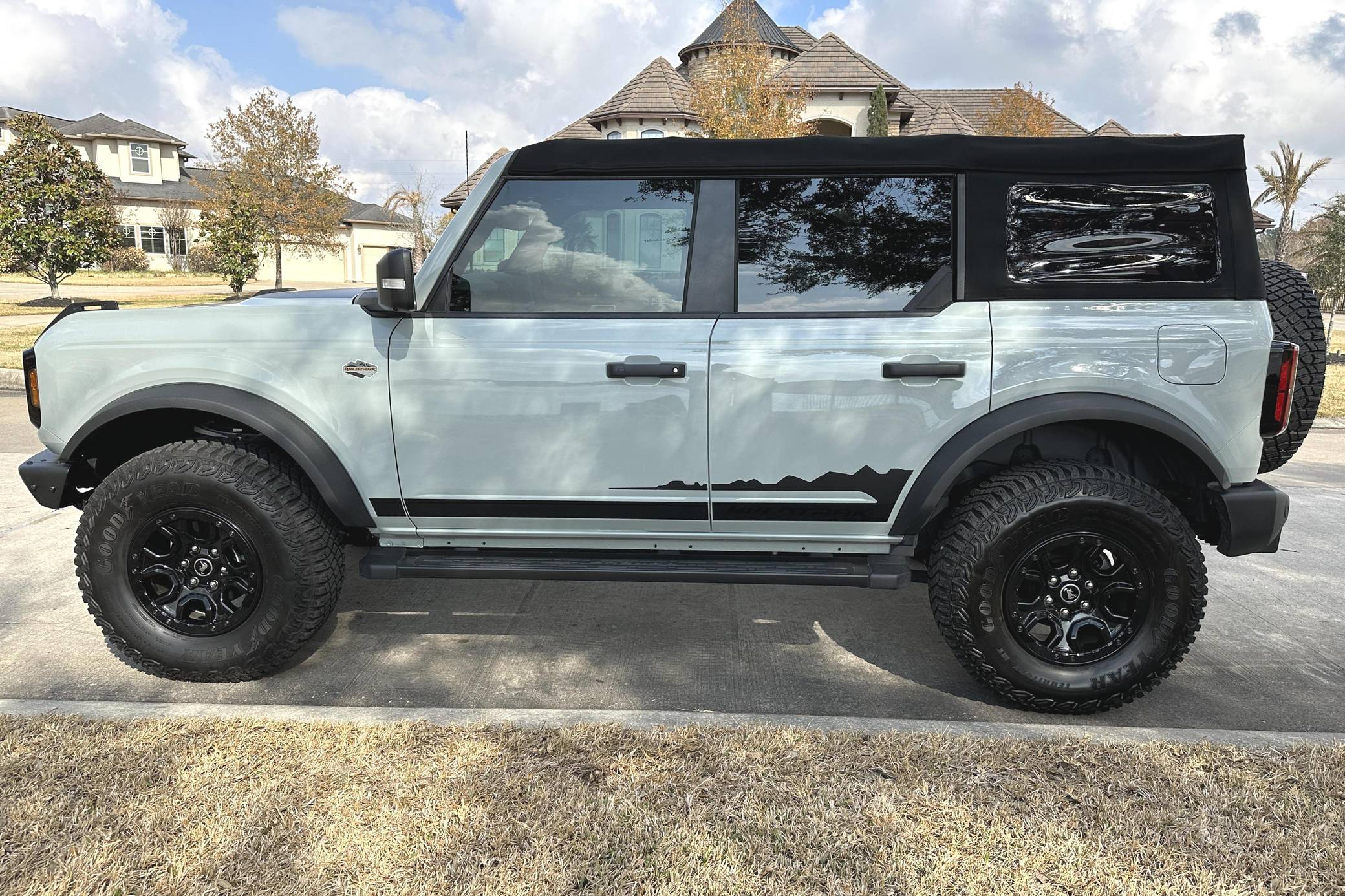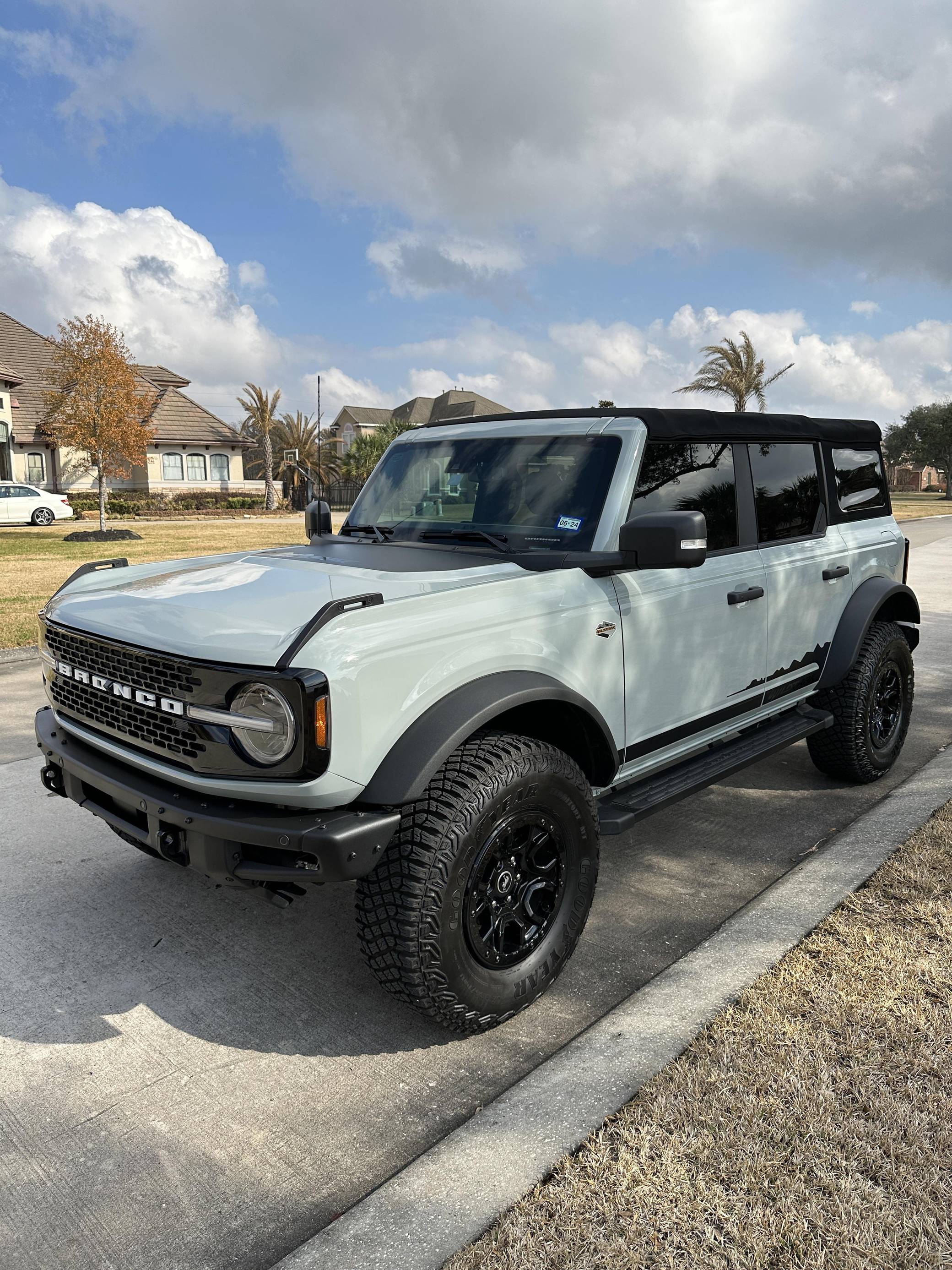 THIS… is a 2022 Ford Bronco Wildtrak, finished in Cactus Gray with black soft top and a Sandstone and black interior. Modifications reported by the seller are limited to ceramic-tinted windows. The sixth-generation Bronco was introduced for the 2021 model year, ending a 25-year hiatus and nearly a decade of speculation about its return. Retro styling, body-on-frame construction, and a suite of off-road equipment help ensure this truck lives up to the Bronco name. It's not all old-school, however: modern features like an available 12-inch touchscreen and a wireless phone charger bring it into the 21st century. Power comes from a 2. 7-liter twin-turbocharged EcoBoost V6, rated at up to 330 horsepower and 415 lb-ft of torque when using premium fuel, according to Ford. Output is sent to the rear or all four wheels via a 10-speed automatic transmission and a 2-speed transfer case.