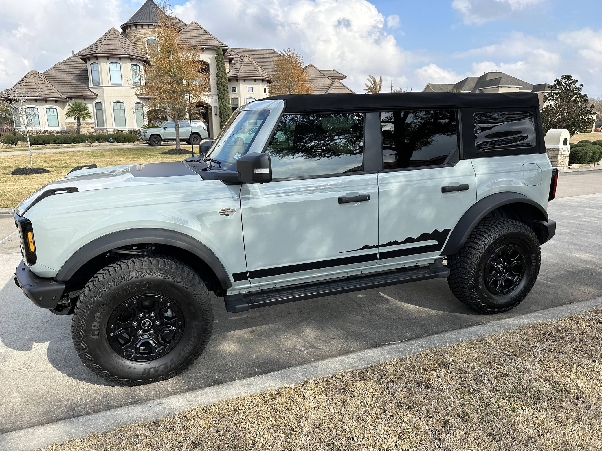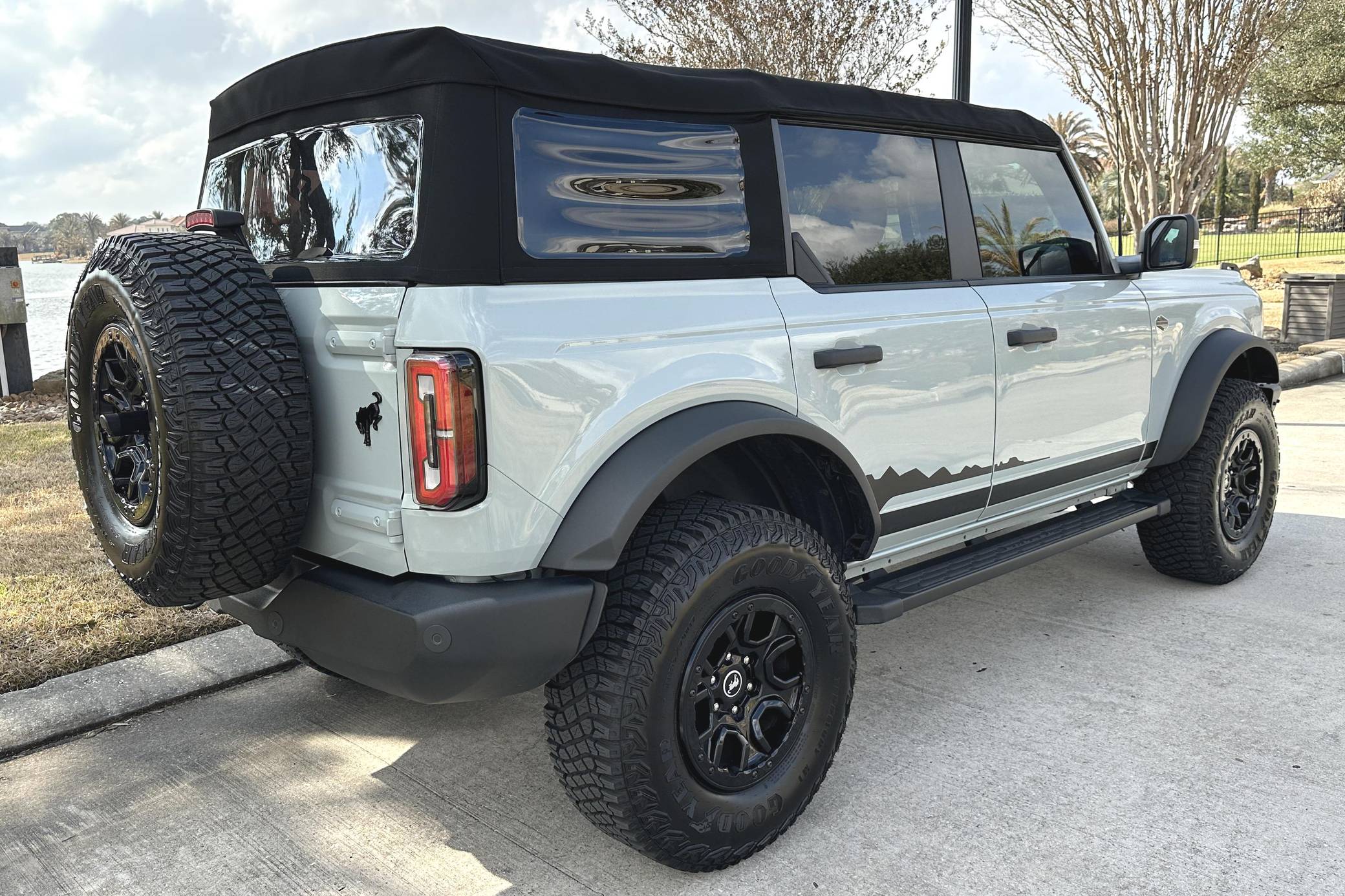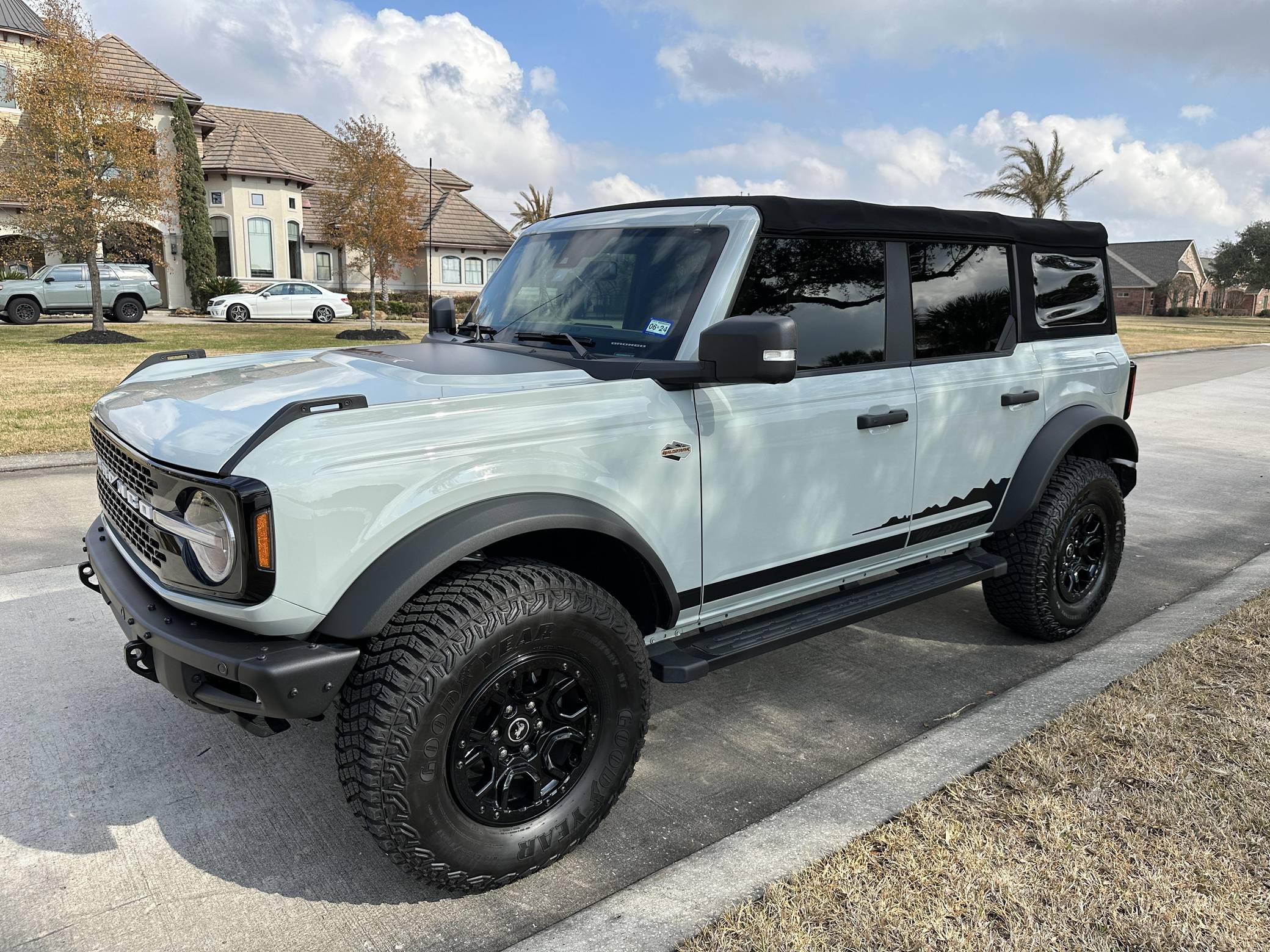THIS… is a 2022 Ford Bronco Wildtrak, finished in Cactus Gray with black soft top and a Sandstone and black interior. Modifications reported by the seller are limited to ceramic-tinted windows. The sixth-generation Bronco was introduced for the 2021 model year, ending a 25-year hiatus and nearly a decade of speculation about its return. Retro styling, body-on-frame construction, and a suite of off-road equipment help ensure this truck lives up to the Bronco name. It's not all old-school, however: modern features like an available 12-inch touchscreen and a wireless phone charger bring it into the 21st century. Power comes from a 2. 7-liter twin-turbocharged EcoBoost V6, rated at up to 330 horsepower and 415 lb-ft of torque when using premium fuel, according to Ford. Output is sent to the rear or all four wheels via a 10-speed automatic transmission and a 2-speed transfer case.