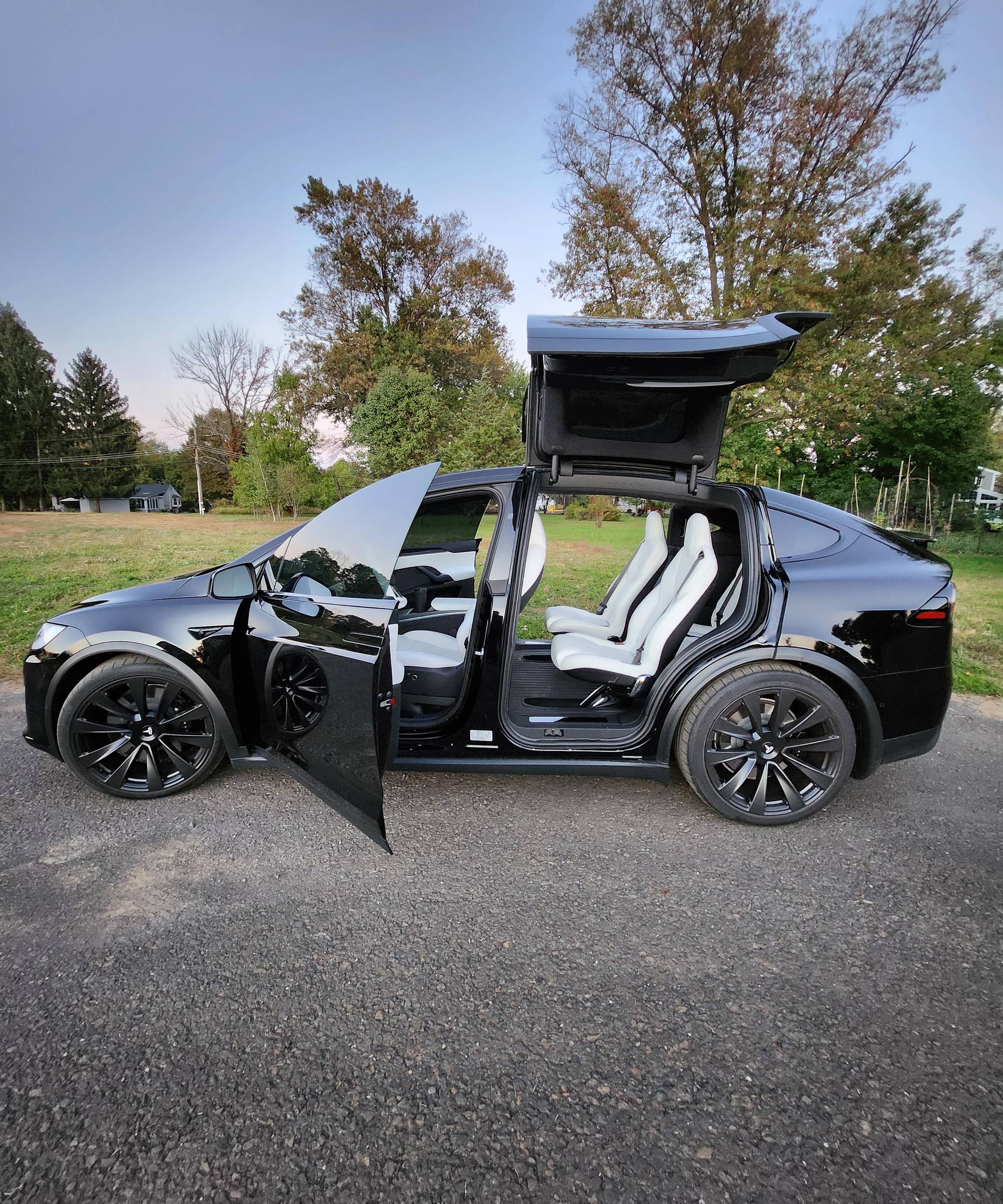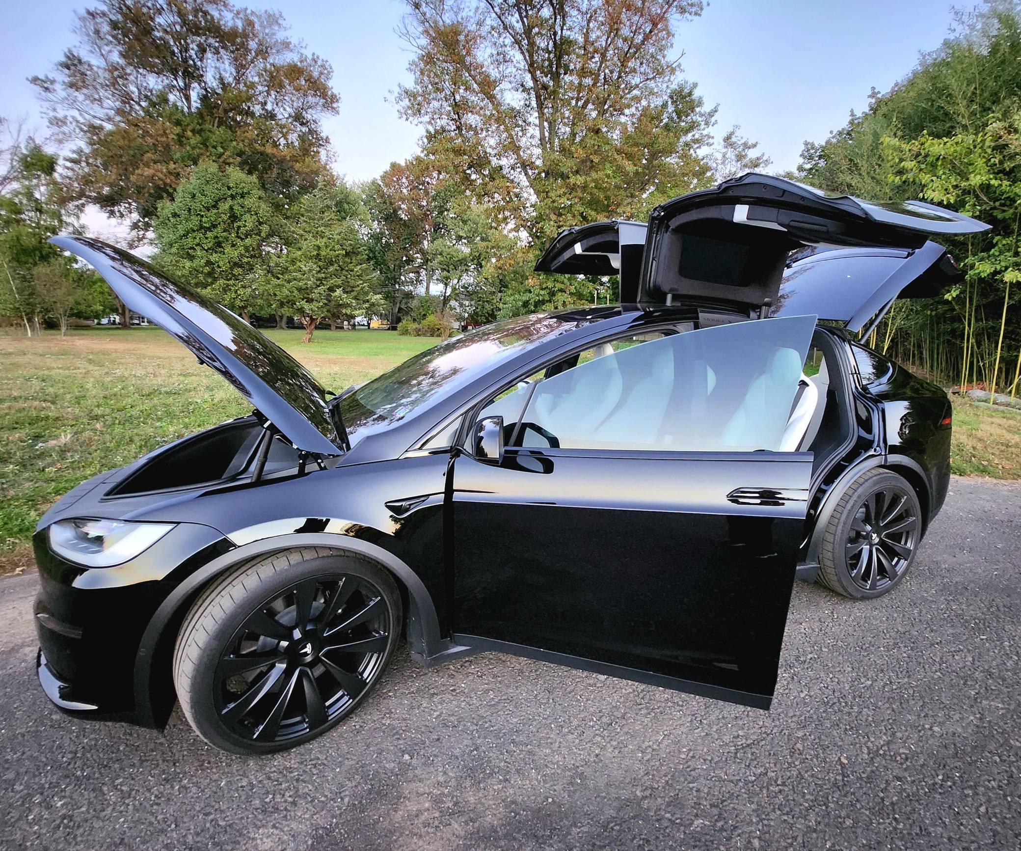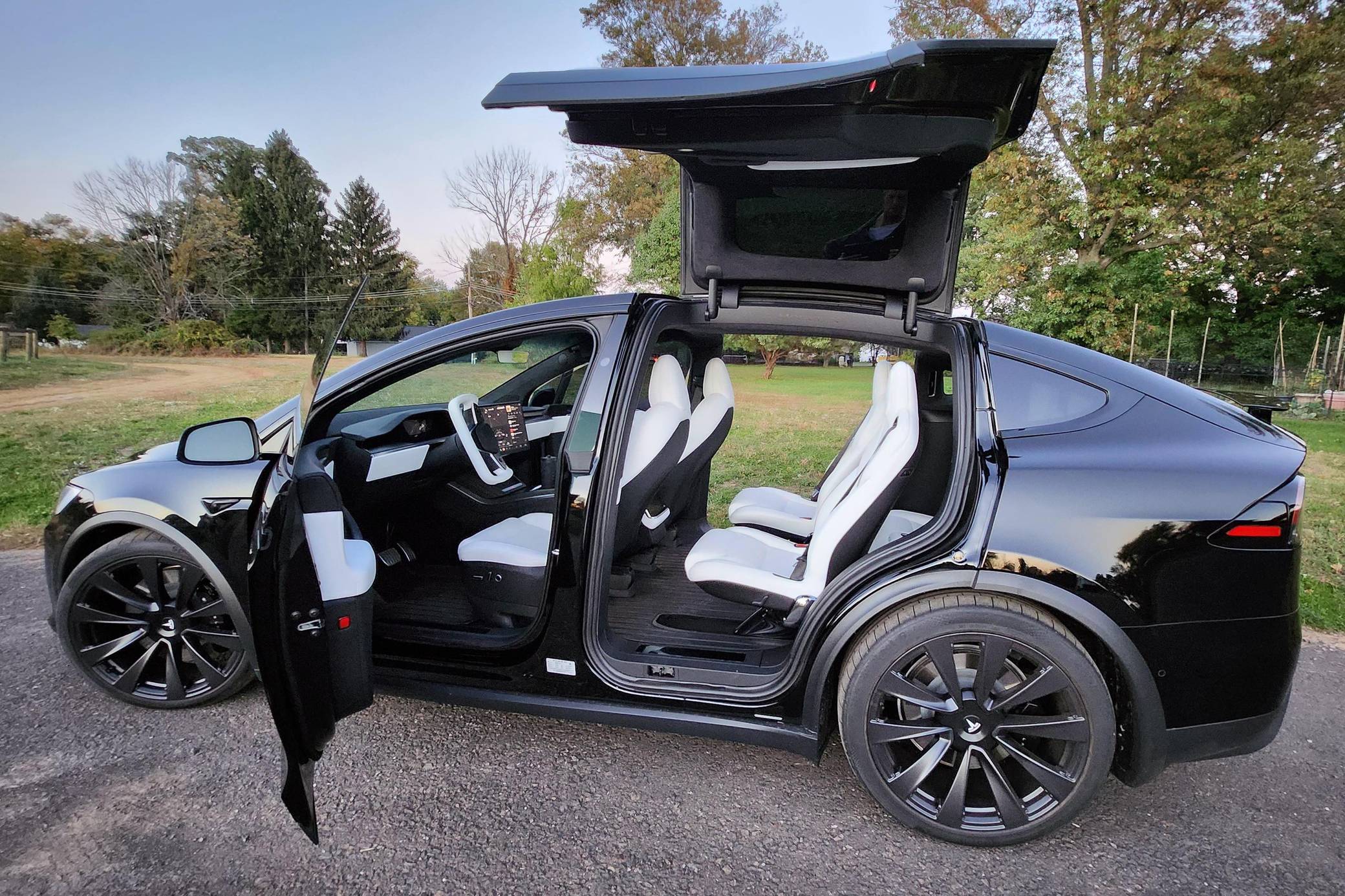 THIS. . . is a 2022 Tesla Model X Plaid, finished in black with a white interior. Modifications reported by the seller include a power-operated front trunk, paint protection film, front window tint, and a white yoke steering wheel. Tesla introduced the Model X for the 2016 model year as a taller, more spacious alternative to the Model S. It stood out from other crossovers with unusual double-hinged falcon rear doors. It has gone through several powertrain and interior evolutions since its launch, and it's still available new today. Power comes from three electric motors, which draw electricity from a 100-kilowatt-hour lithium-ion battery pack to zap the four wheels with 1,020 horsepower. Fitted with 22-inch wheels, the Model X Plaid earned a maximum driving range rating of 311 miles from the EPA.