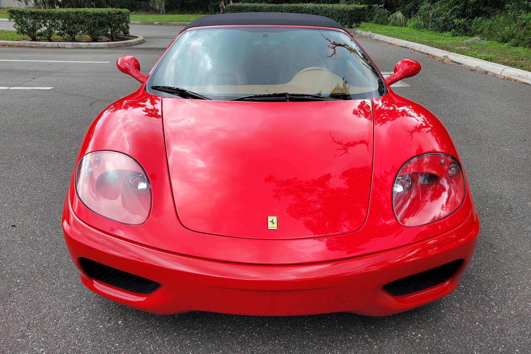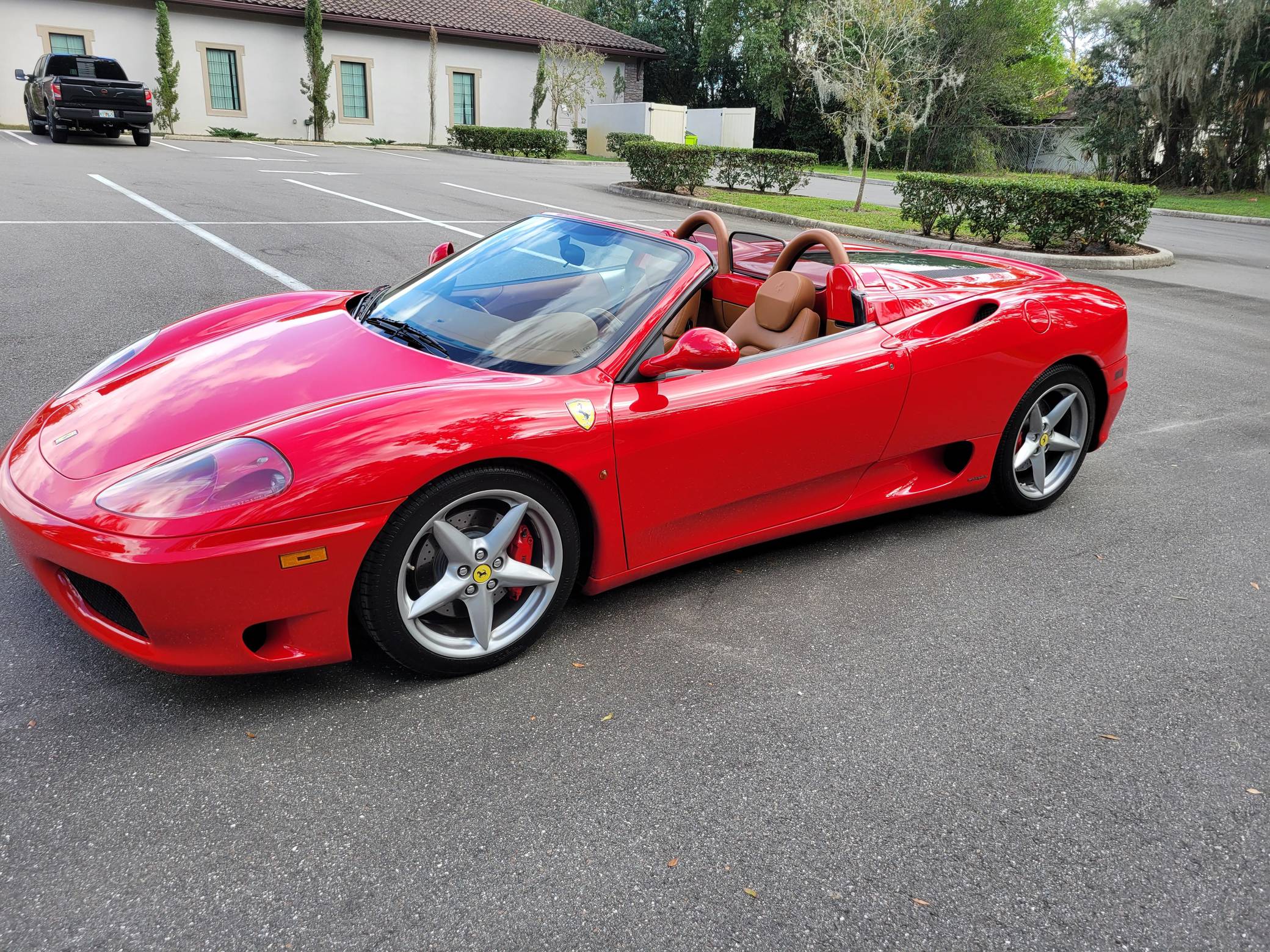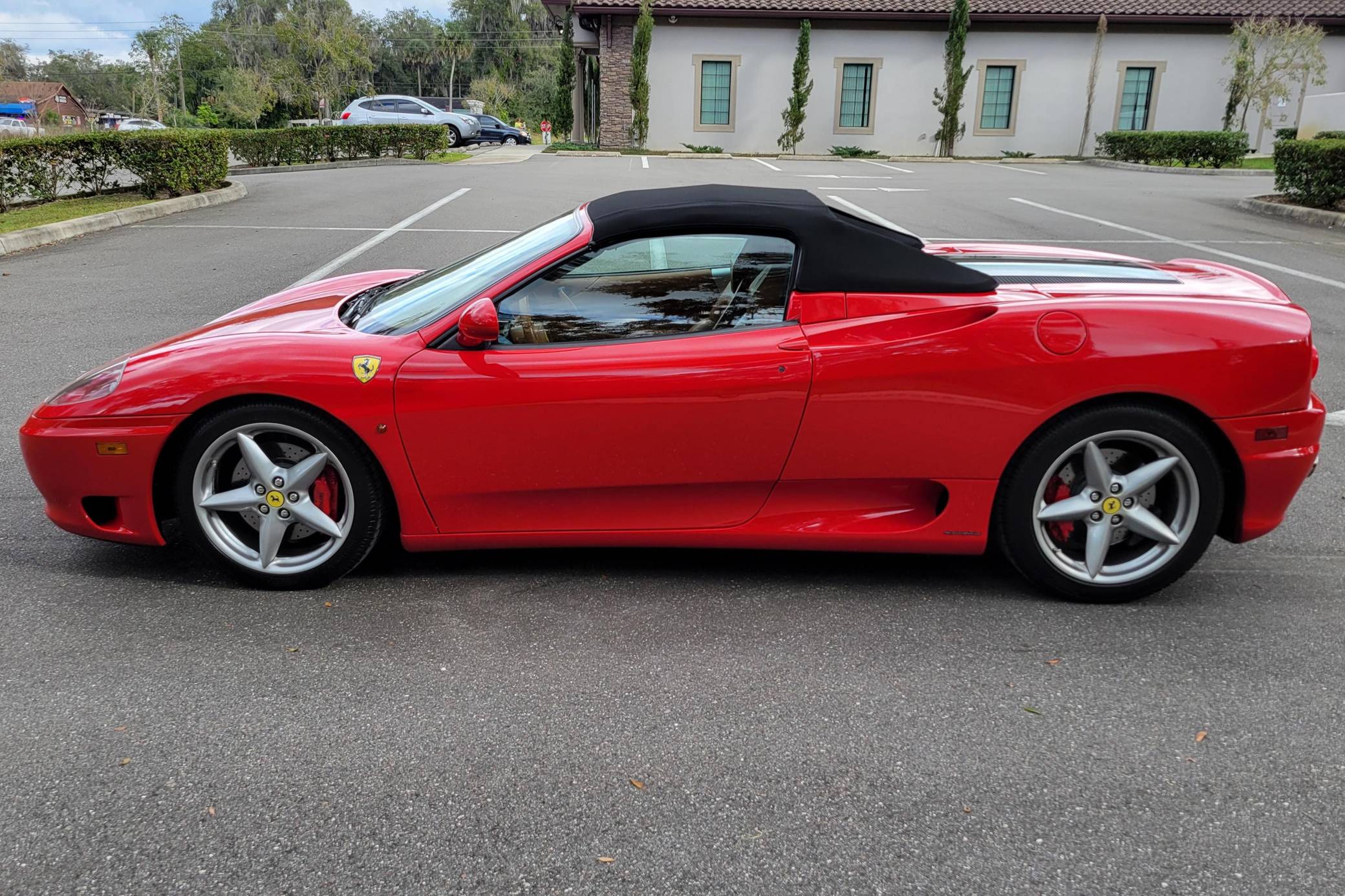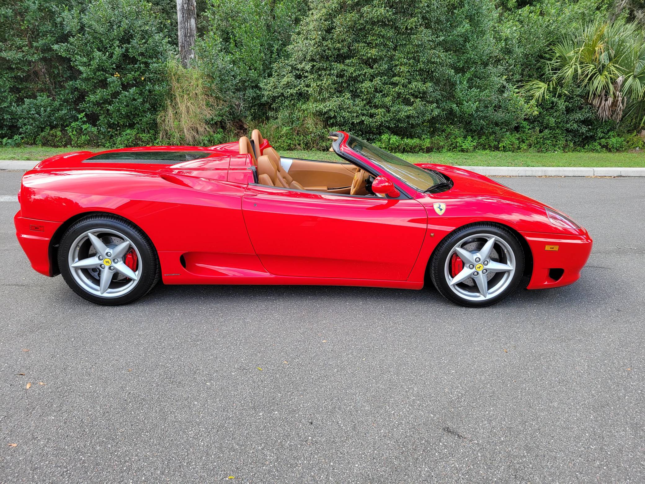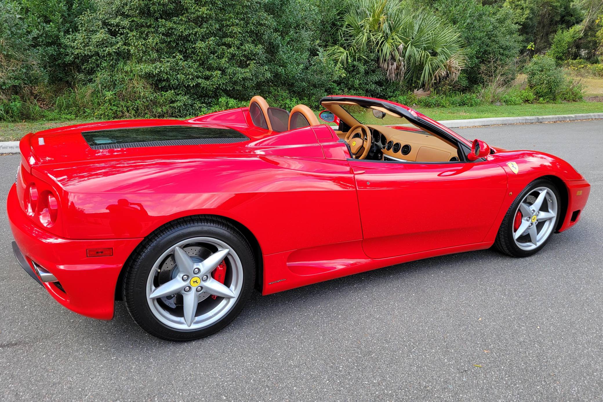 2004 Ferrari 360 Spider, finished in Rosso Corsa with a black soft top and a Cuoio interior. The odometer displays approximately 19,500 miles. Factory equipment includes 18-inch alloy wheels, red brake calipers, xenon headlights, Scuderia shields, leather upholstery, power-adjustable Daytona-style seats, automatic climate control, and more as listed below. Modifications reported by the seller are limited to a Tubi Style exhaust system and paint protection film on the exterior mirrors. The Ferrari 360 was built between 1999 and 2005 as the successor to Ferrari's long-running rear-mid-engine line. Major updates over the F355 that preceded it included an all-aluminum space frame, accessible belts negating an engine-out service, and a more powerful "Tipo F131" V8. Power for this 360 Spider comes from a 3. 6-liter V8, rated at 400 horsepower and 276 lb-ft of torque. Output is sent to the rear wheels via a 6-speed automatic transmission.