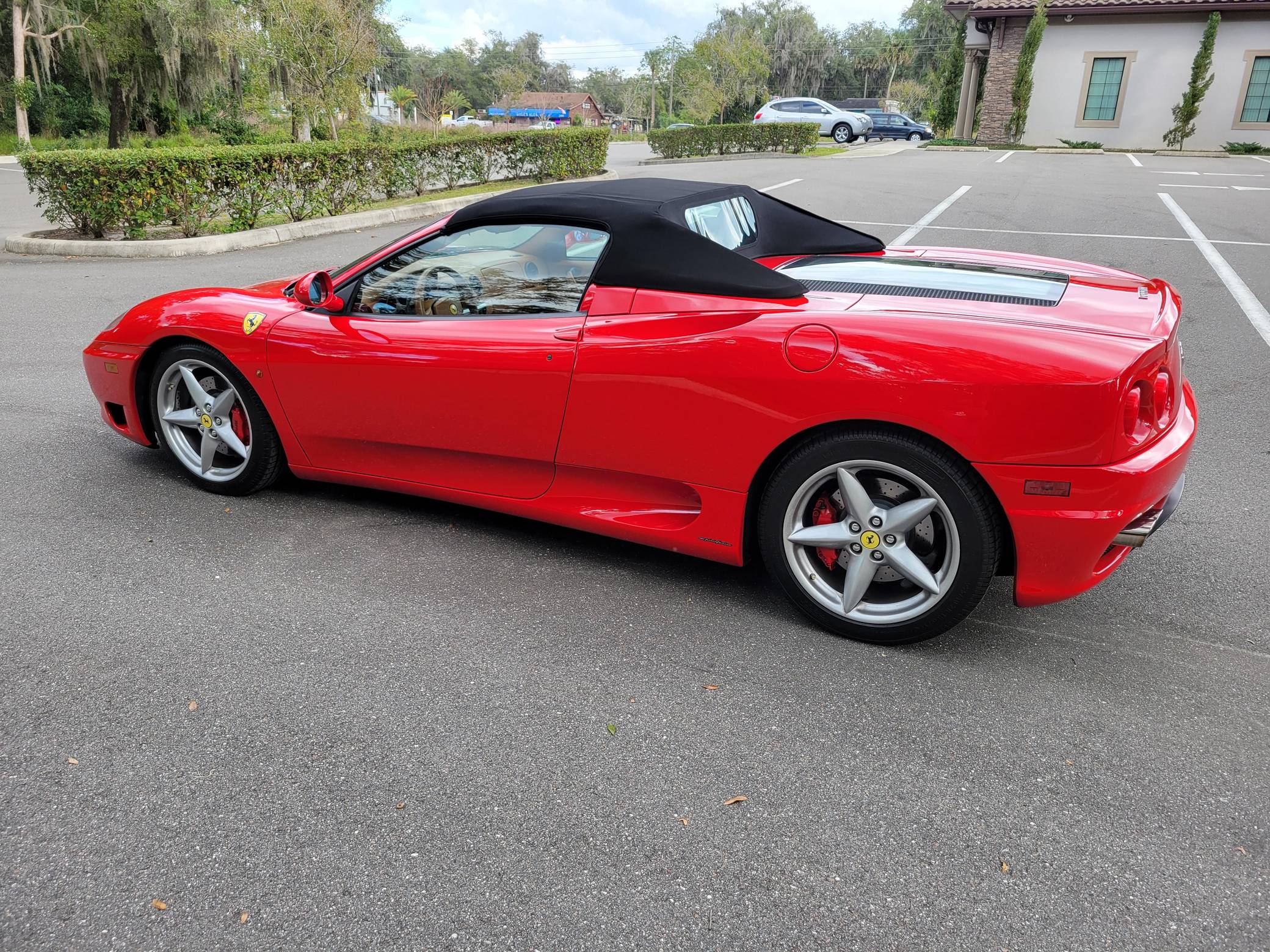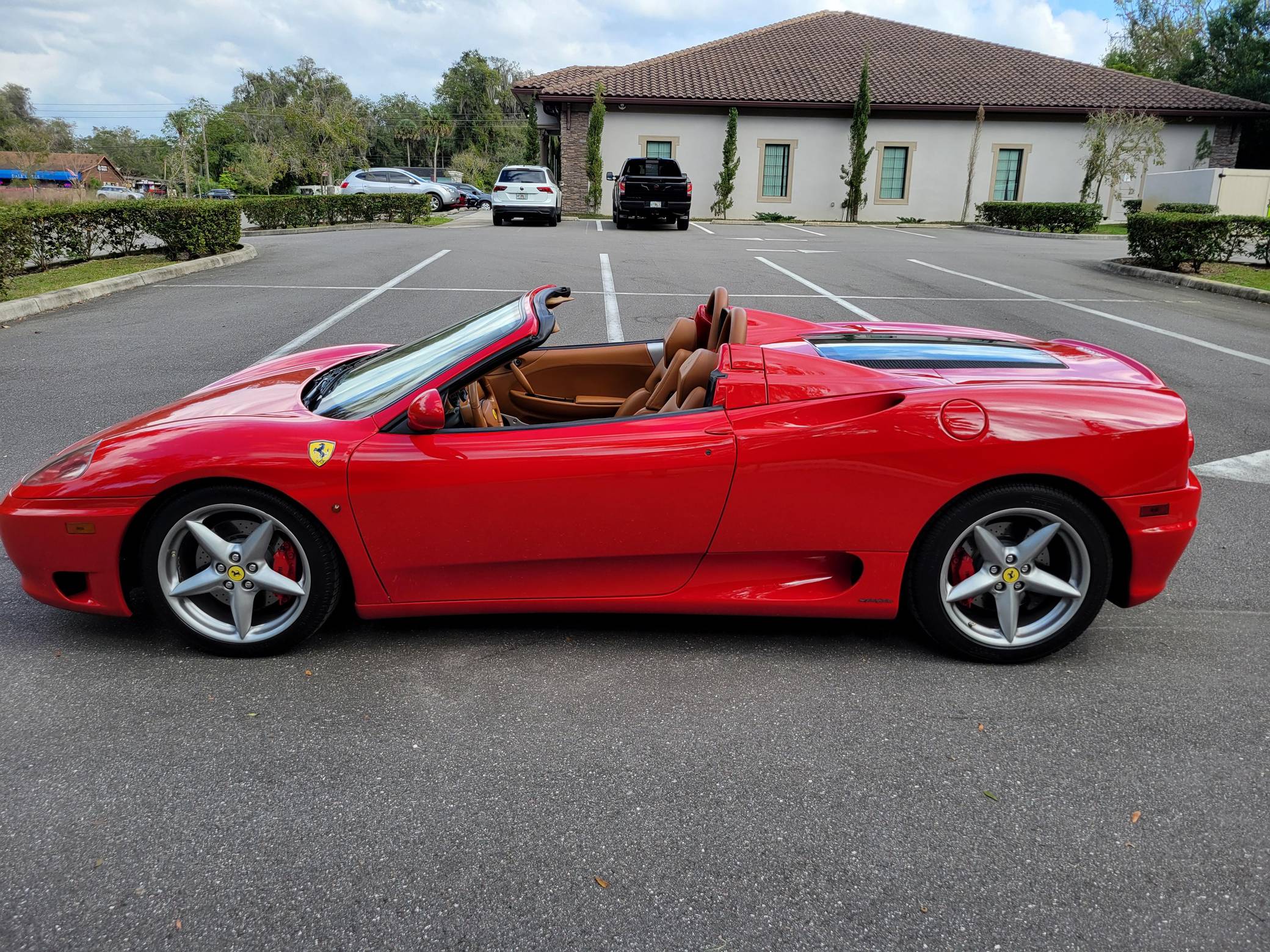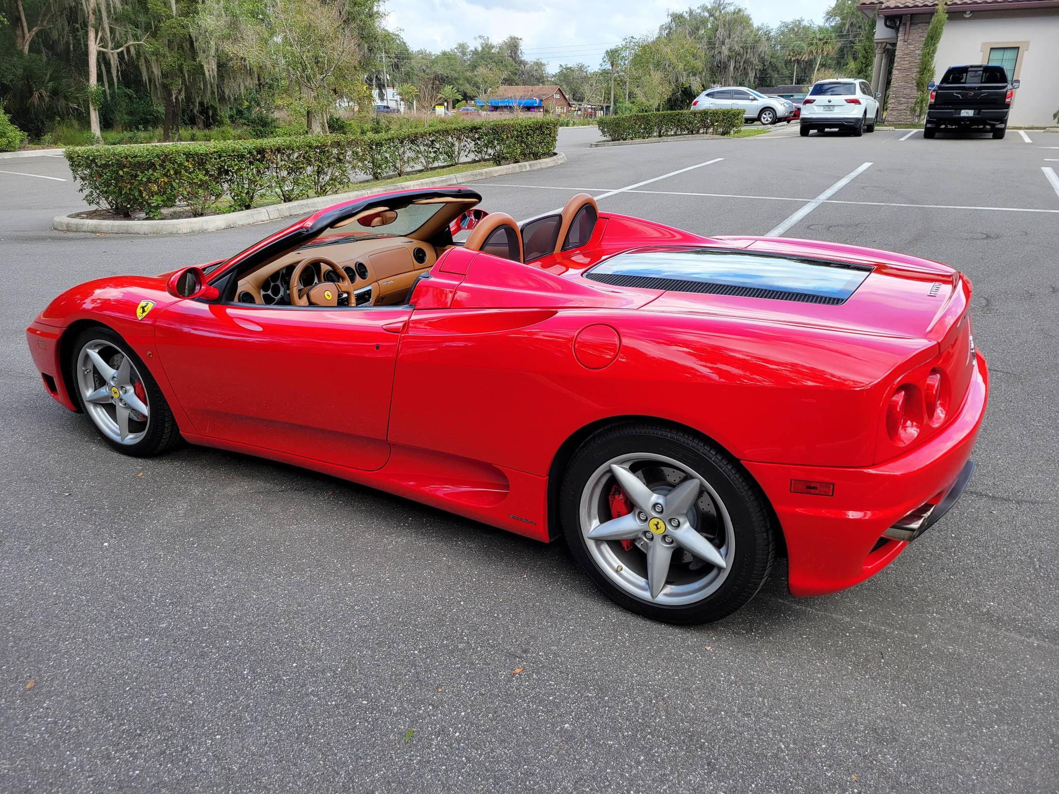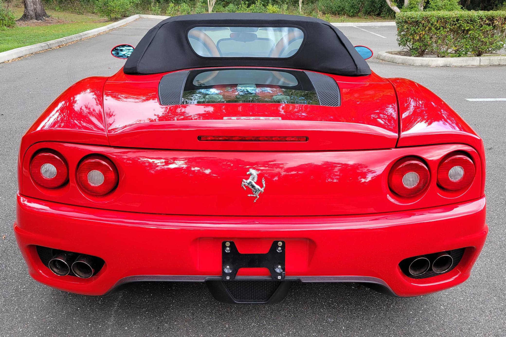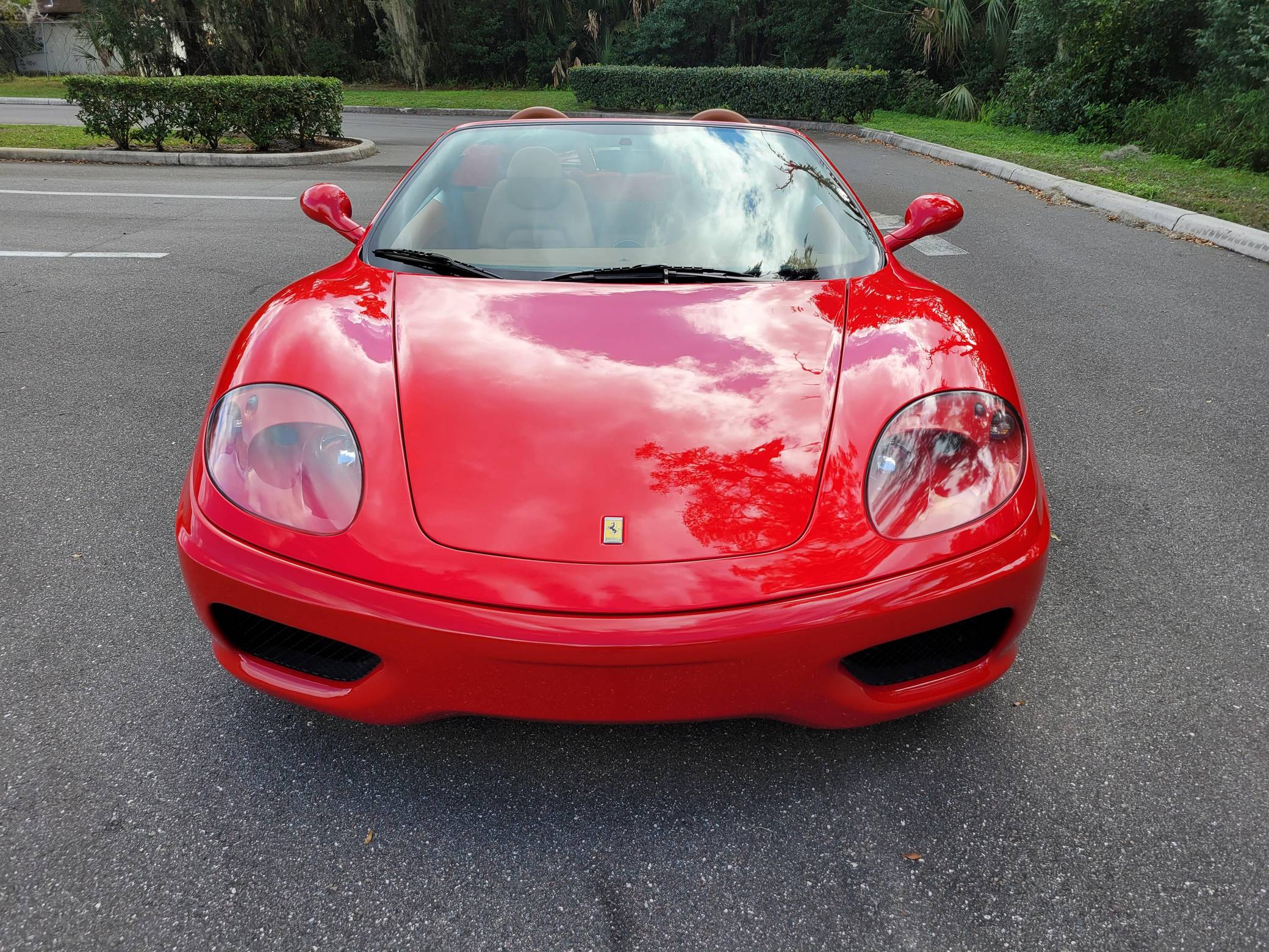 2004 Ferrari 360 Spider, finished in Rosso Corsa with a black soft top and a Cuoio interior. The odometer displays approximately 19,500 miles. Factory equipment includes 18-inch alloy wheels, red brake calipers, xenon headlights, Scuderia shields, leather upholstery, power-adjustable Daytona-style seats, automatic climate control, and more as listed below. Modifications reported by the seller are limited to a Tubi Style exhaust system and paint protection film on the exterior mirrors. The Ferrari 360 was built between 1999 and 2005 as the successor to Ferrari's long-running rear-mid-engine line. Major updates over the F355 that preceded it included an all-aluminum space frame, accessible belts negating an engine-out service, and a more powerful "Tipo F131" V8. Power for this 360 Spider comes from a 3. 6-liter V8, rated at 400 horsepower and 276 lb-ft of torque. Output is sent to the rear wheels via a 6-speed automatic transmission.