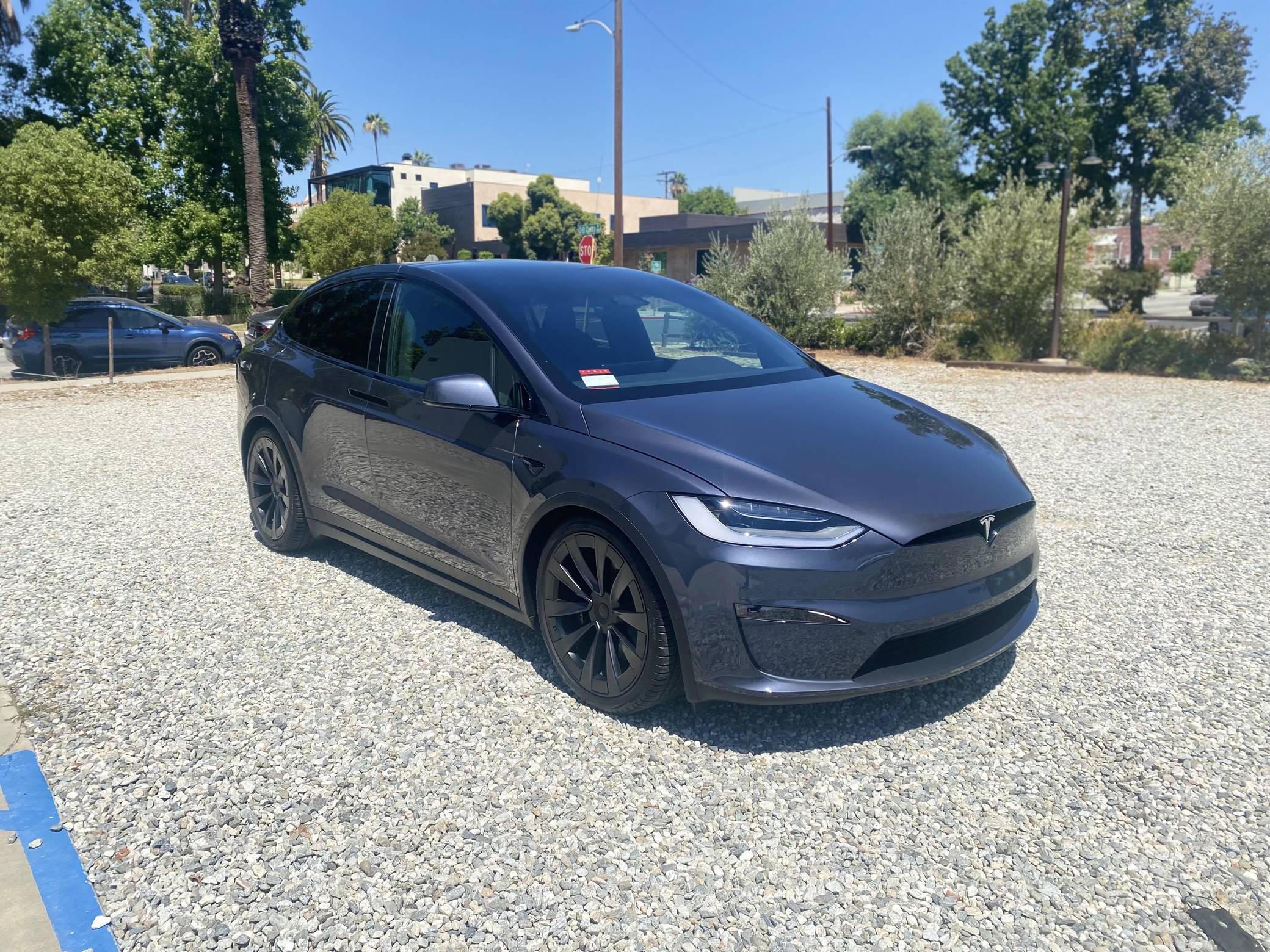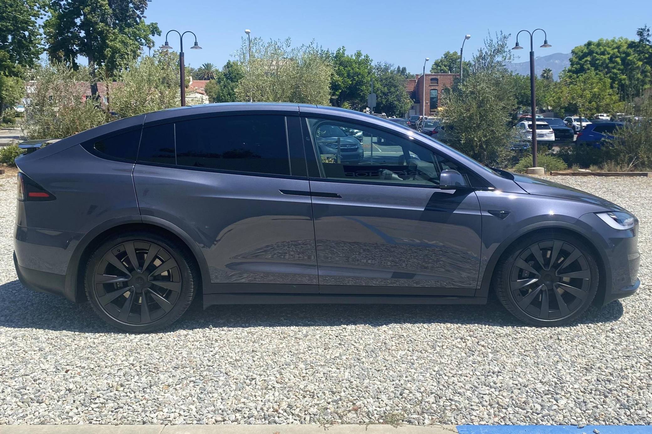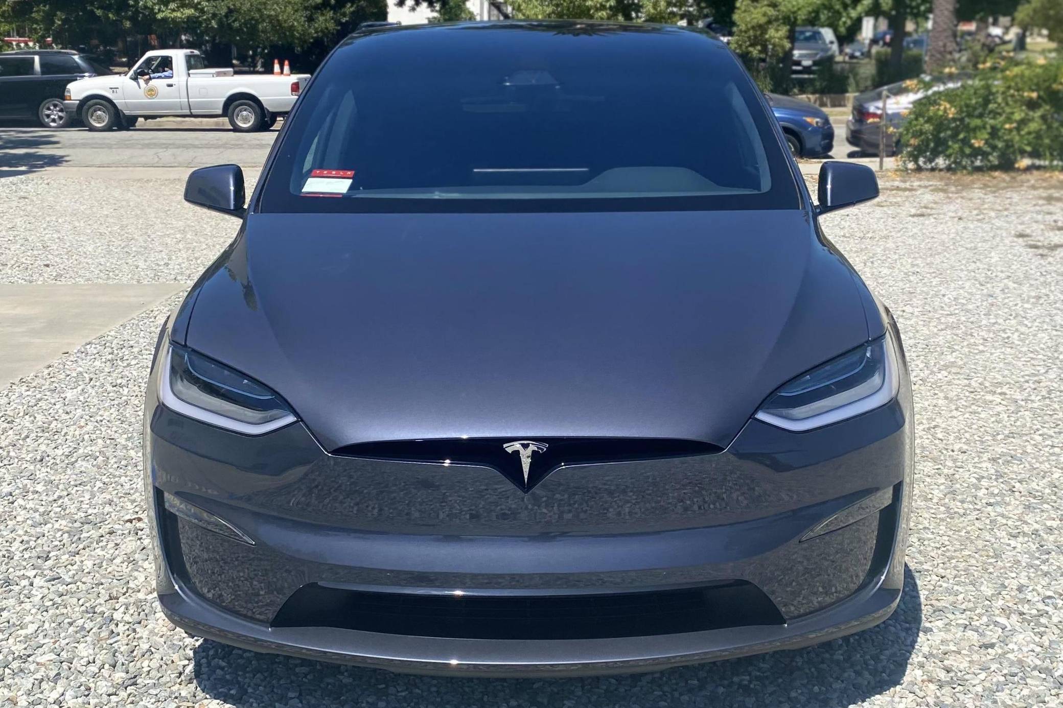 2022 Tesla Model X Long Range, finished in Midnight Silver Metallic with a black interior. Factory equipment includes 22-inch wheels, a rear spoiler, wood interior trim, heated, ventilated, and power-adjustable front seats, heated second-row seats, a yoke steering wheel, two wireless charging pads, and a 22-speaker sound system. The seller reports no modifications. Tesla introduced the Model X for the 2016 model year as a taller, more spacious alternative to the Model S. It stood out from other crossovers with unusual double-hinged falcon rear doors. It has gone through several powertrain and interior evolutions since its launch, and it's still available new today. Power comes from a pair of electric motors, which draw electricity from a 100-kilowatt-hour lithium-ion battery pack to zap the four wheels with 670 horsepower. Fitted with 22-inch wheels, the Model X Long Range's EPA-estimated maximum driving range checks in at 332 miles.