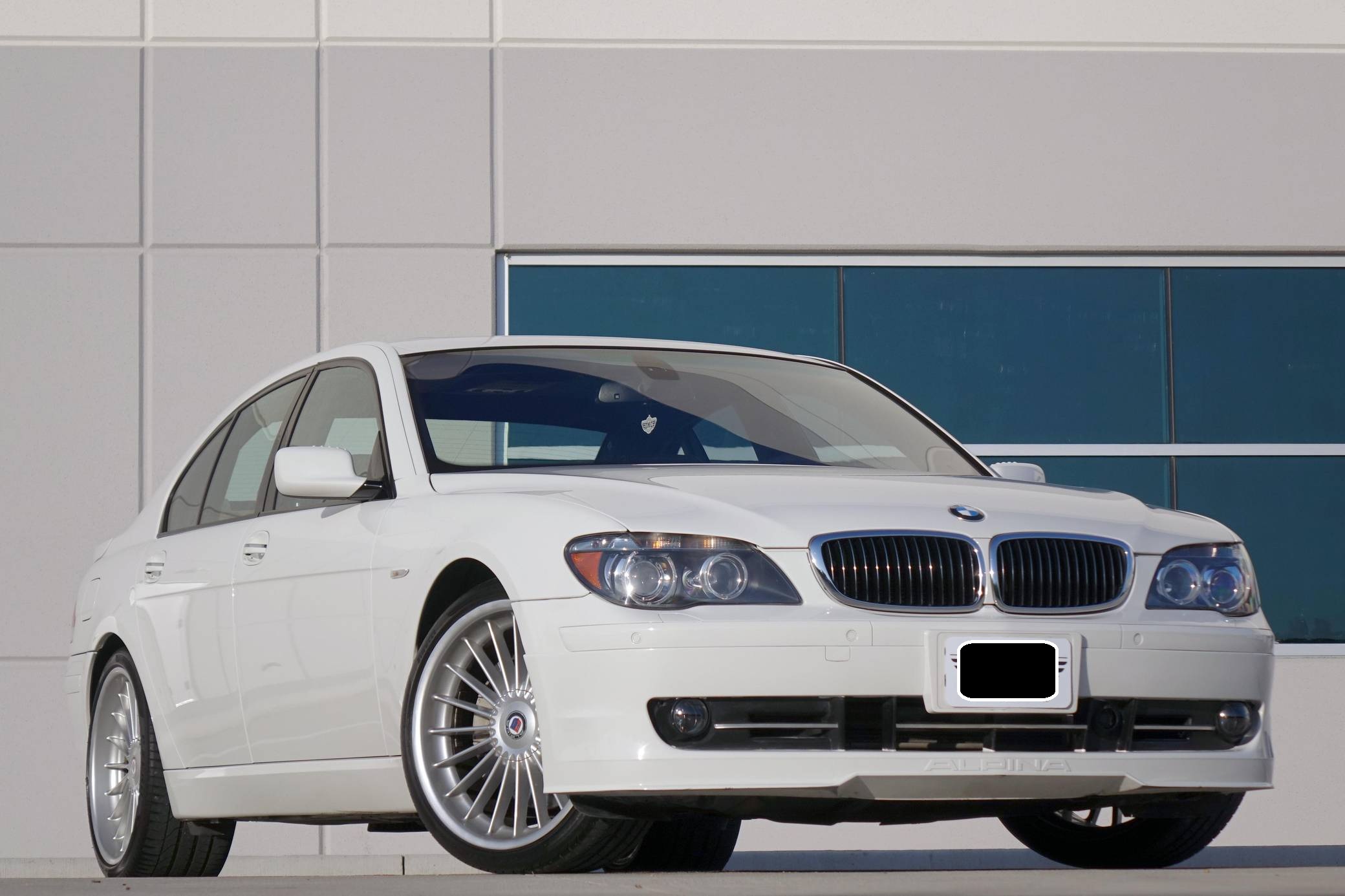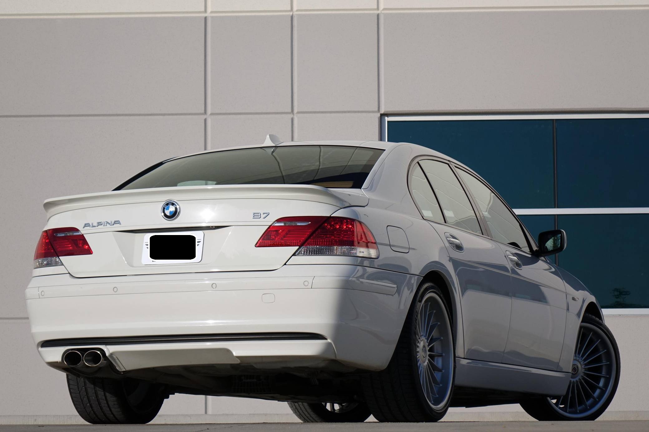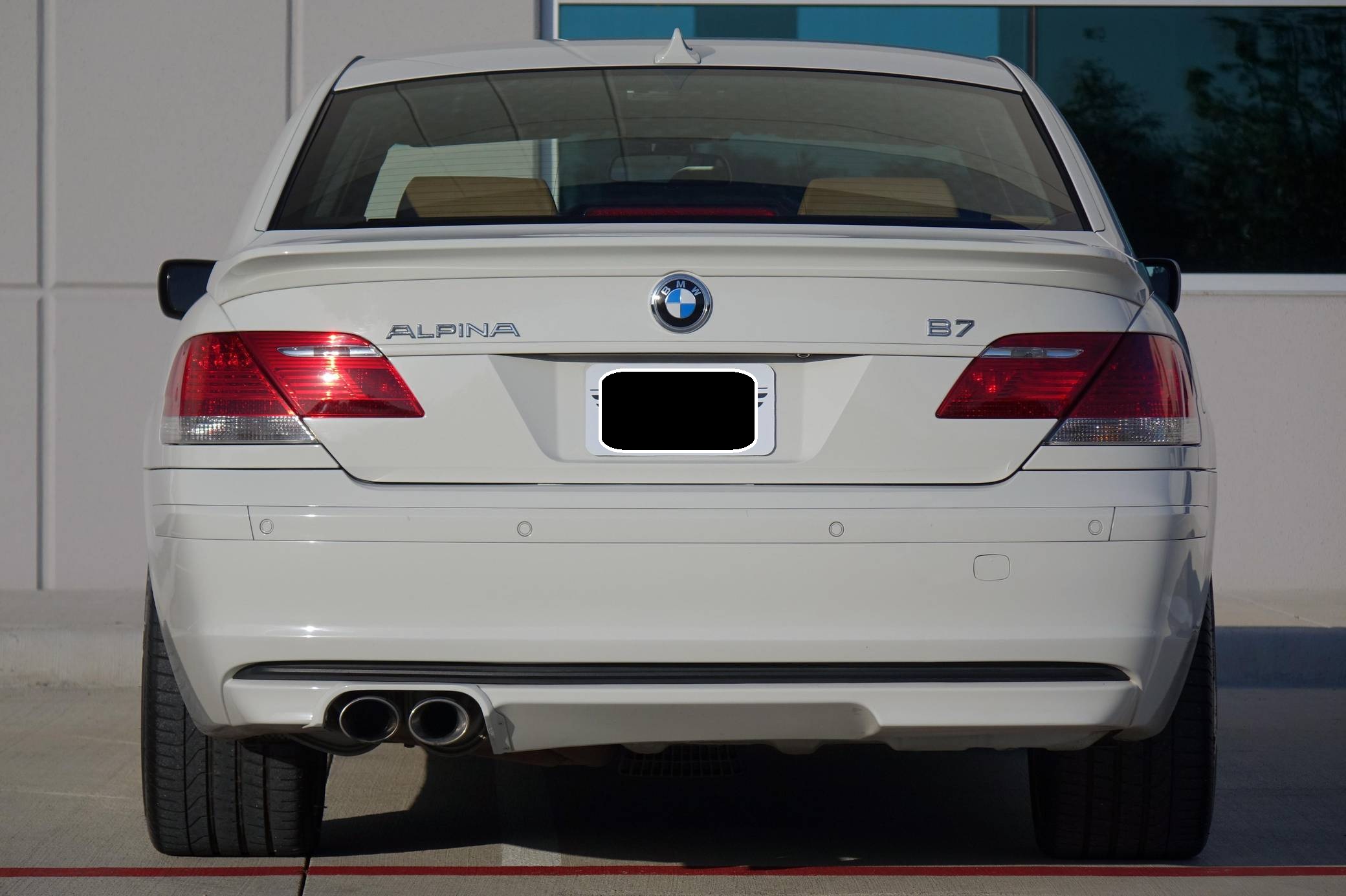 2007 BMW Alpina B7, finished in Alpine White with a Natural Brown interior. The odometer displays approximately 26,800 miles. A build sheet is provided in the photo gallery, and a partial list of equipment includes 21-inch Alpina wheels, an Alpina-specific body kit, soft-close doors, Nasca leather upholstery, heated and ventilated front seats, heated rear seats, a massage function for the driver, a monitor for the rear-seat passengers, and a rear sunshade. The seller reports no modifications. Based on the "E65"-generation BMW 7 Series, the third-generation Alpina B7 made its global debut in 2003 and sales in the United States started for the 2007 model year. Approximately 800 units were sold in North America through BMW dealers until the model retired in early 2008. Power comes from a supercharged 4. 4-liter V8, rated at 500 horsepower and 516 lb-ft of torque. Output is sent to the rear wheels via a 6-speed automatic transmission.