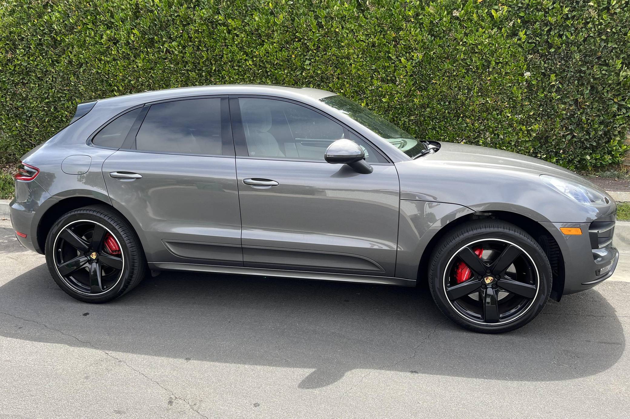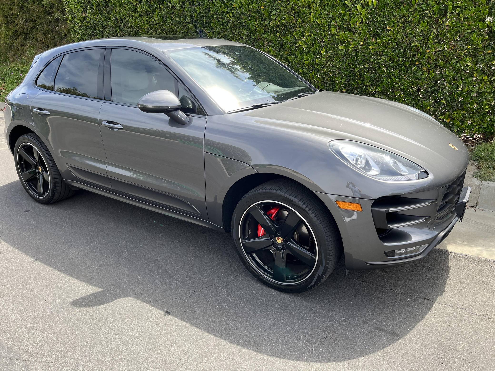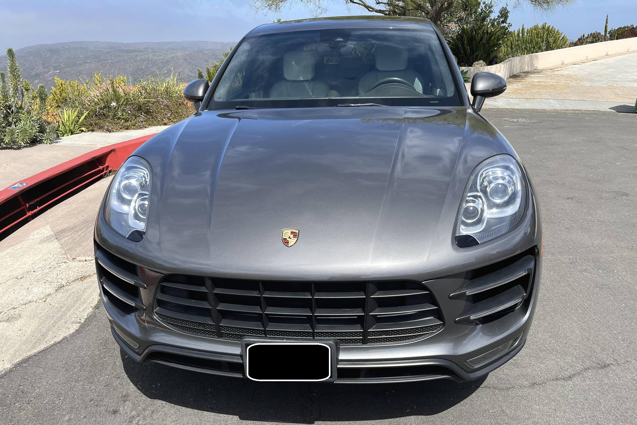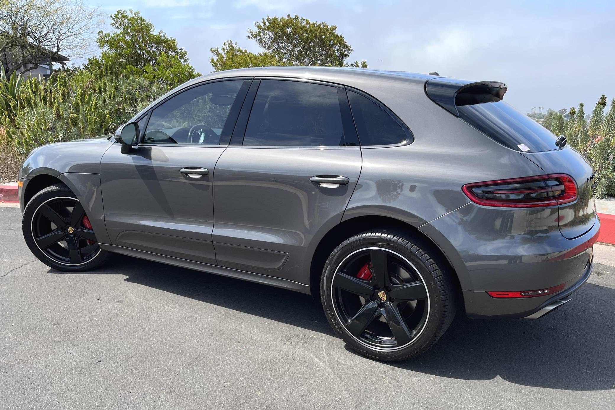 2016 Porsche Macan Turbo, finished in Agate Grey Metallic with an Agate Grey and Pebble Grey interior. A Monroney Label is provided in the photo gallery, and a partial list of notable equipment includes the Sport Chrono, Premium Plus, Monochrome High-Gloss Black Exterior, Black High-Gloss Finish Interior Package, and Light Comfort packages, 21-inch black Sport Classic wheels, air suspension with Porsche Active Suspension Management (PASM), leather upholstery, leather dashboard trim, a center touchscreen infotainment display, and a rear-view camera with front and rear park assist. Modifications reported by the seller are limited to black rear badges. Encouraged by the Cayenne's success, and eager to tap into one of the biggest segments of the market, Porsche introduced the Macan as its entry-level SUV for 2015. Some of the model's underpinnings came from Audi, but Porsche dialed in a level of performance and handling that's unusual to find in a compact SUV. The Turbo model was positioned at the top of the line-up through the 2021 model year. Power comes from a turbocharged 3. 6-liter V6, rated at 400 horsepower and 406 lb-ft of torque. Output is sent to all four wheels via a 7-speed PDK dual-clutch automatic transmission.